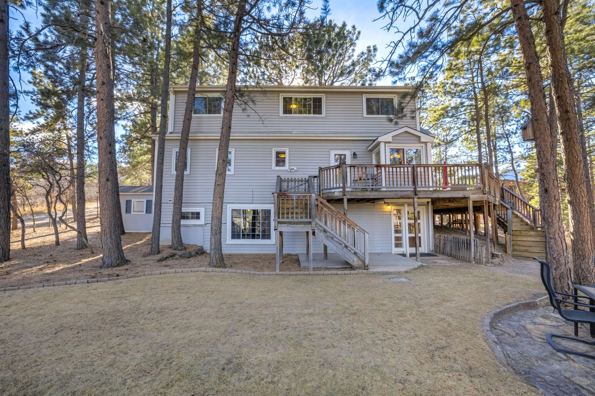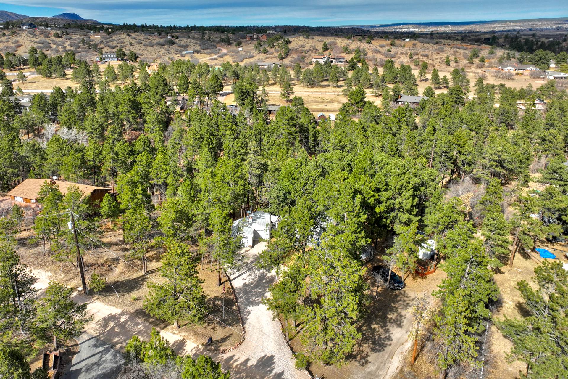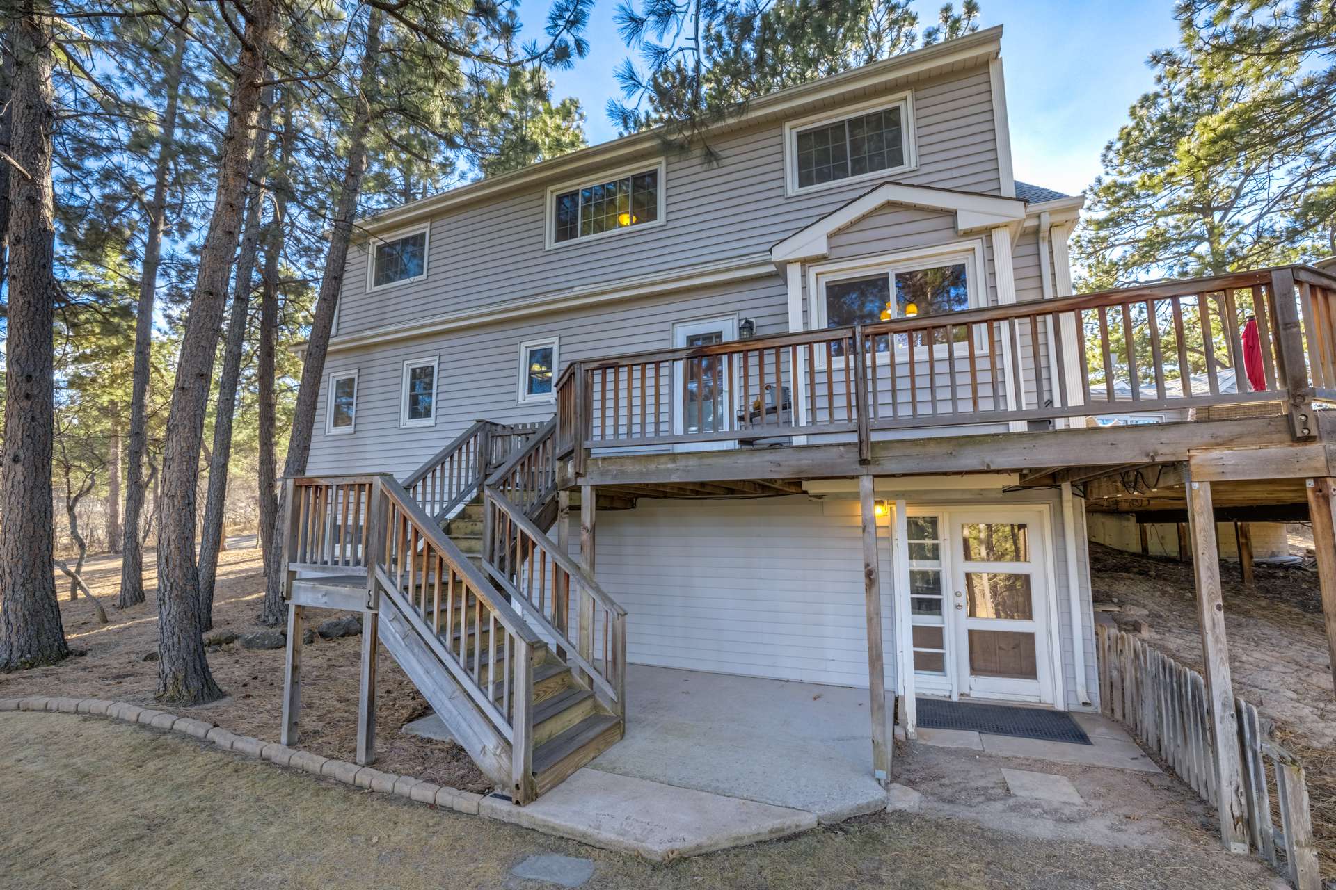 This stunning New England Cape Cod-style home offers the rare combination of convenience and true Colorado serenity. Ideally located near I-25 and Woodmen, you can be anywhere in the city in minutes — yet the moment you arrive, you feel a peaceful world away. Set on a gorgeous 1.91-acre lot in Woodmen Valley, this property is zoned for horses with no HOA — an increasingly rare find this close to town. Dirt roads wind through the neighborhood, perfect for horseback riding, mountain biking, or quiet evening walks. With quick access to Highway 24 and west side parks and recreation, mountain escapes are effortless. Inside, warmth and character greet you at every turn. The kitchen features a charming eat-in banquette surrounded by windows, creating the feeling of dining in a treehouse as you overlook the peaceful meadow framed by majestic pines. Just steps away, the formal dining room opens to a spectacular Brazilian hardwood deck complete with a luxurious Jacuzzi hot tub, an entertainer’s dream with sweeping views and unmatched privacy. The main-level living room is anchored by a wood-burning fireplace, custom built-in bookcases, rich wood beams, and a handcrafted mantel that adds timeless charm. A main-level primary suite offers comfort, privacy, and effortless single-level living — an increasingly rare and desirable feature. Upstairs, three additional bedrooms share a remodeled full bath. The walkout basement provides even more gathering space with a second wood-burning fireplace, plus a bonus room ideal for a home office, craft studio, or gym, plus a half bath. Laundry and generous storage round out the lower level. Outside, manicured lawns front and back create a park-like setting, with two storage sheds ready for tools, gear, or recreational toys, and enclosed raised vegetable beds. Close to everything. Zoned for horses. No HOA. Mountain views. Privacy. Character. This is the kind of property buyers wait years to find — and it won’t last.