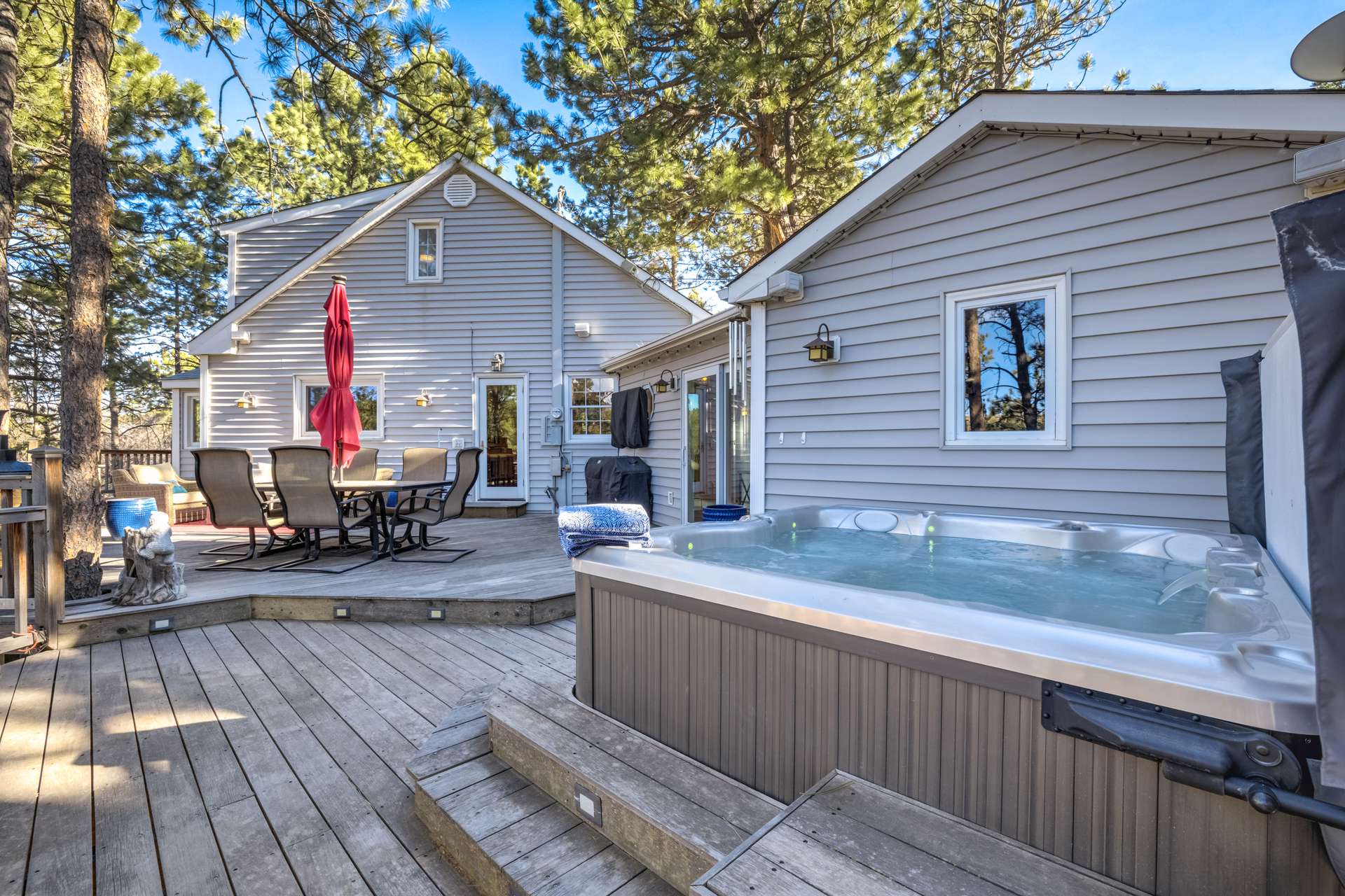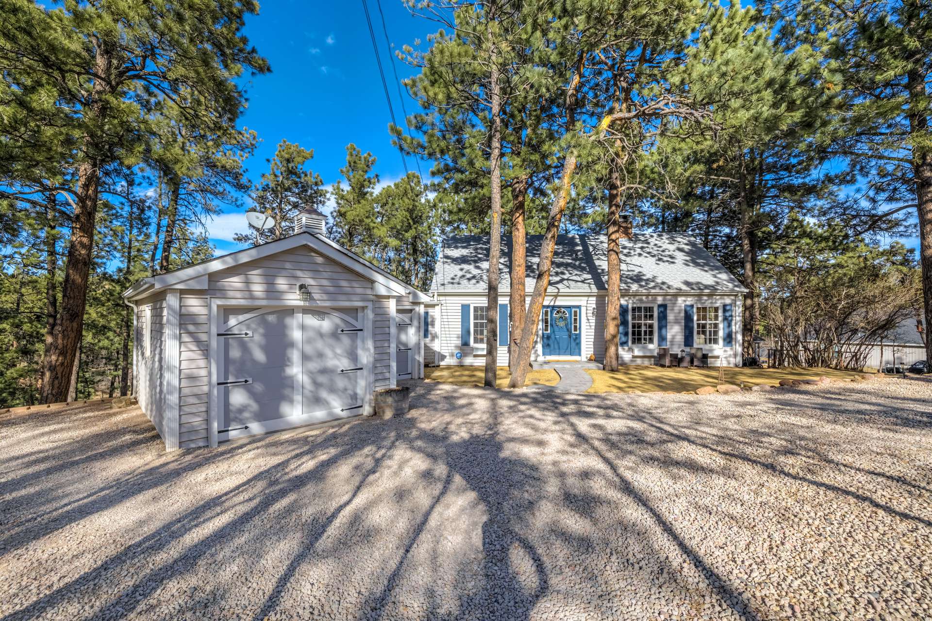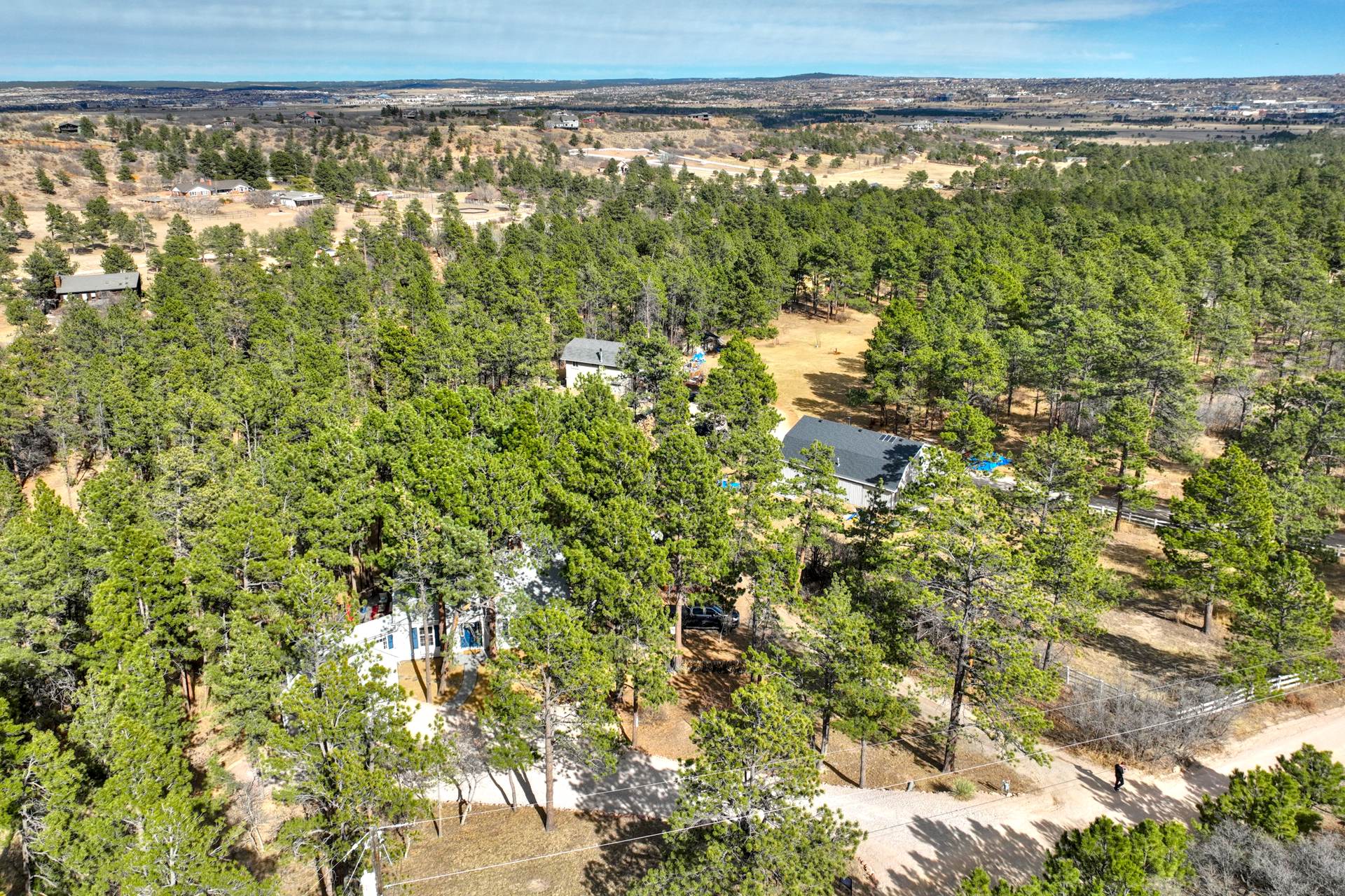 This stunning New England Cape Cod-style home offers the rare combination of convenience and true Colorado serenity. Ideally located near I-25 and Woodmen, you can be anywhere in the city in minutes — yet the moment you arrive, you feel a peaceful world away. Set on a gorgeous 1.91-acre lot in Woodmen Valley, this property is zoned for horses with no HOA — an increasingly rare find this close to town. Dirt roads wind through the neighborhood, perfect for horseback riding, mountain biking, or quiet evening walks. With quick access to Highway 24 and west side parks and recreation, mountain escapes are effortless. Inside, warmth and character greet you at every turn. The kitchen features a charming eat-in banquette surrounded by windows, creating the feeling of dining in a treehouse as you overlook the peaceful meadow framed by majestic pines. Just steps away, the formal dining room opens to a spectacular Brazilian hardwood deck complete with a luxurious Jacuzzi hot tub, an entertainer’s dream with sweeping views and unmatched privacy. The main-level living room is anchored by a wood-burning fireplace, custom built-in bookcases, rich wood beams, and a handcrafted mantel that adds timeless charm. A main-level primary suite offers comfort, privacy, and effortless single-level living — an increasingly rare and desirable feature. Upstairs, three additional bedrooms share a remodeled full bath. The walkout basement provides even more gathering space with a second wood-burning fireplace, plus a bonus room ideal for a home office, craft studio, or gym, plus a half bath. Laundry and generous storage round out the lower level. Outside, manicured lawns front and back create a park-like setting, with two storage sheds ready for tools, gear, or recreational toys, and enclosed raised vegetable beds. Close to everything. Zoned for horses. No HOA. Mountain views. Privacy. Character. This is the kind of property buyers wait years to find — and it won’t last.