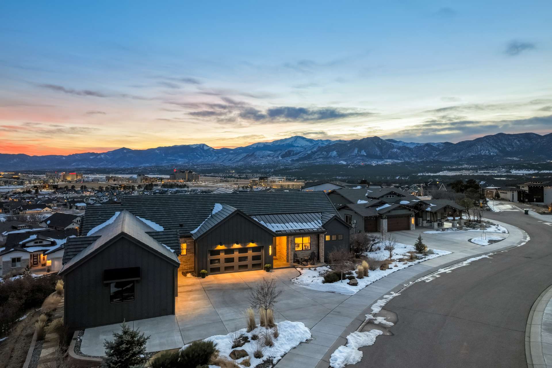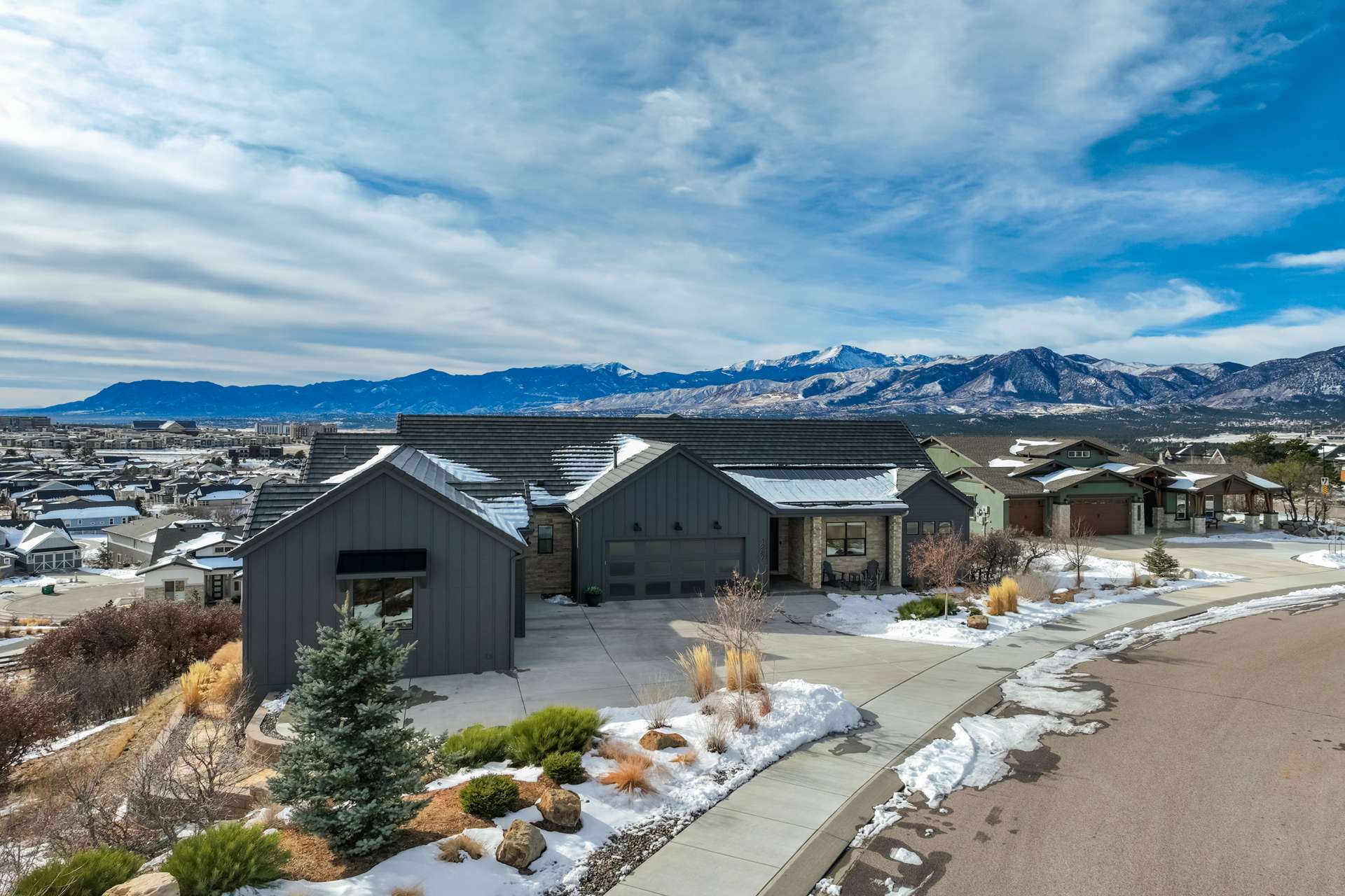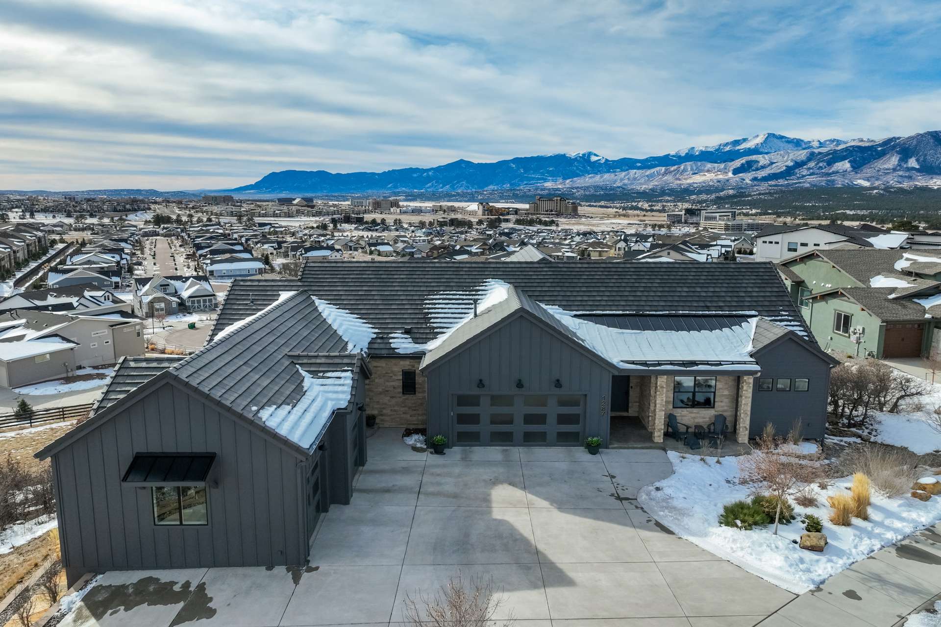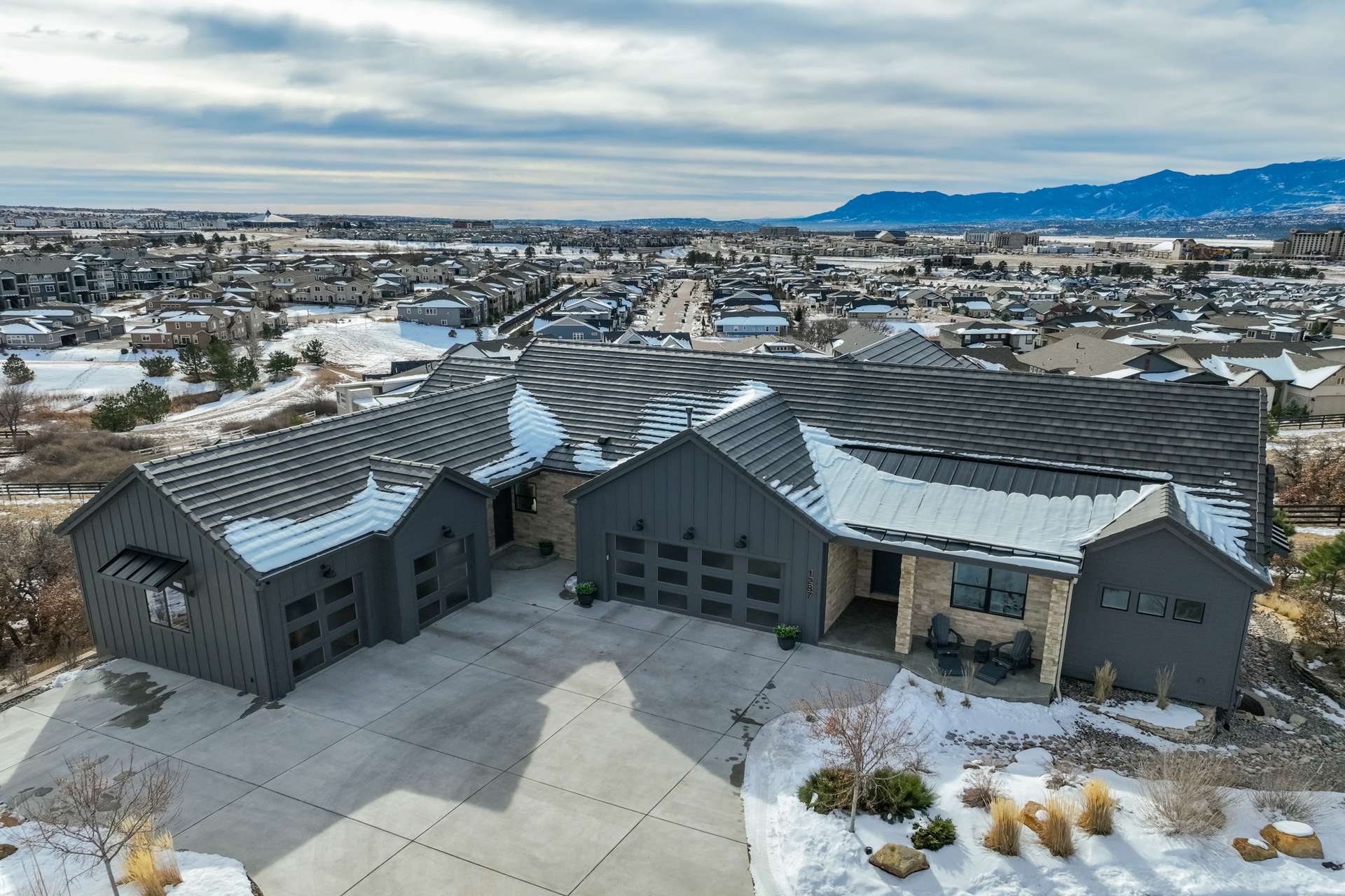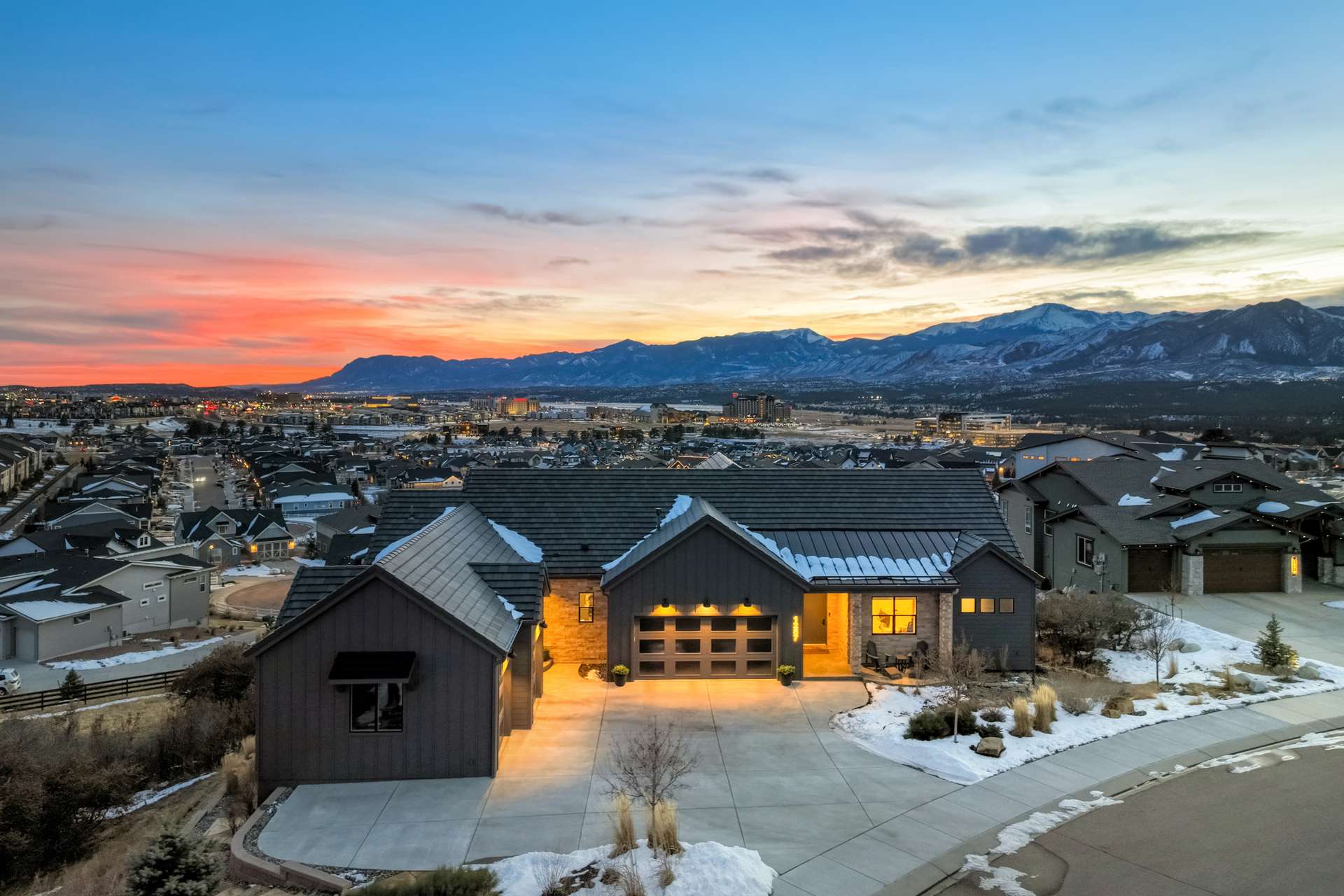 Set within the custom Julep Estates neighborhood of The Farm, this exceptional custom home blends modern Farmhouse architecture with thoughtful design, flexibility, and breathtaking Pikes Peak views. Designed for both everyday comfort and effortless entertaining, the open-concept layout is filled with natural light and seamless indoor/outdoor connections. The great room showcases expansive views of Pikes Peak with a stacking slider that opens to covered patios, creating an ideal setting for indoor/outdoor living. Light hardwood floors, custom finishes, and a dedicated sunroom add warmth and sophistication throughout the main living spaces. The gourmet kitchen anchors the home with an oversized island, granite and marble countertops, double ovens, gas range, and abundant storage—perfect for entertaining friends and family. The main-level primary suite offers a peaceful retreat with mountain views, a spa-inspired bath featuring a soaking tub, oversized custom shower, Carrara marble countertops, and a generous walk-in closet with built-ins. Additional bedrooms provide flexibility for family, guests, or work-from-home needs, while the finished basement expands the living space with a wet bar, workout or recreation room, flex rooms, and a secure vault room. An attached in-law suite provides a private living area with its own entrance, full kitchen, living room with fireplace, bedroom, bathroom, covered deck, and garage —ideal for multigenerational living or extended guests. Outdoor living is equally impressive, with multiple patios, covered decks, a fire pit, a hot tub, a water feature, and professionally landscaped grounds designed for beauty and low maintenance. The oversized 4+ car garages feature extra-tall ceilings, workshop space, EV charging, and extensive storage. With high-performance systems, whole-house audio, fiber-optic connectivity, and designer finishes throughout, this home offers a rare combination of luxury, versatility, and iconic Front Range views.
