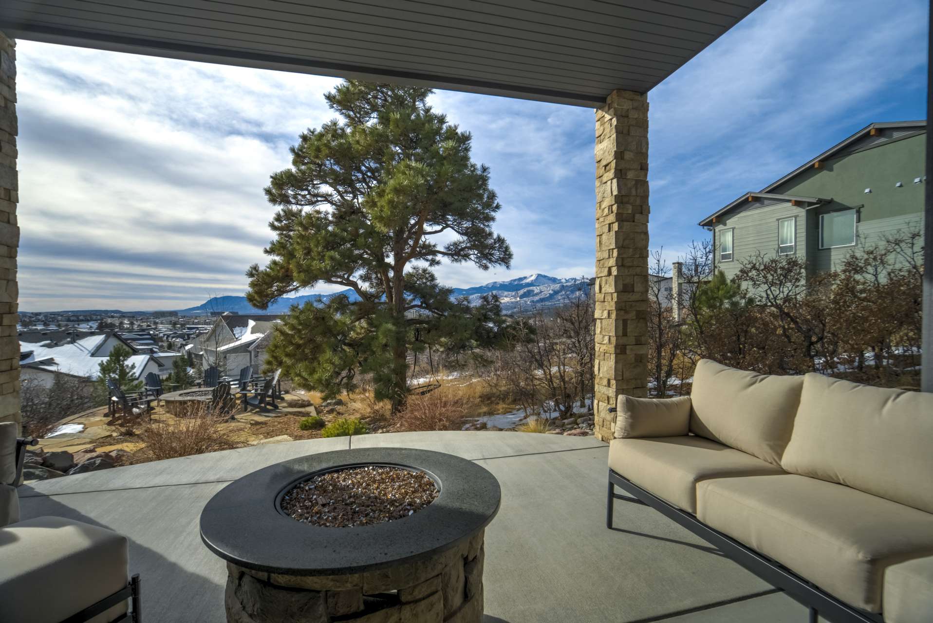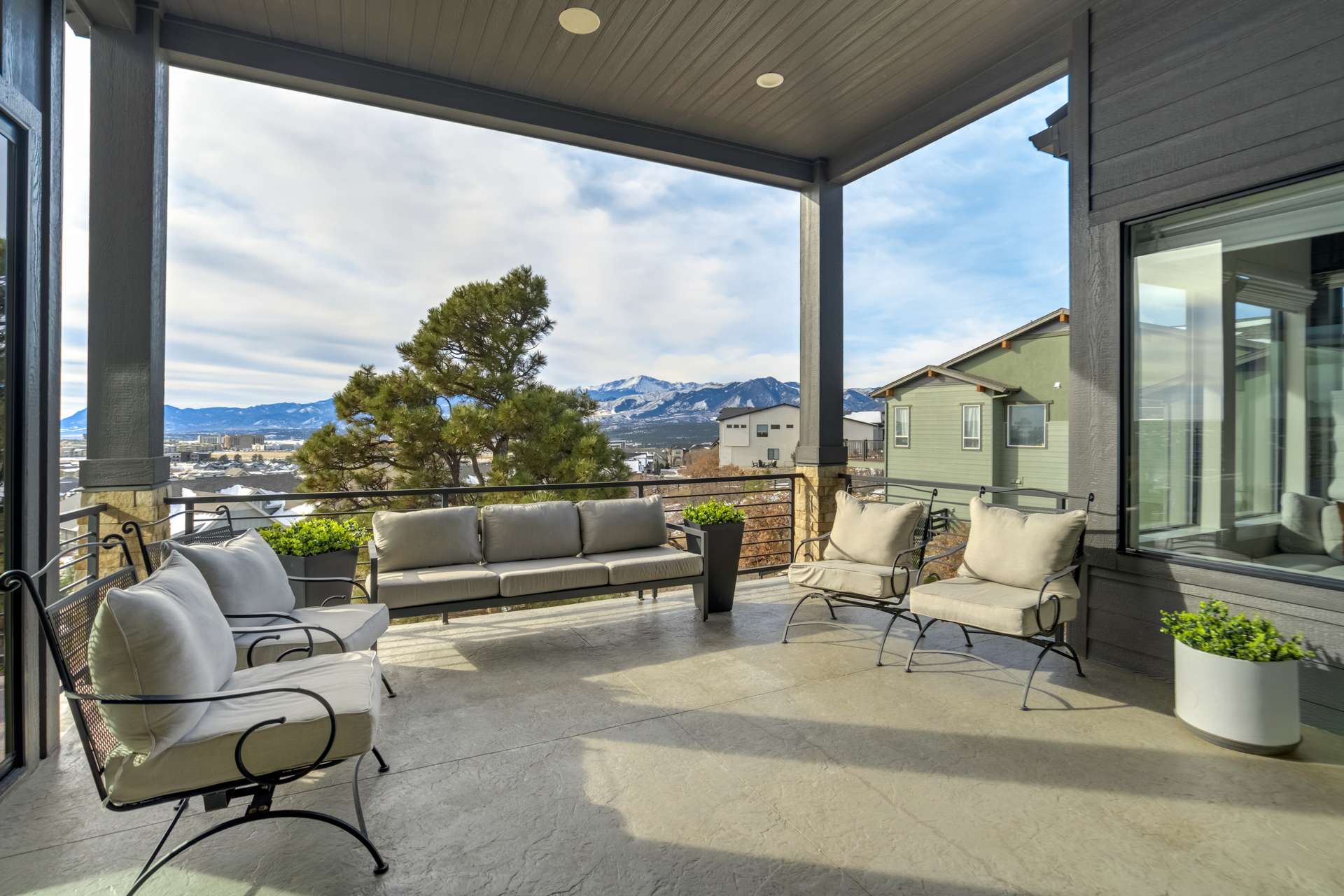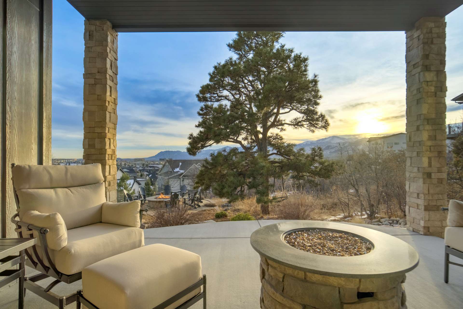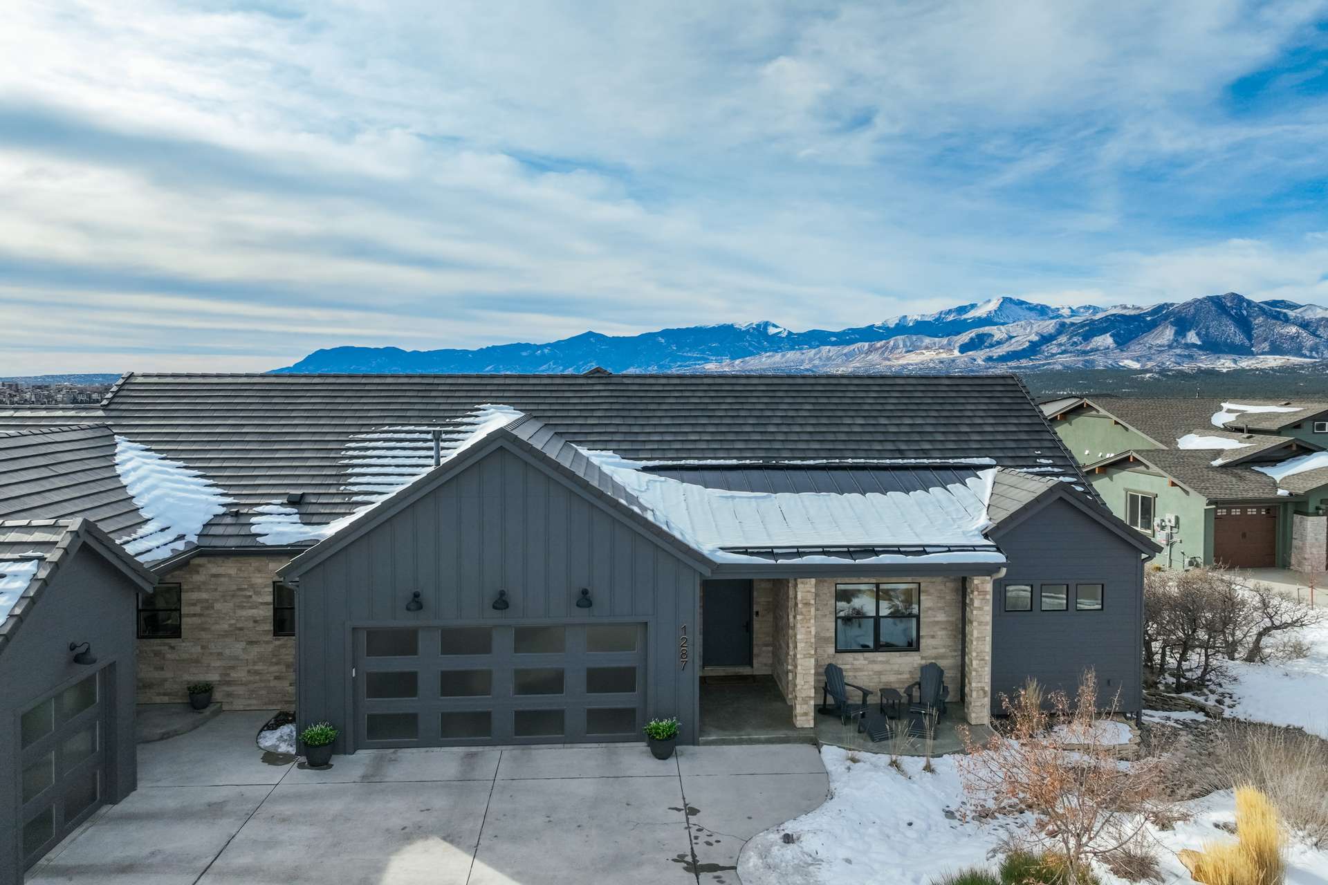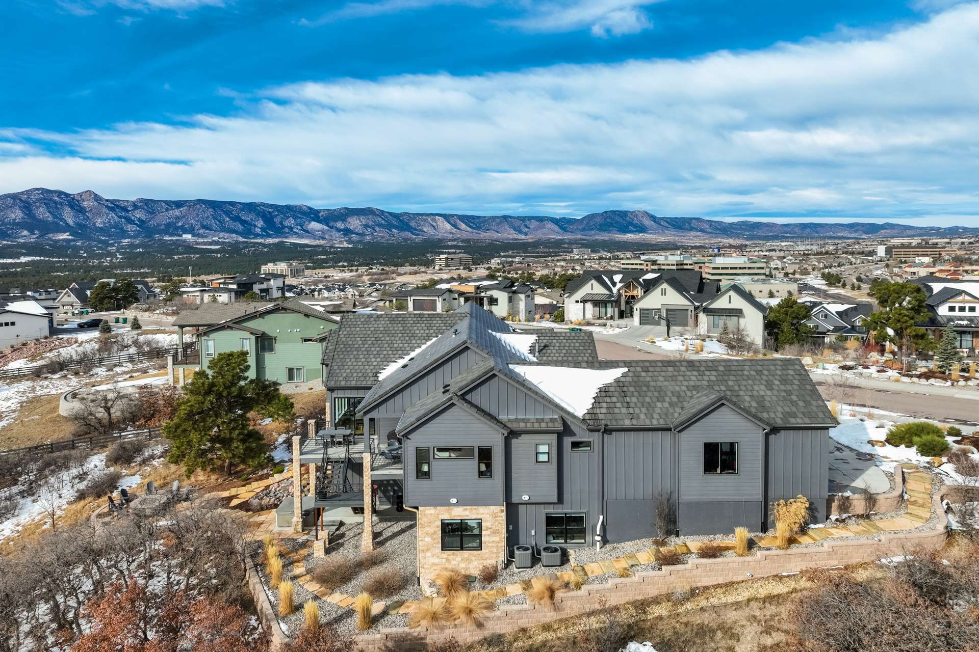 Set within the custom Julep Estates neighborhood of The Farm, this exceptional custom home blends modern Farmhouse architecture with thoughtful design, flexibility, and breathtaking Pikes Peak views. Designed for both everyday comfort and effortless entertaining, the open-concept layout is filled with natural light and seamless indoor/outdoor connections. The great room showcases expansive views of Pikes Peak with a stacking slider that opens to covered patios, creating an ideal setting for indoor/outdoor living. Light hardwood floors, custom finishes, and a dedicated sunroom add warmth and sophistication throughout the main living spaces. The gourmet kitchen anchors the home with an oversized island, granite and marble countertops, double ovens, gas range, and abundant storage—perfect for entertaining friends and family. The main-level primary suite offers a peaceful retreat with mountain views, a spa-inspired bath featuring a soaking tub, oversized custom shower, Carrara marble countertops, and a generous walk-in closet with built-ins. Additional bedrooms provide flexibility for family, guests, or work-from-home needs, while the finished basement expands the living space with a wet bar, workout or recreation room, flex rooms, and a secure vault room. An attached in-law suite provides a private living area with its own entrance, full kitchen, living room with fireplace, bedroom, bathroom, covered deck, and garage —ideal for multigenerational living or extended guests. Outdoor living is equally impressive, with multiple patios, covered decks, a fire pit, a hot tub, a water feature, and professionally landscaped grounds designed for beauty and low maintenance. The oversized 4+ car garages feature extra-tall ceilings, workshop space, EV charging, and extensive storage. With high-performance systems, whole-house audio, fiber-optic connectivity, and designer finishes throughout, this home offers a rare combination of luxury, versatility, and iconic Front Range views.