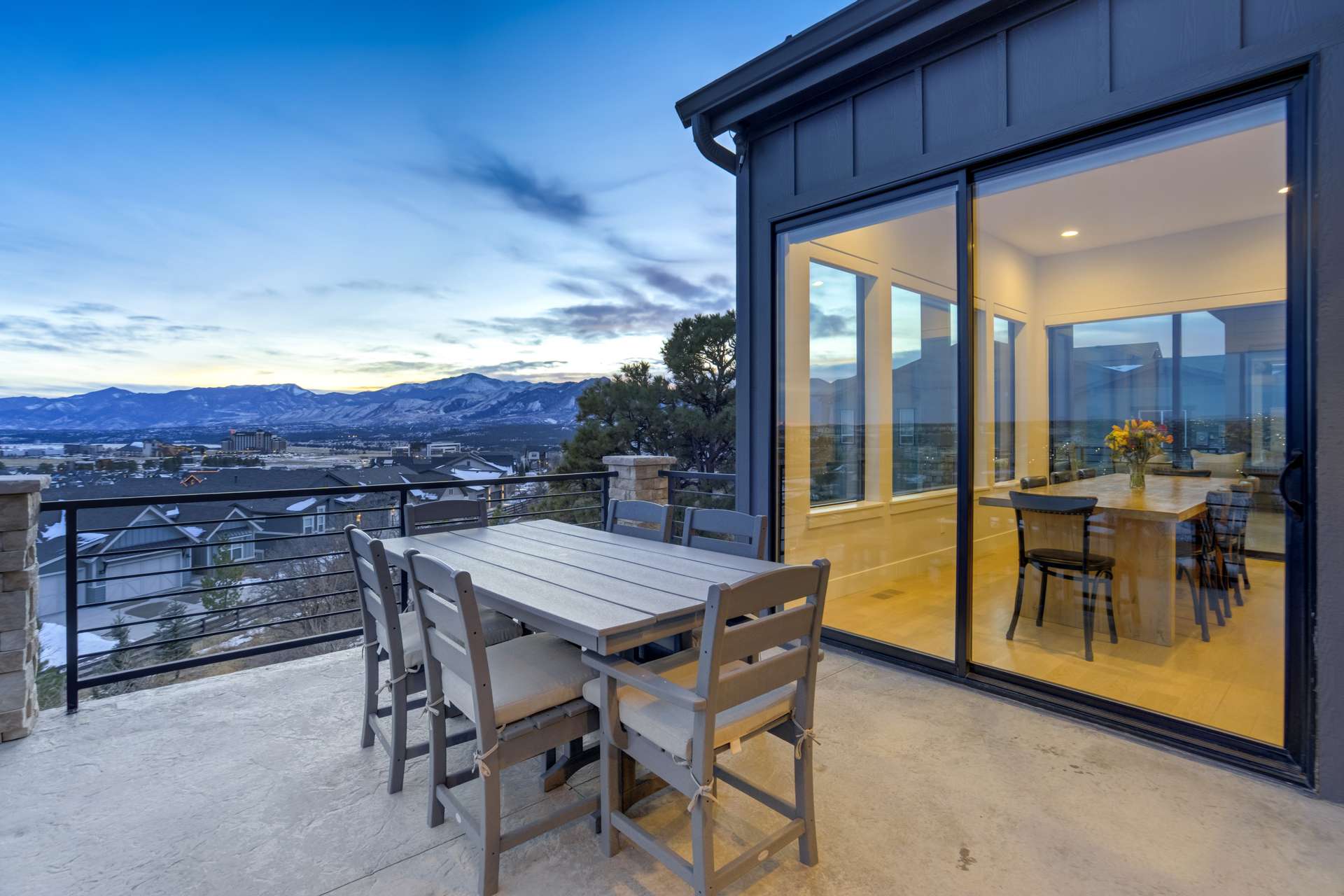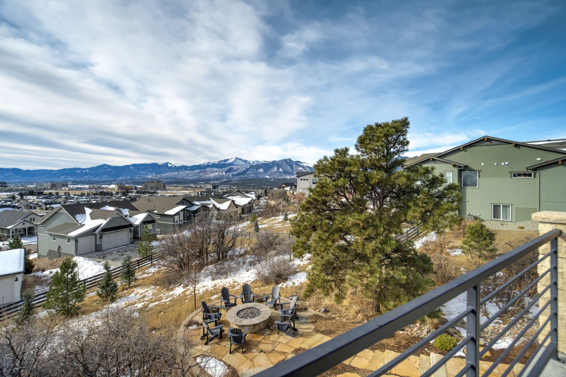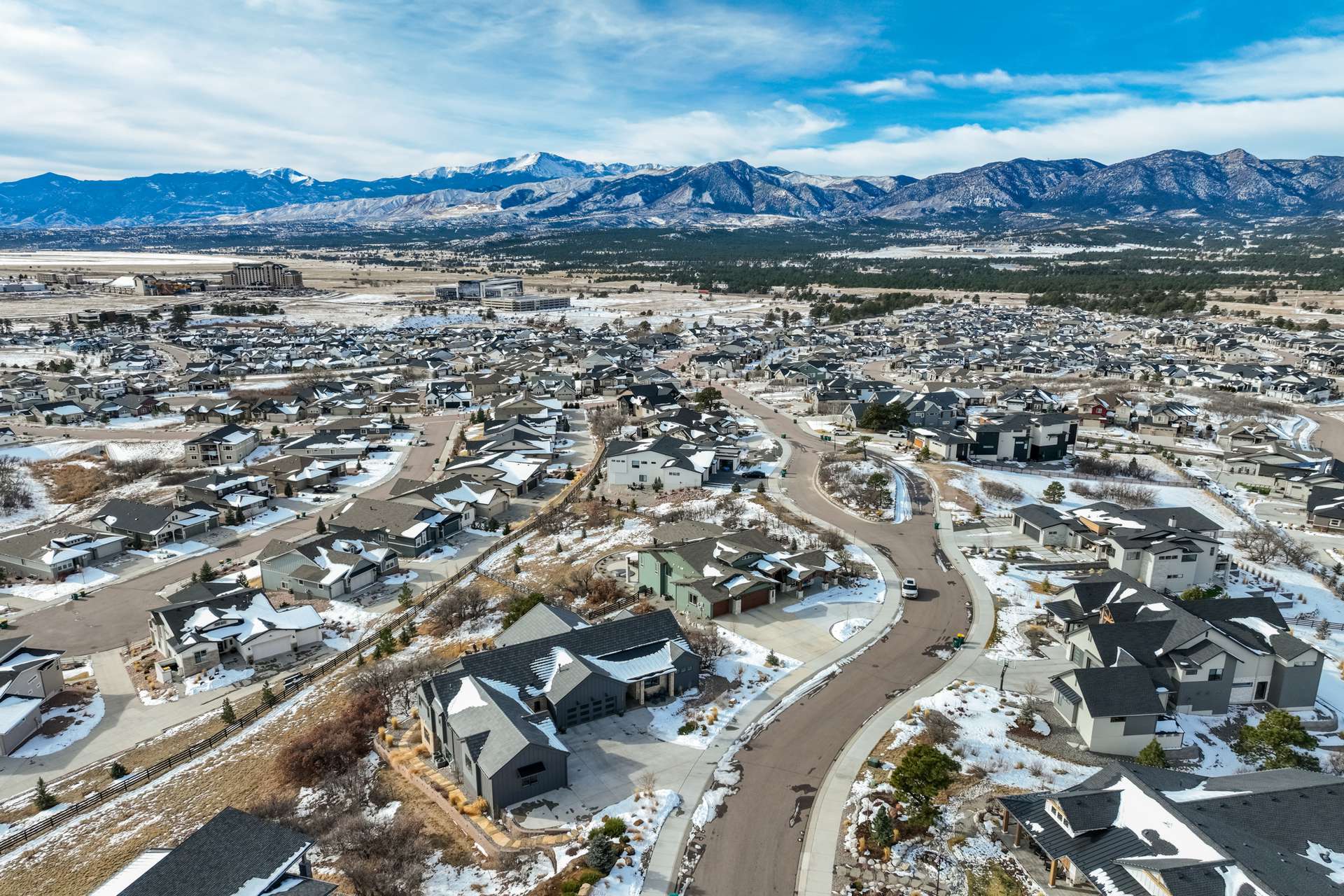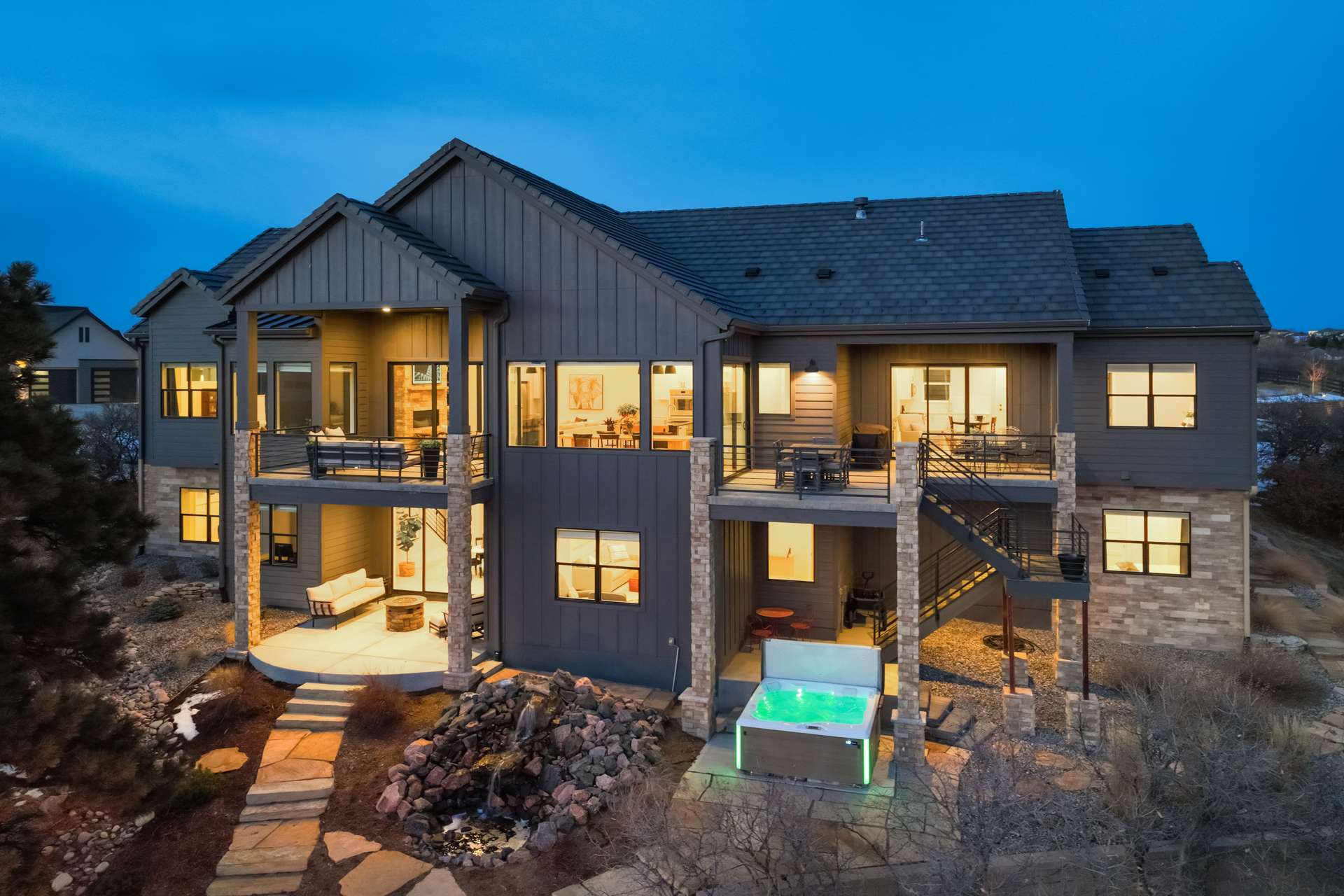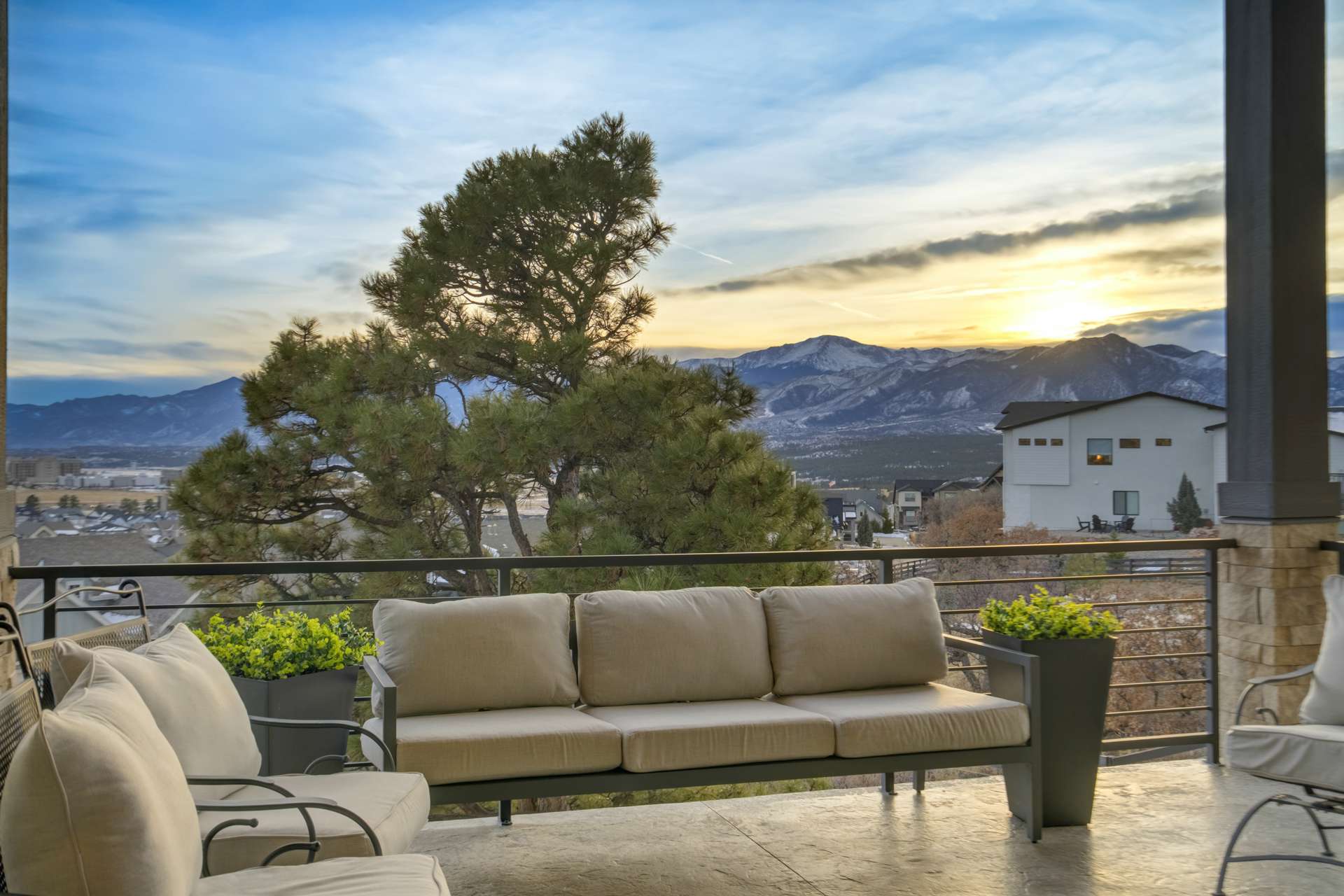 Set within the custom Julep Estates neighborhood of The Farm, this exceptional custom home blends modern Farmhouse architecture with thoughtful design, flexibility, and breathtaking Pikes Peak views. Designed for both everyday comfort and effortless entertaining, the open-concept layout is filled with natural light and seamless indoor/outdoor connections. The great room showcases expansive views of Pikes Peak with a stacking slider that opens to covered patios, creating an ideal setting for indoor/outdoor living. Light hardwood floors, custom finishes, and a dedicated sunroom add warmth and sophistication throughout the main living spaces. The gourmet kitchen anchors the home with an oversized island, granite and marble countertops, double ovens, gas range, and abundant storage—perfect for entertaining friends and family. The main-level primary suite offers a peaceful retreat with mountain views, a spa-inspired bath featuring a soaking tub, oversized custom shower, Carrara marble countertops, and a generous walk-in closet with built-ins. Additional bedrooms provide flexibility for family, guests, or work-from-home needs, while the finished basement expands the living space with a wet bar, workout or recreation room, flex rooms, and a secure vault room. An attached in-law suite provides a private living area with its own entrance, full kitchen, living room with fireplace, bedroom, bathroom, covered deck, and garage —ideal for multigenerational living or extended guests. Outdoor living is equally impressive, with multiple patios, covered decks, a fire pit, a hot tub, a water feature, and professionally landscaped grounds designed for beauty and low maintenance. The oversized 4+ car garages feature extra-tall ceilings, workshop space, EV charging, and extensive storage. With high-performance systems, whole-house audio, fiber-optic connectivity, and designer finishes throughout, this home offers a rare combination of luxury, versatility, and iconic Front Range views.