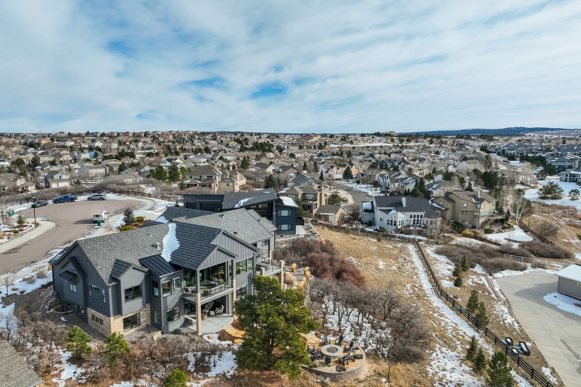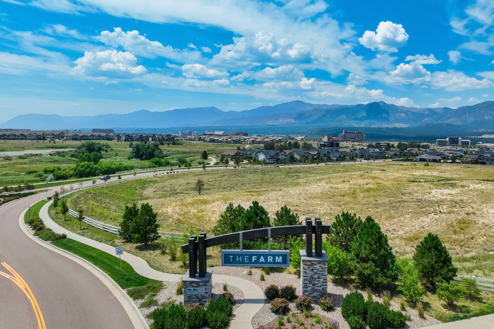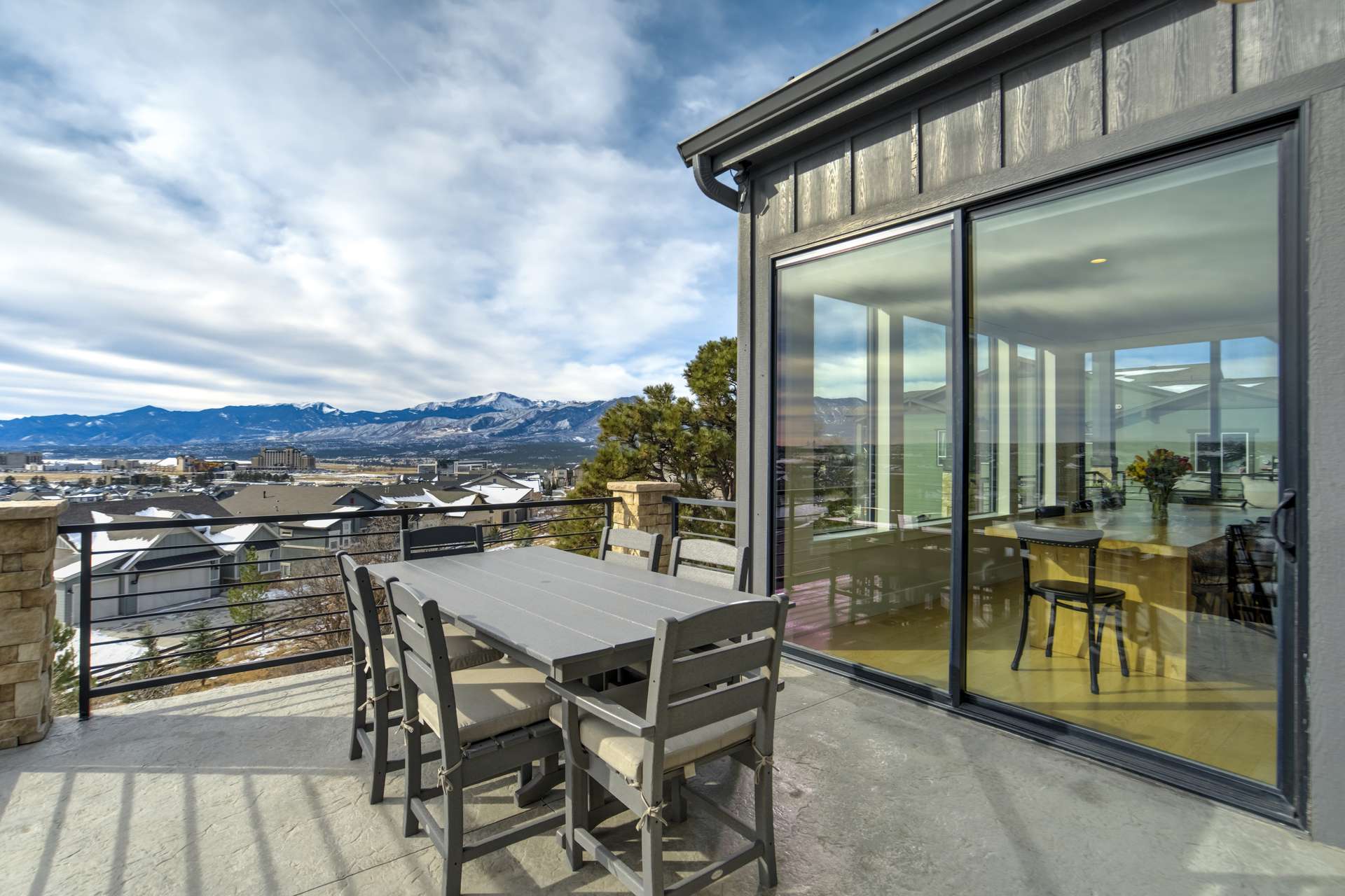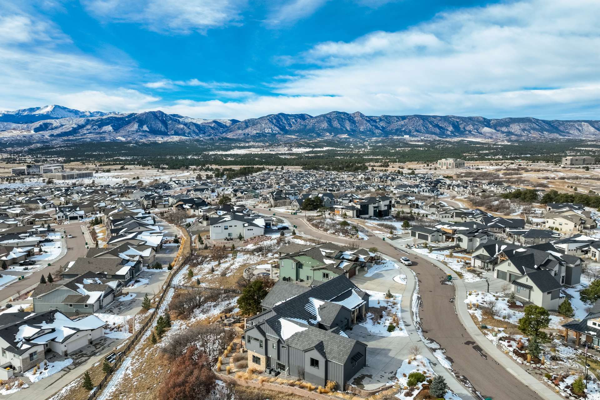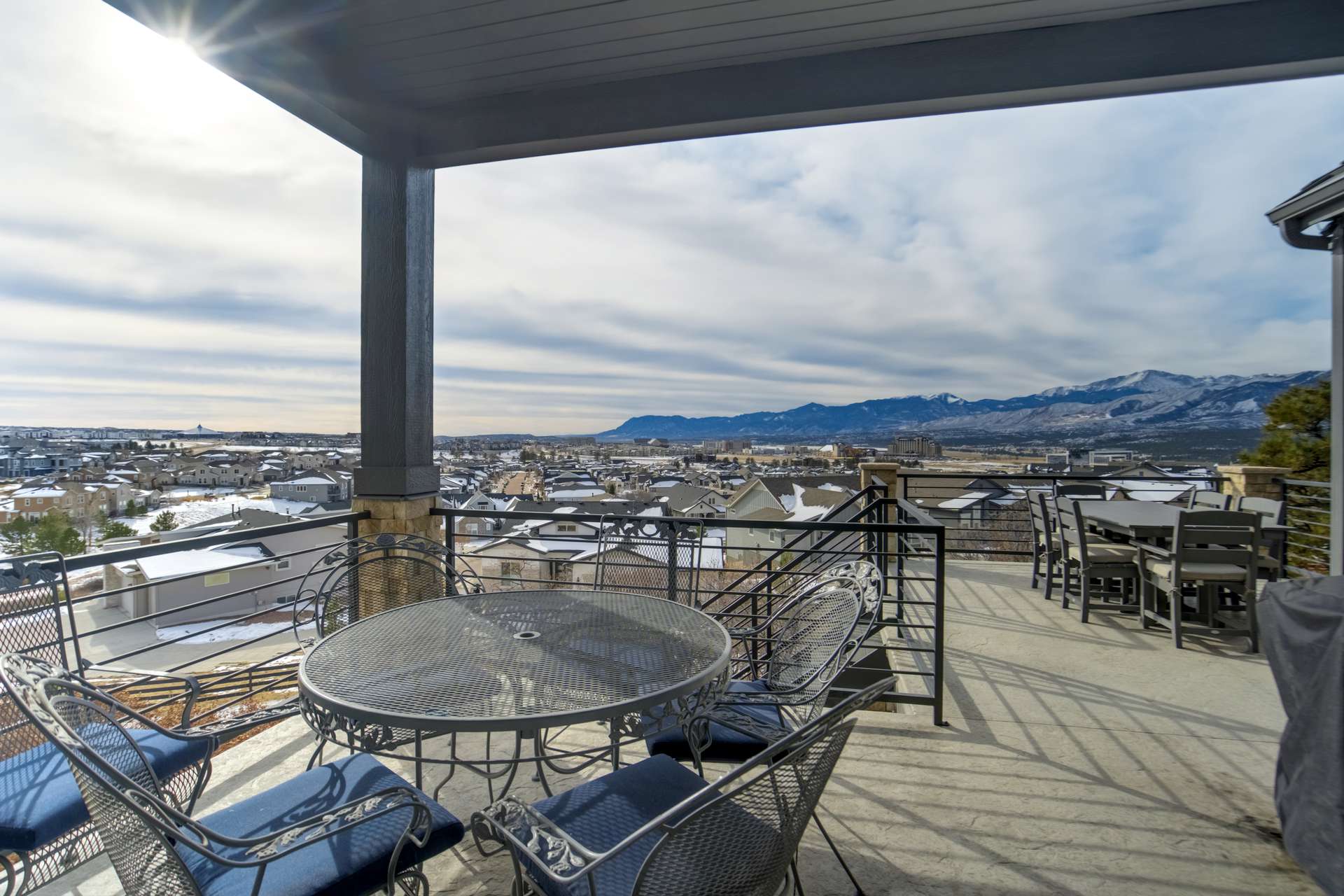 Set within the custom Julep Estates neighborhood of The Farm, this exceptional custom home blends modern Farmhouse architecture with thoughtful design, flexibility, and breathtaking Pikes Peak views. Designed for both everyday comfort and effortless entertaining, the open-concept layout is filled with natural light and seamless indoor/outdoor connections. The great room showcases expansive views of Pikes Peak with a stacking slider that opens to covered patios, creating an ideal setting for indoor/outdoor living. Light hardwood floors, custom finishes, and a dedicated sunroom add warmth and sophistication throughout the main living spaces. The gourmet kitchen anchors the home with an oversized island, granite and marble countertops, double ovens, gas range, and abundant storage—perfect for entertaining friends and family. The main-level primary suite offers a peaceful retreat with mountain views, a spa-inspired bath featuring a soaking tub, oversized custom shower, Carrara marble countertops, and a generous walk-in closet with built-ins. Additional bedrooms provide flexibility for family, guests, or work-from-home needs, while the finished basement expands the living space with a wet bar, workout or recreation room, flex rooms, and a secure vault room. An attached in-law suite provides a private living area with its own entrance, full kitchen, living room with fireplace, bedroom, bathroom, covered deck, and garage —ideal for multigenerational living or extended guests. Outdoor living is equally impressive, with multiple patios, covered decks, a fire pit, a hot tub, a water feature, and professionally landscaped grounds designed for beauty and low maintenance. The oversized 4+ car garages feature extra-tall ceilings, workshop space, EV charging, and extensive storage. With high-performance systems, whole-house audio, fiber-optic connectivity, and designer finishes throughout, this home offers a rare combination of luxury, versatility, and iconic Front Range views.