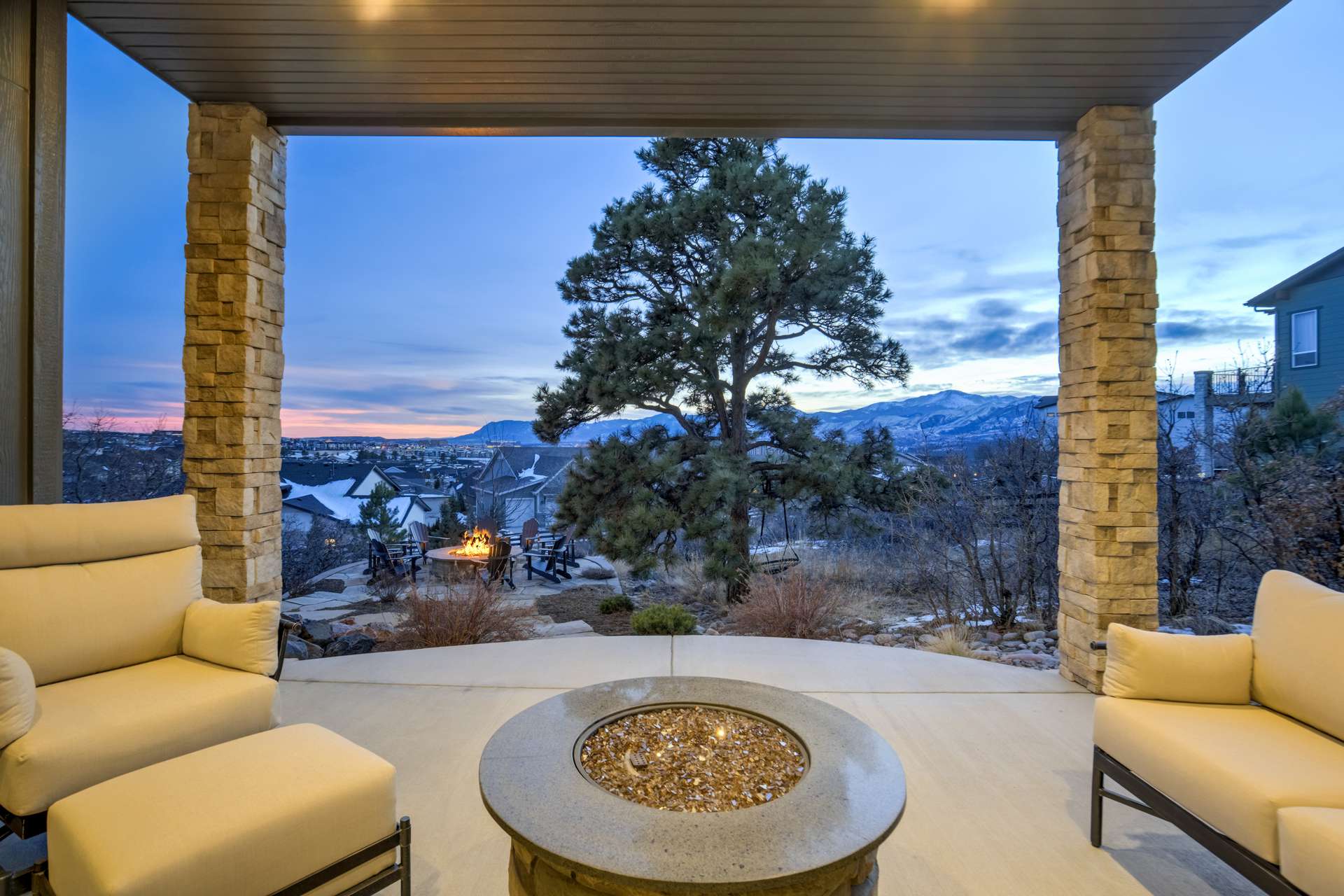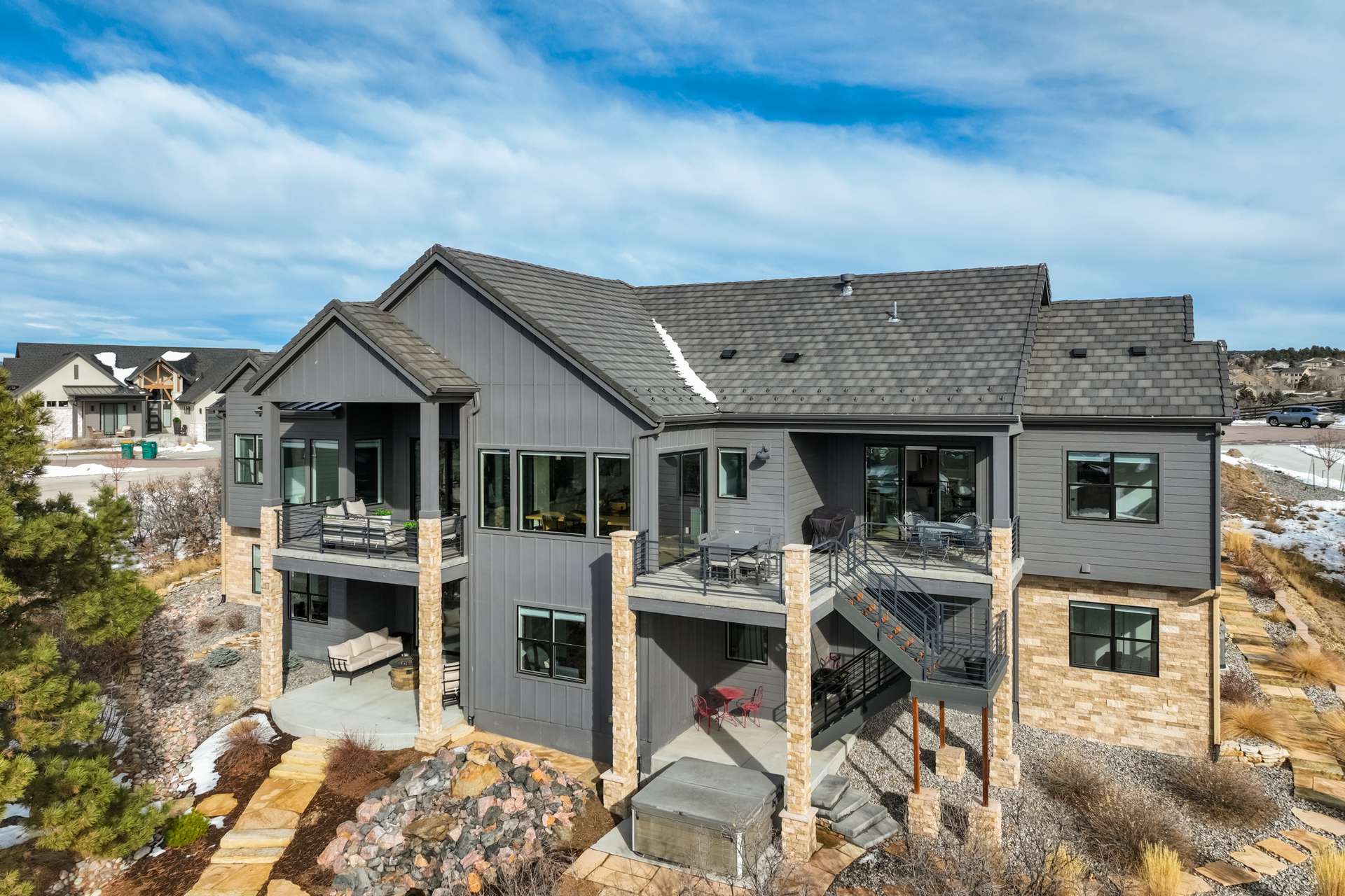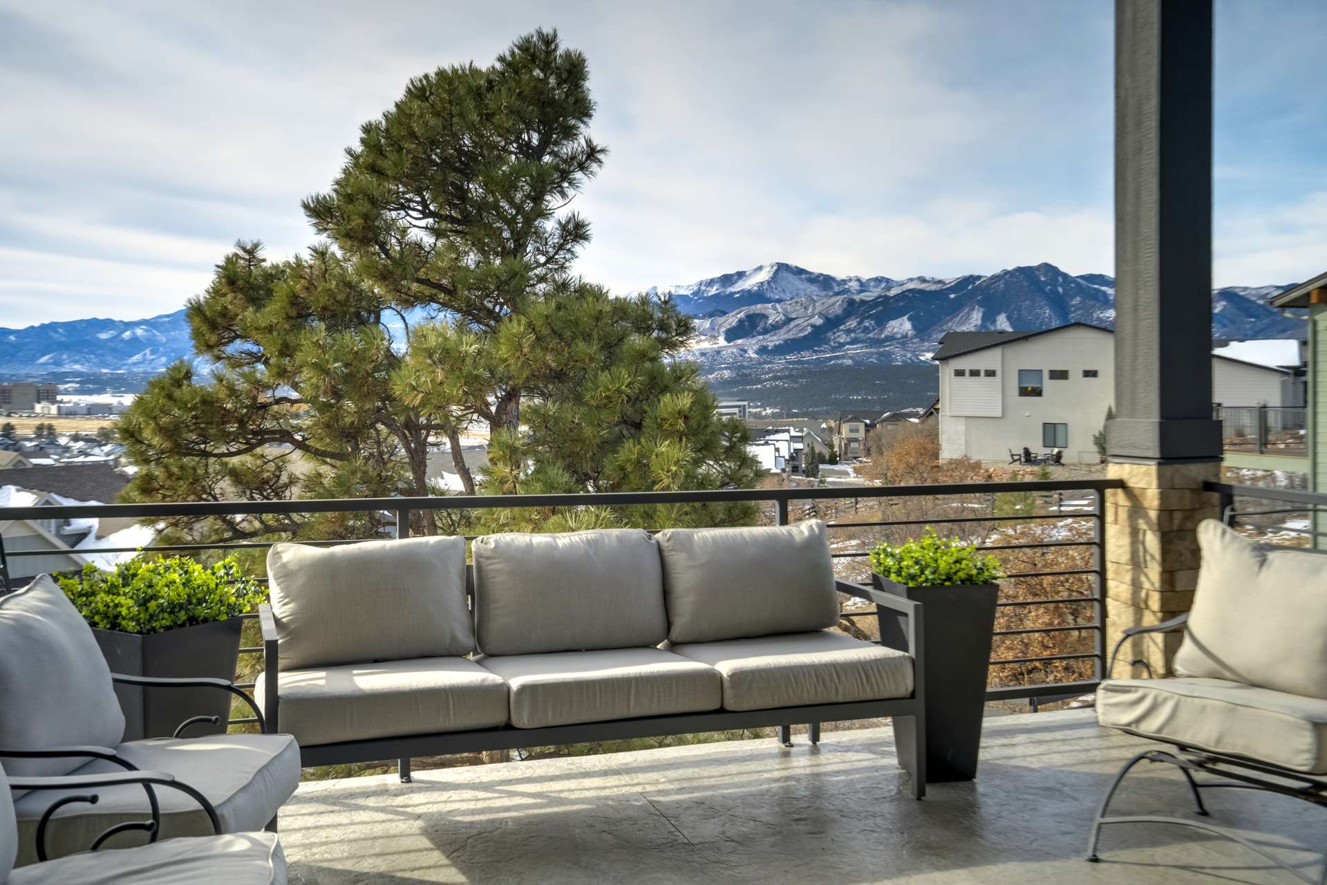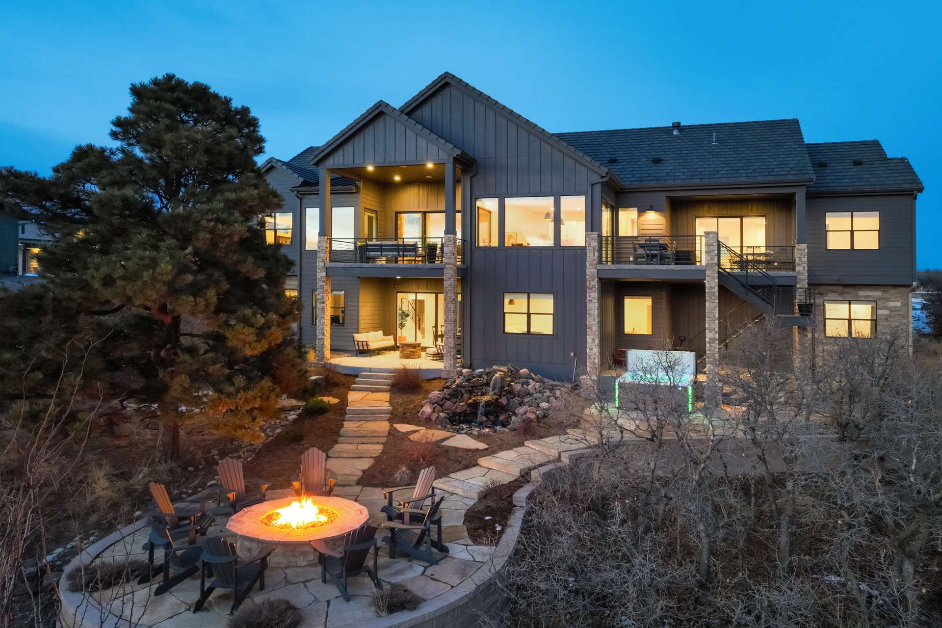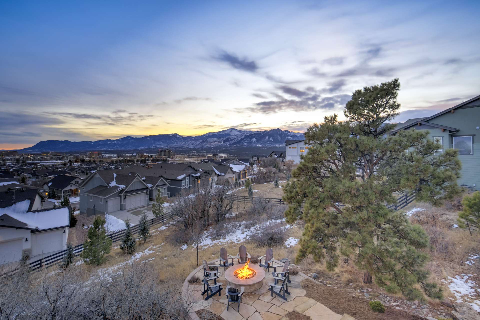Set within the custom Julep Estates neighborhood of The Farm, this exceptional custom home blends modern Farmhouse architecture with thoughtful design, flexibility, and breathtaking Pikes Peak views. Designed for both everyday comfort and effortless entertaining, the open-concept layout is filled with natural light and seamless indoor/outdoor connections. The great room showcases expansive views of Pikes Peak with a stacking slider that opens to covered patios, creating an ideal setting for indoor/outdoor living. Light hardwood floors, custom finishes, and a dedicated sunroom add warmth and sophistication throughout the main living spaces. The gourmet kitchen anchors the home with an oversized island, granite and marble countertops, double ovens, gas range, and abundant storage—perfect for entertaining friends and family. The main-level primary suite offers a peaceful retreat with mountain views, a spa-inspired bath featuring a soaking tub, oversized custom shower, Carrara marble countertops, and a generous walk-in closet with built-ins. Additional bedrooms provide flexibility for family, guests, or work-from-home needs, while the finished basement expands the living space with a wet bar, workout or recreation room, flex rooms, and a secure vault room. An attached in-law suite provides a private living area with its own entrance, full kitchen, living room with fireplace, bedroom, bathroom, covered deck, and garage —ideal for multigenerational living or extended guests. Outdoor living is equally impressive, with multiple patios, covered decks, a fire pit, a hot tub, a water feature, and professionally landscaped grounds designed for beauty and low maintenance. The oversized 4+ car garages feature extra-tall ceilings, workshop space, EV charging, and extensive storage. With high-performance systems, whole-house audio, fiber-optic connectivity, and designer finishes throughout, this home offers a rare combination of luxury, versatility, and iconic Front Range views.