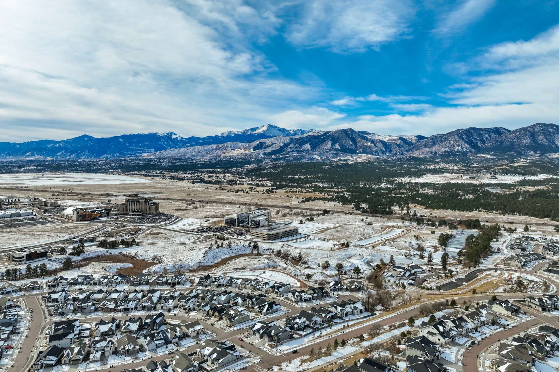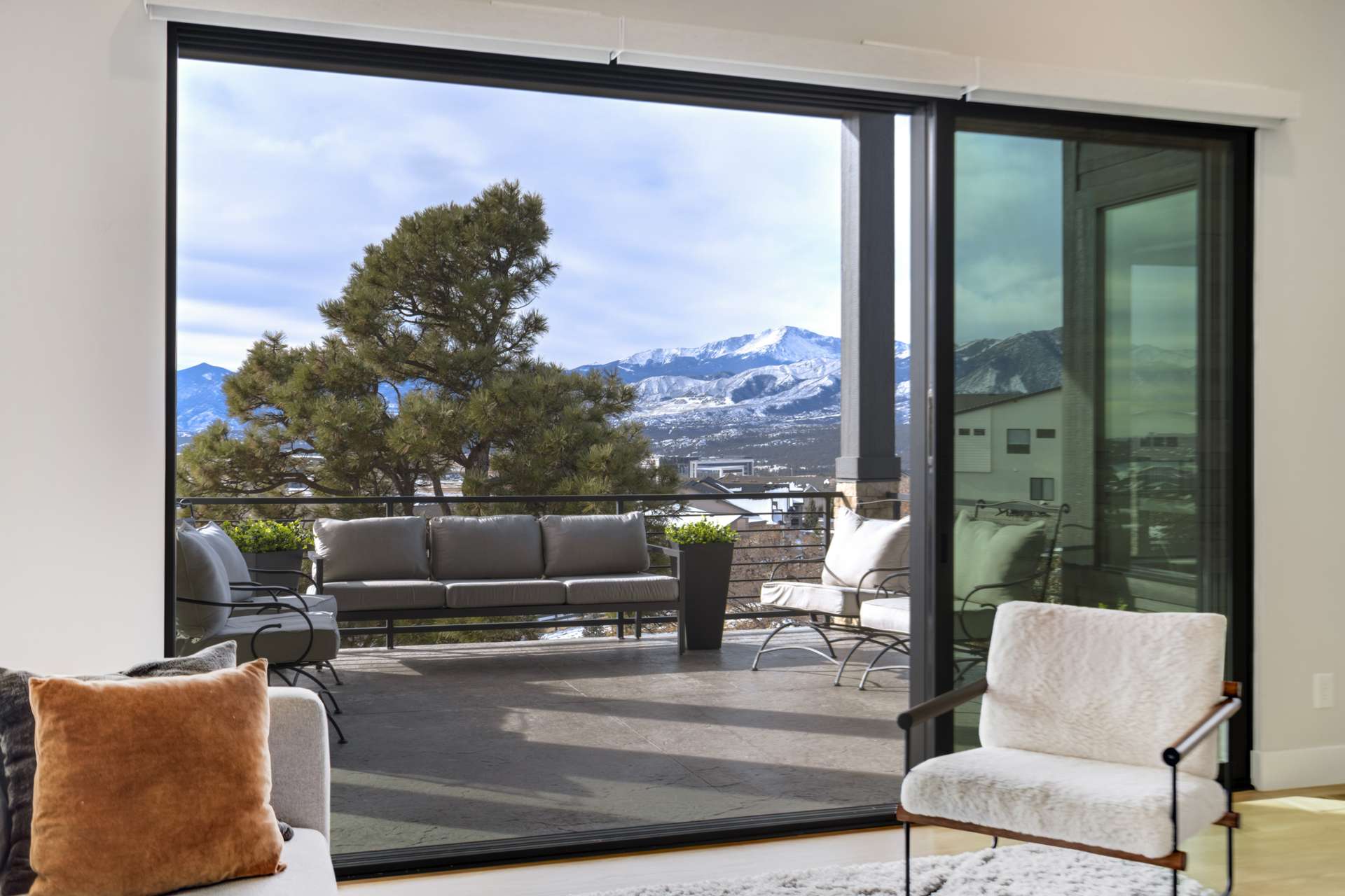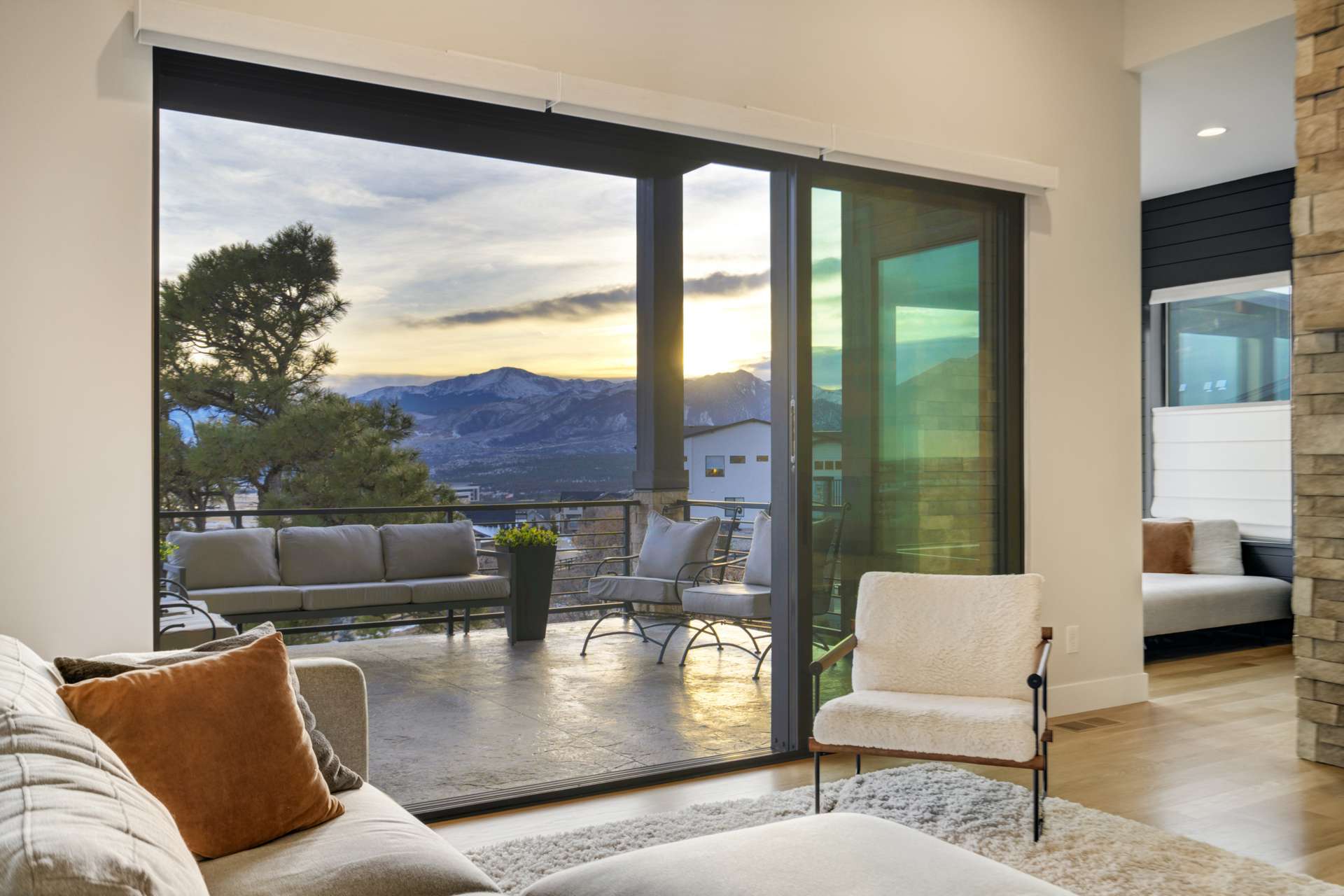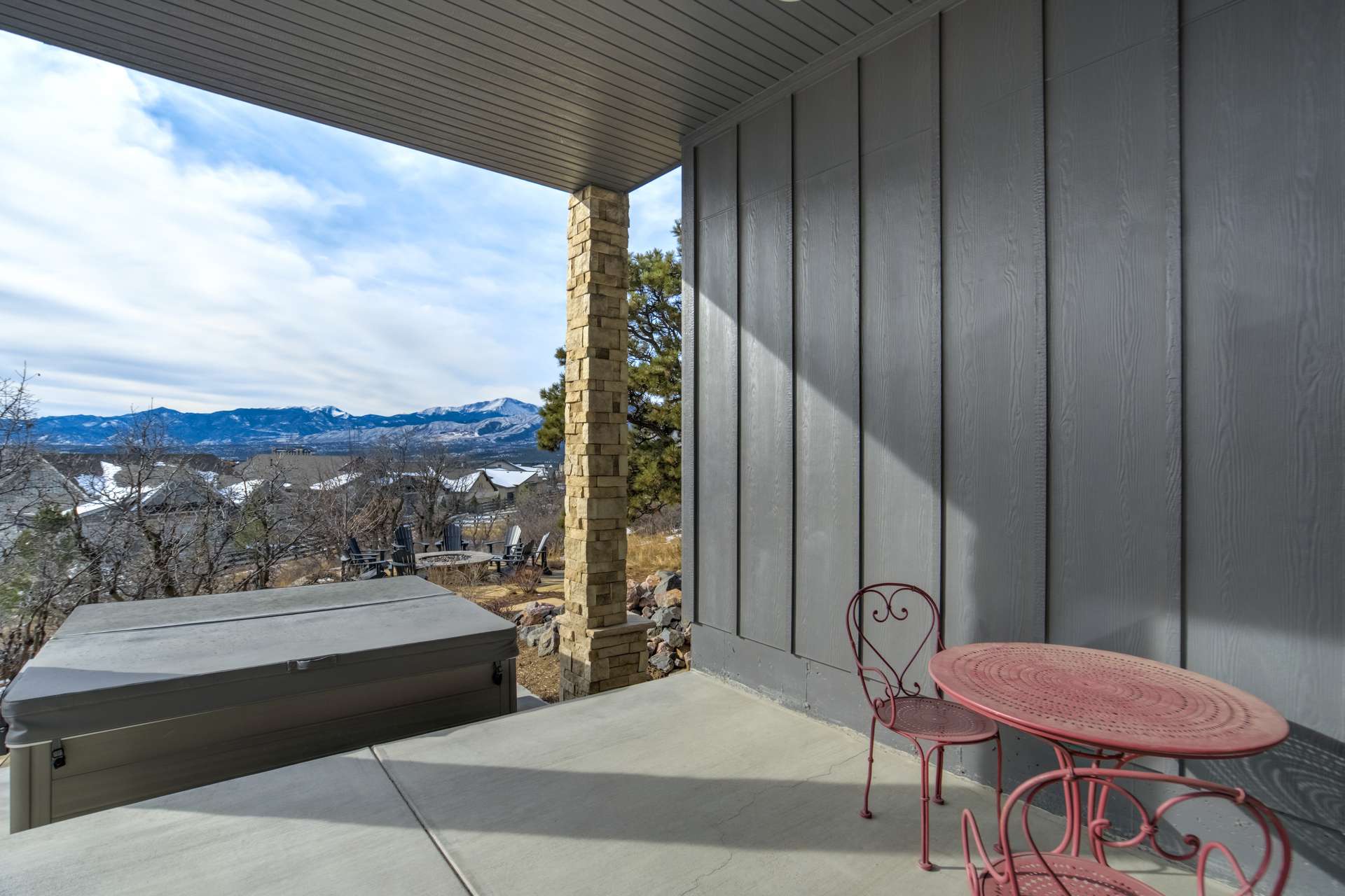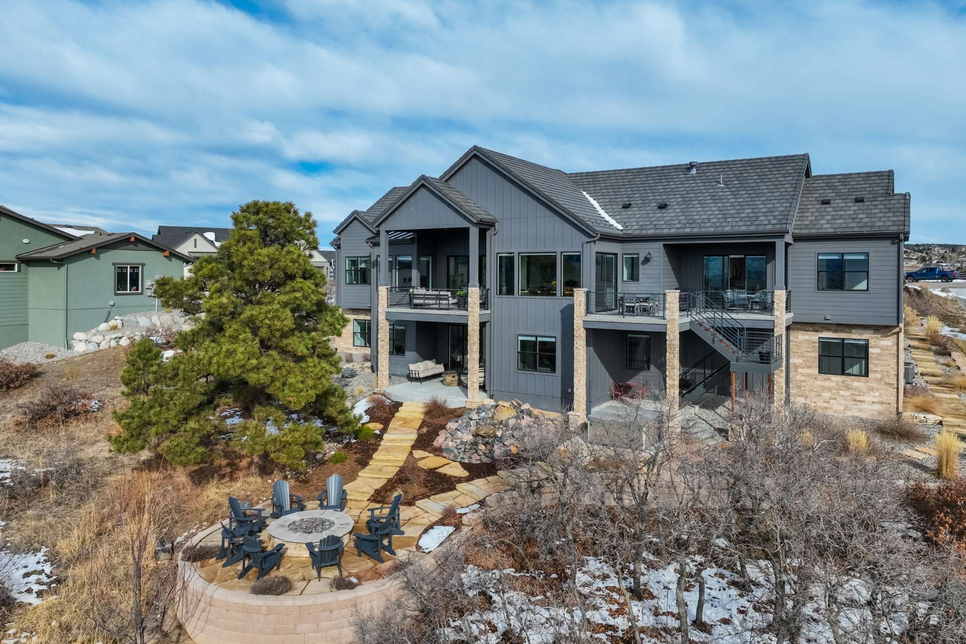 Set within the custom Julep Estates neighborhood of The Farm, this exceptional custom home blends modern Farmhouse architecture with thoughtful design, flexibility, and breathtaking Pikes Peak views. Designed for both everyday comfort and effortless entertaining, the open-concept layout is filled with natural light and seamless indoor/outdoor connections. The great room showcases expansive views of Pikes Peak with a stacking slider that opens to covered patios, creating an ideal setting for indoor/outdoor living. Light hardwood floors, custom finishes, and a dedicated sunroom add warmth and sophistication throughout the main living spaces. The gourmet kitchen anchors the home with an oversized island, granite and marble countertops, double ovens, gas range, and abundant storage—perfect for entertaining friends and family. The main-level primary suite offers a peaceful retreat with mountain views, a spa-inspired bath featuring a soaking tub, oversized custom shower, Carrara marble countertops, and a generous walk-in closet with built-ins. Additional bedrooms provide flexibility for family, guests, or work-from-home needs, while the finished basement expands the living space with a wet bar, workout or recreation room, flex rooms, and a secure vault room. An attached in-law suite provides a private living area with its own entrance, full kitchen, living room with fireplace, bedroom, bathroom, covered deck, and garage —ideal for multigenerational living or extended guests. Outdoor living is equally impressive, with multiple patios, covered decks, a fire pit, a hot tub, a water feature, and professionally landscaped grounds designed for beauty and low maintenance. The oversized 4+ car garages feature extra-tall ceilings, workshop space, EV charging, and extensive storage. With high-performance systems, whole-house audio, fiber-optic connectivity, and designer finishes throughout, this home offers a rare combination of luxury, versatility, and iconic Front Range views.