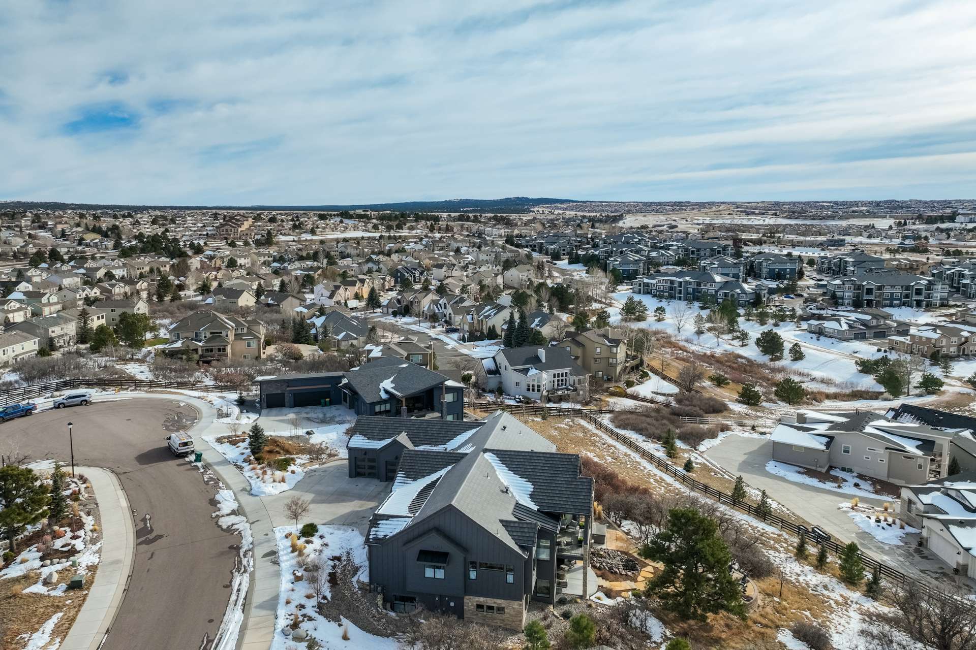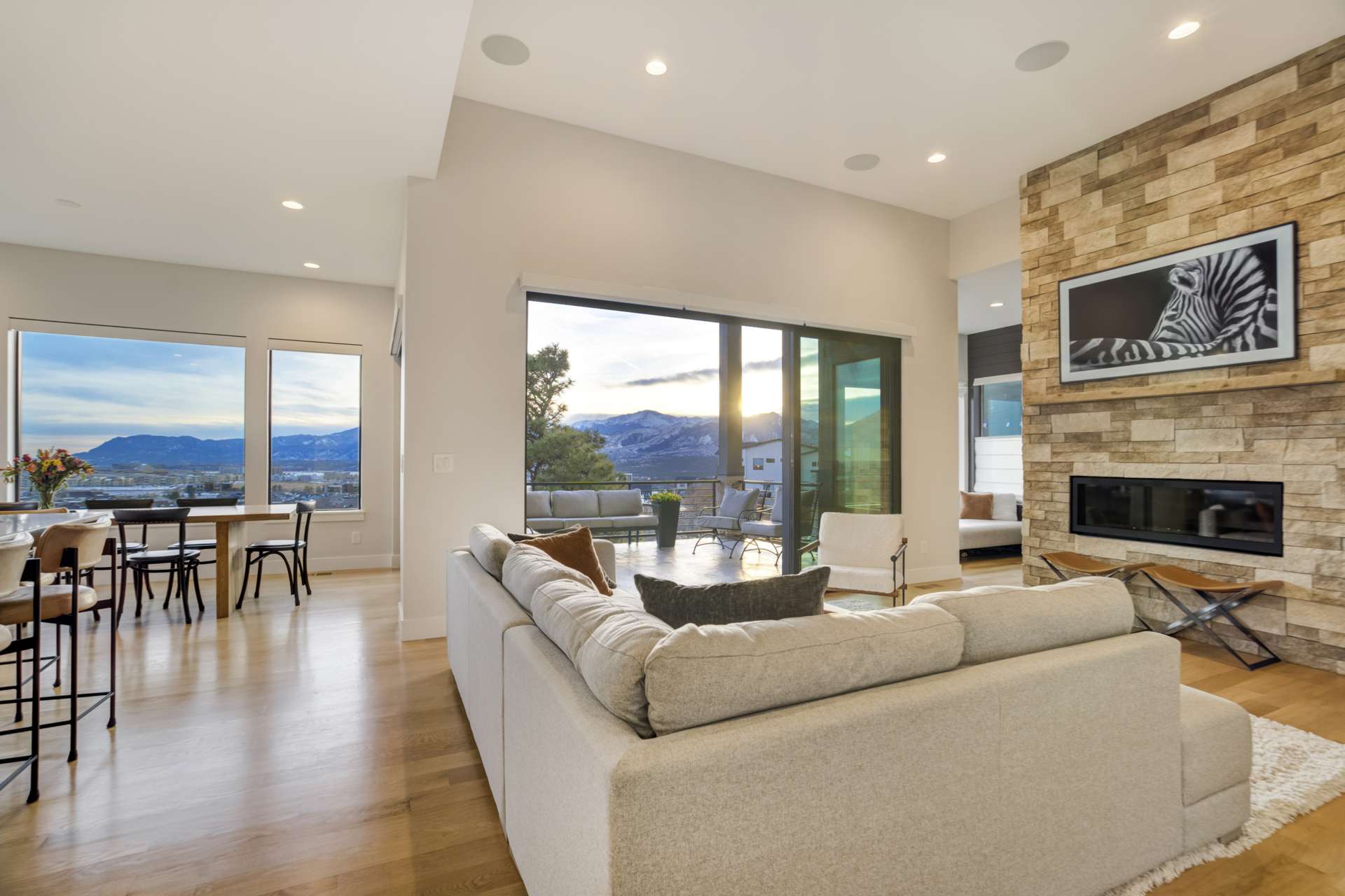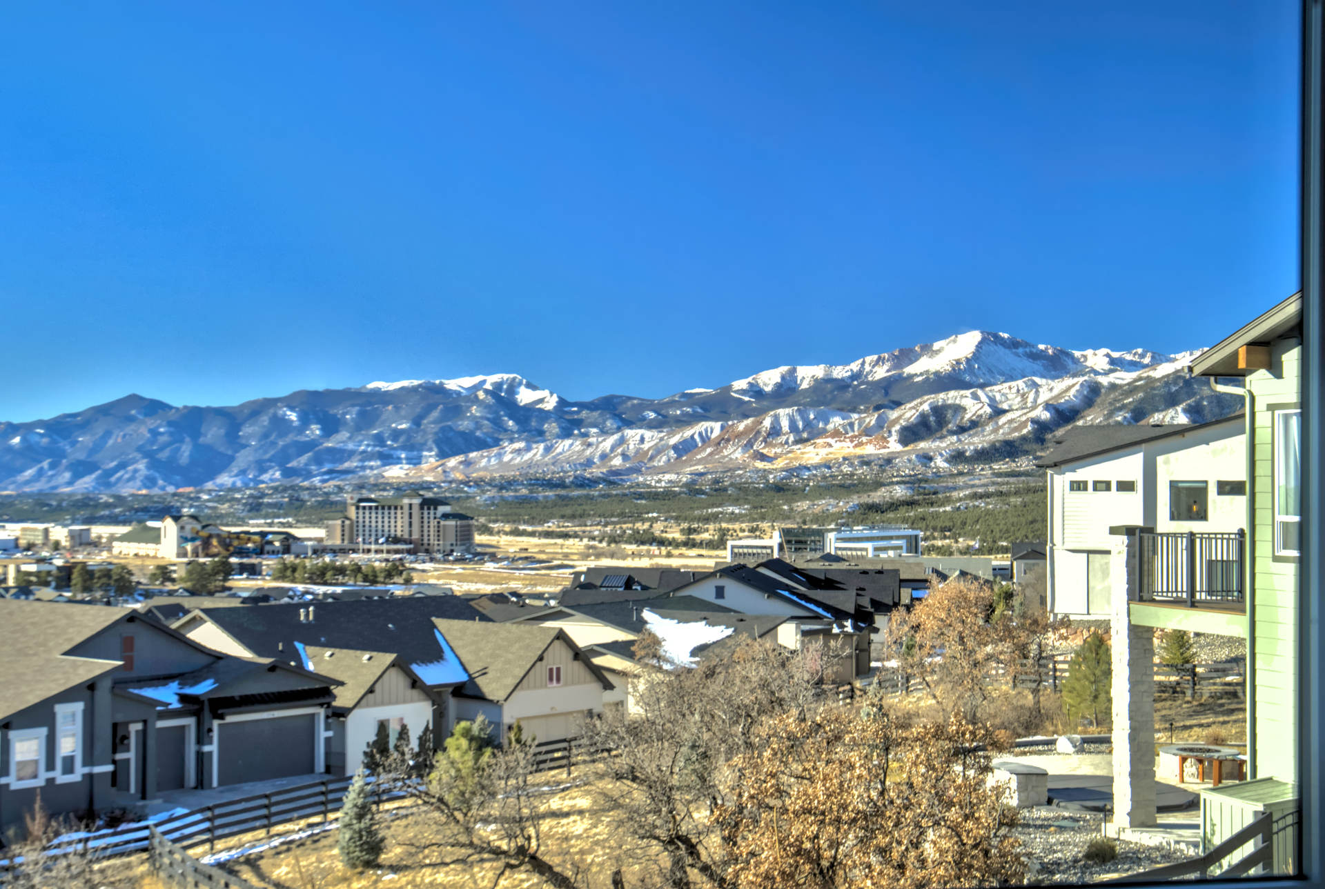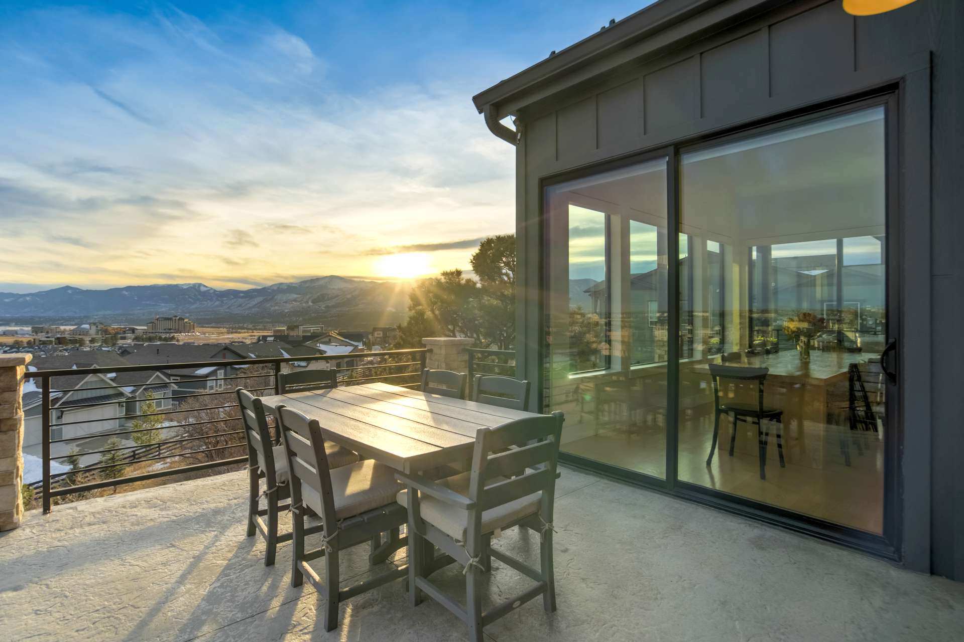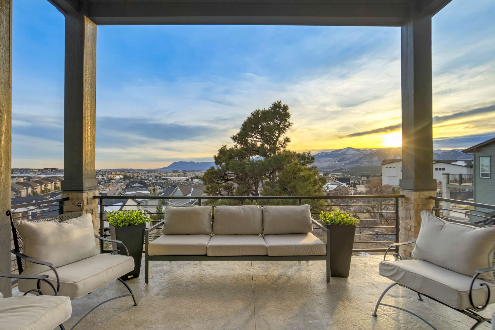 Set within the custom Julep Estates neighborhood of The Farm, this exceptional custom home blends modern Farmhouse architecture with thoughtful design, flexibility, and breathtaking Pikes Peak views. Designed for both everyday comfort and effortless entertaining, the open-concept layout is filled with natural light and seamless indoor/outdoor connections. The great room showcases expansive views of Pikes Peak with a stacking slider that opens to covered patios, creating an ideal setting for indoor/outdoor living. Light hardwood floors, custom finishes, and a dedicated sunroom add warmth and sophistication throughout the main living spaces. The gourmet kitchen anchors the home with an oversized island, granite and marble countertops, double ovens, gas range, and abundant storage—perfect for entertaining friends and family. The main-level primary suite offers a peaceful retreat with mountain views, a spa-inspired bath featuring a soaking tub, oversized custom shower, Carrara marble countertops, and a generous walk-in closet with built-ins. Additional bedrooms provide flexibility for family, guests, or work-from-home needs, while the finished basement expands the living space with a wet bar, workout or recreation room, flex rooms, and a secure vault room. An attached in-law suite provides a private living area with its own entrance, full kitchen, living room with fireplace, bedroom, bathroom, covered deck, and garage —ideal for multigenerational living or extended guests. Outdoor living is equally impressive, with multiple patios, covered decks, a fire pit, a hot tub, a water feature, and professionally landscaped grounds designed for beauty and low maintenance. The oversized 4+ car garages feature extra-tall ceilings, workshop space, EV charging, and extensive storage. With high-performance systems, whole-house audio, fiber-optic connectivity, and designer finishes throughout, this home offers a rare combination of luxury, versatility, and iconic Front Range views.
