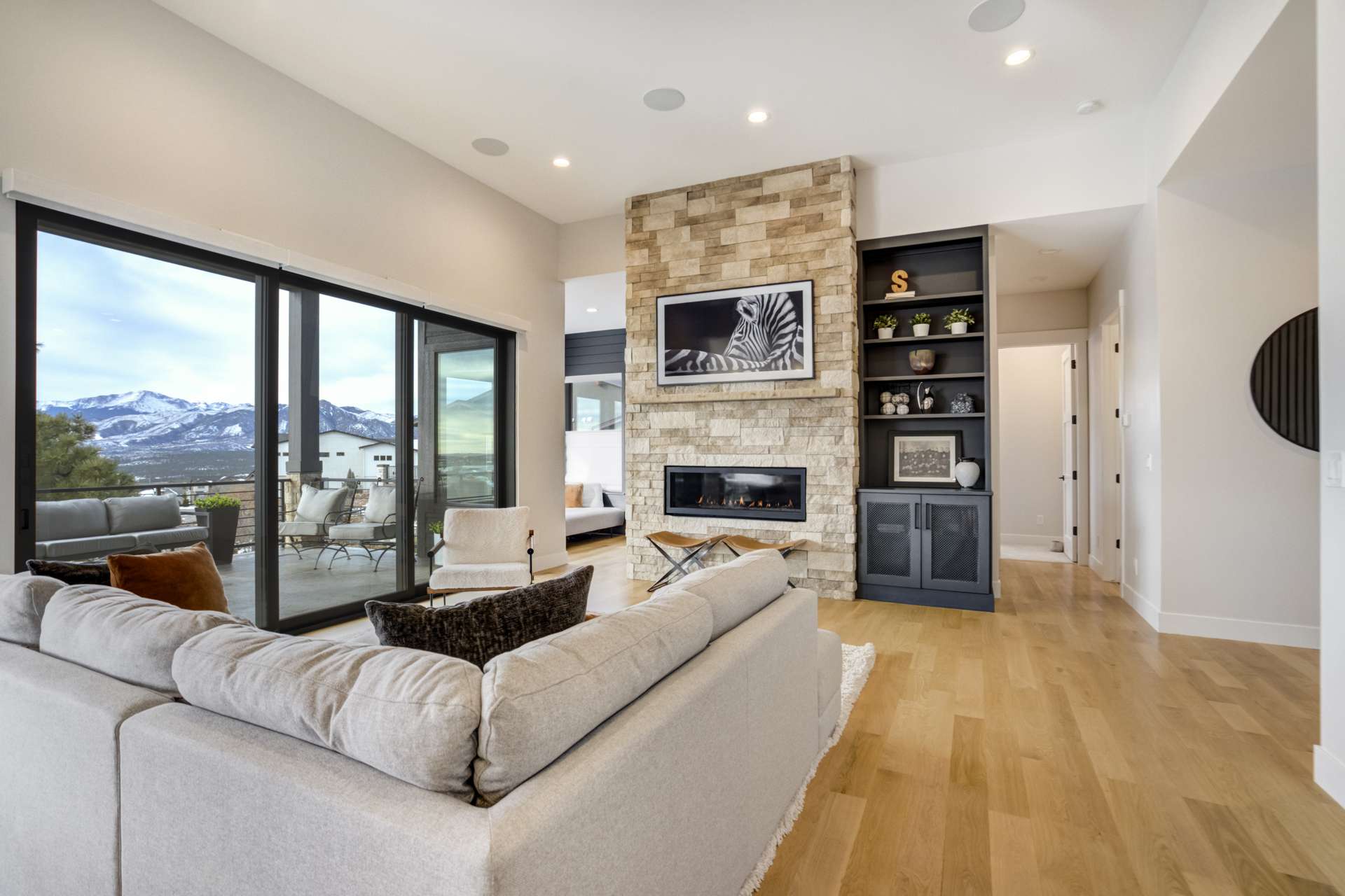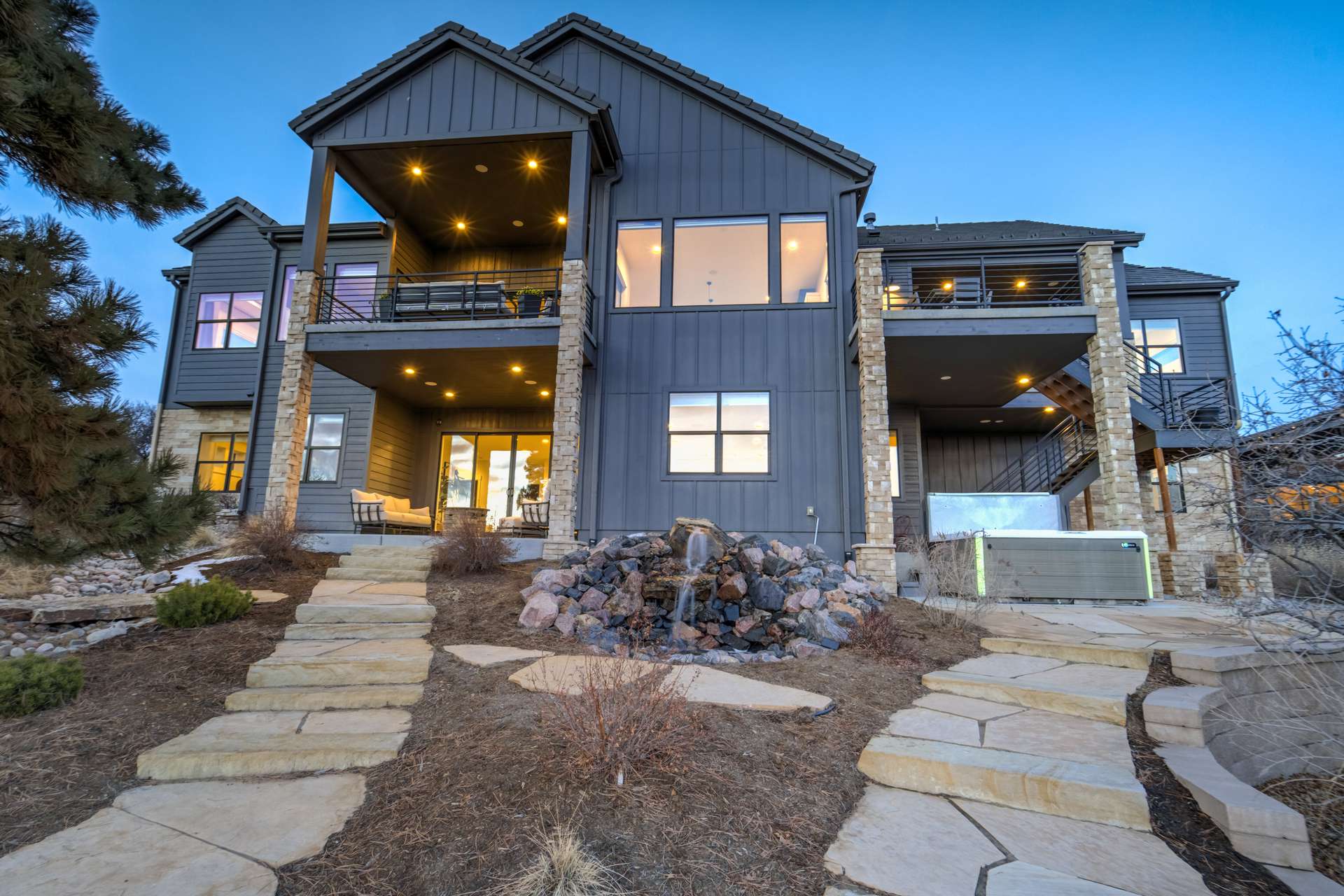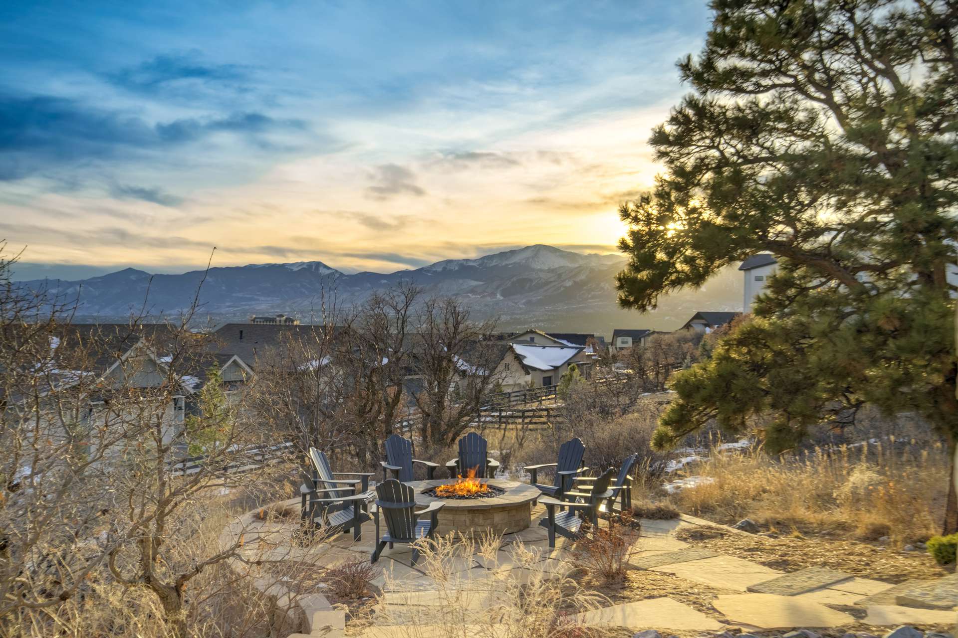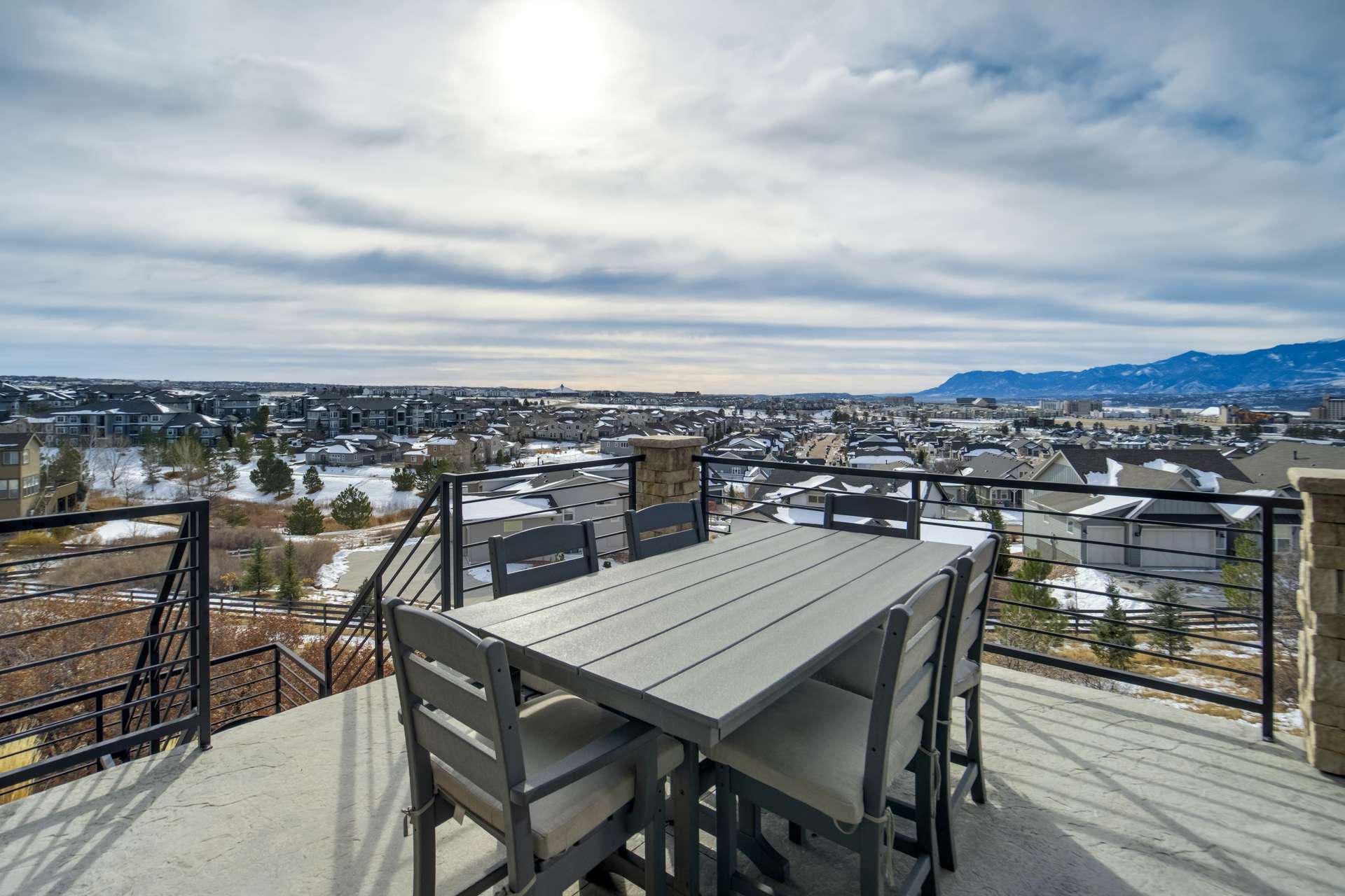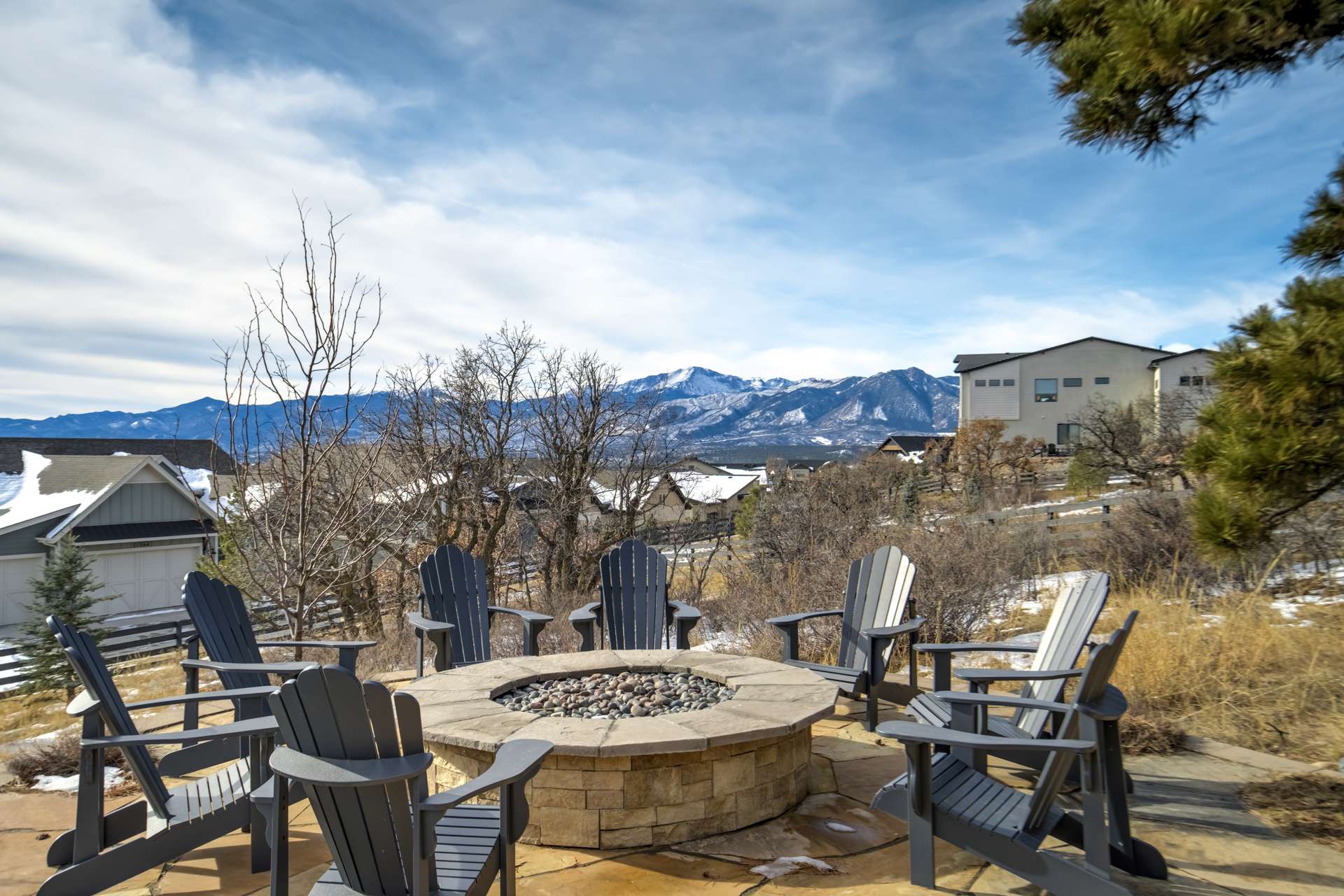 Set within the custom Julep Estates neighborhood of The Farm, this exceptional custom home blends modern Farmhouse architecture with thoughtful design, flexibility, and breathtaking Pikes Peak views. Designed for both everyday comfort and effortless entertaining, the open-concept layout is filled with natural light and seamless indoor/outdoor connections. The great room showcases expansive views of Pikes Peak with a stacking slider that opens to covered patios, creating an ideal setting for indoor/outdoor living. Light hardwood floors, custom finishes, and a dedicated sunroom add warmth and sophistication throughout the main living spaces. The gourmet kitchen anchors the home with an oversized island, granite and marble countertops, double ovens, gas range, and abundant storage—perfect for entertaining friends and family. The main-level primary suite offers a peaceful retreat with mountain views, a spa-inspired bath featuring a soaking tub, oversized custom shower, Carrara marble countertops, and a generous walk-in closet with built-ins. Additional bedrooms provide flexibility for family, guests, or work-from-home needs, while the finished basement expands the living space with a wet bar, workout or recreation room, flex rooms, and a secure vault room. An attached in-law suite provides a private living area with its own entrance, full kitchen, living room with fireplace, bedroom, bathroom, covered deck, and garage —ideal for multigenerational living or extended guests. Outdoor living is equally impressive, with multiple patios, covered decks, a fire pit, a hot tub, a water feature, and professionally landscaped grounds designed for beauty and low maintenance. The oversized 4+ car garages feature extra-tall ceilings, workshop space, EV charging, and extensive storage. With high-performance systems, whole-house audio, fiber-optic connectivity, and designer finishes throughout, this home offers a rare combination of luxury, versatility, and iconic Front Range views.