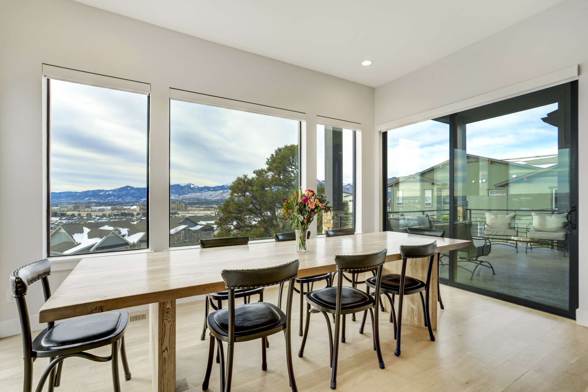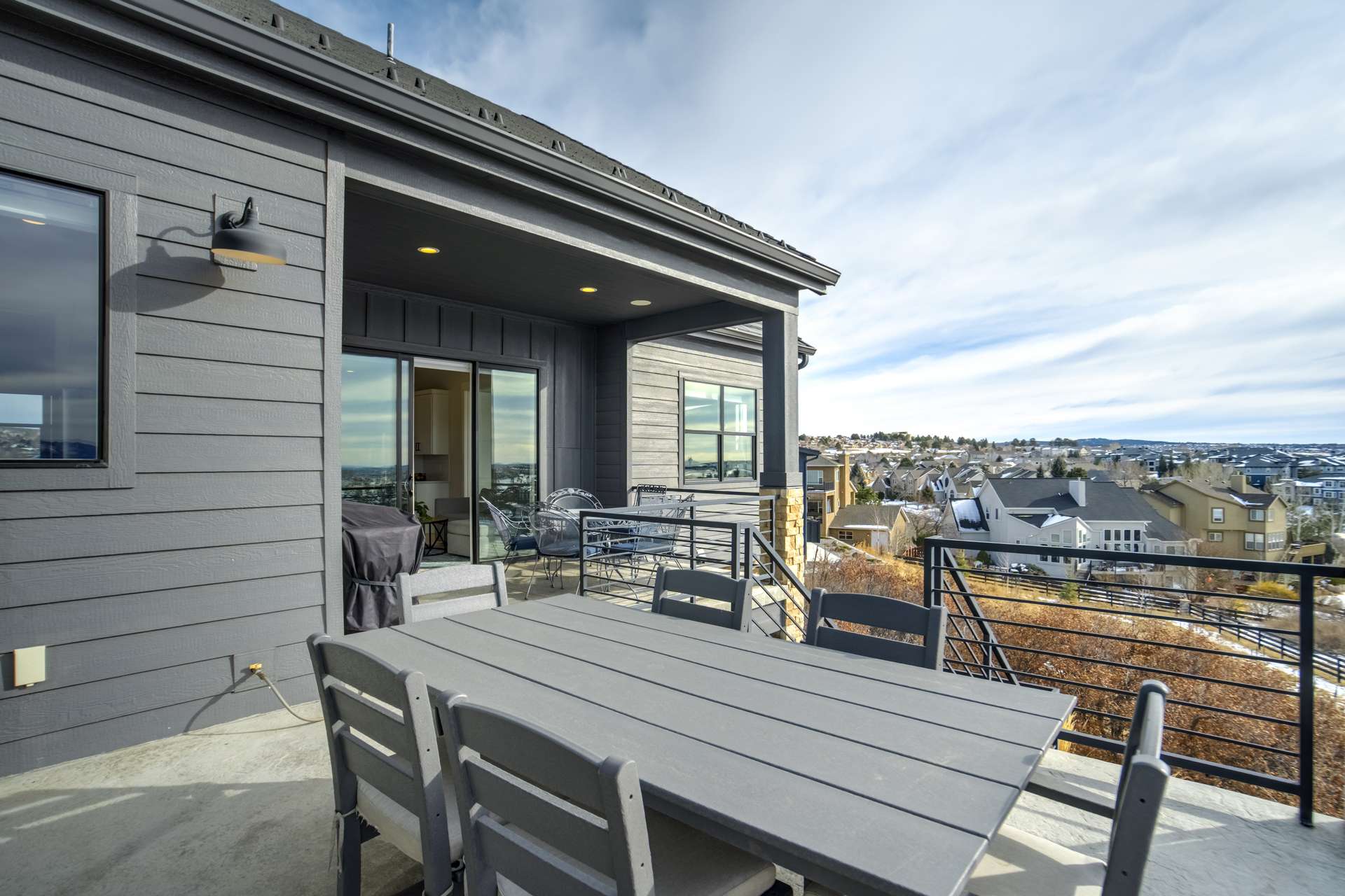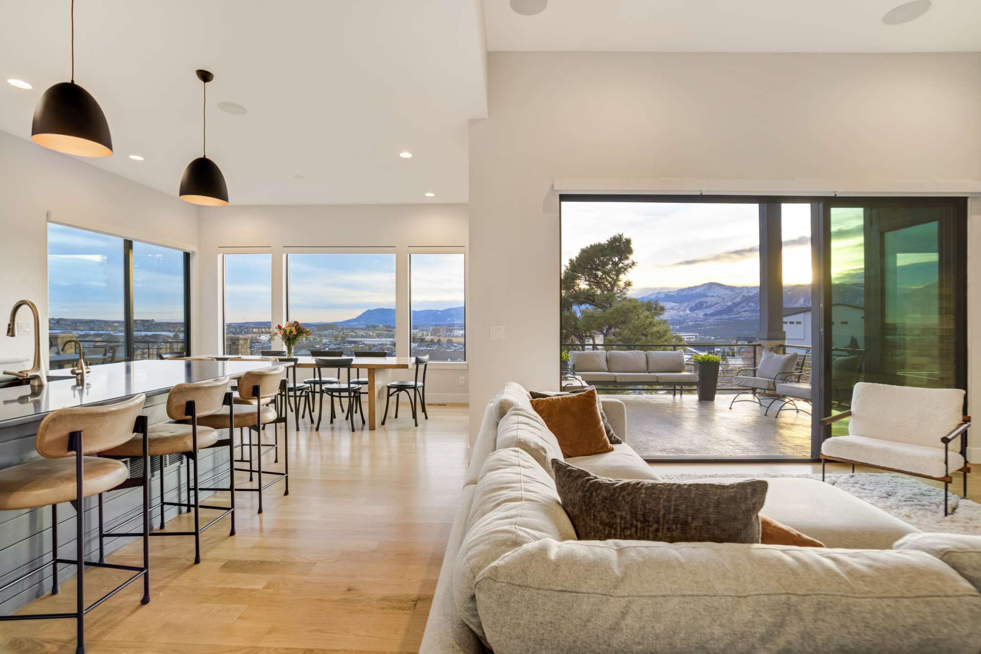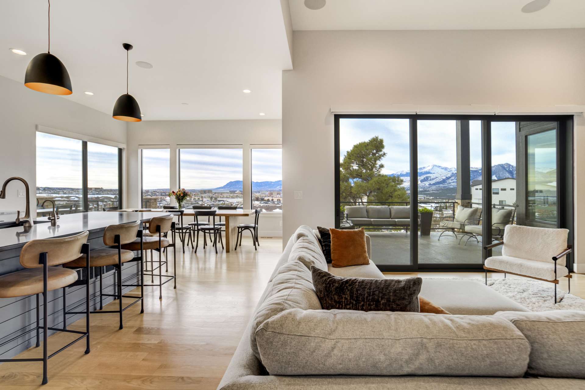 Set within the custom Julep Estates neighborhood of The Farm, this exceptional custom home blends modern Farmhouse architecture with thoughtful design, flexibility, and breathtaking Pikes Peak views. Designed for both everyday comfort and effortless entertaining, the open-concept layout is filled with natural light and seamless indoor/outdoor connections. The great room showcases expansive views of Pikes Peak with a stacking slider that opens to covered patios, creating an ideal setting for indoor/outdoor living. Light hardwood floors, custom finishes, and a dedicated sunroom add warmth and sophistication throughout the main living spaces. The gourmet kitchen anchors the home with an oversized island, granite and marble countertops, double ovens, gas range, and abundant storage—perfect for entertaining friends and family. The main-level primary suite offers a peaceful retreat with mountain views, a spa-inspired bath featuring a soaking tub, oversized custom shower, Carrara marble countertops, and a generous walk-in closet with built-ins. Additional bedrooms provide flexibility for family, guests, or work-from-home needs, while the finished basement expands the living space with a wet bar, workout or recreation room, flex rooms, and a secure vault room. An attached in-law suite provides a private living area with its own entrance, full kitchen, living room with fireplace, bedroom, bathroom, covered deck, and garage —ideal for multigenerational living or extended guests. Outdoor living is equally impressive, with multiple patios, covered decks, a fire pit, a hot tub, a water feature, and professionally landscaped grounds designed for beauty and low maintenance. The oversized 4+ car garages feature extra-tall ceilings, workshop space, EV charging, and extensive storage. With high-performance systems, whole-house audio, fiber-optic connectivity, and designer finishes throughout, this home offers a rare combination of luxury, versatility, and iconic Front Range views.