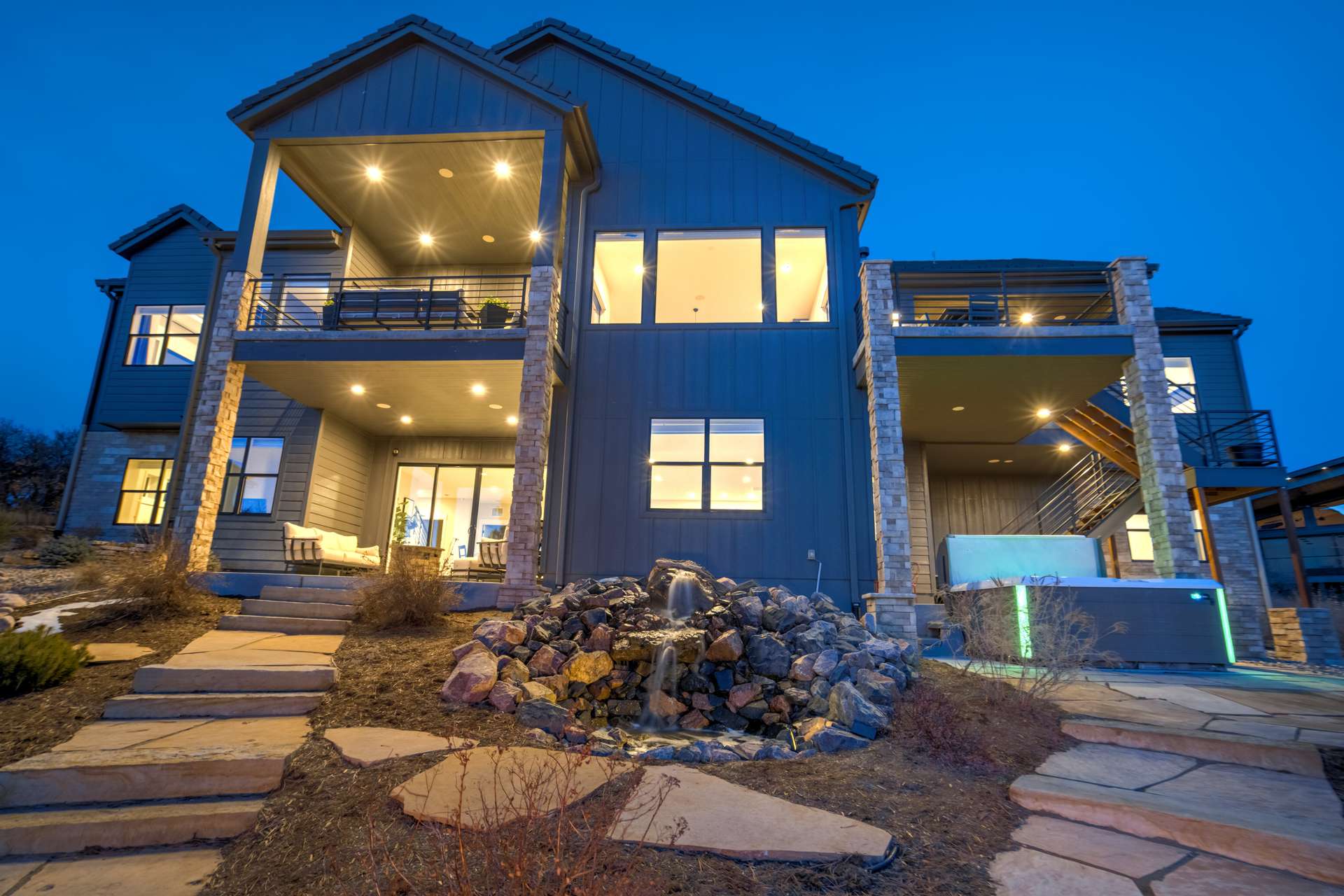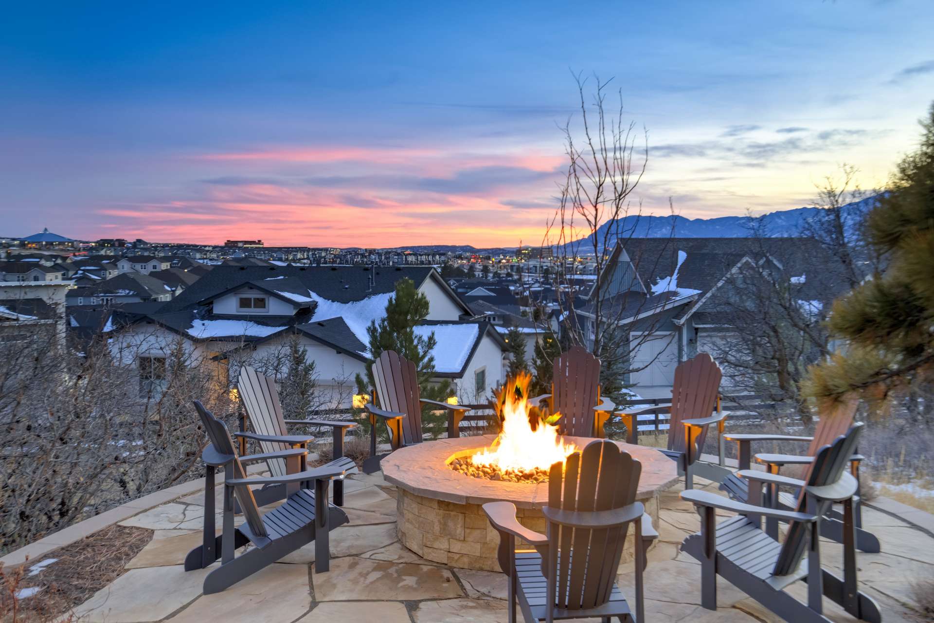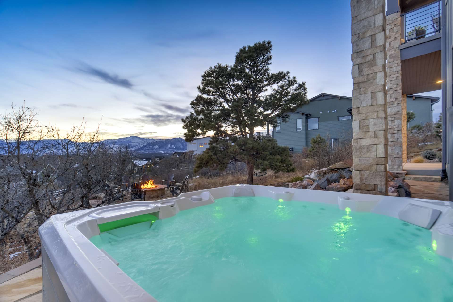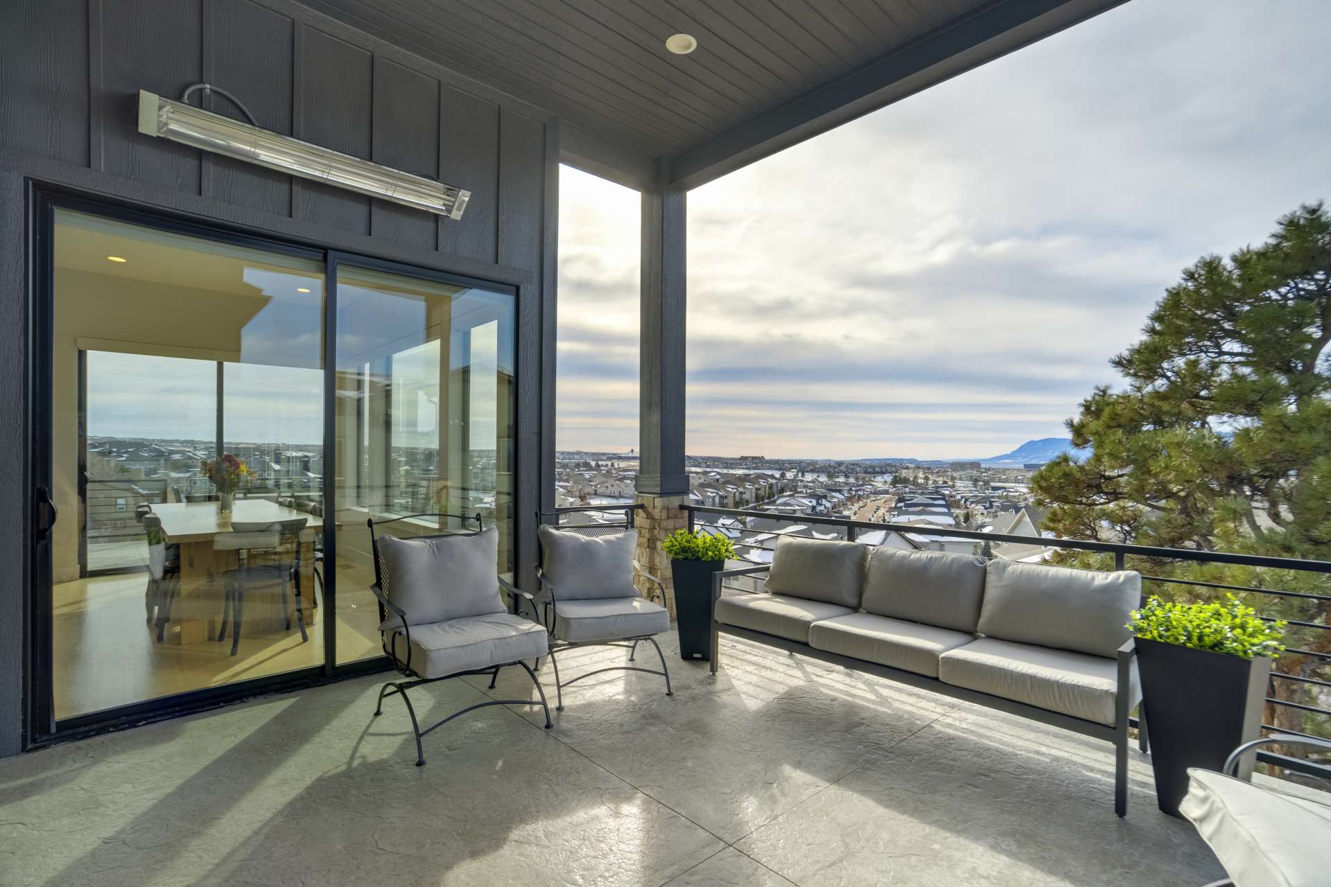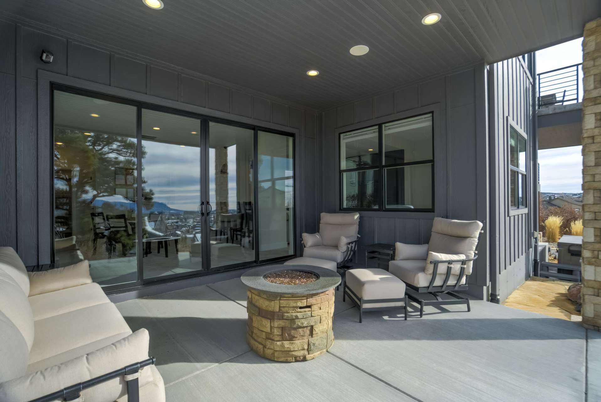 Set within the custom Julep Estates neighborhood of The Farm, this exceptional custom home blends modern Farmhouse architecture with thoughtful design, flexibility, and breathtaking Pikes Peak views. Designed for both everyday comfort and effortless entertaining, the open-concept layout is filled with natural light and seamless indoor/outdoor connections. The great room showcases expansive views of Pikes Peak with a stacking slider that opens to covered patios, creating an ideal setting for indoor/outdoor living. Light hardwood floors, custom finishes, and a dedicated sunroom add warmth and sophistication throughout the main living spaces. The gourmet kitchen anchors the home with an oversized island, granite and marble countertops, double ovens, gas range, and abundant storage—perfect for entertaining friends and family. The main-level primary suite offers a peaceful retreat with mountain views, a spa-inspired bath featuring a soaking tub, oversized custom shower, Carrara marble countertops, and a generous walk-in closet with built-ins. Additional bedrooms provide flexibility for family, guests, or work-from-home needs, while the finished basement expands the living space with a wet bar, workout or recreation room, flex rooms, and a secure vault room. An attached in-law suite provides a private living area with its own entrance, full kitchen, living room with fireplace, bedroom, bathroom, covered deck, and garage —ideal for multigenerational living or extended guests. Outdoor living is equally impressive, with multiple patios, covered decks, a fire pit, a hot tub, a water feature, and professionally landscaped grounds designed for beauty and low maintenance. The oversized 4+ car garages feature extra-tall ceilings, workshop space, EV charging, and extensive storage. With high-performance systems, whole-house audio, fiber-optic connectivity, and designer finishes throughout, this home offers a rare combination of luxury, versatility, and iconic Front Range views.