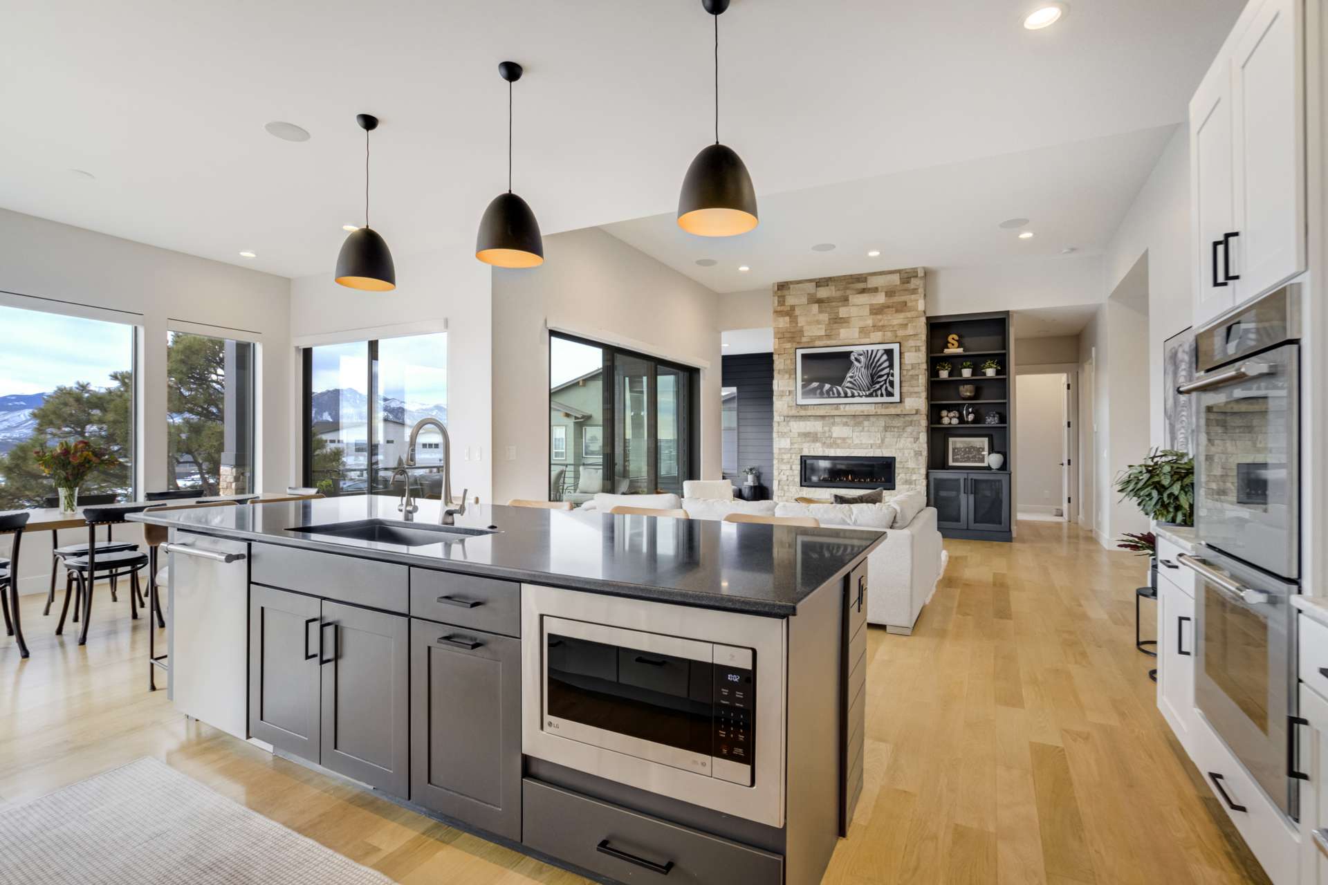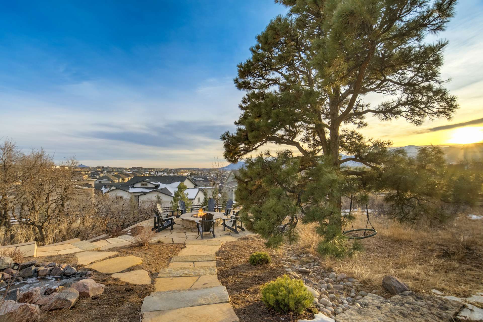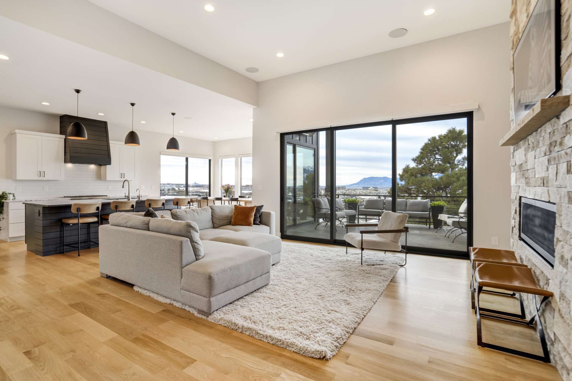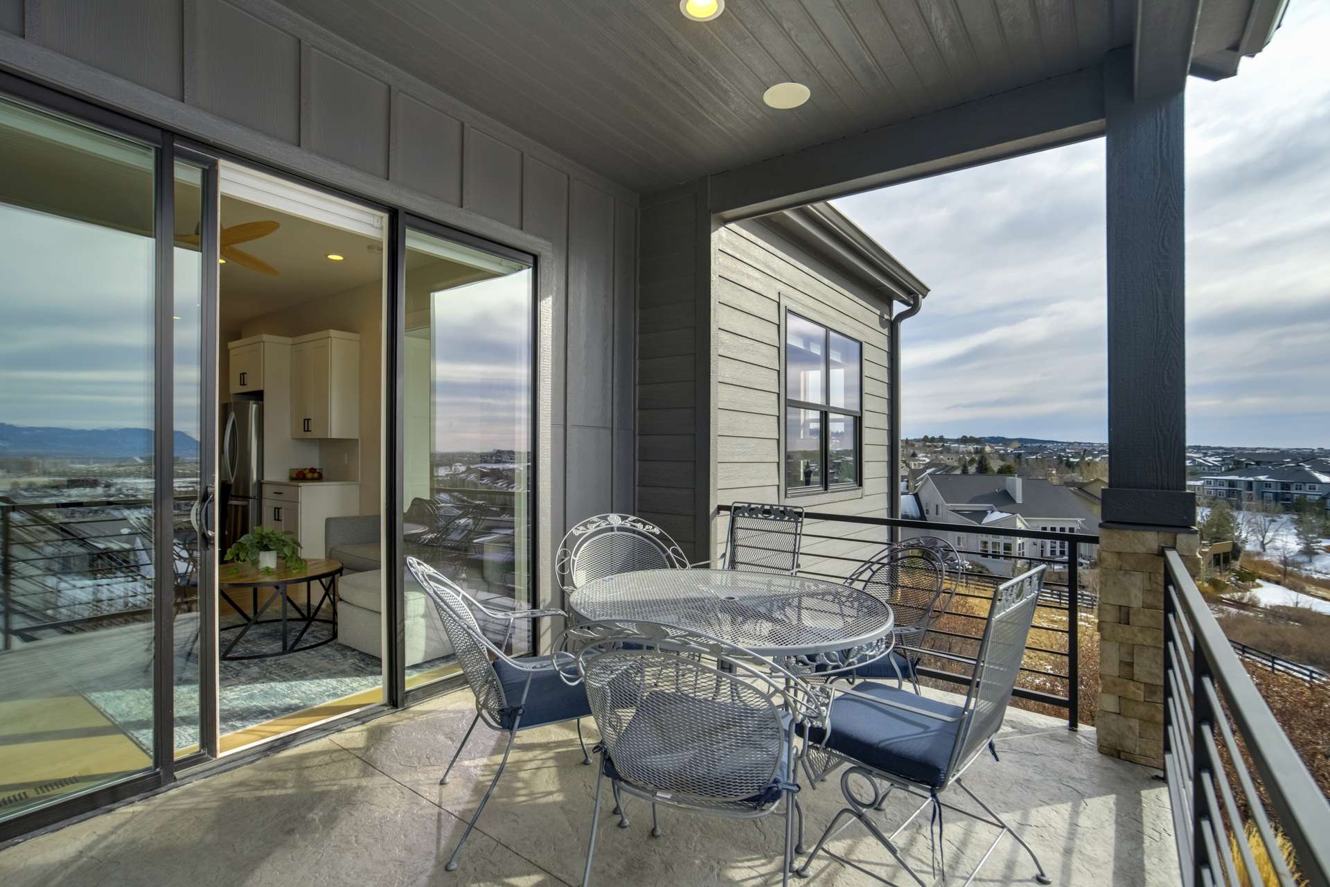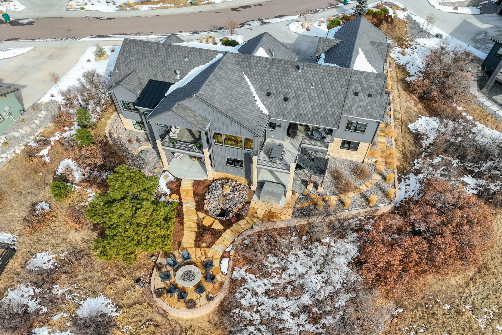 Set within the custom Julep Estates neighborhood of The Farm, this exceptional custom home blends modern Farmhouse architecture with thoughtful design, flexibility, and breathtaking Pikes Peak views. Designed for both everyday comfort and effortless entertaining, the open-concept layout is filled with natural light and seamless indoor/outdoor connections. The great room showcases expansive views of Pikes Peak with a stacking slider that opens to covered patios, creating an ideal setting for indoor/outdoor living. Light hardwood floors, custom finishes, and a dedicated sunroom add warmth and sophistication throughout the main living spaces. The gourmet kitchen anchors the home with an oversized island, granite and marble countertops, double ovens, gas range, and abundant storage—perfect for entertaining friends and family. The main-level primary suite offers a peaceful retreat with mountain views, a spa-inspired bath featuring a soaking tub, oversized custom shower, Carrara marble countertops, and a generous walk-in closet with built-ins. Additional bedrooms provide flexibility for family, guests, or work-from-home needs, while the finished basement expands the living space with a wet bar, workout or recreation room, flex rooms, and a secure vault room. An attached in-law suite provides a private living area with its own entrance, full kitchen, living room with fireplace, bedroom, bathroom, covered deck, and garage —ideal for multigenerational living or extended guests. Outdoor living is equally impressive, with multiple patios, covered decks, a fire pit, a hot tub, a water feature, and professionally landscaped grounds designed for beauty and low maintenance. The oversized 4+ car garages feature extra-tall ceilings, workshop space, EV charging, and extensive storage. With high-performance systems, whole-house audio, fiber-optic connectivity, and designer finishes throughout, this home offers a rare combination of luxury, versatility, and iconic Front Range views.