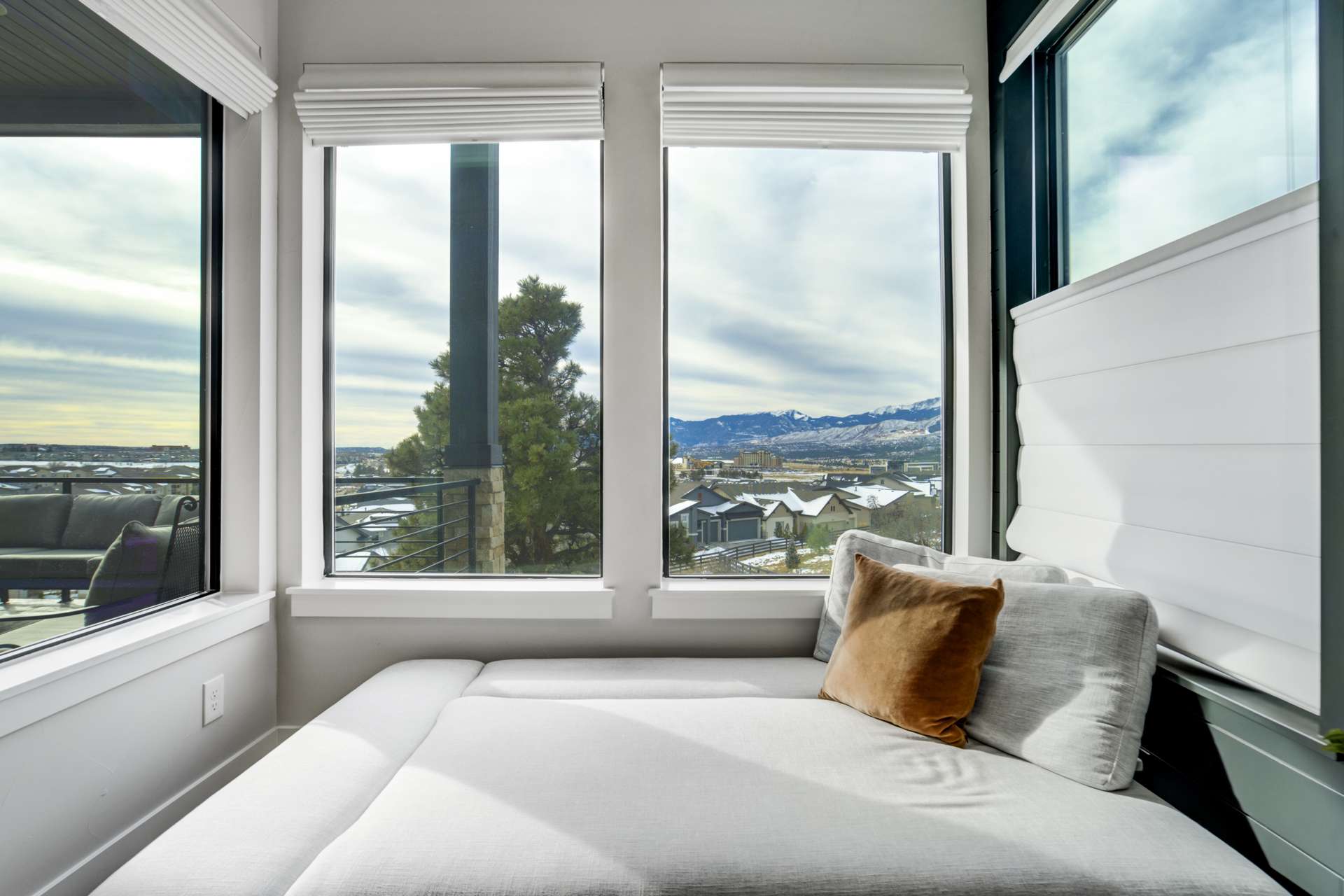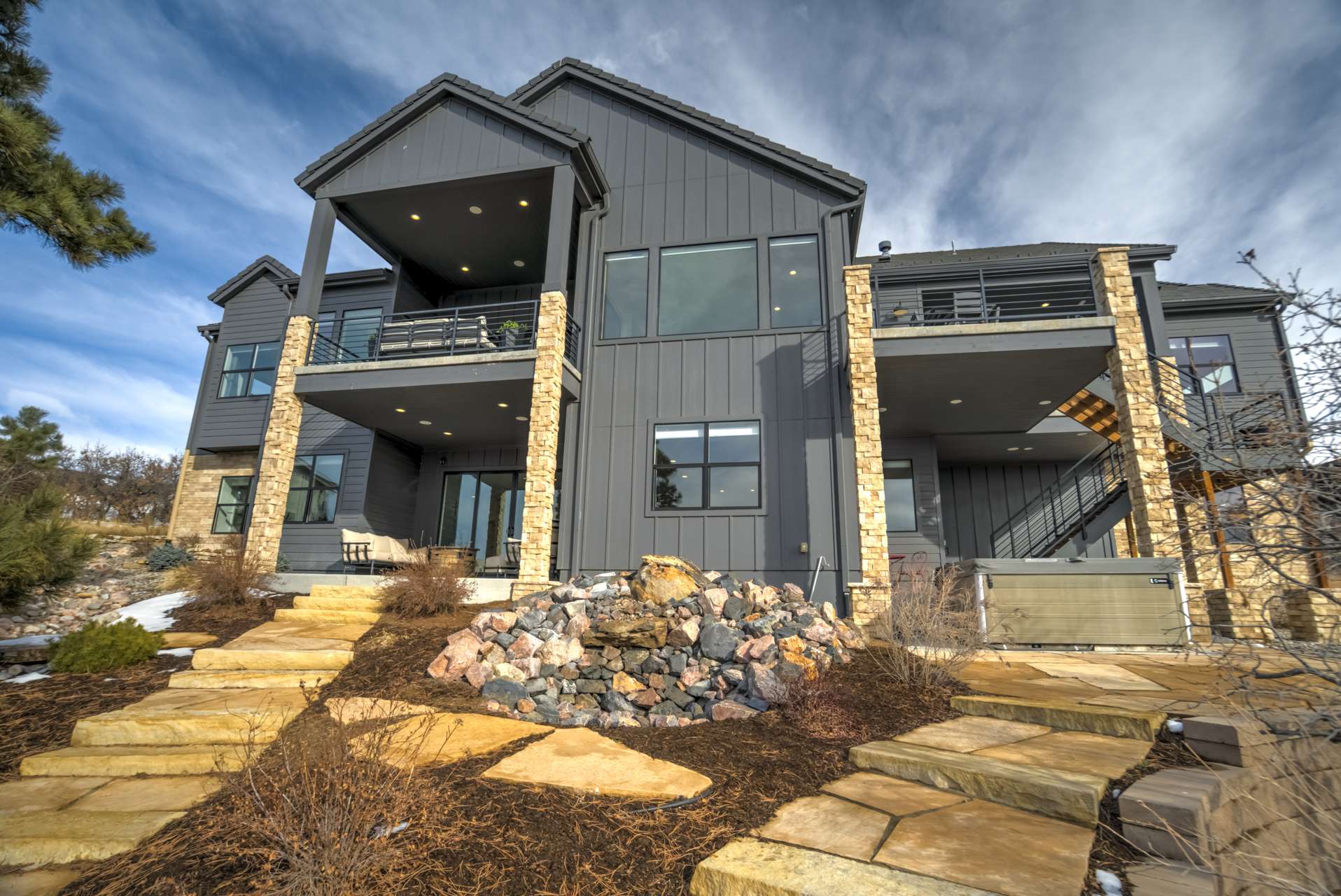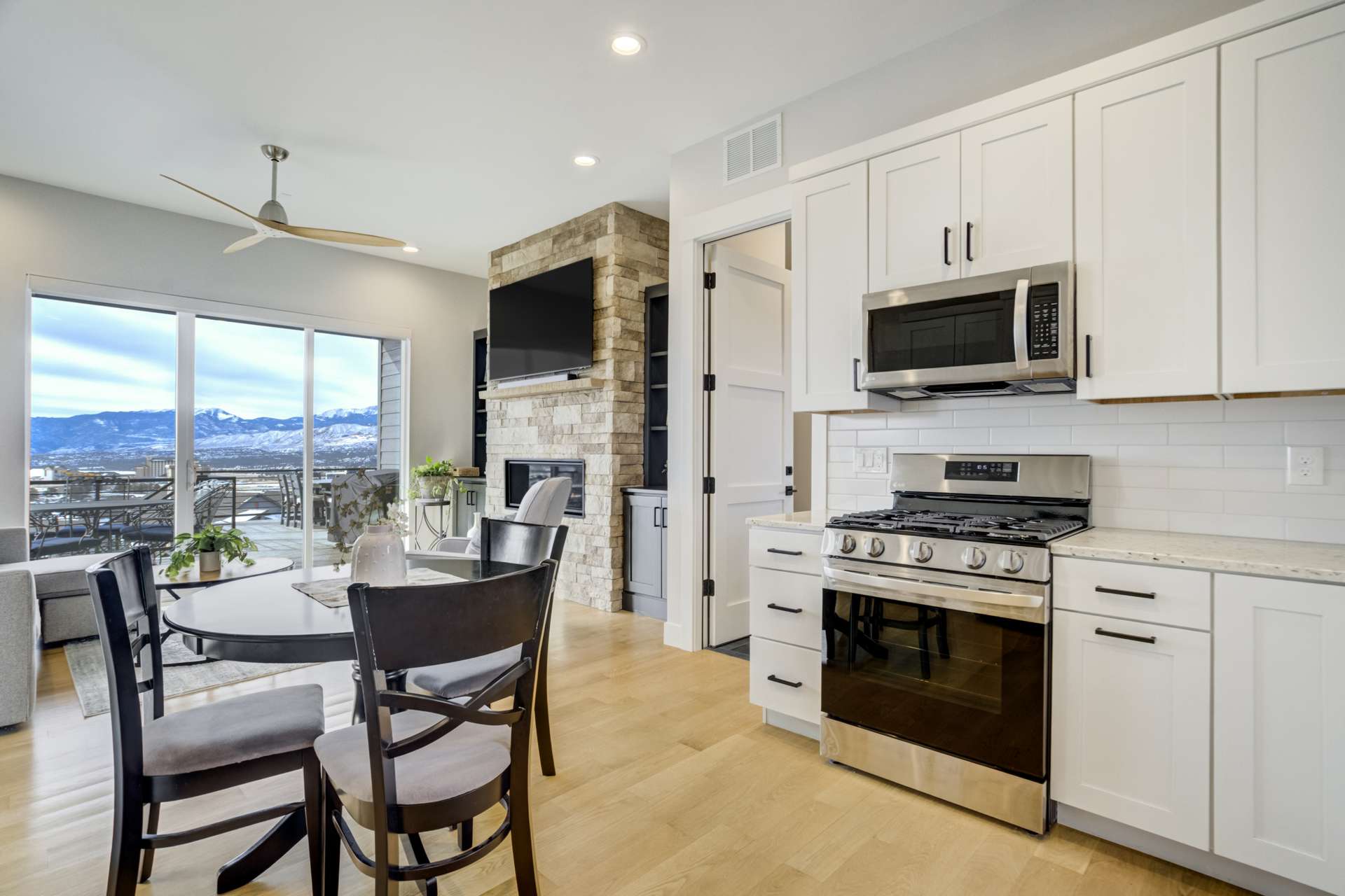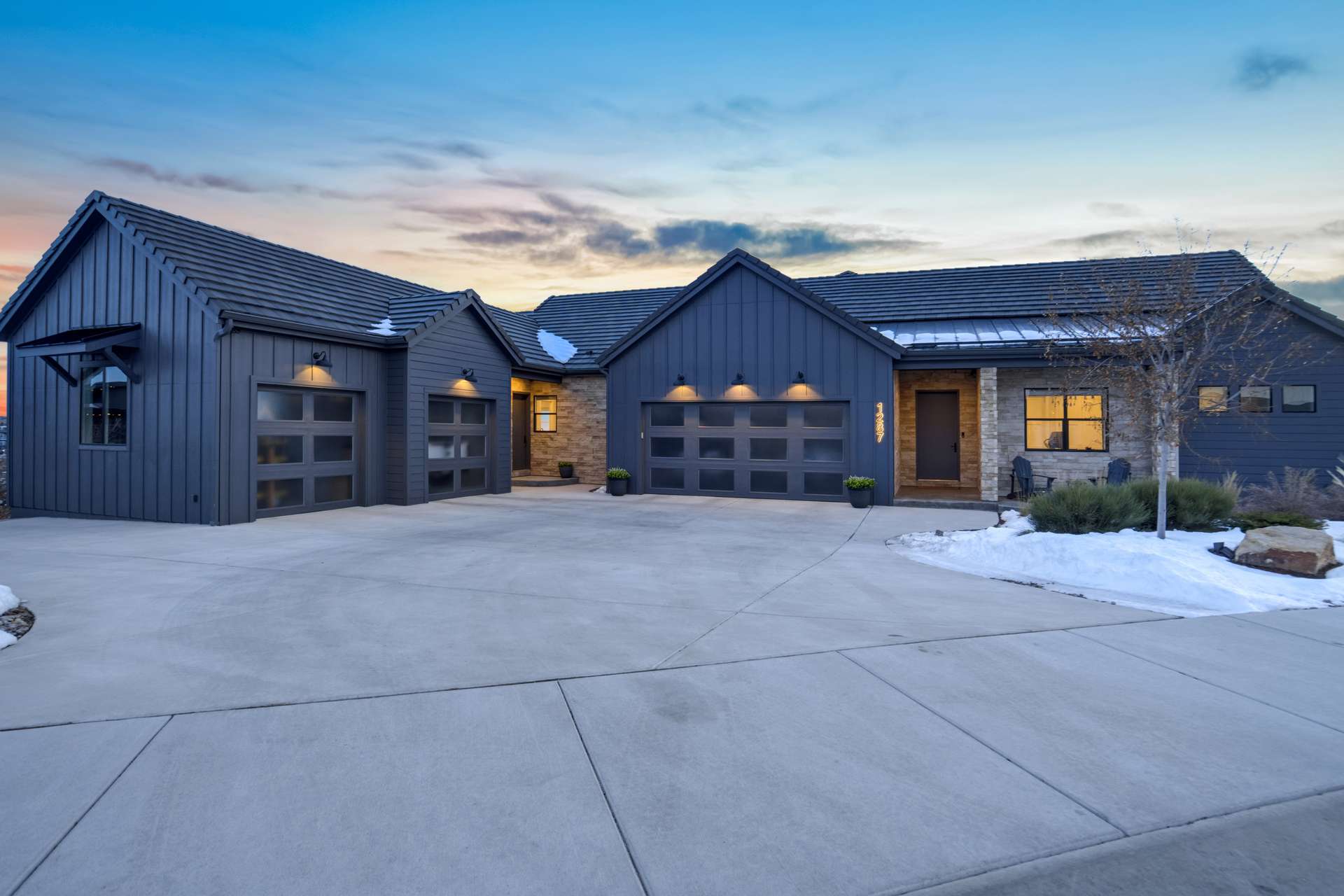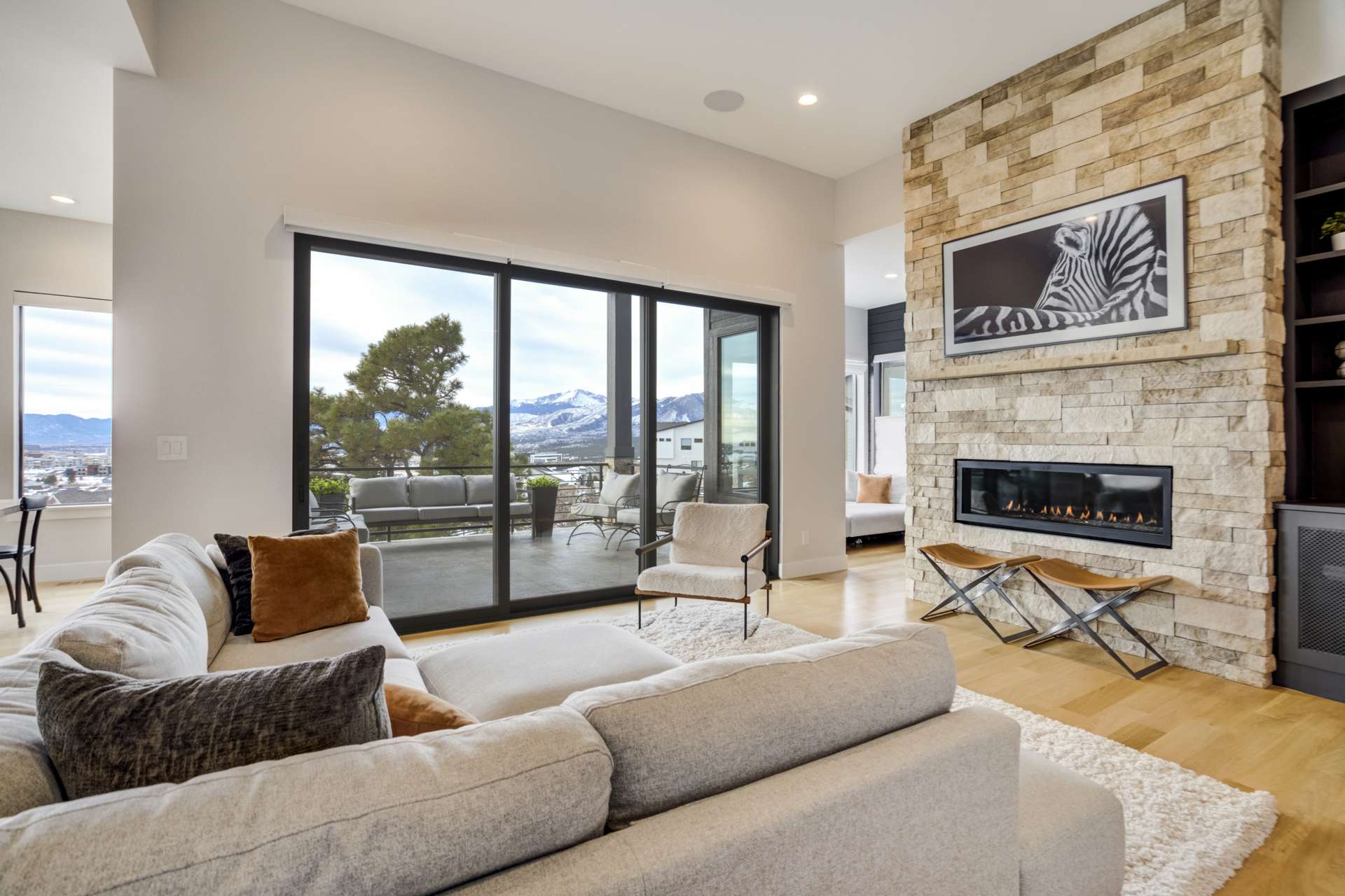 Set within the custom Julep Estates neighborhood of The Farm, this exceptional custom home blends modern Farmhouse architecture with thoughtful design, flexibility, and breathtaking Pikes Peak views. Designed for both everyday comfort and effortless entertaining, the open-concept layout is filled with natural light and seamless indoor/outdoor connections. The great room showcases expansive views of Pikes Peak with a stacking slider that opens to covered patios, creating an ideal setting for indoor/outdoor living. Light hardwood floors, custom finishes, and a dedicated sunroom add warmth and sophistication throughout the main living spaces. The gourmet kitchen anchors the home with an oversized island, granite and marble countertops, double ovens, gas range, and abundant storage—perfect for entertaining friends and family. The main-level primary suite offers a peaceful retreat with mountain views, a spa-inspired bath featuring a soaking tub, oversized custom shower, Carrara marble countertops, and a generous walk-in closet with built-ins. Additional bedrooms provide flexibility for family, guests, or work-from-home needs, while the finished basement expands the living space with a wet bar, workout or recreation room, flex rooms, and a secure vault room. An attached in-law suite provides a private living area with its own entrance, full kitchen, living room with fireplace, bedroom, bathroom, covered deck, and garage —ideal for multigenerational living or extended guests. Outdoor living is equally impressive, with multiple patios, covered decks, a fire pit, a hot tub, a water feature, and professionally landscaped grounds designed for beauty and low maintenance. The oversized 4+ car garages feature extra-tall ceilings, workshop space, EV charging, and extensive storage. With high-performance systems, whole-house audio, fiber-optic connectivity, and designer finishes throughout, this home offers a rare combination of luxury, versatility, and iconic Front Range views.