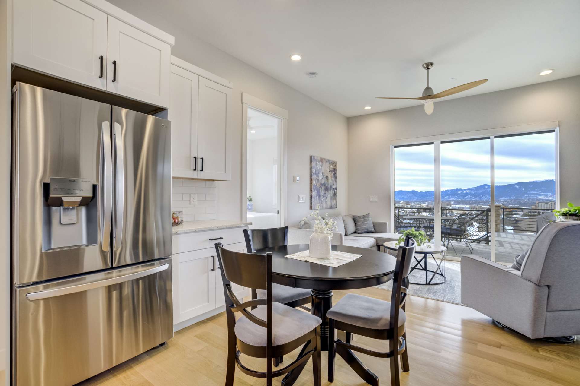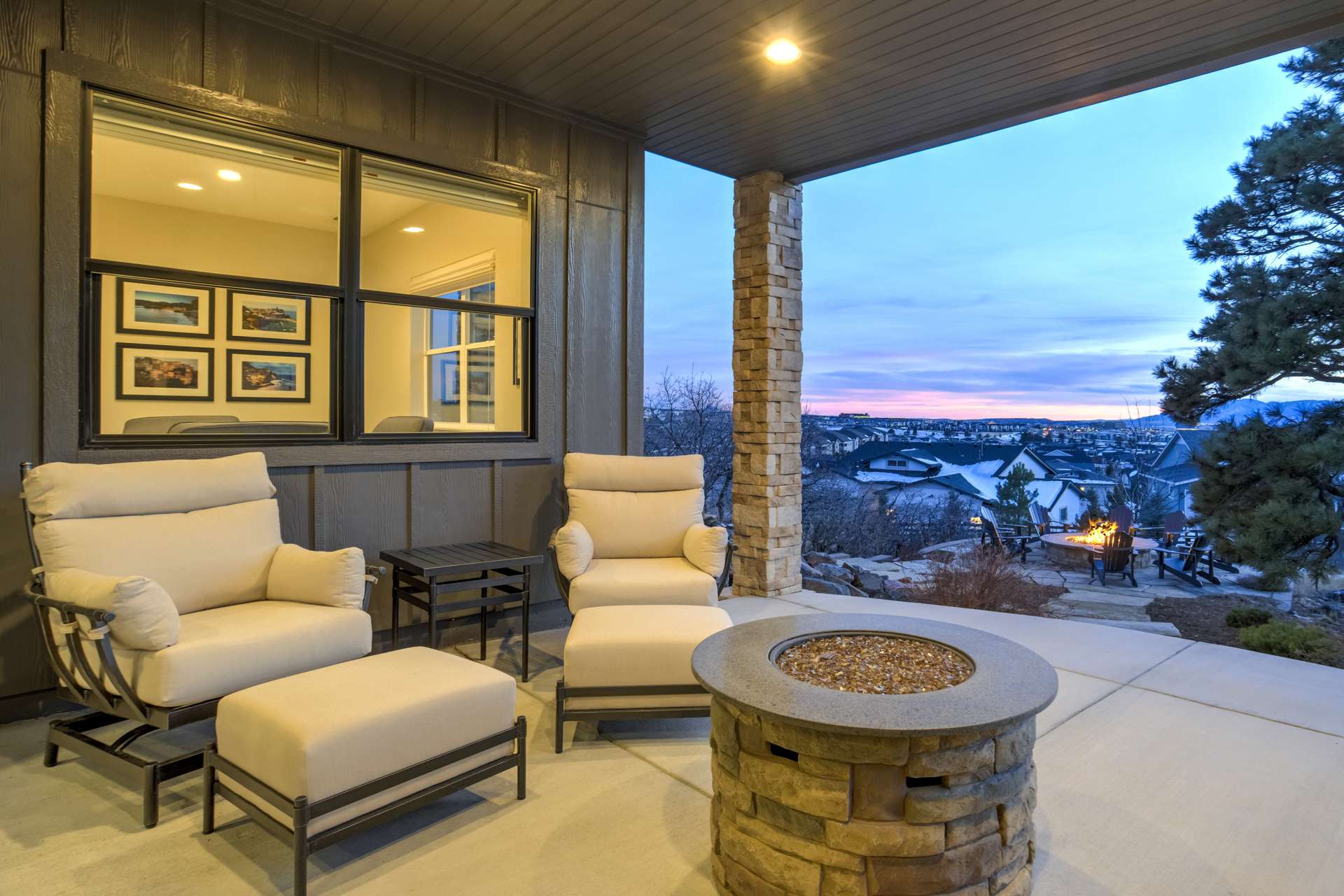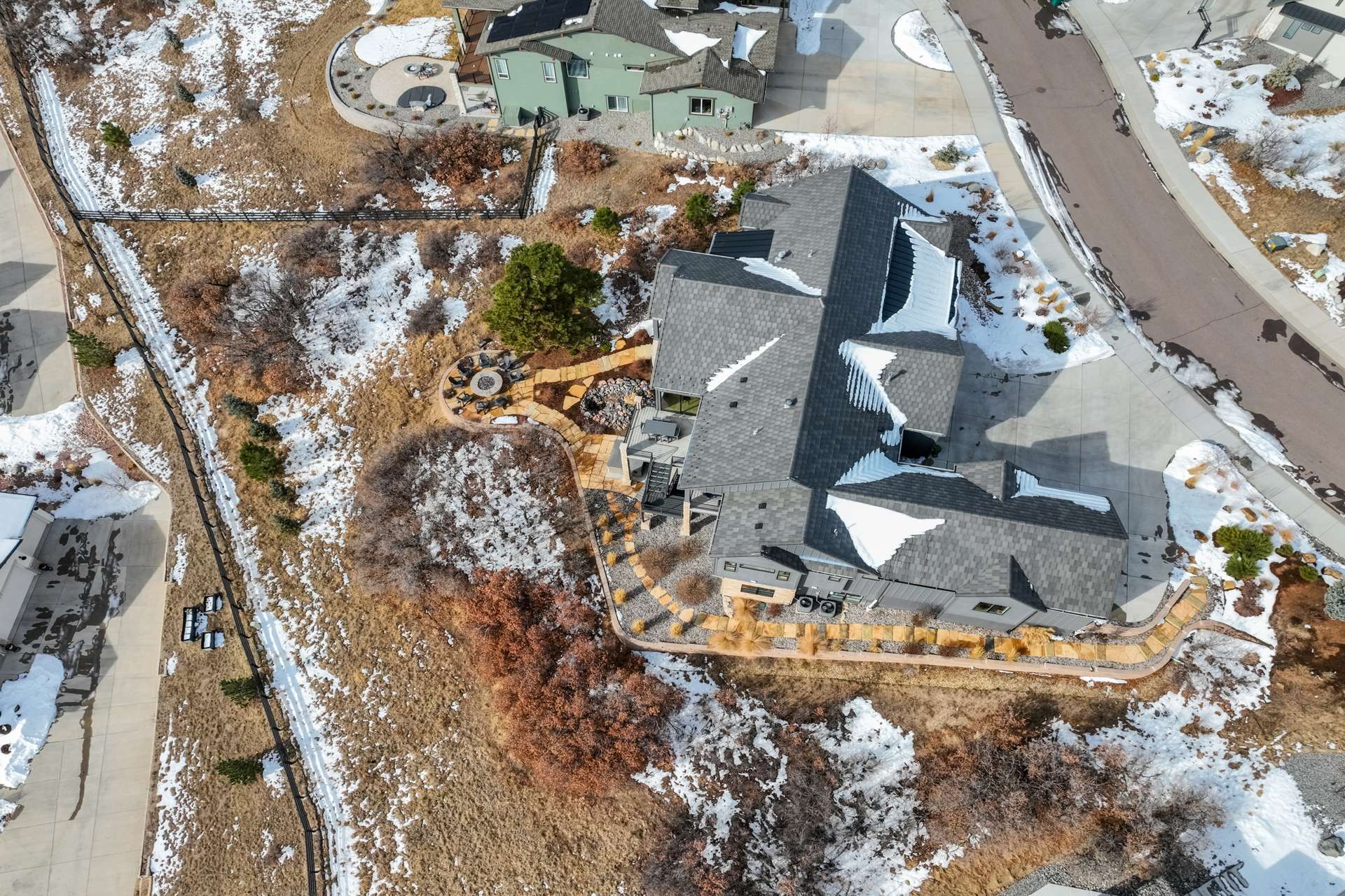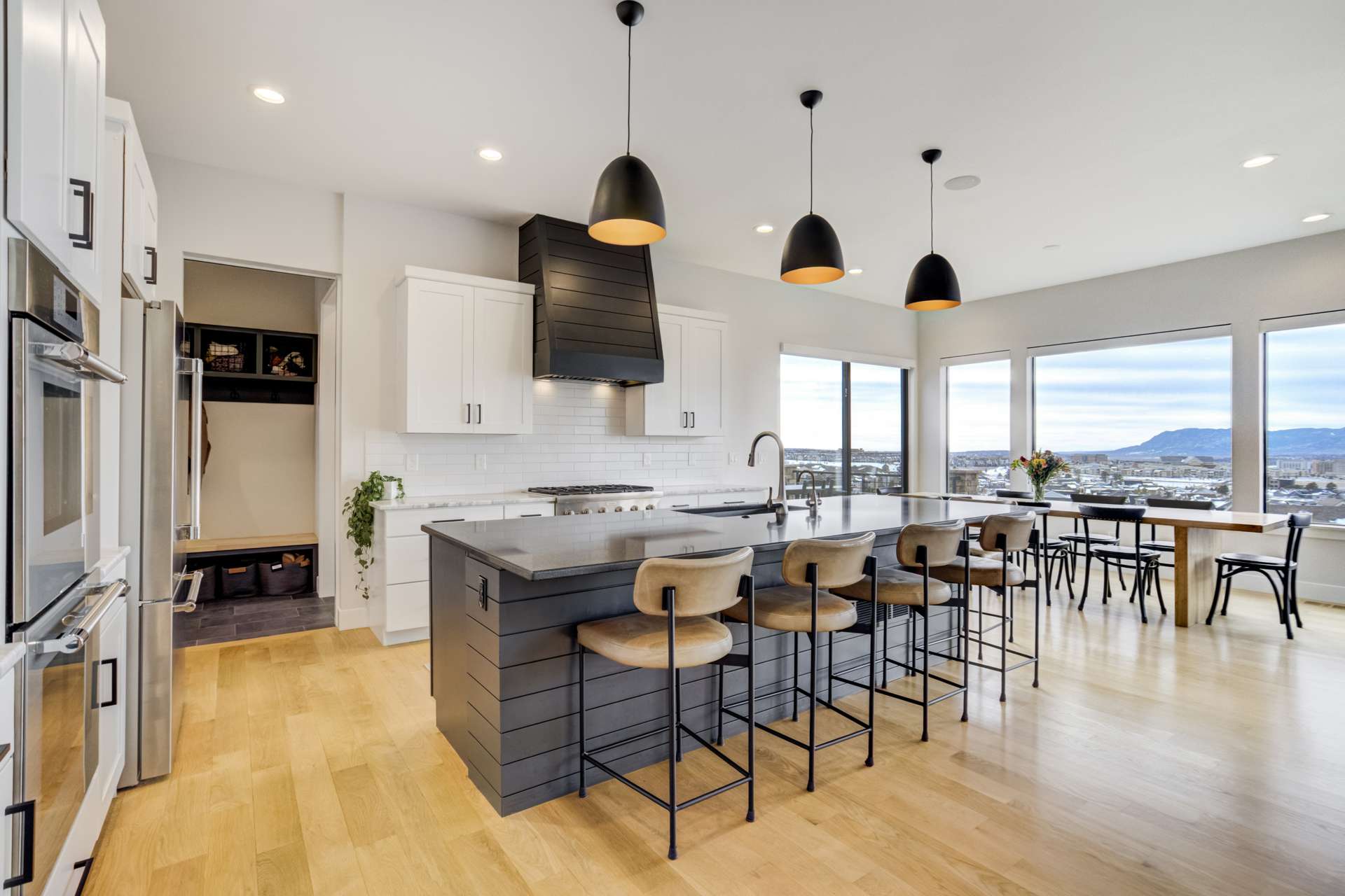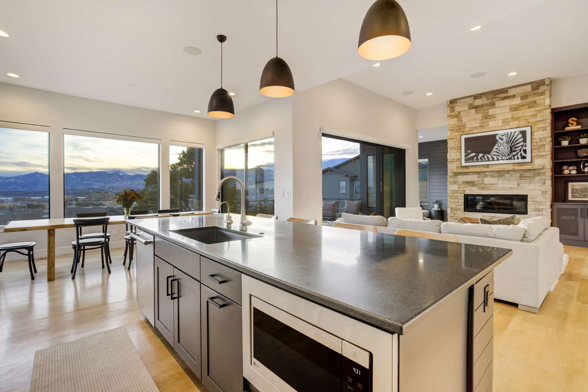 Set within the custom Julep Estates neighborhood of The Farm, this exceptional custom home blends modern Farmhouse architecture with thoughtful design, flexibility, and breathtaking Pikes Peak views. Designed for both everyday comfort and effortless entertaining, the open-concept layout is filled with natural light and seamless indoor/outdoor connections. The great room showcases expansive views of Pikes Peak with a stacking slider that opens to covered patios, creating an ideal setting for indoor/outdoor living. Light hardwood floors, custom finishes, and a dedicated sunroom add warmth and sophistication throughout the main living spaces. The gourmet kitchen anchors the home with an oversized island, granite and marble countertops, double ovens, gas range, and abundant storage—perfect for entertaining friends and family. The main-level primary suite offers a peaceful retreat with mountain views, a spa-inspired bath featuring a soaking tub, oversized custom shower, Carrara marble countertops, and a generous walk-in closet with built-ins. Additional bedrooms provide flexibility for family, guests, or work-from-home needs, while the finished basement expands the living space with a wet bar, workout or recreation room, flex rooms, and a secure vault room. An attached in-law suite provides a private living area with its own entrance, full kitchen, living room with fireplace, bedroom, bathroom, covered deck, and garage —ideal for multigenerational living or extended guests. Outdoor living is equally impressive, with multiple patios, covered decks, a fire pit, a hot tub, a water feature, and professionally landscaped grounds designed for beauty and low maintenance. The oversized 4+ car garages feature extra-tall ceilings, workshop space, EV charging, and extensive storage. With high-performance systems, whole-house audio, fiber-optic connectivity, and designer finishes throughout, this home offers a rare combination of luxury, versatility, and iconic Front Range views.