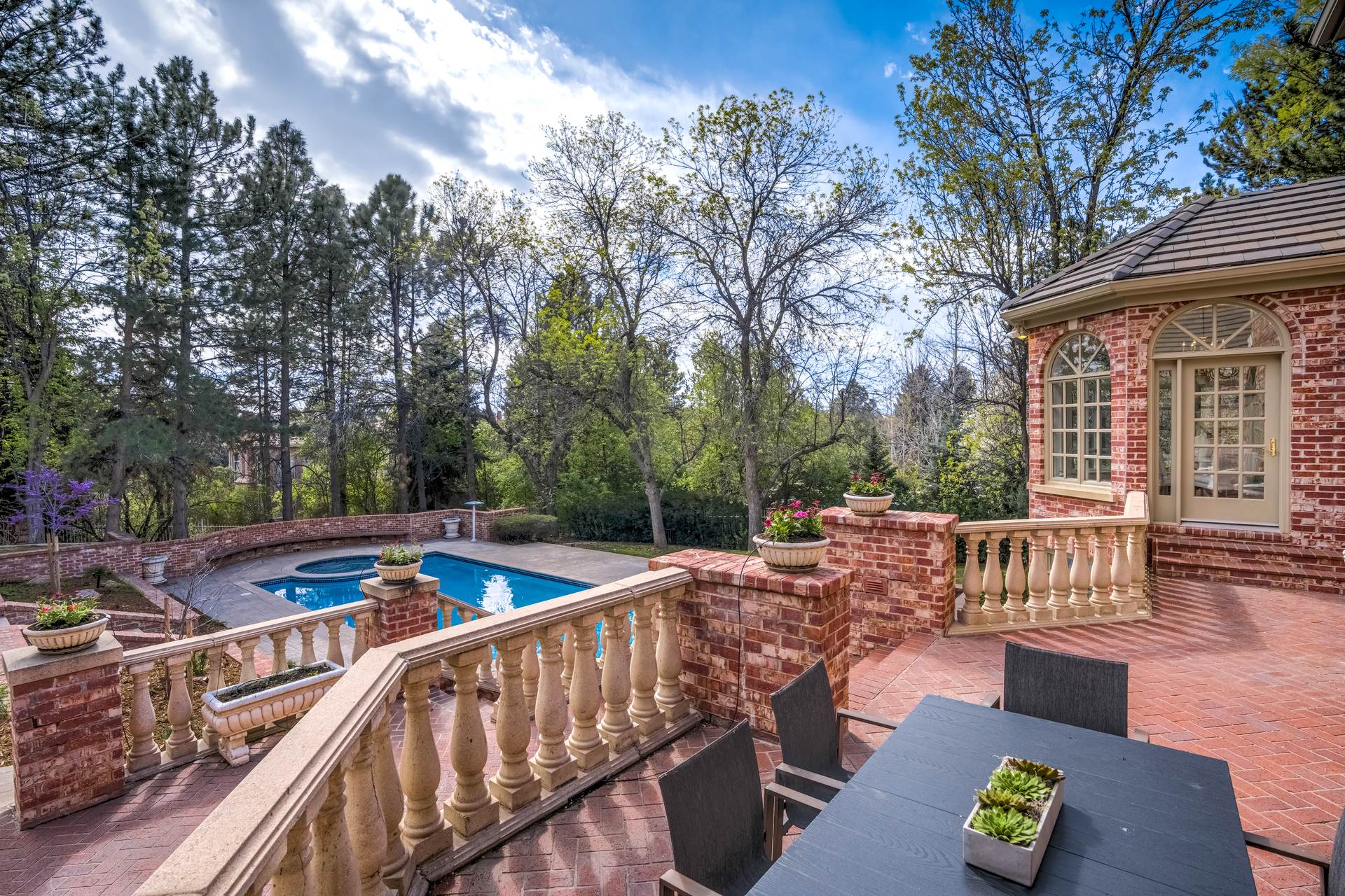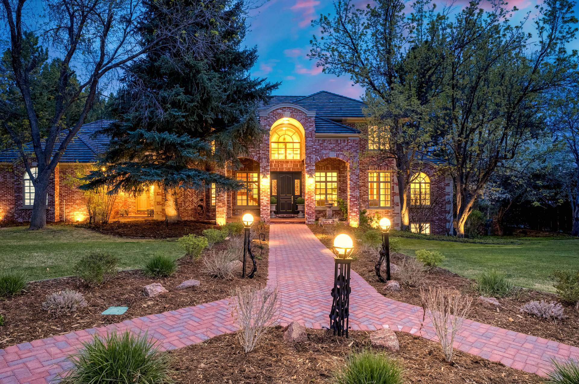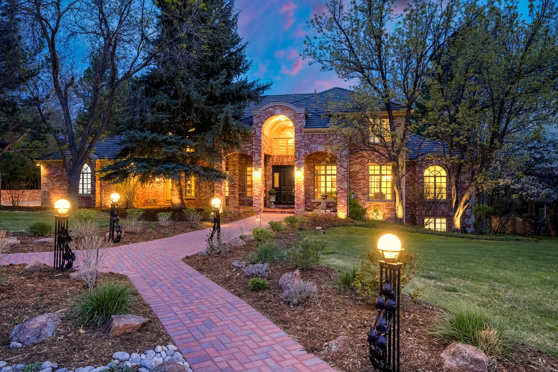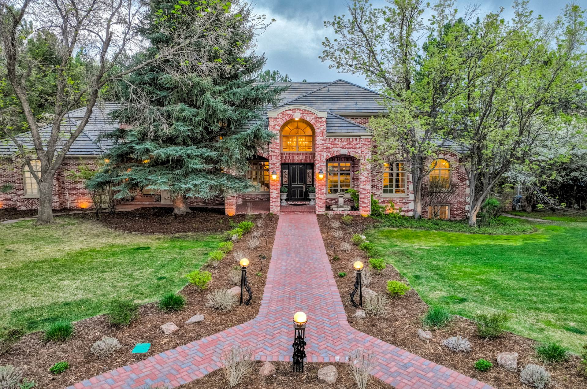 COMING SOON! Located in the prestigious Cherry Hills Farm West neighborhood, this stately red brick two-story estate evokes timeless old-world elegance in an extraordinary natural setting. Situated on nearly an acre and surrounded by mature trees and lush landscaping, the grounds offer a private retreat—featuring a tranquil pond with cascading waterfall, a charming gazebo, and an expansive outdoor living area with a pool, spa, and firepit. Inside, a grand two-story entry introduces interiors rich in craftsmanship and detail. The soaring great room is a showpiece-with dramatic ceilings, marble floors, and a gas fireplace with marble hearth and mantle. Throughout the home, detailed layered moldings, custom millwork and wood columns reflect exceptional artistry. Designed for both entertaining and everyday living, the home includes a formal living and dining room, a sunlit breakfast nook, and a gourmet kitchen with high-end appliances, a large peninsula island and walk-in pantry. An adjacent wet bar with leaded glass cabinetry and crystal chandelier adds sophistication. The main-floor primary suite offers a sitting area, gas fireplace, patio access, and a marble bath with jetted tub, steam shower, and dual walk-in closets. A paneled study with leaded glass doors and fireplace adds warmth and character. Upstairs features hardwood floors throughout, three ensuite bedrooms and an additional office or sixth bedroom. The walk-out lower level includes a home theater area, game room, room for exercise equipment, guest suite, and direct access to the outdoor spaces. A four-car garage and spacious main-floor laundry and mudroom add convenience. Located in the award-winning Cherry Creek School District, this exceptional property offers a rare blend of elegance, comfort, and setting.