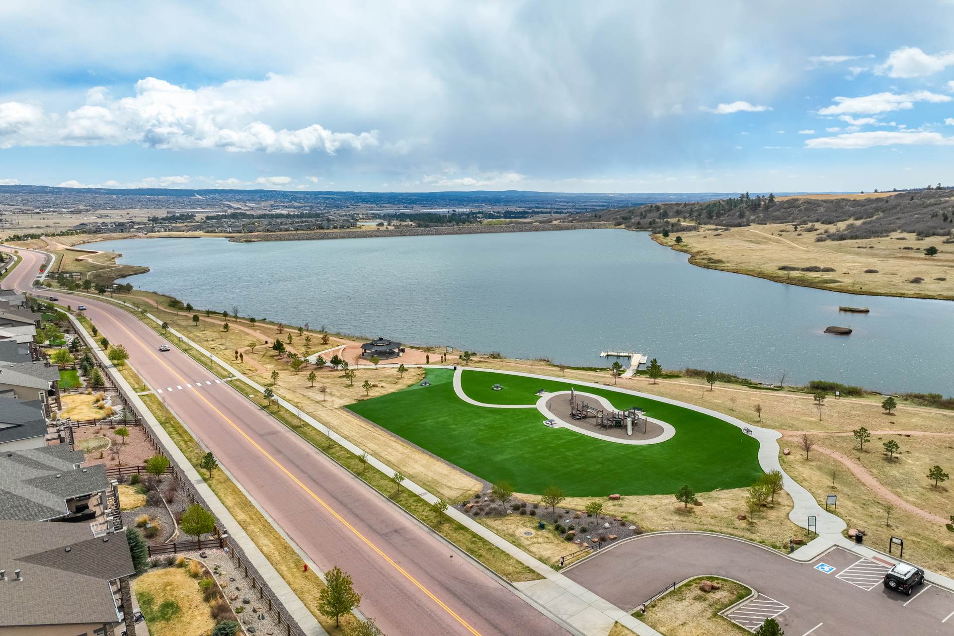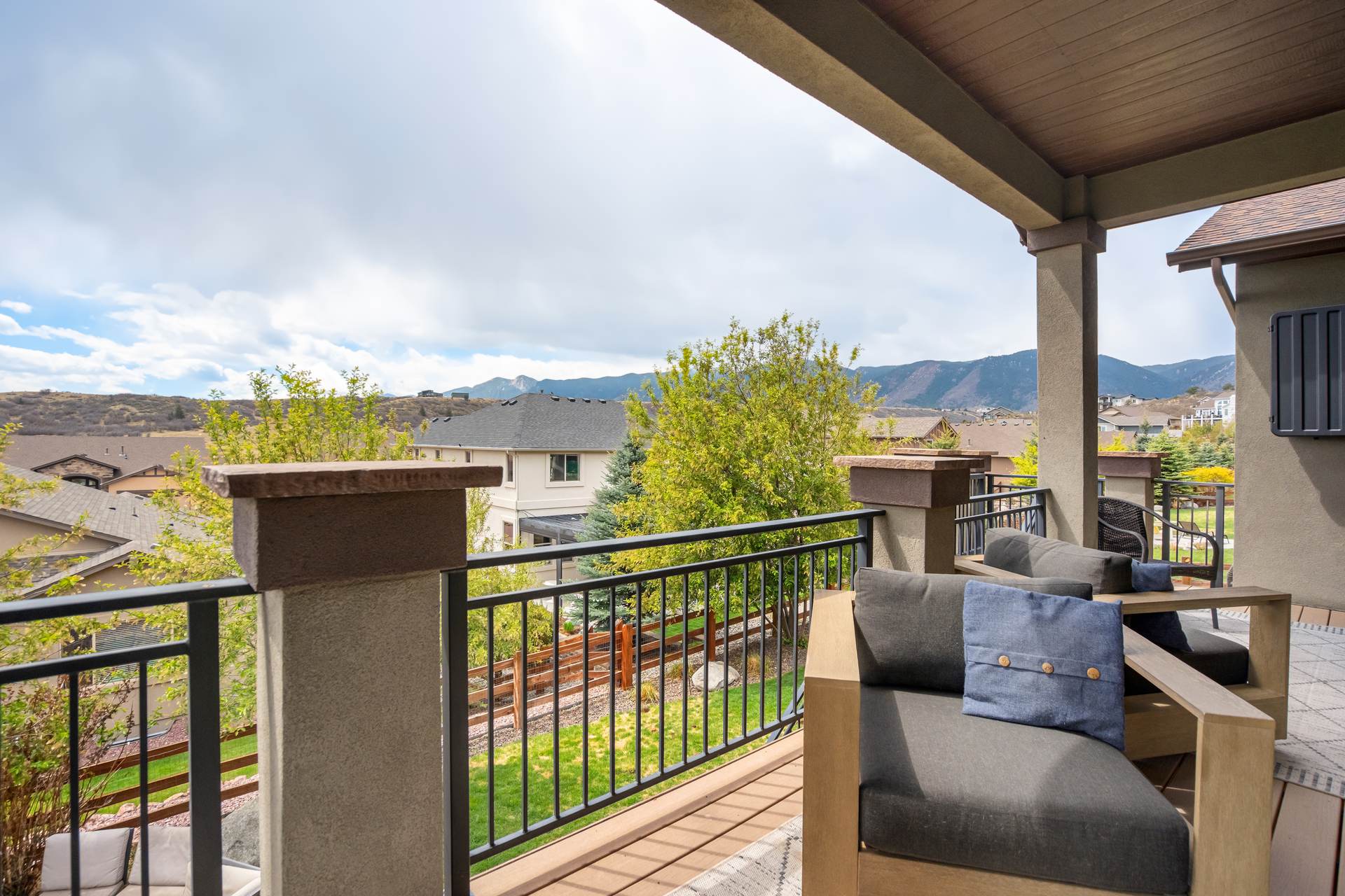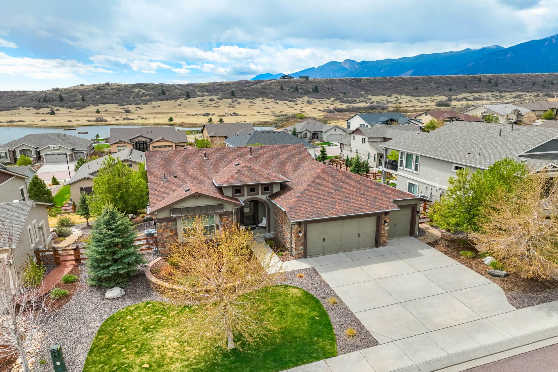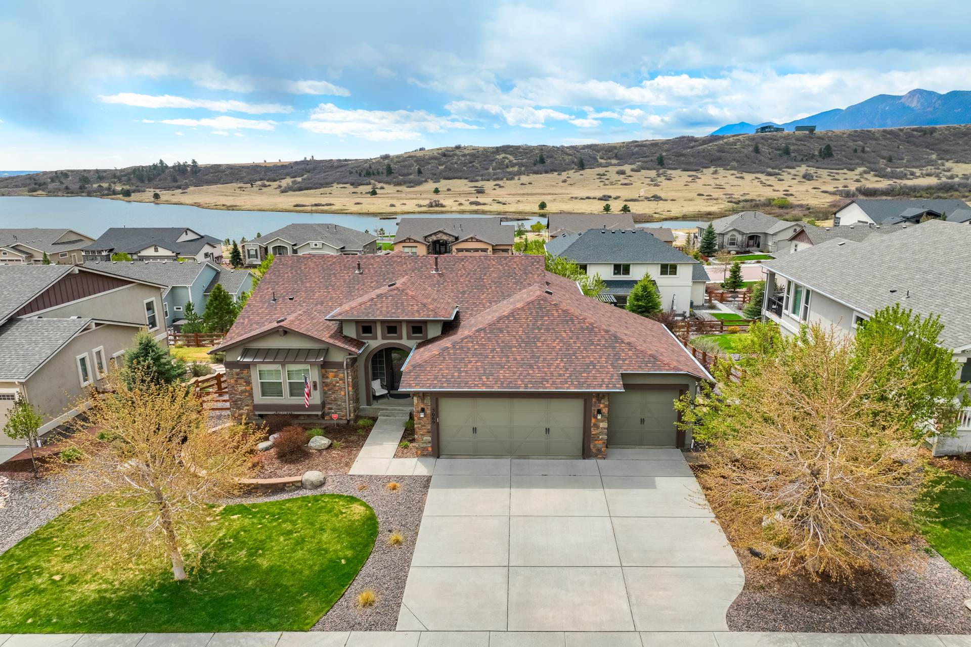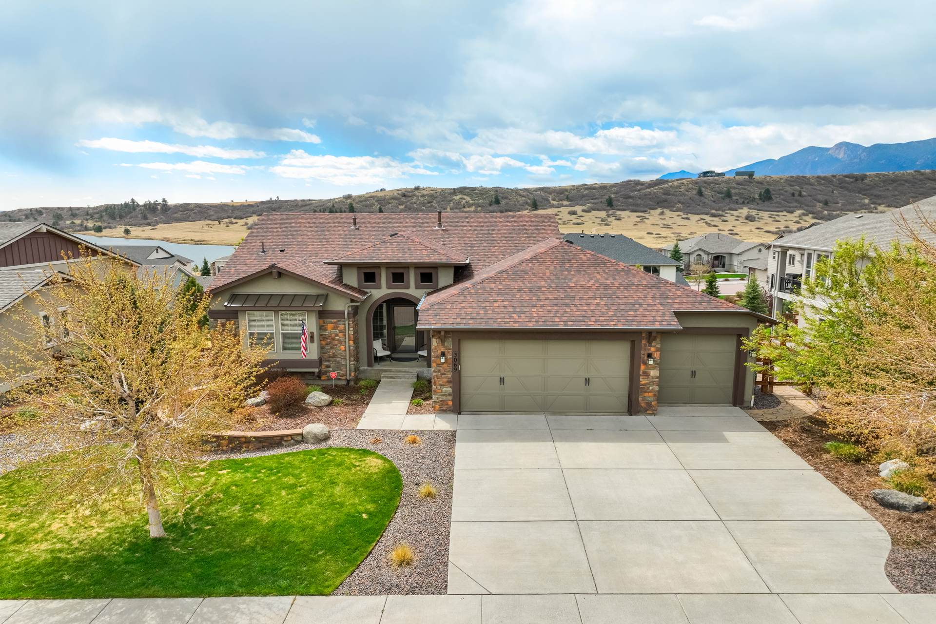 Lakeview. Mountain Views. Forest Lakes Living. This beautifully appointed Classic Home captures the best of Colorado living with sweeping lake and mountain views and thoughtfully designed indoor-outdoor spaces to enjoy them. Step inside to an expansive great room filled with natural light from large, well-placed windows, complemented by rich hickory hardwood floors and soaring 10-foot ceilings. The open layout flows effortlessly to a covered 10x29 composite deck, perfectly positioned to take in the views. The gourmet kitchen features granite countertops, 42-inch cabinetry with crown molding, stainless steel appliances, and a gas convection range with a fifth burner. Generous counter space, abundant cabinetry, and a walk-in pantry make it ideal for both everyday living and entertaining. The main-level primary suite offers convenience and privacy, with tranquil views and a spa-inspired bath complete with dual shower heads, rain feature, and custom tile work. A nearby laundry room with ample storage and utility sink adds everyday ease. A private office near the entry provides flexibility for a fifth bedroom, with an adjacent powder bath. The walk-out lower level offers 9-foot ceilings, a spacious family room with wet bar, and direct access to a hand-laid paver patio, stone firepit, and multiple outdoor gathering areas. Two additional bedrooms and a large unfinished space offer potential for expansion. Additional features include high-efficiency furnace, humidifier, water softener, gas stubs for outdoor heating and grilling, and a finished garage with epoxy floors, built-ins, and a dog wash station. A dedicated generator pad with gas hookup is already in place. Enjoy lake access just minutes away for paddleboarding, kayaking, and fishing, along with close proximity to the Santa Fe Trail, downtown Monument, United States Air Force Academy, and easy I-25 access to both Denver and Colorado Springs.