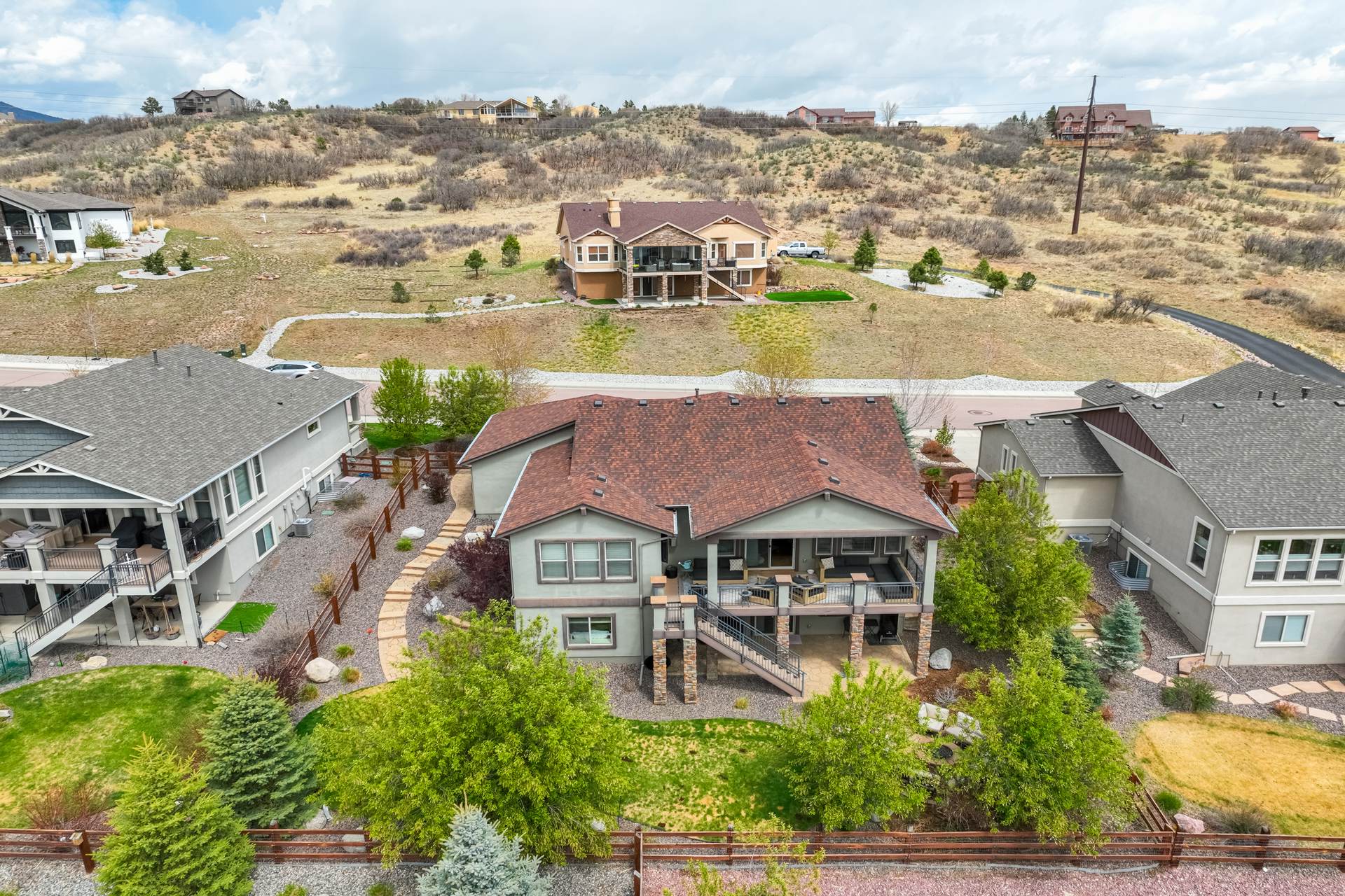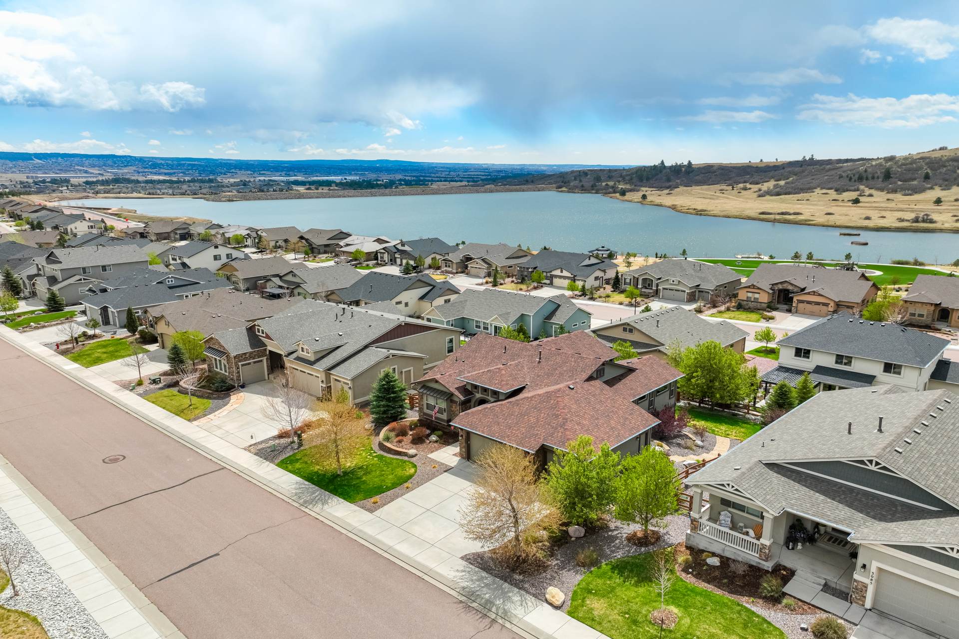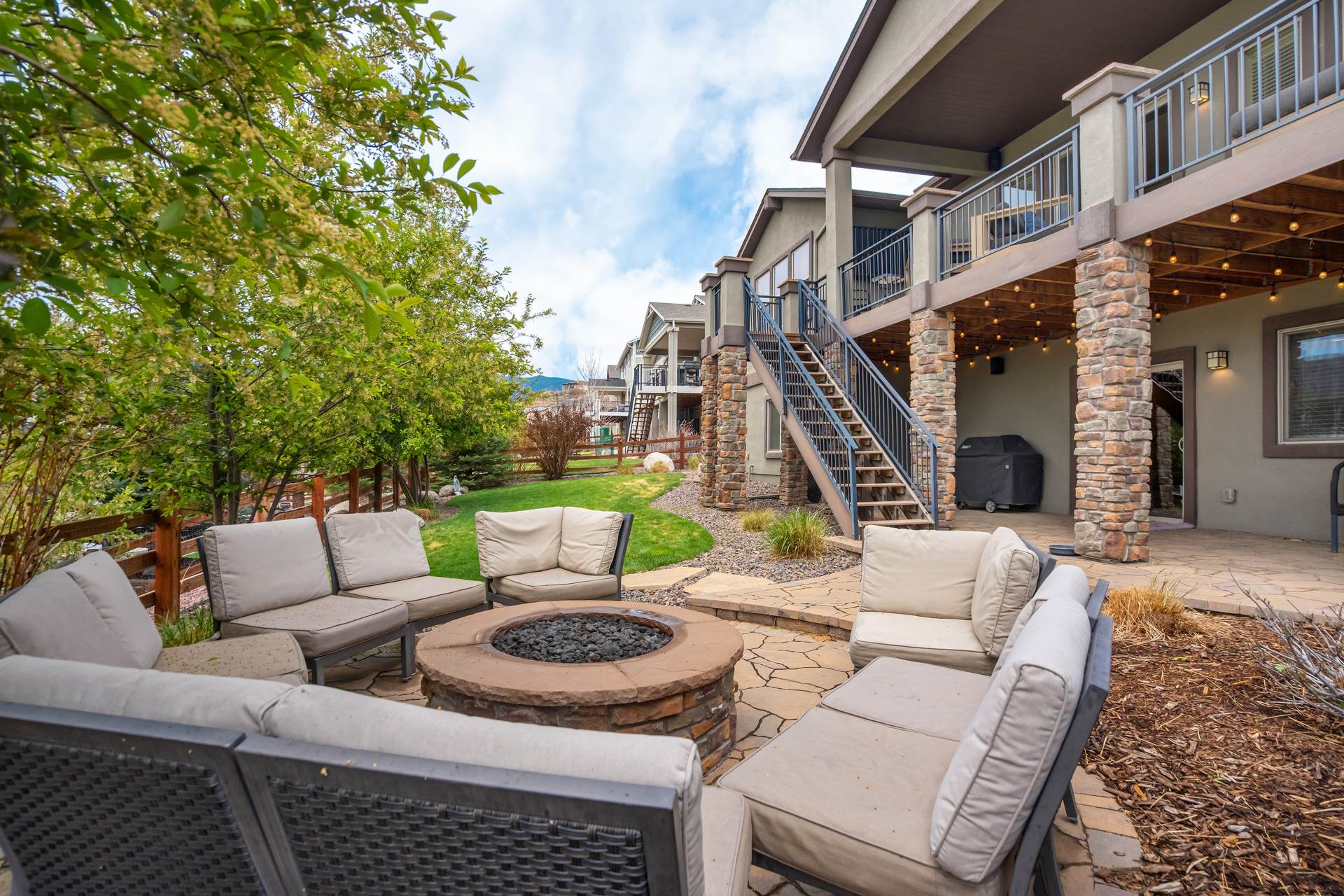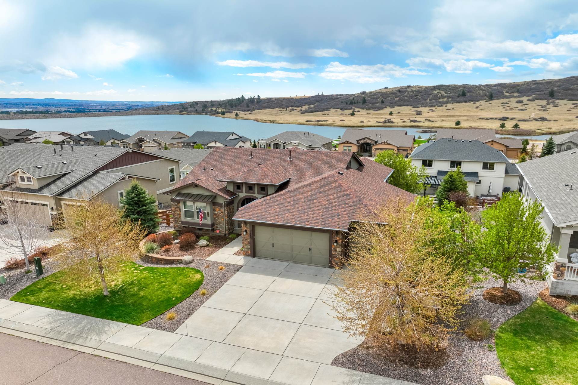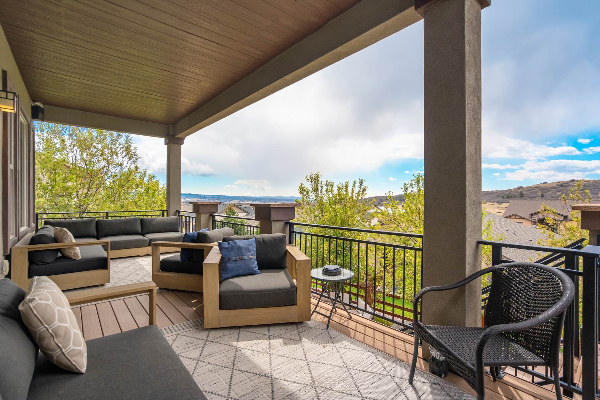 Lakeview. Mountain Views. Forest Lakes Living. This beautifully appointed Classic Home captures the best of Colorado living with sweeping lake and mountain views and thoughtfully designed indoor-outdoor spaces to enjoy them. Step inside to an expansive great room filled with natural light from large, well-placed windows, complemented by rich hickory hardwood floors and soaring 10-foot ceilings. The open layout flows effortlessly to a covered 10x29 composite deck, perfectly positioned to take in the views. The gourmet kitchen features granite countertops, 42-inch cabinetry with crown molding, stainless steel appliances, and a gas convection range with a fifth burner. Generous counter space, abundant cabinetry, and a walk-in pantry make it ideal for both everyday living and entertaining. The main-level primary suite offers convenience and privacy, with tranquil views and a spa-inspired bath complete with dual shower heads, rain feature, and custom tile work. A nearby laundry room with ample storage and utility sink adds everyday ease. A private office near the entry provides flexibility for a fifth bedroom, with an adjacent powder bath. The walk-out lower level offers 9-foot ceilings, a spacious family room with wet bar, and direct access to a hand-laid paver patio, stone firepit, and multiple outdoor gathering areas. Two additional bedrooms and a large unfinished space offer potential for expansion. Additional features include high-efficiency furnace, humidifier, water softener, gas stubs for outdoor heating and grilling, and a finished garage with epoxy floors, built-ins, and a dog wash station. A dedicated generator pad with gas hookup is already in place. Enjoy lake access just minutes away for paddleboarding, kayaking, and fishing, along with close proximity to the Santa Fe Trail, downtown Monument, United States Air Force Academy, and easy I-25 access to both Denver and Colorado Springs.