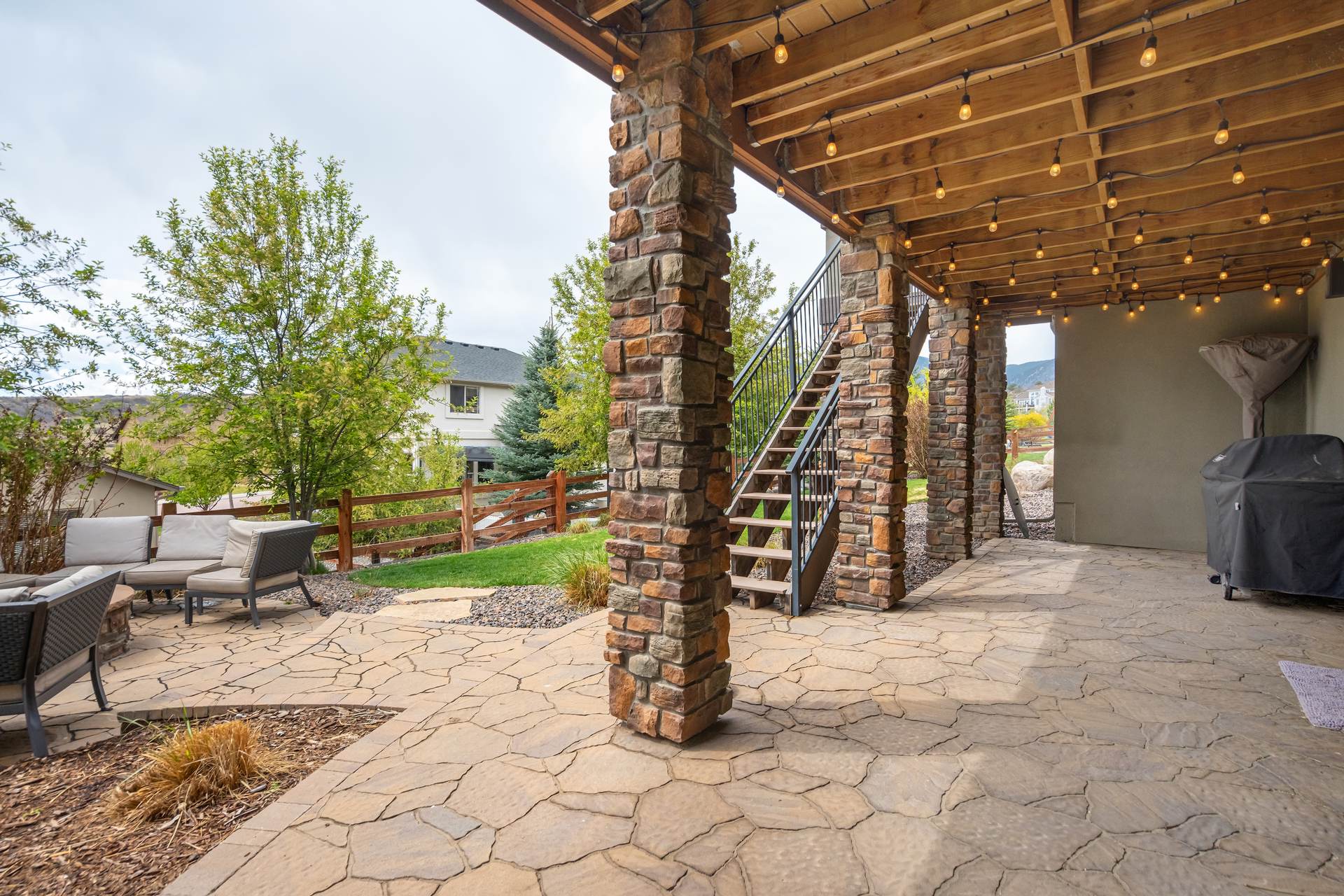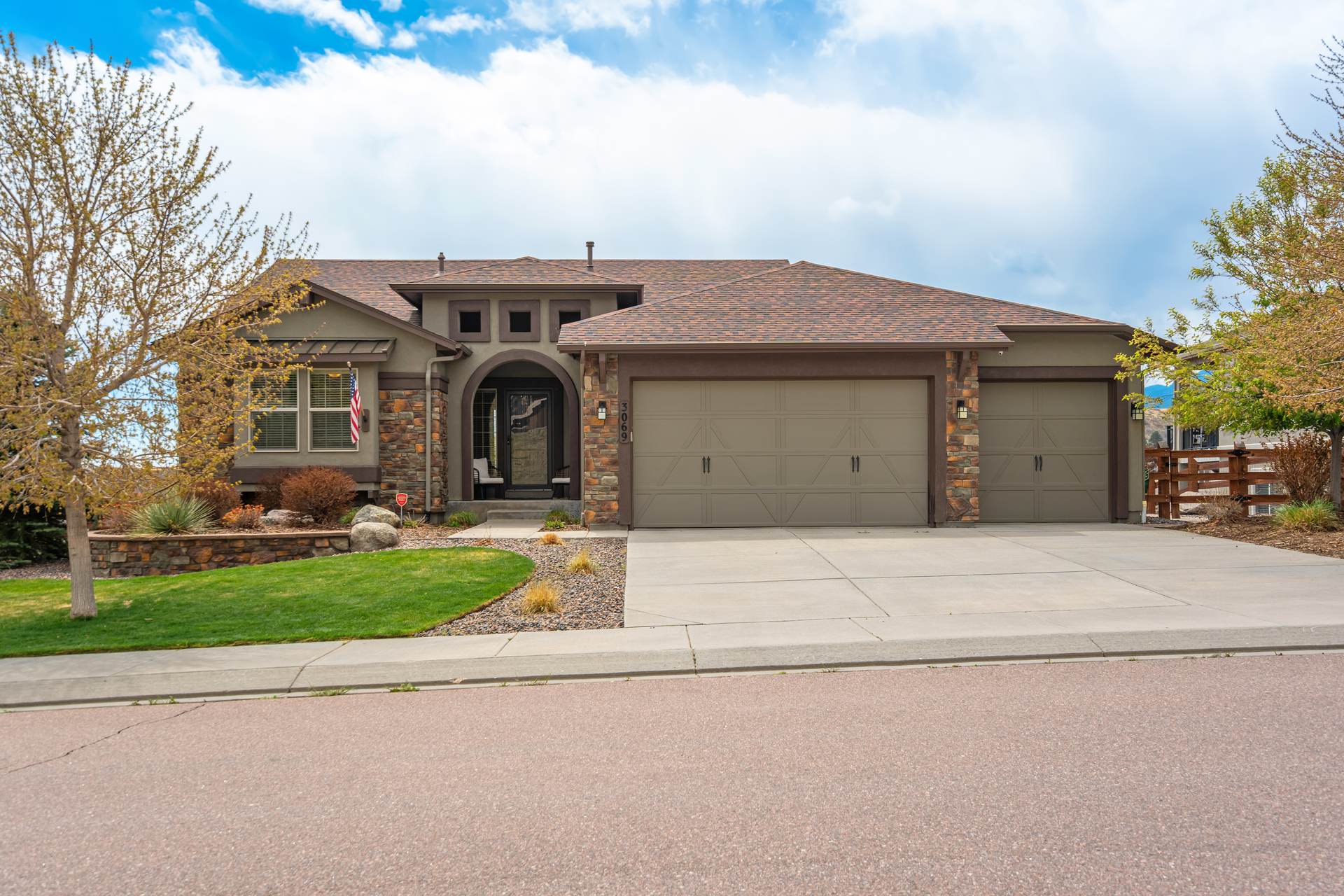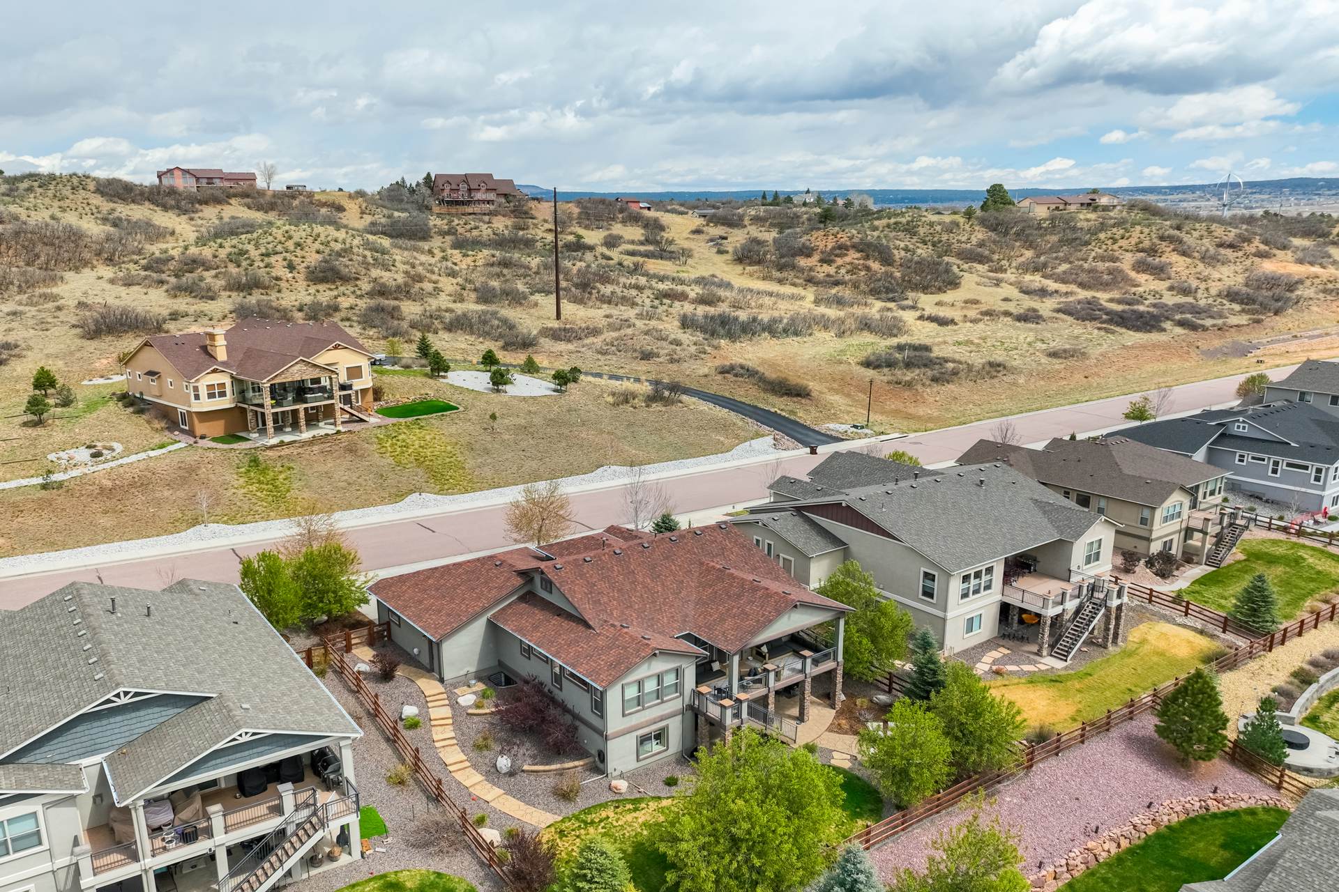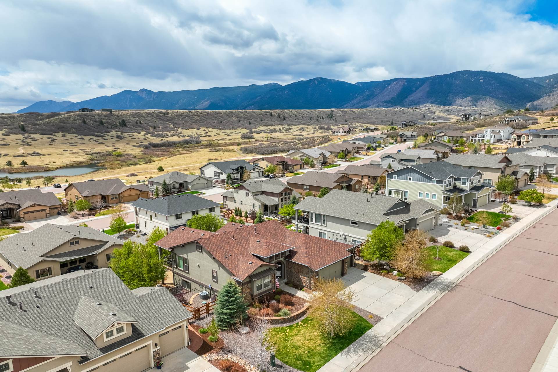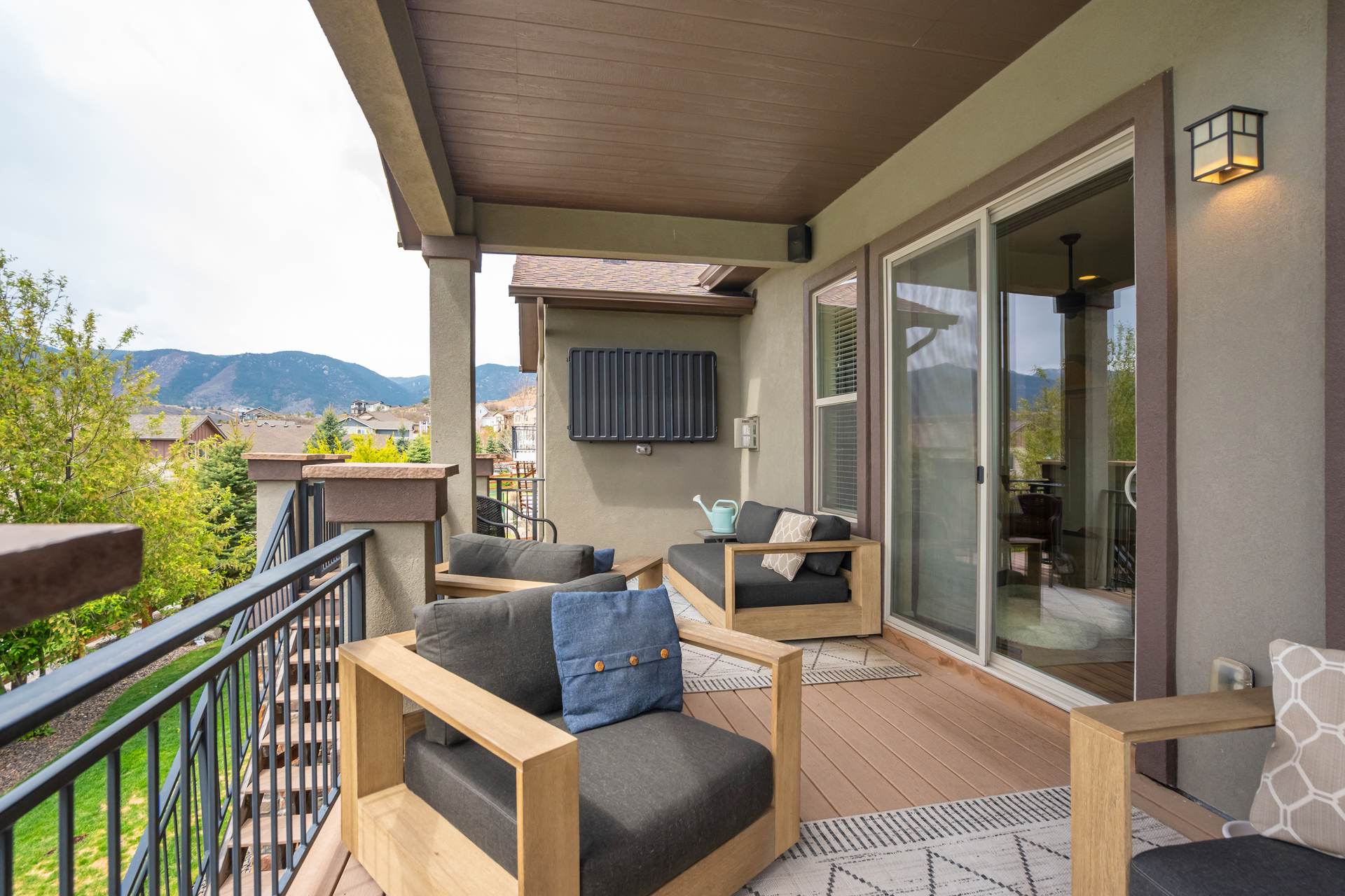 Lakeview. Mountain Views. Forest Lakes Living. This beautifully appointed Classic Home captures the best of Colorado living with sweeping lake and mountain views and thoughtfully designed indoor-outdoor spaces to enjoy them. Step inside to an expansive great room filled with natural light from large, well-placed windows, complemented by rich hickory hardwood floors and soaring 10-foot ceilings. The open layout flows effortlessly to a covered 10x29 composite deck, perfectly positioned to take in the views. The gourmet kitchen features granite countertops, 42-inch cabinetry with crown molding, stainless steel appliances, and a gas convection range with a fifth burner. Generous counter space, abundant cabinetry, and a walk-in pantry make it ideal for both everyday living and entertaining. The main-level primary suite offers convenience and privacy, with tranquil views and a spa-inspired bath complete with dual shower heads, rain feature, and custom tile work. A nearby laundry room with ample storage and utility sink adds everyday ease. A private office near the entry provides flexibility for a fifth bedroom, with an adjacent powder bath. The walk-out lower level offers 9-foot ceilings, a spacious family room with wet bar, and direct access to a hand-laid paver patio, stone firepit, and multiple outdoor gathering areas. Two additional bedrooms and a large unfinished space offer potential for expansion. Additional features include high-efficiency furnace, humidifier, water softener, gas stubs for outdoor heating and grilling, and a finished garage with epoxy floors, built-ins, and a dog wash station. A dedicated generator pad with gas hookup is already in place. Enjoy lake access just minutes away for paddleboarding, kayaking, and fishing, along with close proximity to the Santa Fe Trail, downtown Monument, United States Air Force Academy, and easy I-25 access to both Denver and Colorado Springs.