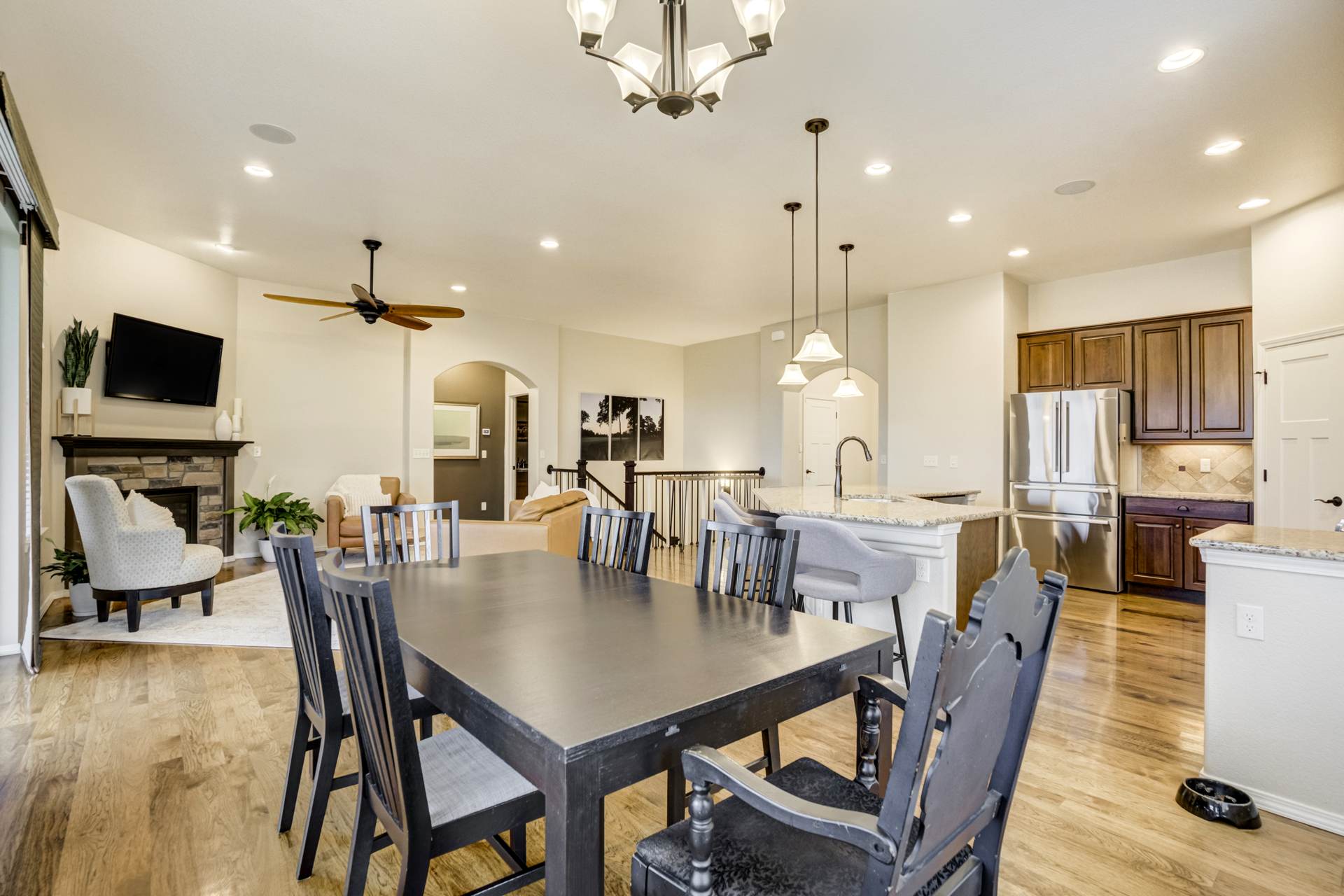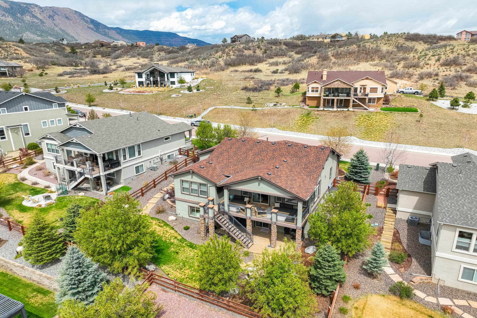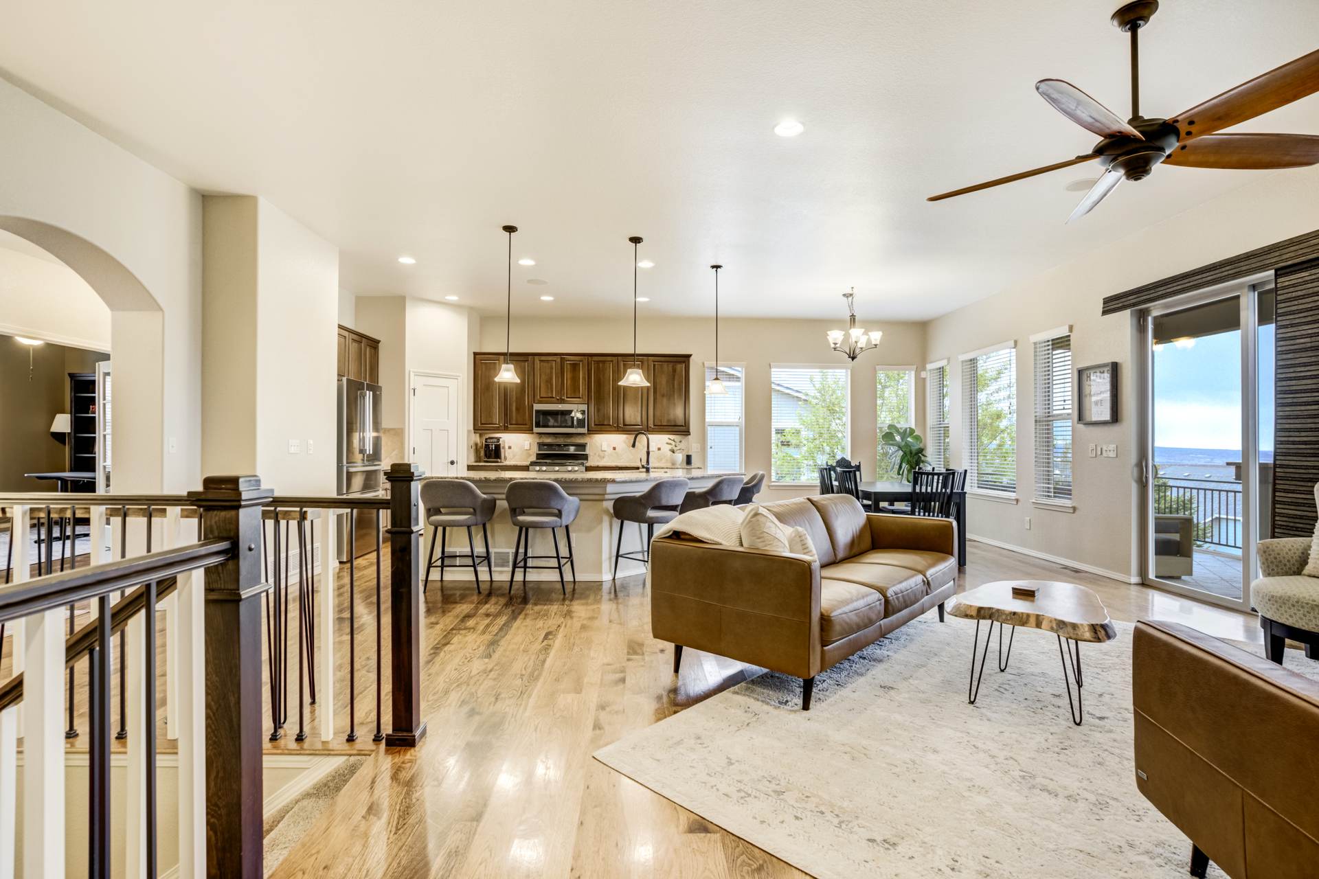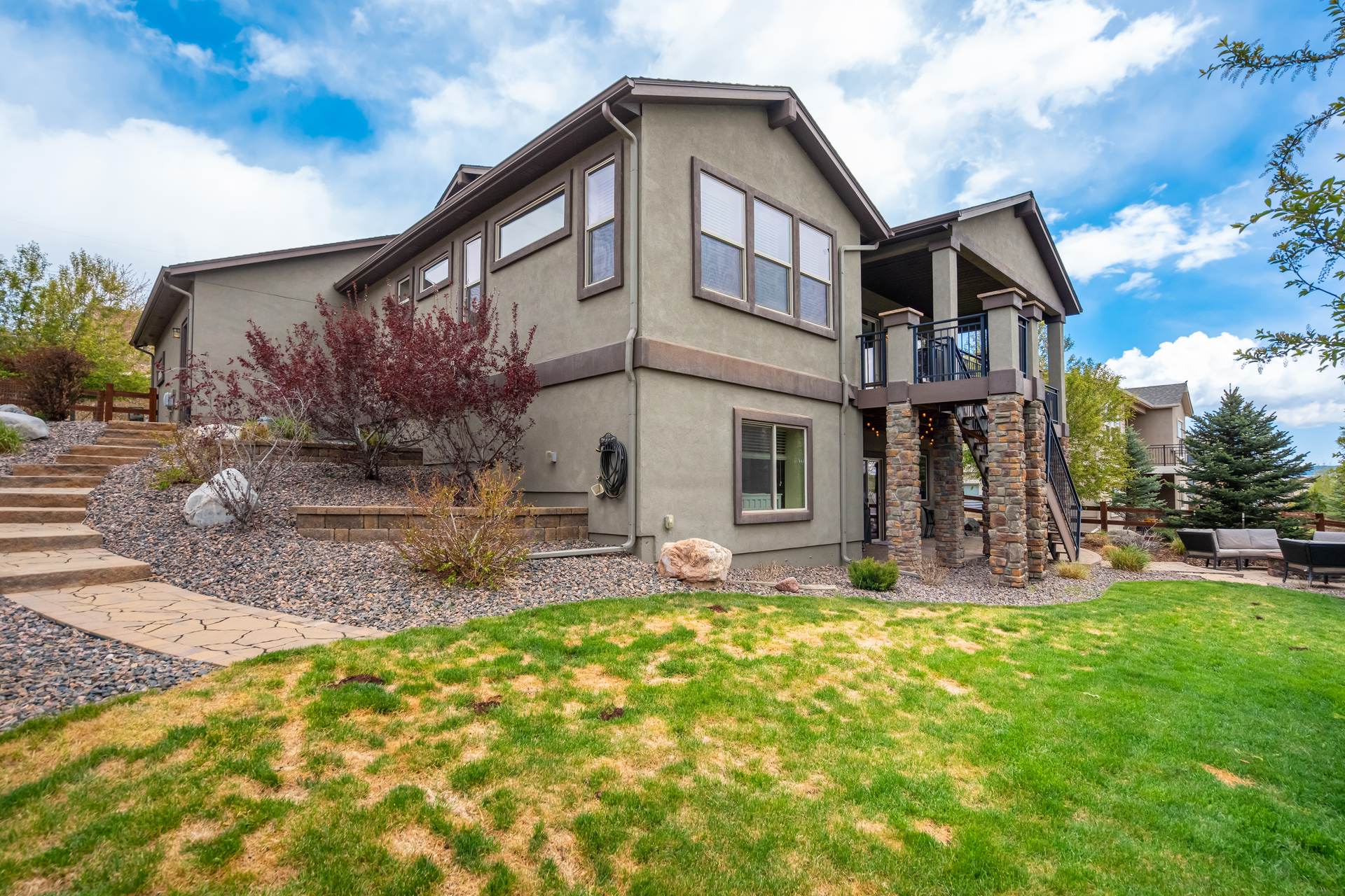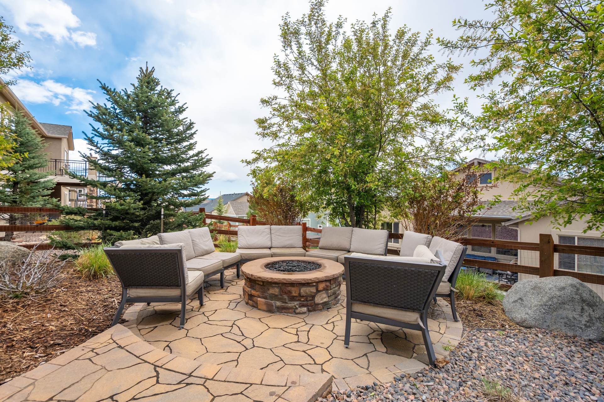Lakeview. Mountain Views. Forest Lakes Living. This beautifully appointed Classic Home captures the best of Colorado living with sweeping lake and mountain views and thoughtfully designed indoor-outdoor spaces to enjoy them. Step inside to an expansive great room filled with natural light from large, well-placed windows, complemented by rich hickory hardwood floors and soaring 10-foot ceilings. The open layout flows effortlessly to a covered 10x29 composite deck, perfectly positioned to take in the views. The gourmet kitchen features granite countertops, 42-inch cabinetry with crown molding, stainless steel appliances, and a gas convection range with a fifth burner. Generous counter space, abundant cabinetry, and a walk-in pantry make it ideal for both everyday living and entertaining. The main-level primary suite offers convenience and privacy, with tranquil views and a spa-inspired bath complete with dual shower heads, rain feature, and custom tile work. A nearby laundry room with ample storage and utility sink adds everyday ease. A private office near the entry provides flexibility for a fifth bedroom, with an adjacent powder bath. The walk-out lower level offers 9-foot ceilings, a spacious family room with wet bar, and direct access to a hand-laid paver patio, stone firepit, and multiple outdoor gathering areas. Two additional bedrooms and a large unfinished space offer potential for expansion. Additional features include high-efficiency furnace, humidifier, water softener, gas stubs for outdoor heating and grilling, and a finished garage with epoxy floors, built-ins, and a dog wash station. A dedicated generator pad with gas hookup is already in place. Enjoy lake access just minutes away for paddleboarding, kayaking, and fishing, along with close proximity to the Santa Fe Trail, downtown Monument, United States Air Force Academy, and easy I-25 access to both Denver and Colorado Springs.