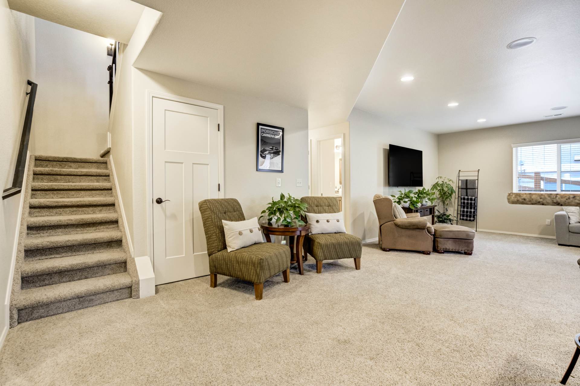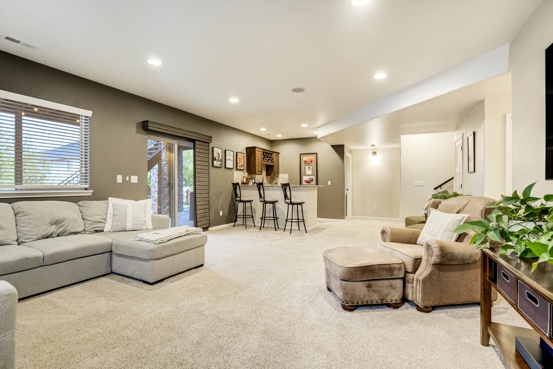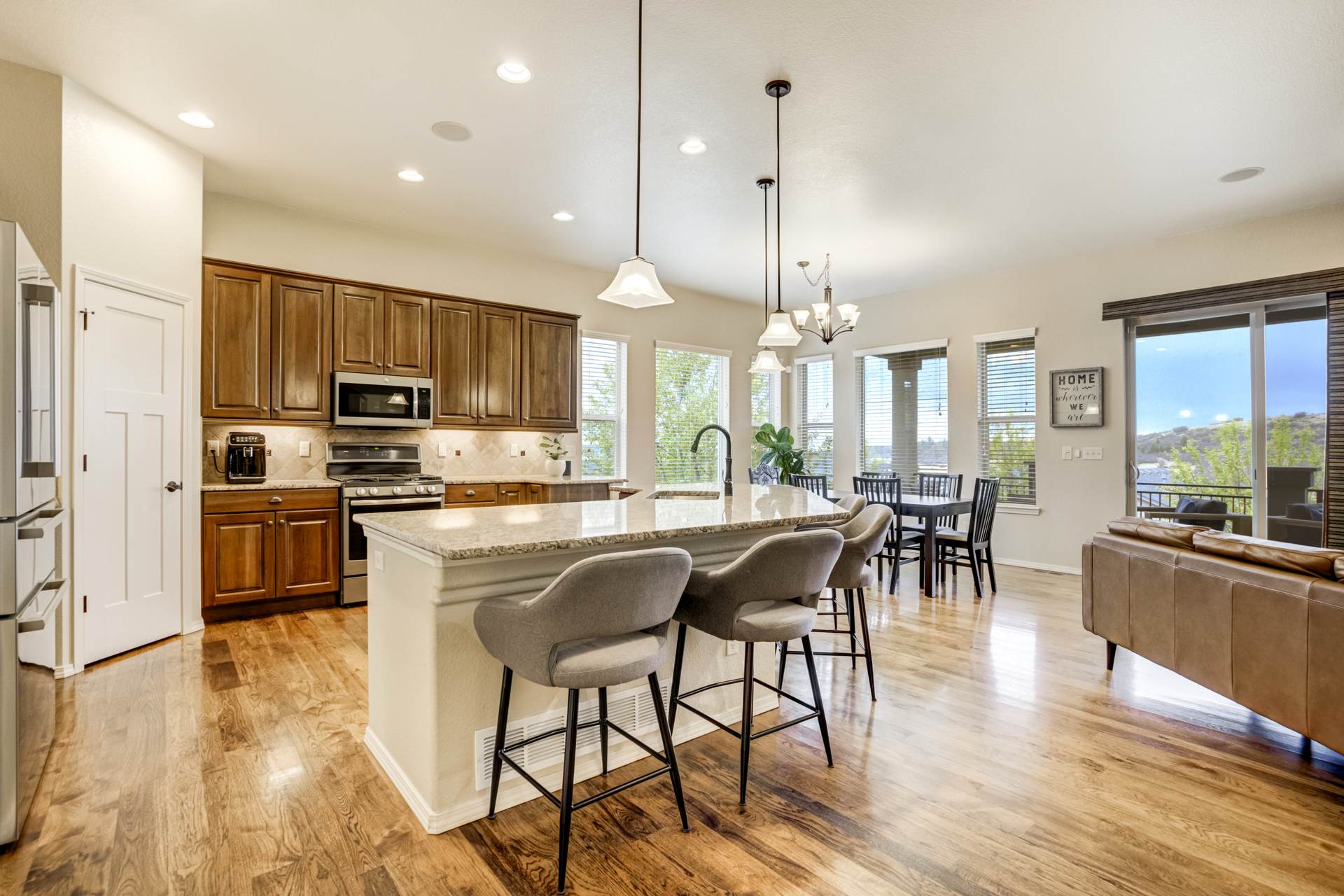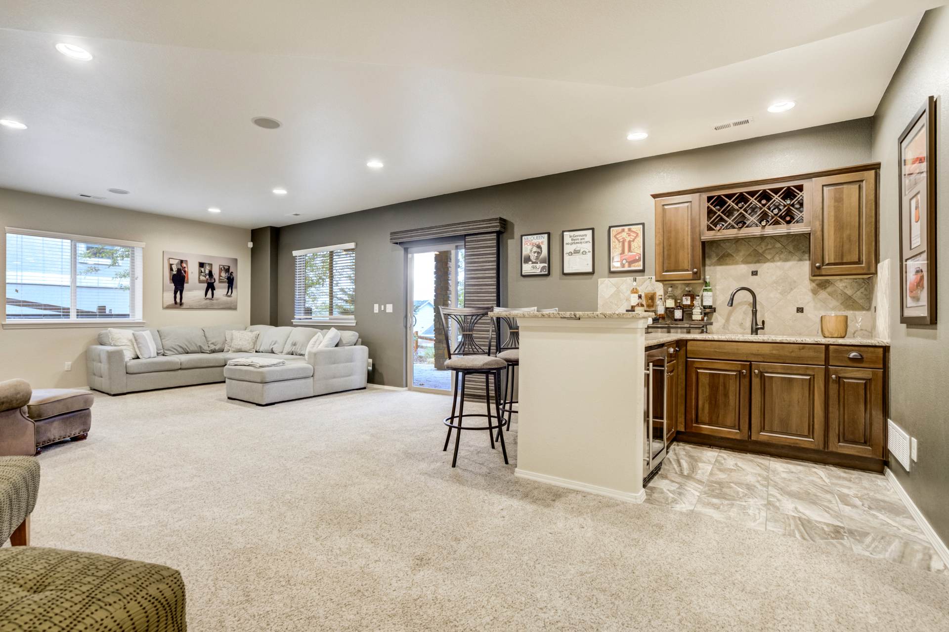 Lakeview. Mountain Views. Forest Lakes Living. This beautifully appointed Classic Home captures the best of Colorado living with sweeping lake and mountain views and thoughtfully designed indoor-outdoor spaces to enjoy them. Step inside to an expansive great room filled with natural light from large, well-placed windows, complemented by rich hickory hardwood floors and soaring 10-foot ceilings. The open layout flows effortlessly to a covered 10x29 composite deck, perfectly positioned to take in the views. The gourmet kitchen features granite countertops, 42-inch cabinetry with crown molding, stainless steel appliances, and a gas convection range with a fifth burner. Generous counter space, abundant cabinetry, and a walk-in pantry make it ideal for both everyday living and entertaining. The main-level primary suite offers convenience and privacy, with tranquil views and a spa-inspired bath complete with dual shower heads, rain feature, and custom tile work. A nearby laundry room with ample storage and utility sink adds everyday ease. A private office near the entry provides flexibility for a fifth bedroom, with an adjacent powder bath. The walk-out lower level offers 9-foot ceilings, a spacious family room with wet bar, and direct access to a hand-laid paver patio, stone firepit, and multiple outdoor gathering areas. Two additional bedrooms and a large unfinished space offer potential for expansion. Additional features include high-efficiency furnace, humidifier, water softener, gas stubs for outdoor heating and grilling, and a finished garage with epoxy floors, built-ins, and a dog wash station. A dedicated generator pad with gas hookup is already in place. Enjoy lake access just minutes away for paddleboarding, kayaking, and fishing, along with close proximity to the Santa Fe Trail, downtown Monument, United States Air Force Academy, and easy I-25 access to both Denver and Colorado Springs.