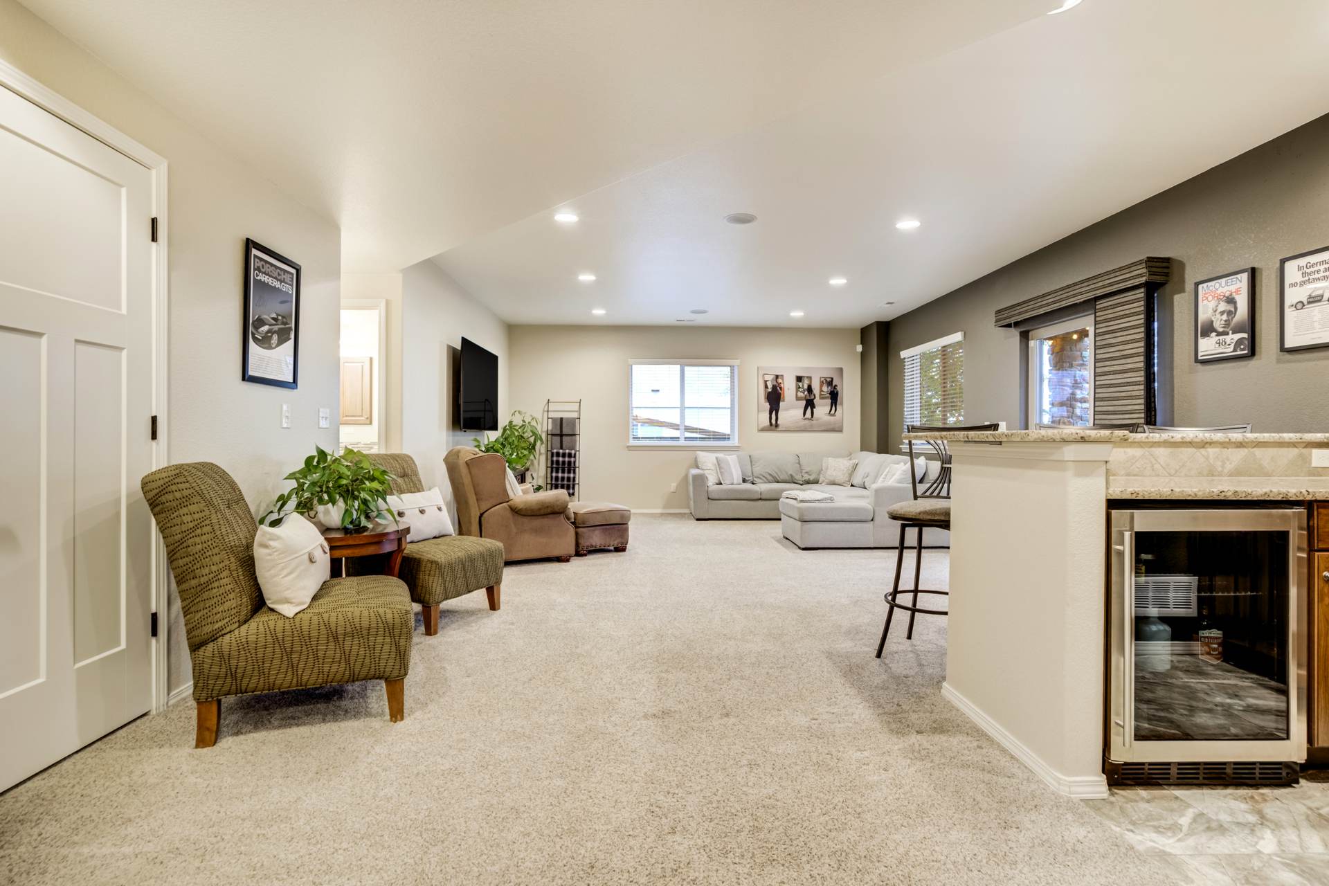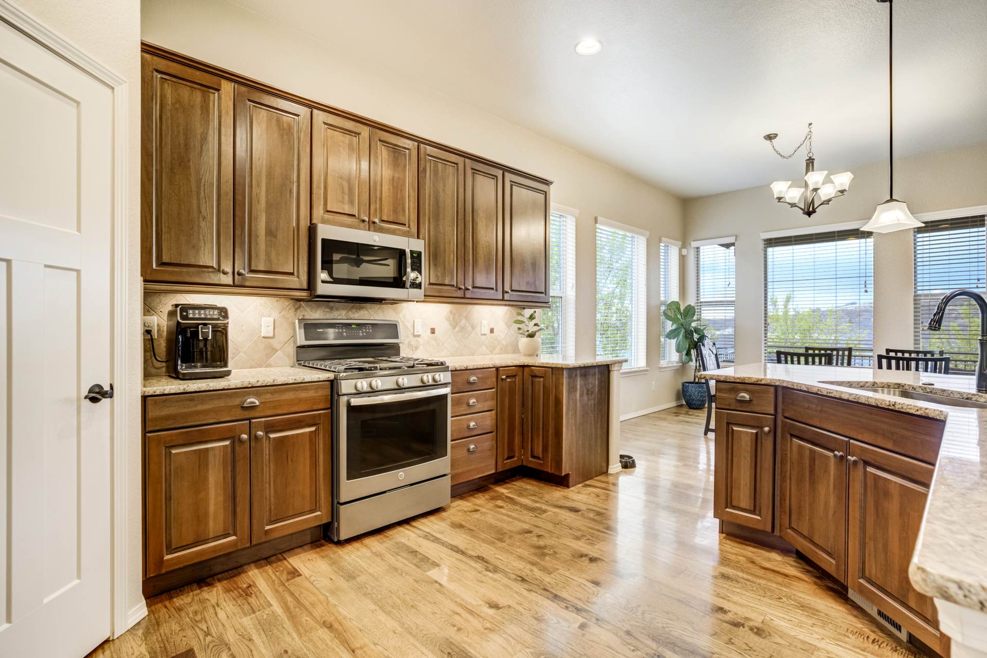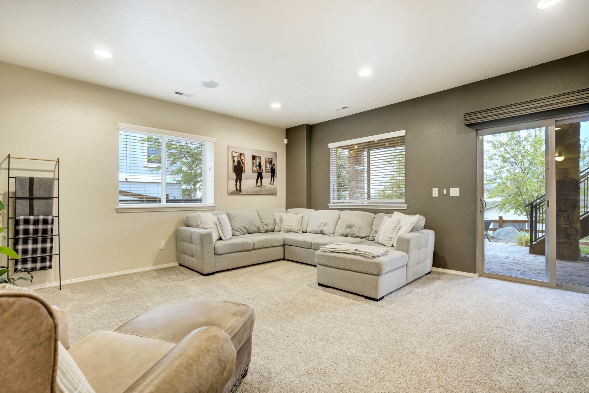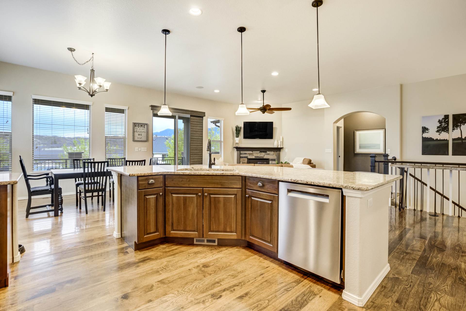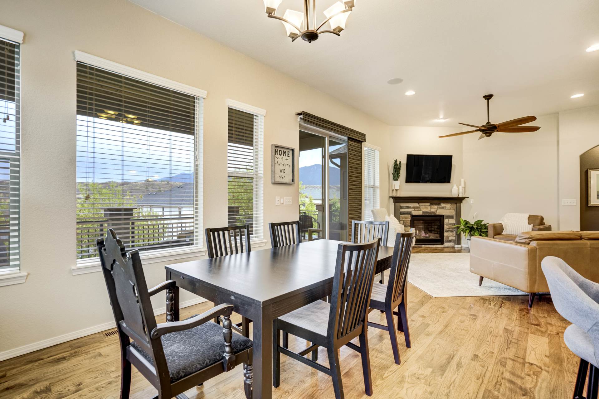 Lakeview. Mountain Views. Forest Lakes Living. This beautifully appointed Classic Home captures the best of Colorado living with sweeping lake and mountain views and thoughtfully designed indoor-outdoor spaces to enjoy them. Step inside to an expansive great room filled with natural light from large, well-placed windows, complemented by rich hickory hardwood floors and soaring 10-foot ceilings. The open layout flows effortlessly to a covered 10x29 composite deck, perfectly positioned to take in the views. The gourmet kitchen features granite countertops, 42-inch cabinetry with crown molding, stainless steel appliances, and a gas convection range with a fifth burner. Generous counter space, abundant cabinetry, and a walk-in pantry make it ideal for both everyday living and entertaining. The main-level primary suite offers convenience and privacy, with tranquil views and a spa-inspired bath complete with dual shower heads, rain feature, and custom tile work. A nearby laundry room with ample storage and utility sink adds everyday ease. A private office near the entry provides flexibility for a fifth bedroom, with an adjacent powder bath. The walk-out lower level offers 9-foot ceilings, a spacious family room with wet bar, and direct access to a hand-laid paver patio, stone firepit, and multiple outdoor gathering areas. Two additional bedrooms and a large unfinished space offer potential for expansion. Additional features include high-efficiency furnace, humidifier, water softener, gas stubs for outdoor heating and grilling, and a finished garage with epoxy floors, built-ins, and a dog wash station. A dedicated generator pad with gas hookup is already in place. Enjoy lake access just minutes away for paddleboarding, kayaking, and fishing, along with close proximity to the Santa Fe Trail, downtown Monument, United States Air Force Academy, and easy I-25 access to both Denver and Colorado Springs.