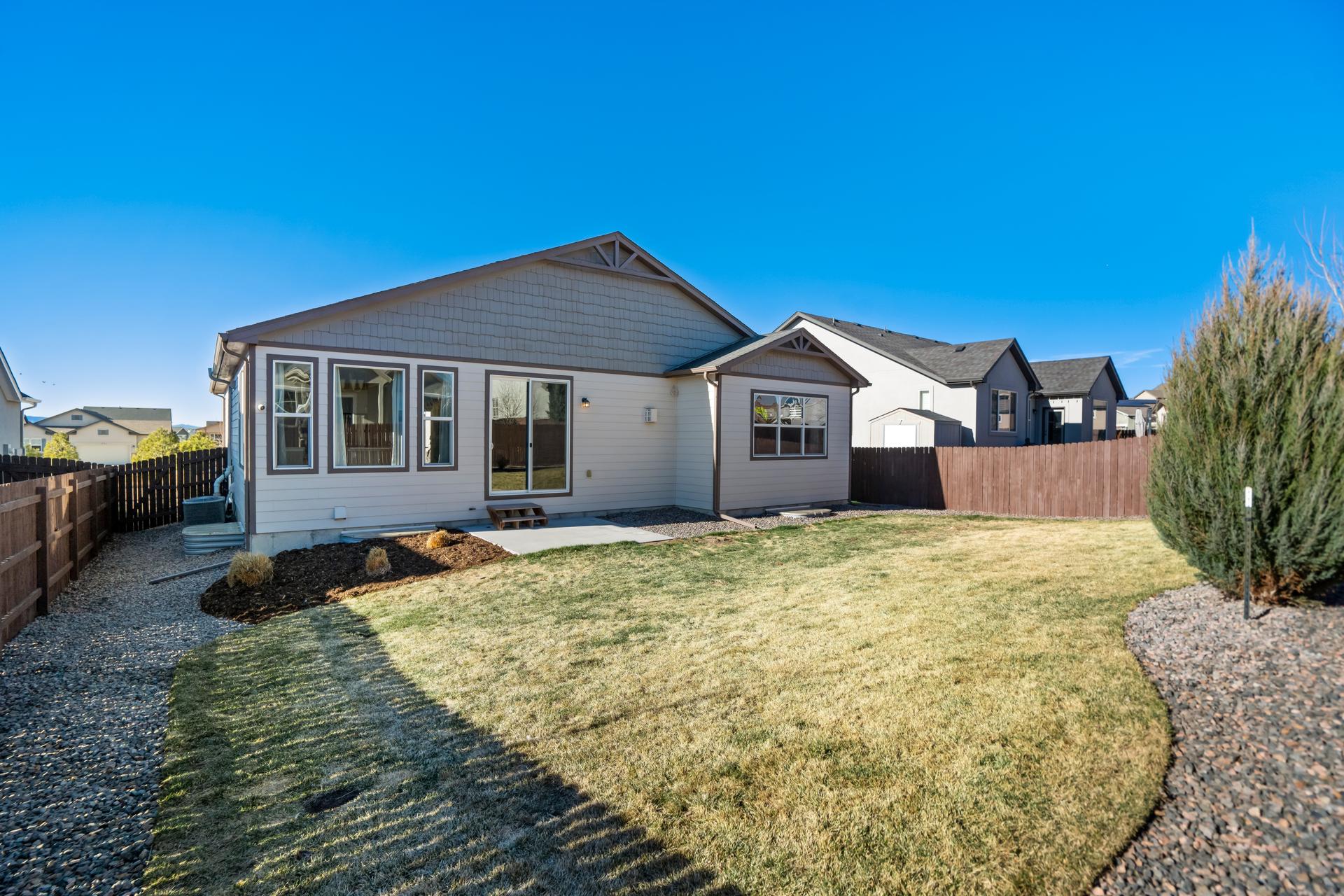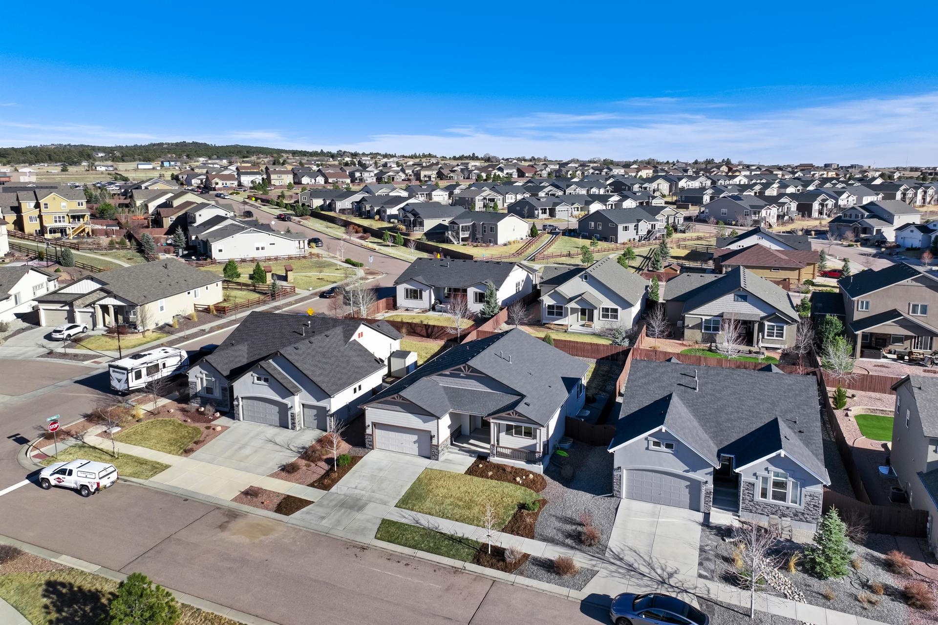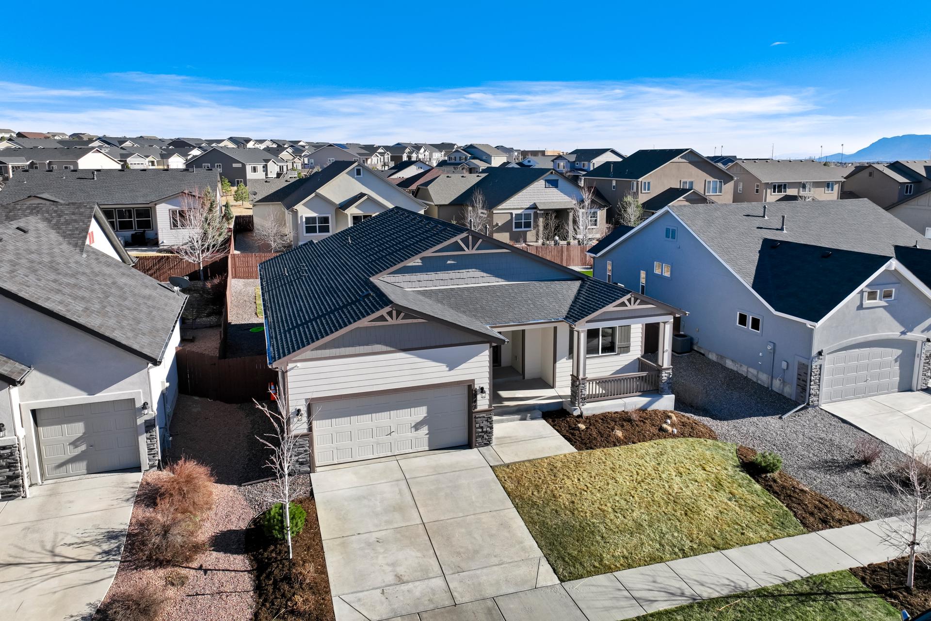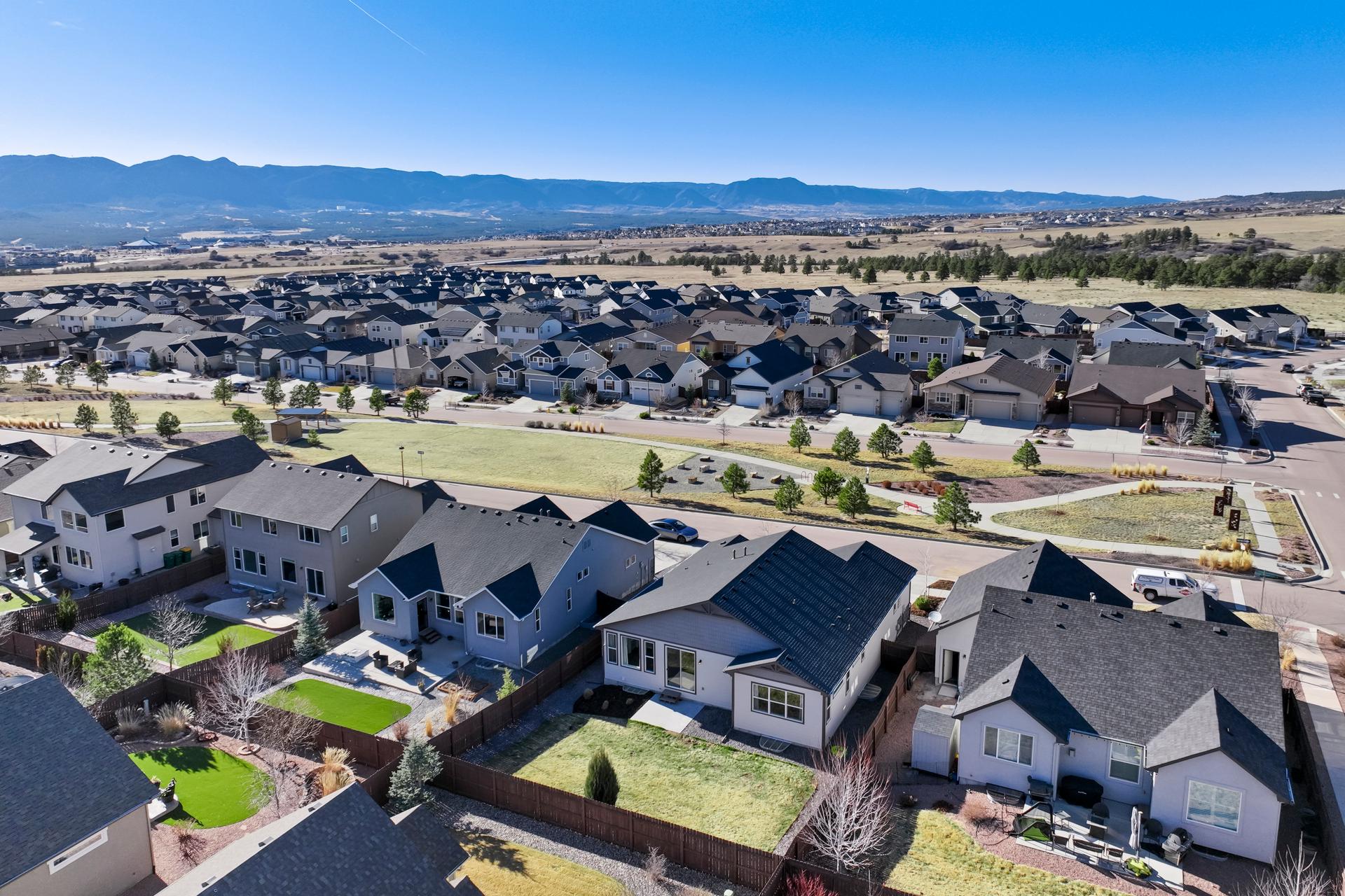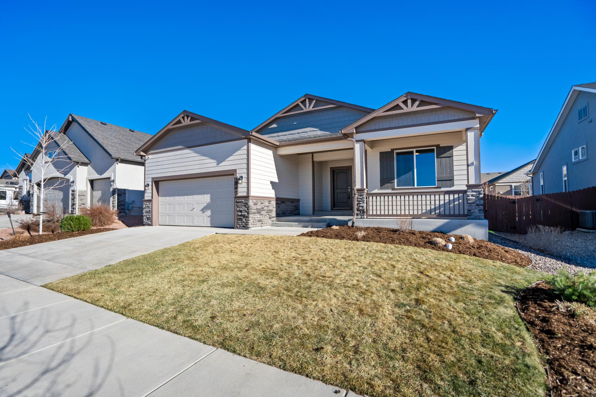Set in North Fork at Briargate, this like new ranch home pairs a newer neighborhood setting w/ a prime position along the community greenway, creating a wide-open feel w/ Pikes Peak framed in the backdrop. Sidewalks, trails, parks, pet stations, D20 schools, & quick access to Powers, Old Ranch Road, USAFA, InterQuest shopping, dining, theaters, Life Time, VillaSport, Costco, Target, King Soopers, & more all add to the day-to-day convenience. Inside, the open-concept layout delivers easy main-level living w/ 10'ceilings, tons of windows, great natural light, & mountain views from both the front porch & backyard. Luxury vinyl plank flooring flow throughout the main level, while the great room is anchored by a modern gas FP & opens directly to the dining area & gourmet kitchen. The kitchen is finished w/ upgraded quartz counters, SS appliances, a double-oven, pro 6-burner gas range, deep farmhouse-style sink, island w/seating, pantry storage, & clean modern finishes. The main-level laundry is already dialed in w/ full-size Samsung units, while included window treatments add an immediate sense of privacy. The main-level primary suite is spacious & well designed w/a large walk-in closet & an upgraded bath featuring double vanities, a lux walk-in shower w/fllor to ceiling tile, glass door, & dual shower heads. A 2nd main-level bedroom sits nearby, creating flexible space for guests or office use w/ easy access to hallway full bath. Downstairs, the bsmnt w/9' ceilings, a large entertaining area, wet bar, wine fridge, 3 large bedrms, a full bath, & a finished storage room. This layout actually functions well for everyday living. Outside, the front covered patio has views of the open space, fenced backyard, extended-depth two-car garage, EV charger/240V outlet, & central A/C. Clean, updated, & well positioned in one of the most convenient pockets of Briargate, this is a strong ranch plan w/ the right mix of views, finish level, & usable space.