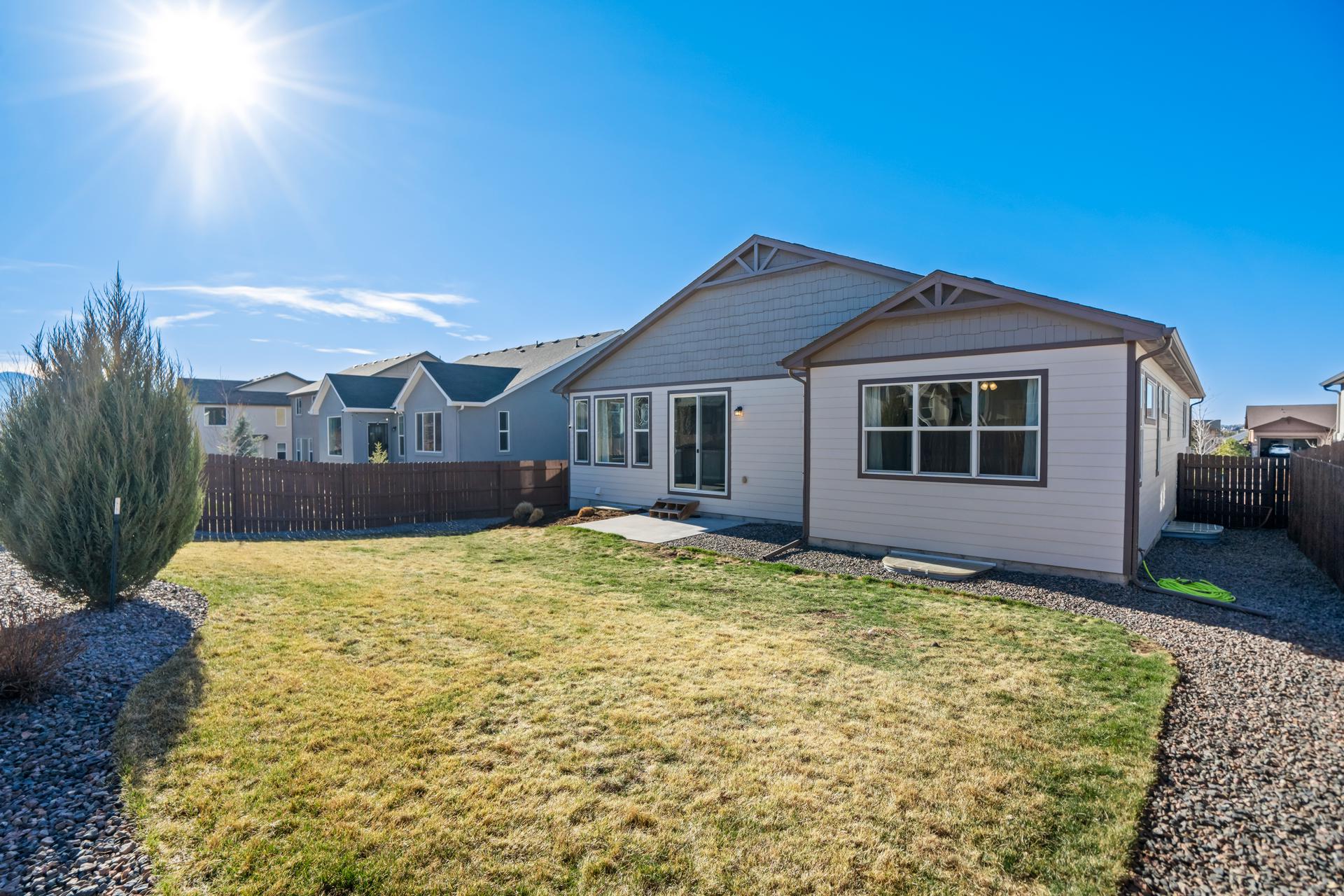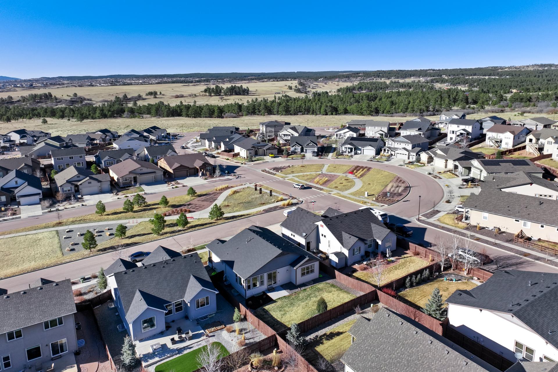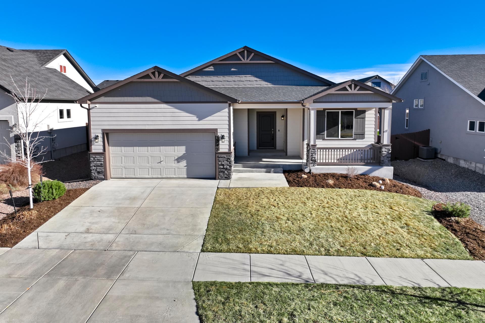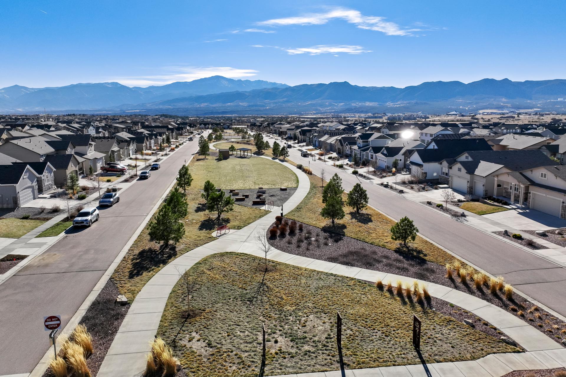 Set in North Fork at Briargate, this like new ranch home pairs a newer neighborhood setting w/ a prime position along the community greenway, creating a wide-open feel w/ Pikes Peak framed in the backdrop. Sidewalks, trails, parks, pet stations, D20 schools, & quick access to Powers, Old Ranch Road, USAFA, InterQuest shopping, dining, theaters, Life Time, VillaSport, Costco, Target, King Soopers, & more all add to the day-to-day convenience. Inside, the open-concept layout delivers easy main-level living w/ 10'ceilings, tons of windows, great natural light, & mountain views from both the front porch & backyard. Luxury vinyl plank flooring flow throughout the main level, while the great room is anchored by a modern gas FP & opens directly to the dining area & gourmet kitchen. The kitchen is finished w/ upgraded quartz counters, SS appliances, a double-oven, pro 6-burner gas range, deep farmhouse-style sink, island w/seating, pantry storage, & clean modern finishes. The main-level laundry is already dialed in w/ full-size Samsung units, while included window treatments add an immediate sense of privacy. The main-level primary suite is spacious & well designed w/a large walk-in closet & an upgraded bath featuring double vanities, a lux walk-in shower w/fllor to ceiling tile, glass door, & dual shower heads. A 2nd main-level bedroom sits nearby, creating flexible space for guests or office use w/ easy access to hallway full bath. Downstairs, the bsmnt w/9' ceilings, a large entertaining area, wet bar, wine fridge, 3 large bedrms, a full bath, & a finished storage room. This layout actually functions well for everyday living. Outside, the front covered patio has views of the open space, fenced backyard, extended-depth two-car garage, EV charger/240V outlet, & central A/C. Clean, updated, & well positioned in one of the most convenient pockets of Briargate, this is a strong ranch plan w/ the right mix of views, finish level, & usable space.