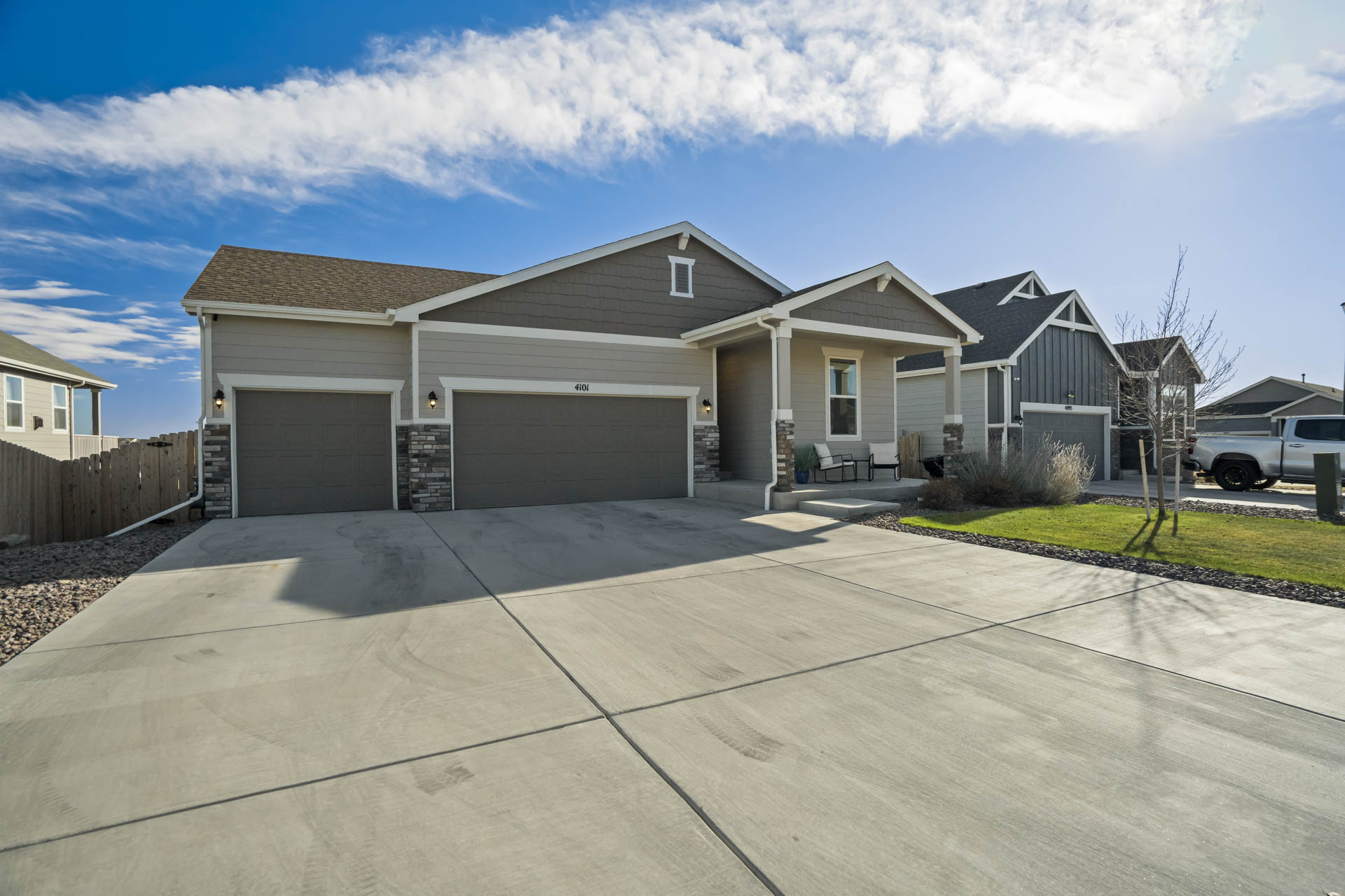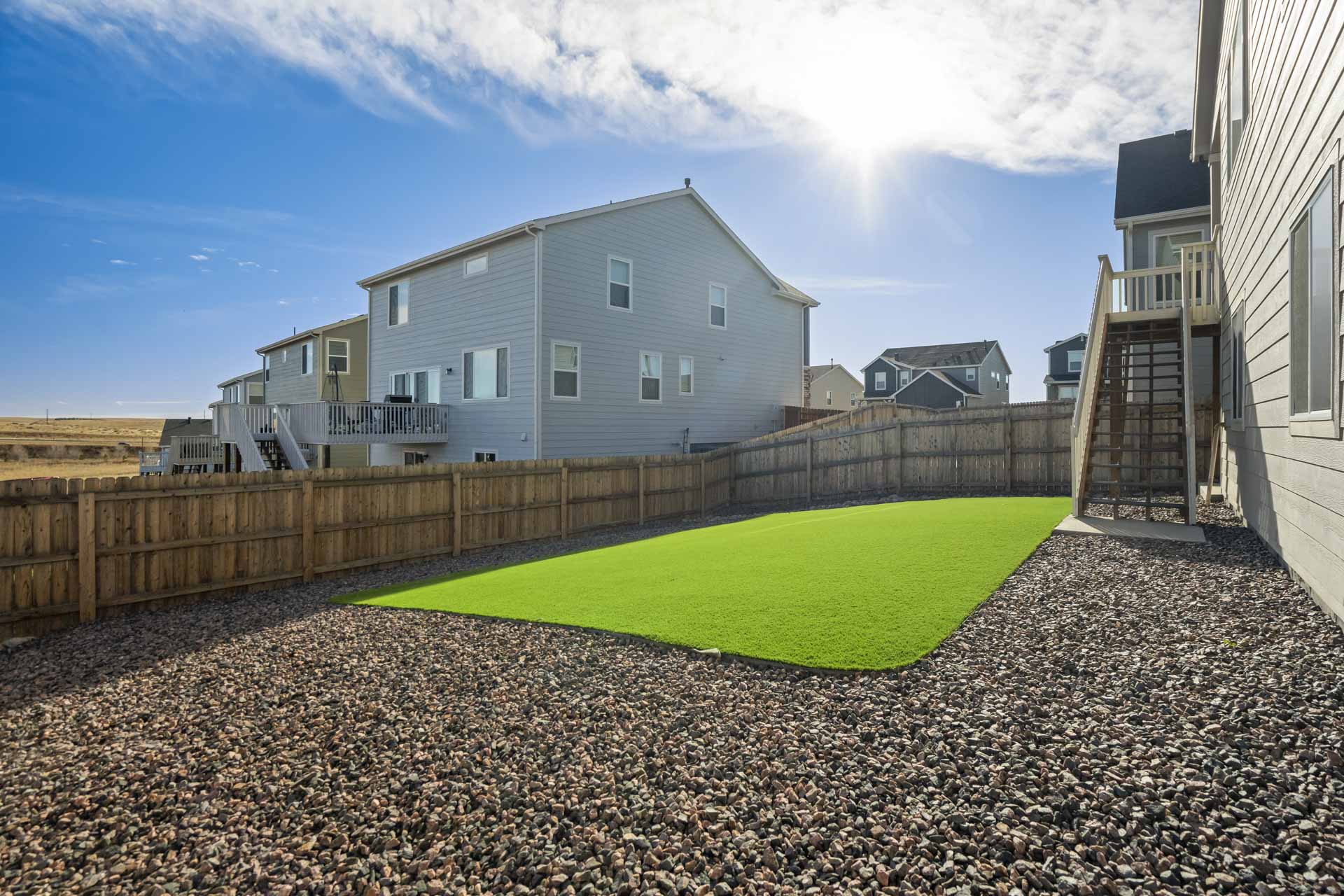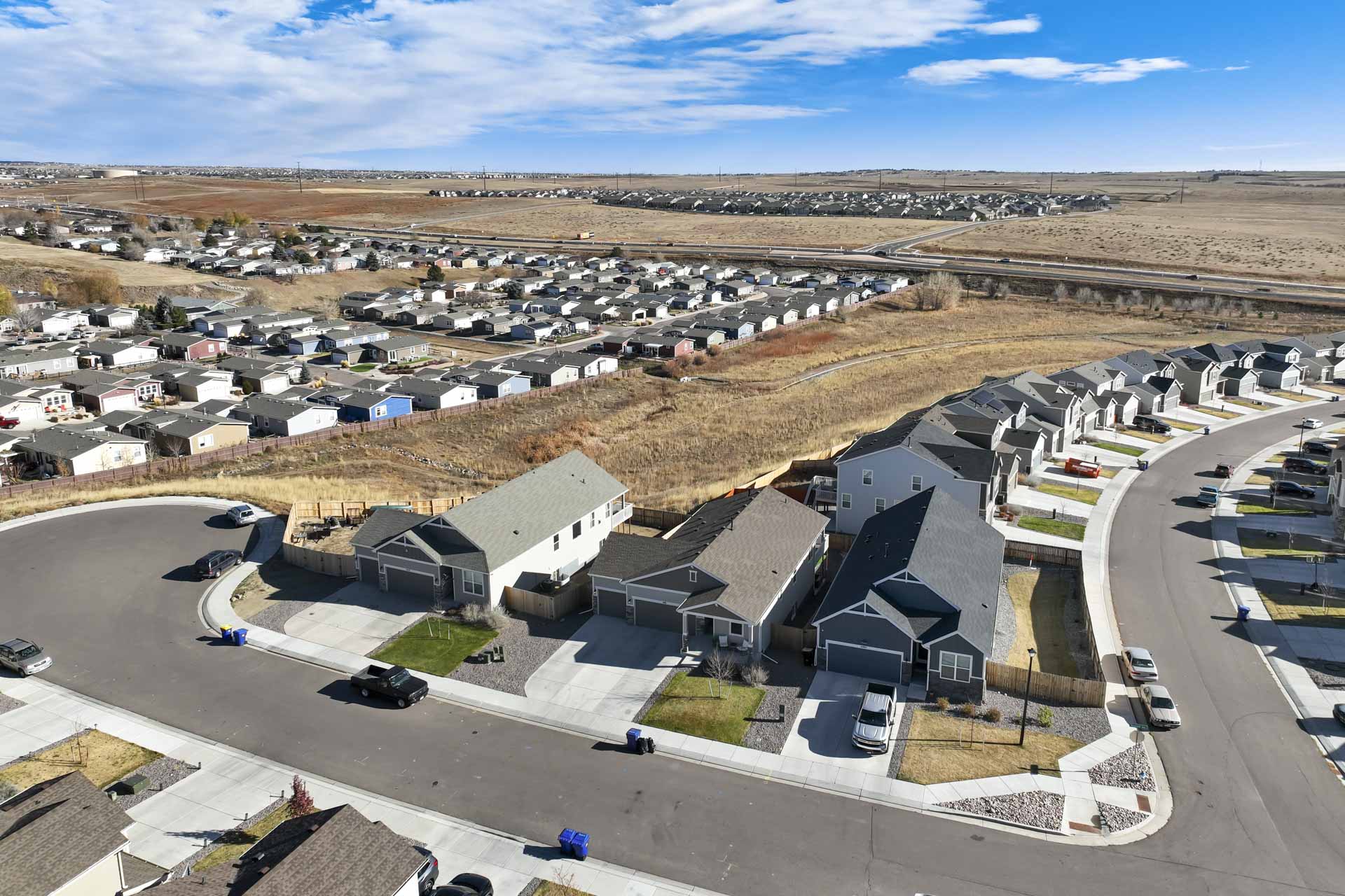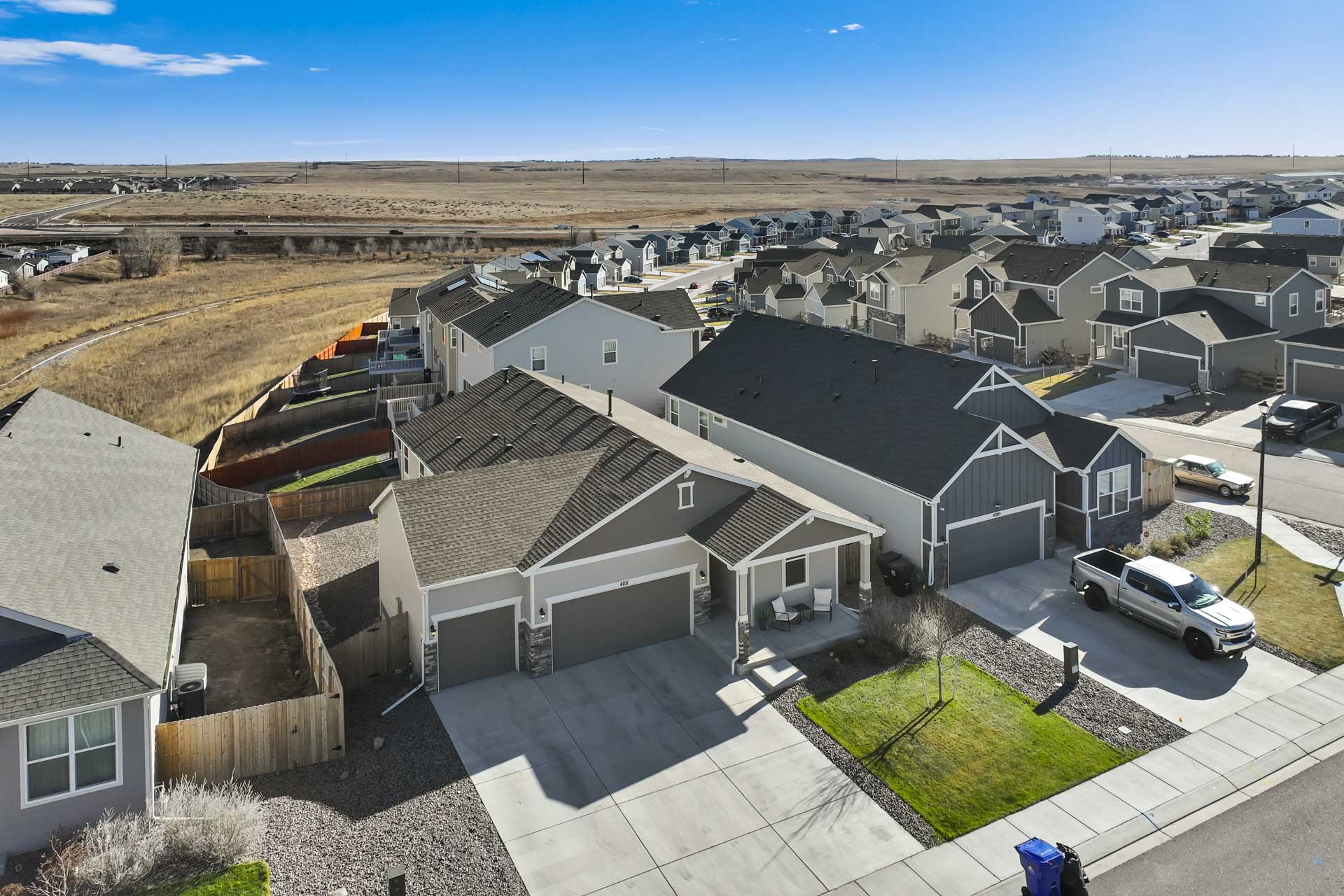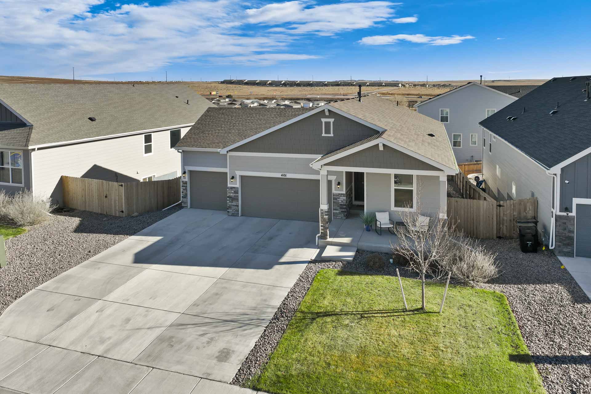 Set in the convenient Powers corridor w/quick access to shopping, dining, parks & D49 schools, this like-new ranch welcomes you w/beautifully manicured front landscaping & a covered front porch that leads into a bright, open main level. Inside, warm LVP wood flooring flows throughout the great room, connecting the upgraded kitchen, dining nook & living area into one cohesive entertaining space. The kitchen features gas stainless appliances, granite countertops, metal hardware, ample cabinet storage & a large island w/breakfast bar. The adjoining great room is centered by a gas fireplace w/tile surround & custom wood mantel, framed by large windows that bring in natural light & capture views of the open space behind the home. From the dining area, walk out to the covered composite deck w/space for a table & grill, extending the indoor–outdoor flow. The main level primary suite overlooks the open space & includes a ceiling fan, a private bath w/quartz double vanities, an oversized tiled shower w/bench & a large walk-in closet. Two additional main level bedrooms sit near the full hall bath finished w/tiled shower surround. The laundry room is also on this level for added convenience. The finished walkout basement expands the livability w/a large open family room, a full bathroom & a spacious bedroom w/walk-in closet. A finished storage area adds flexibility, while an additional unfinished room provides excellent space for storage, workshop needs or a home gym. Outside, the xeriscaped backyard features dog friendly artificial turf & rock for easy care, ideal for pets & play. Nearby community park & open space within walking distance. An oversized insulated 3-car garage, central air, vinyl windows & low-maintenance exterior materials complete this move-in-ready home.