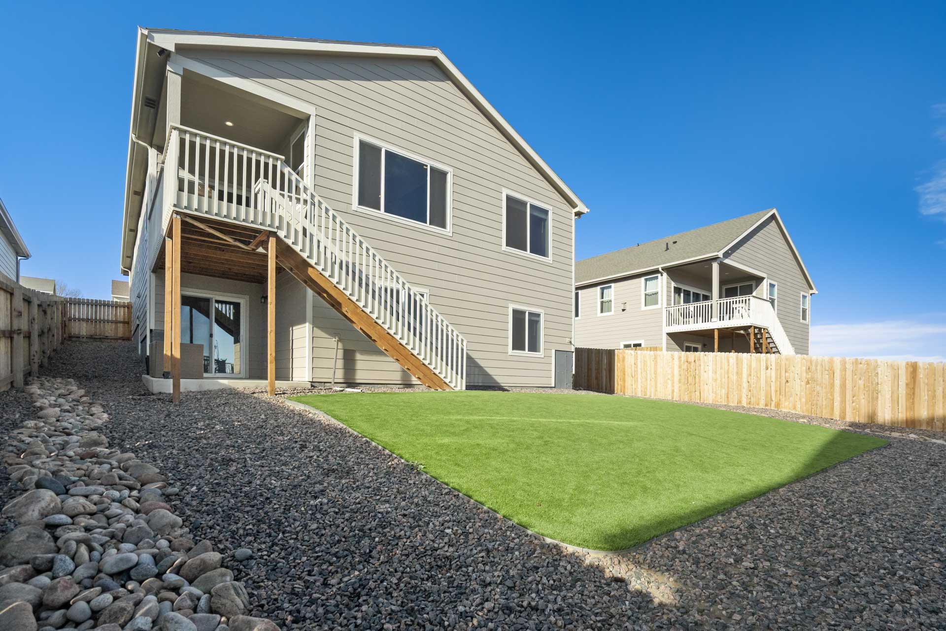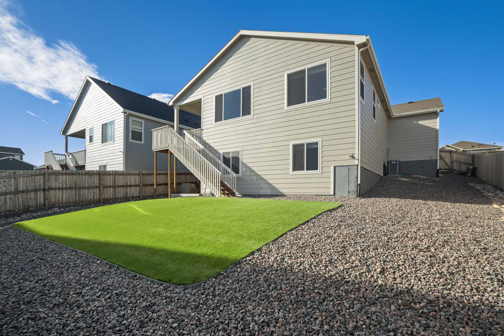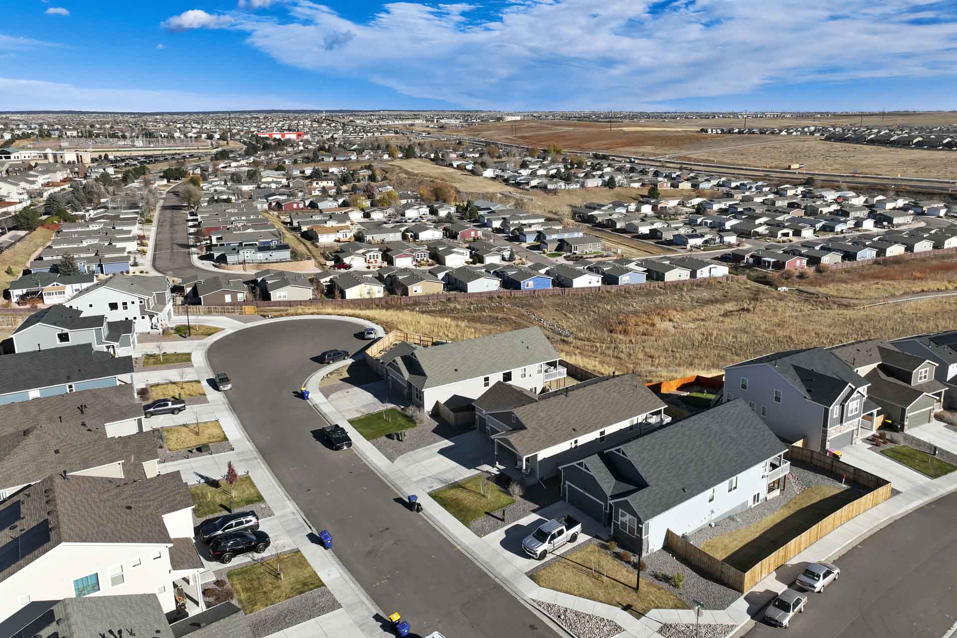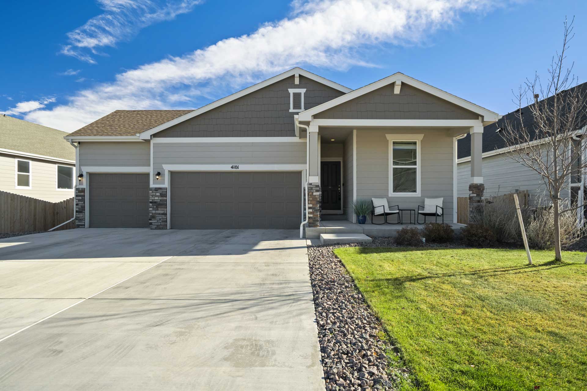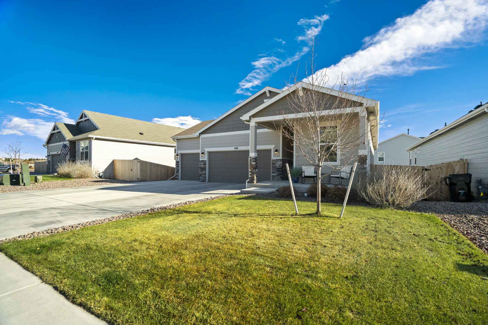 Set in the convenient Powers corridor w/quick access to shopping, dining, parks & D49 schools, this like-new ranch welcomes you w/beautifully manicured front landscaping & a covered front porch that leads into a bright, open main level. Inside, warm LVP wood flooring flows throughout the great room, connecting the upgraded kitchen, dining nook & living area into one cohesive entertaining space. The kitchen features gas stainless appliances, granite countertops, metal hardware, ample cabinet storage & a large island w/breakfast bar. The adjoining great room is centered by a gas fireplace w/tile surround & custom wood mantel, framed by large windows that bring in natural light & capture views of the open space behind the home. From the dining area, walk out to the covered composite deck w/space for a table & grill, extending the indoor–outdoor flow. The main level primary suite overlooks the open space & includes a ceiling fan, a private bath w/quartz double vanities, an oversized tiled shower w/bench & a large walk-in closet. Two additional main level bedrooms sit near the full hall bath finished w/tiled shower surround. The laundry room is also on this level for added convenience. The finished walkout basement expands the livability w/a large open family room, a full bathroom & a spacious bedroom w/walk-in closet. A finished storage area adds flexibility, while an additional unfinished room provides excellent space for storage, workshop needs or a home gym. Outside, the xeriscaped backyard features dog friendly artificial turf & rock for easy care, ideal for pets & play. Nearby community park & open space within walking distance. An oversized insulated 3-car garage, central air, vinyl windows & low-maintenance exterior materials complete this move-in-ready home.