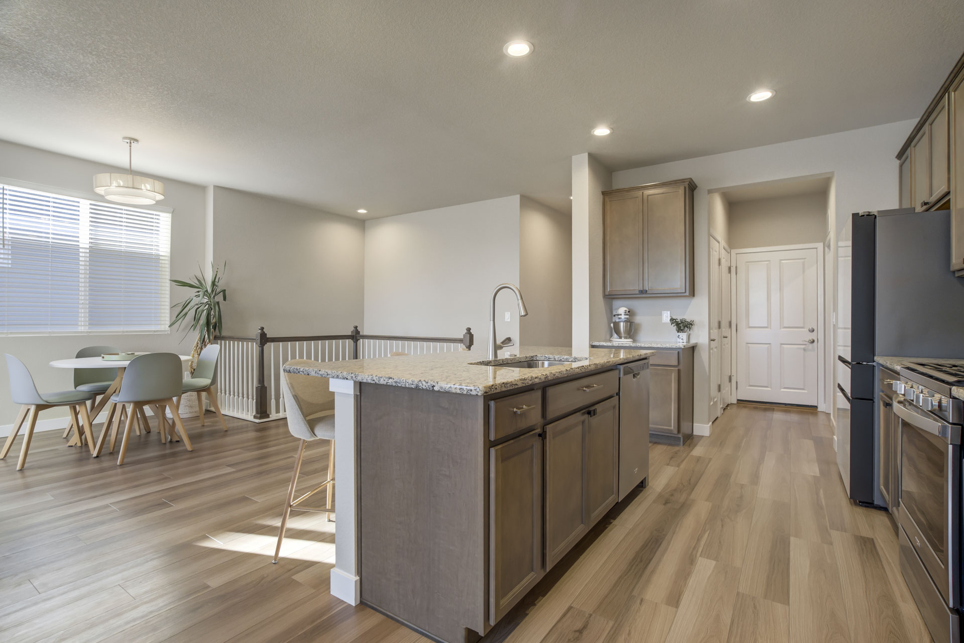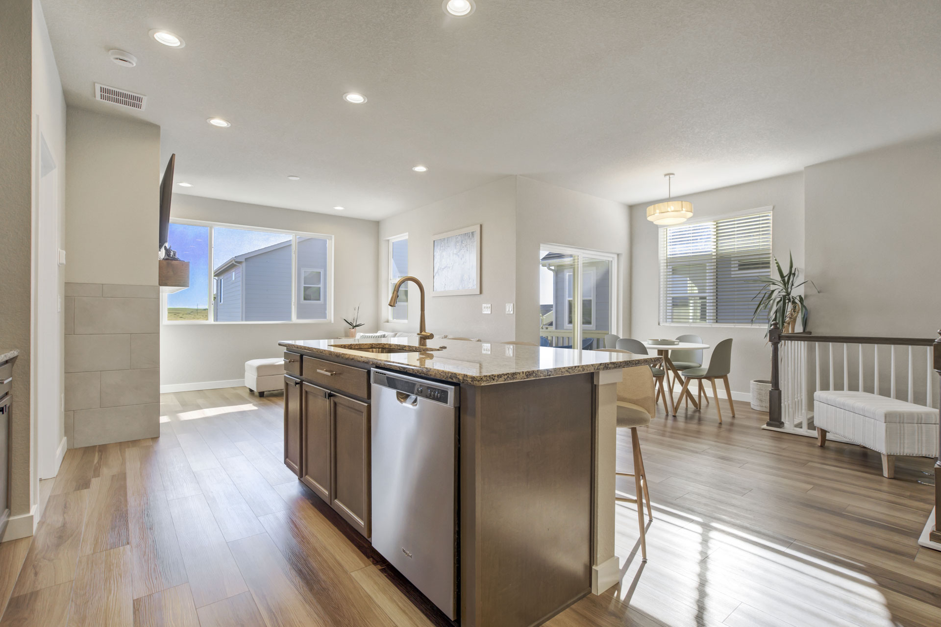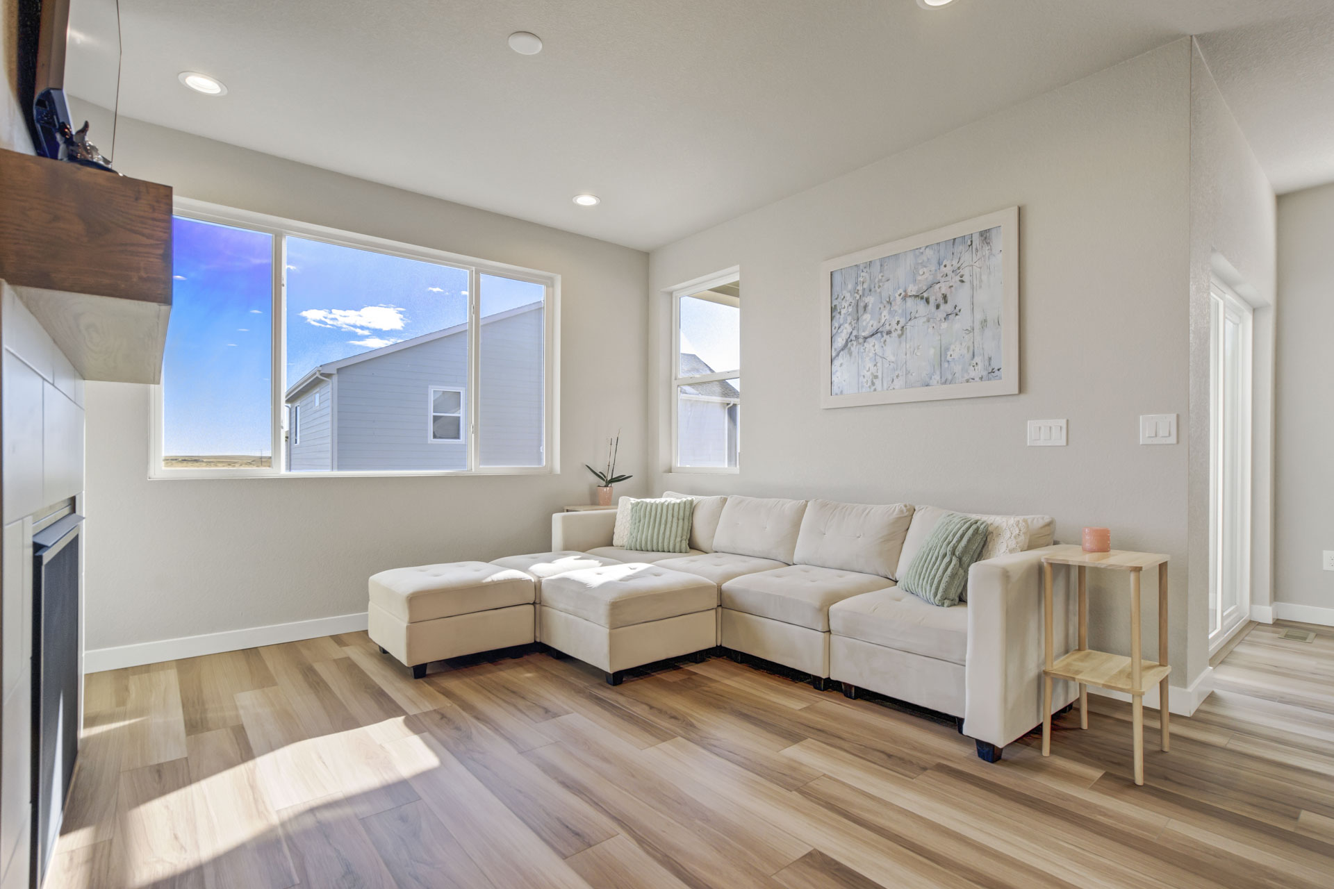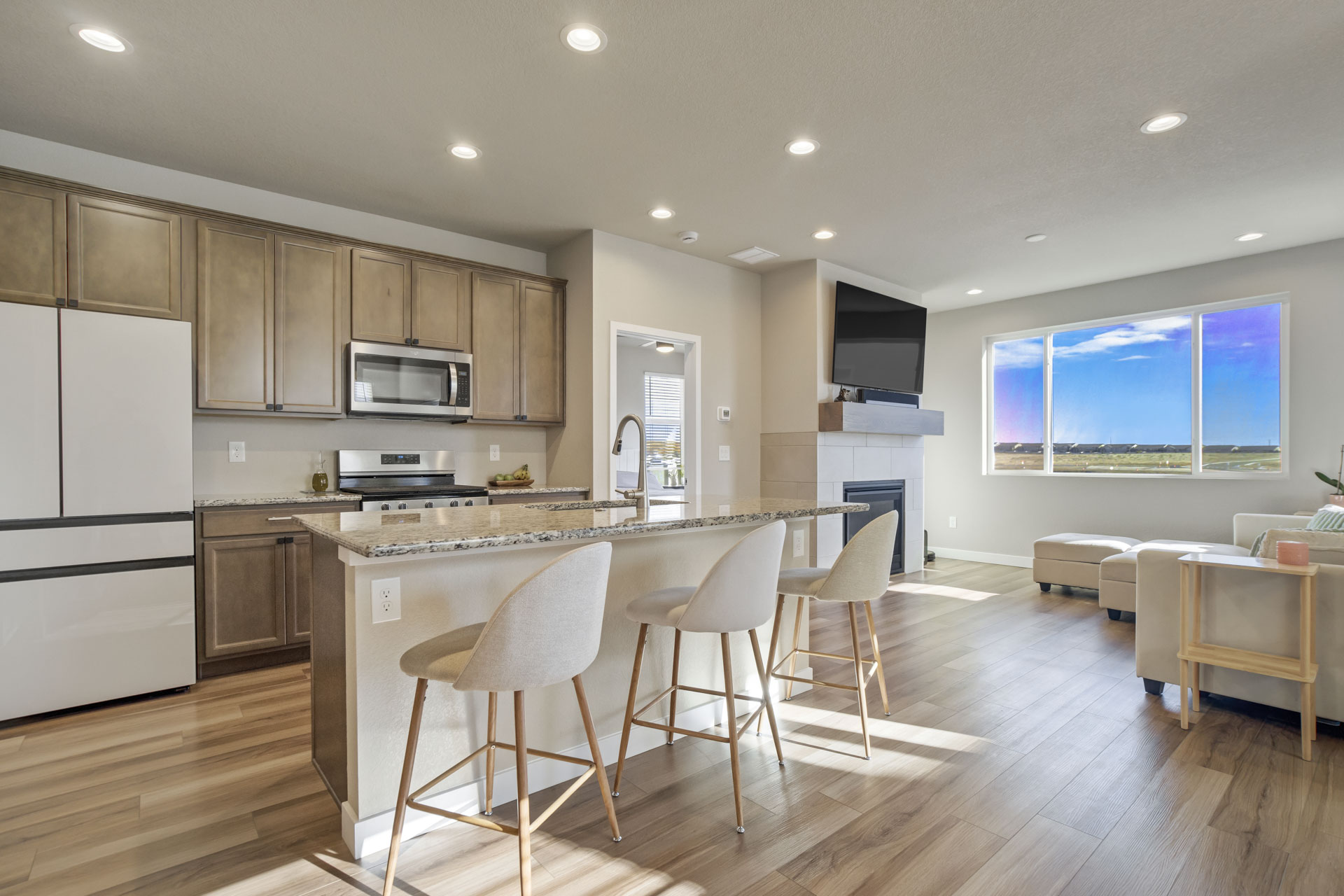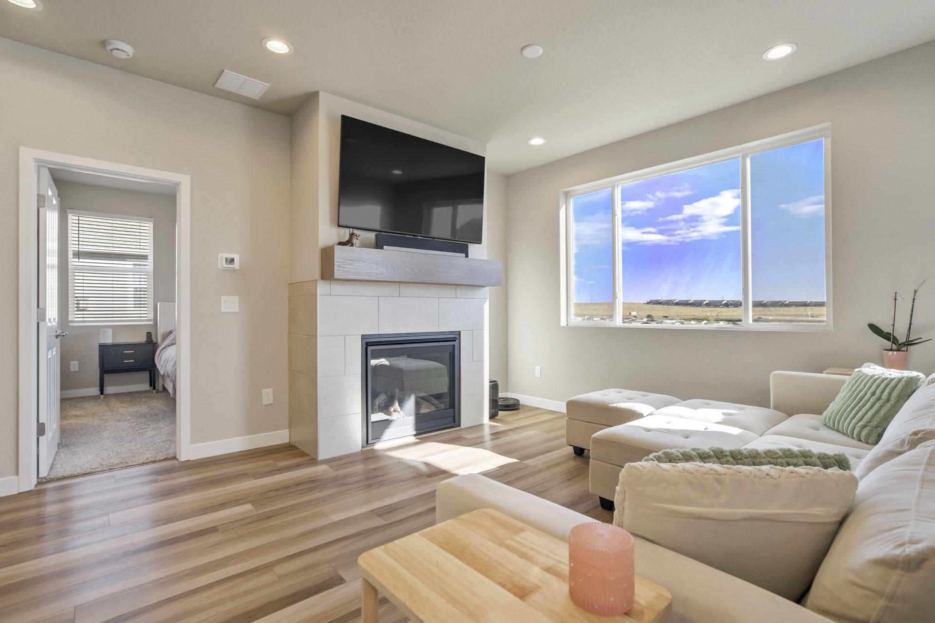 Set in the convenient Powers corridor w/quick access to shopping, dining, parks & D49 schools, this like-new ranch welcomes you w/beautifully manicured front landscaping & a covered front porch that leads into a bright, open main level. Inside, warm LVP wood flooring flows throughout the great room, connecting the upgraded kitchen, dining nook & living area into one cohesive entertaining space. The kitchen features gas stainless appliances, granite countertops, metal hardware, ample cabinet storage & a large island w/breakfast bar. The adjoining great room is centered by a gas fireplace w/tile surround & custom wood mantel, framed by large windows that bring in natural light & capture views of the open space behind the home. From the dining area, walk out to the covered composite deck w/space for a table & grill, extending the indoor–outdoor flow. The main level primary suite overlooks the open space & includes a ceiling fan, a private bath w/quartz double vanities, an oversized tiled shower w/bench & a large walk-in closet. Two additional main level bedrooms sit near the full hall bath finished w/tiled shower surround. The laundry room is also on this level for added convenience. The finished walkout basement expands the livability w/a large open family room, a full bathroom & a spacious bedroom w/walk-in closet. A finished storage area adds flexibility, while an additional unfinished room provides excellent space for storage, workshop needs or a home gym. Outside, the xeriscaped backyard features dog friendly artificial turf & rock for easy care, ideal for pets & play. Nearby community park & open space within walking distance. An oversized insulated 3-car garage, central air, vinyl windows & low-maintenance exterior materials complete this move-in-ready home.