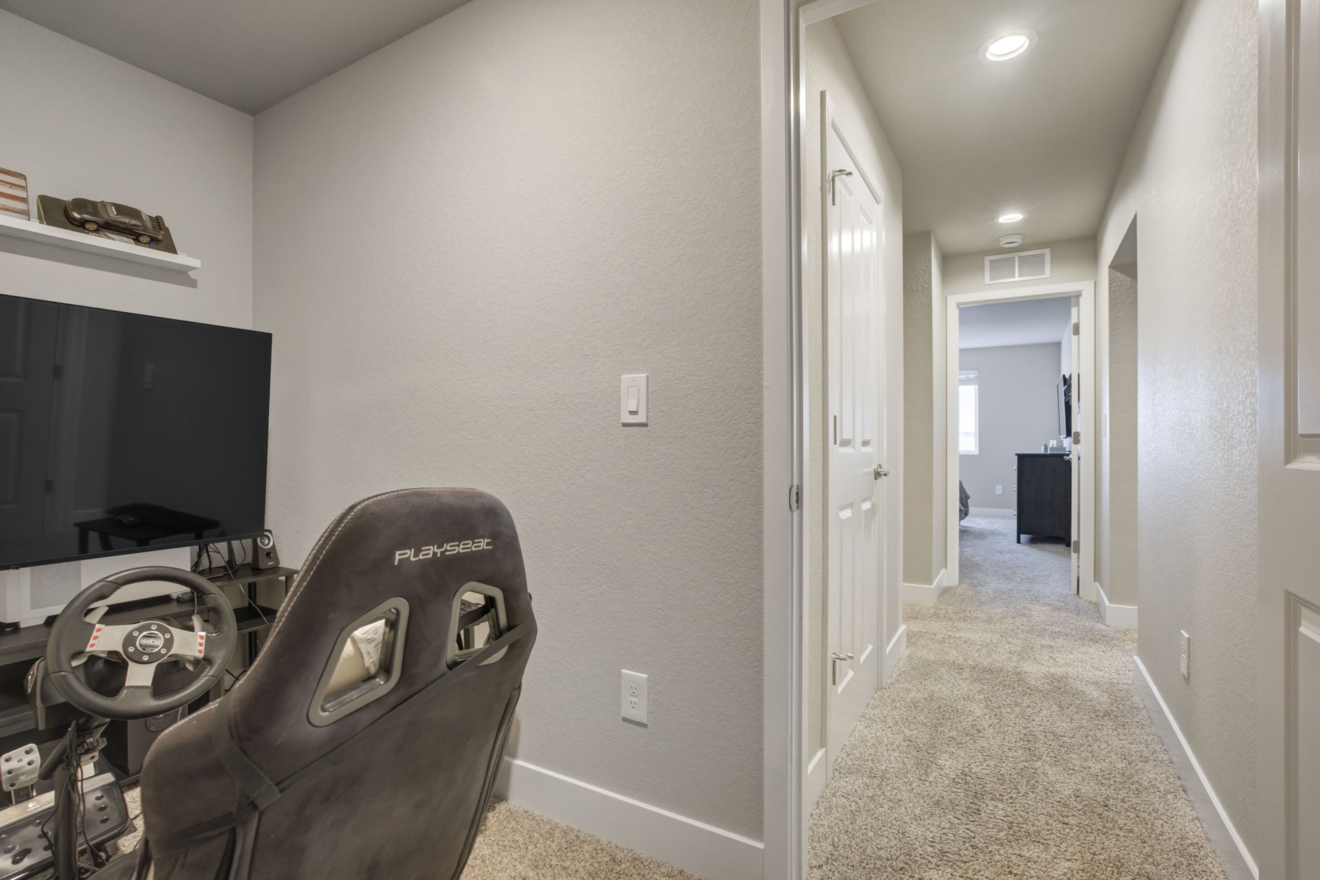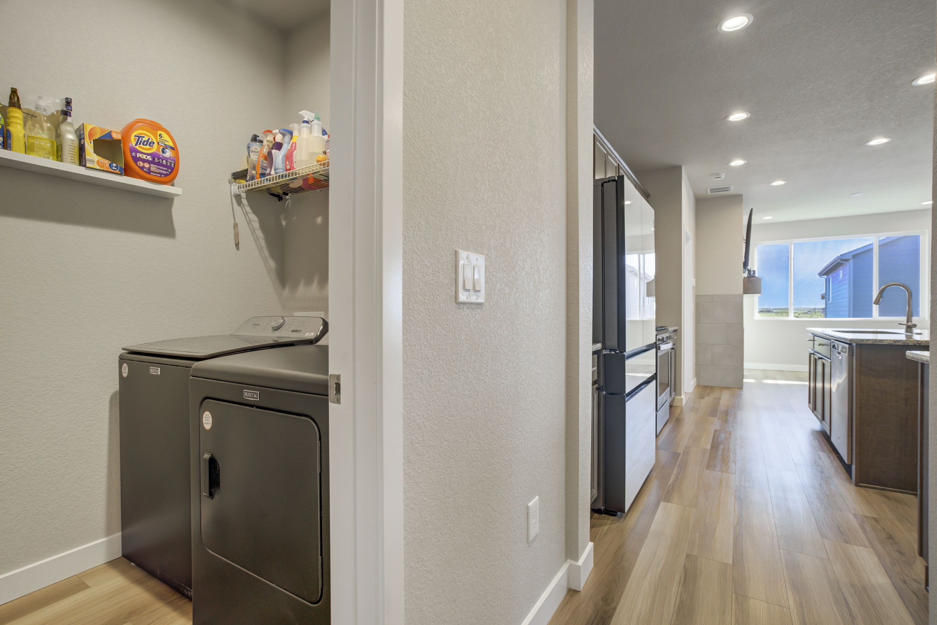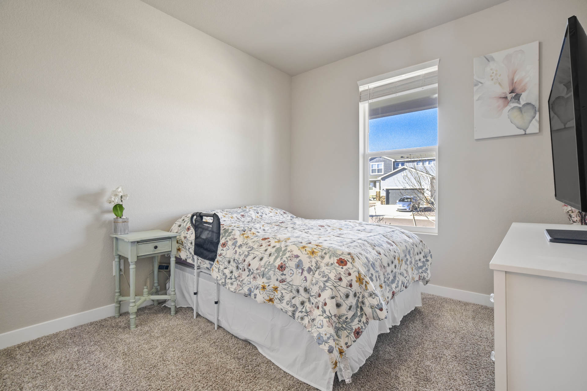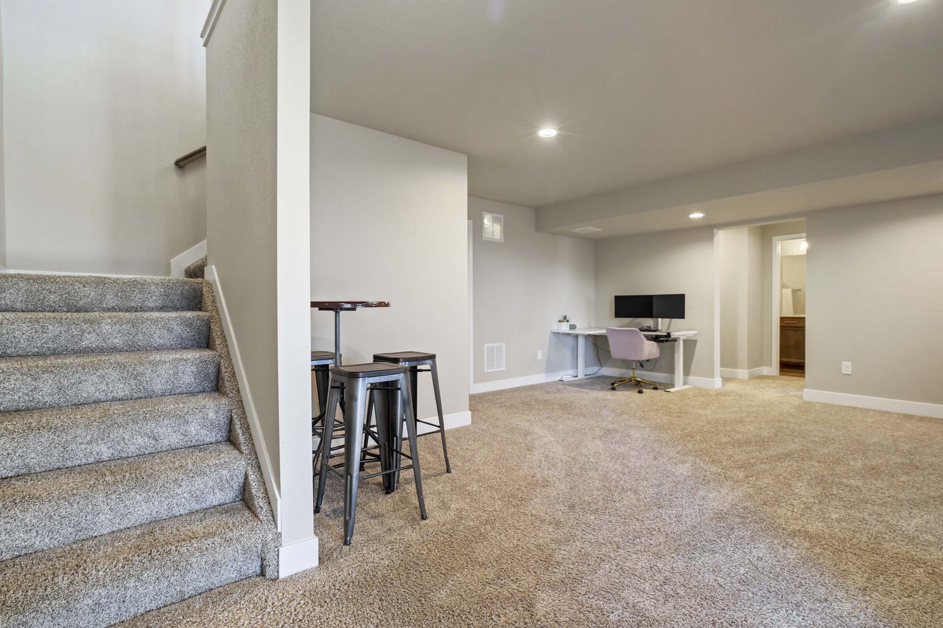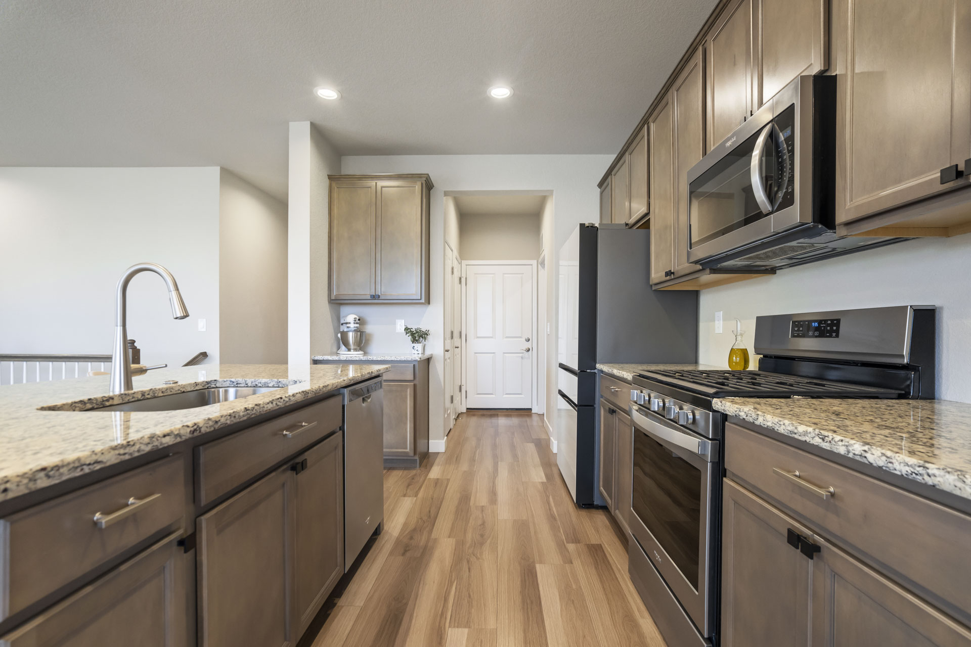 Set in the convenient Powers corridor w/quick access to shopping, dining, parks & D49 schools, this like-new ranch welcomes you w/beautifully manicured front landscaping & a covered front porch that leads into a bright, open main level. Inside, warm LVP wood flooring flows throughout the great room, connecting the upgraded kitchen, dining nook & living area into one cohesive entertaining space. The kitchen features gas stainless appliances, granite countertops, metal hardware, ample cabinet storage & a large island w/breakfast bar. The adjoining great room is centered by a gas fireplace w/tile surround & custom wood mantel, framed by large windows that bring in natural light & capture views of the open space behind the home. From the dining area, walk out to the covered composite deck w/space for a table & grill, extending the indoor–outdoor flow. The main level primary suite overlooks the open space & includes a ceiling fan, a private bath w/quartz double vanities, an oversized tiled shower w/bench & a large walk-in closet. Two additional main level bedrooms sit near the full hall bath finished w/tiled shower surround. The laundry room is also on this level for added convenience. The finished walkout basement expands the livability w/a large open family room, a full bathroom & a spacious bedroom w/walk-in closet. A finished storage area adds flexibility, while an additional unfinished room provides excellent space for storage, workshop needs or a home gym. Outside, the xeriscaped backyard features dog friendly artificial turf & rock for easy care, ideal for pets & play. Nearby community park & open space within walking distance. An oversized insulated 3-car garage, central air, vinyl windows & low-maintenance exterior materials complete this move-in-ready home.