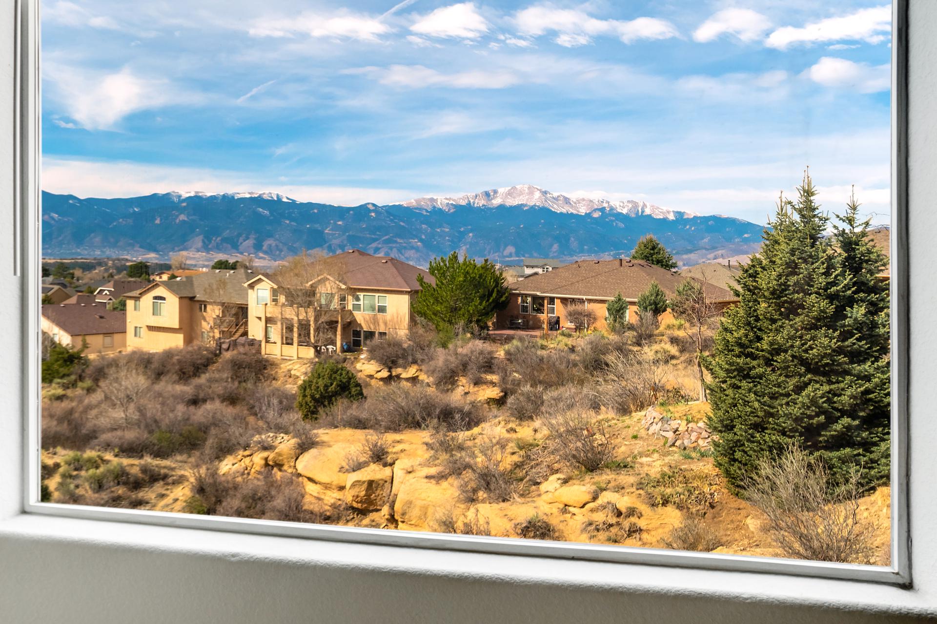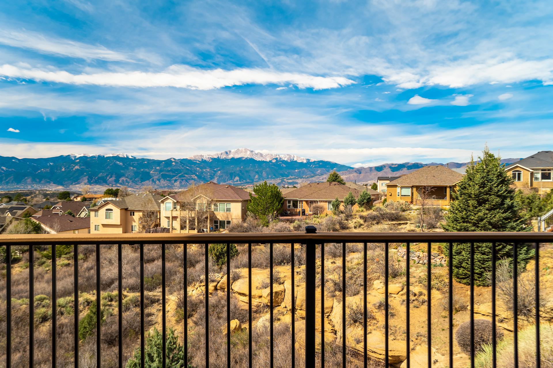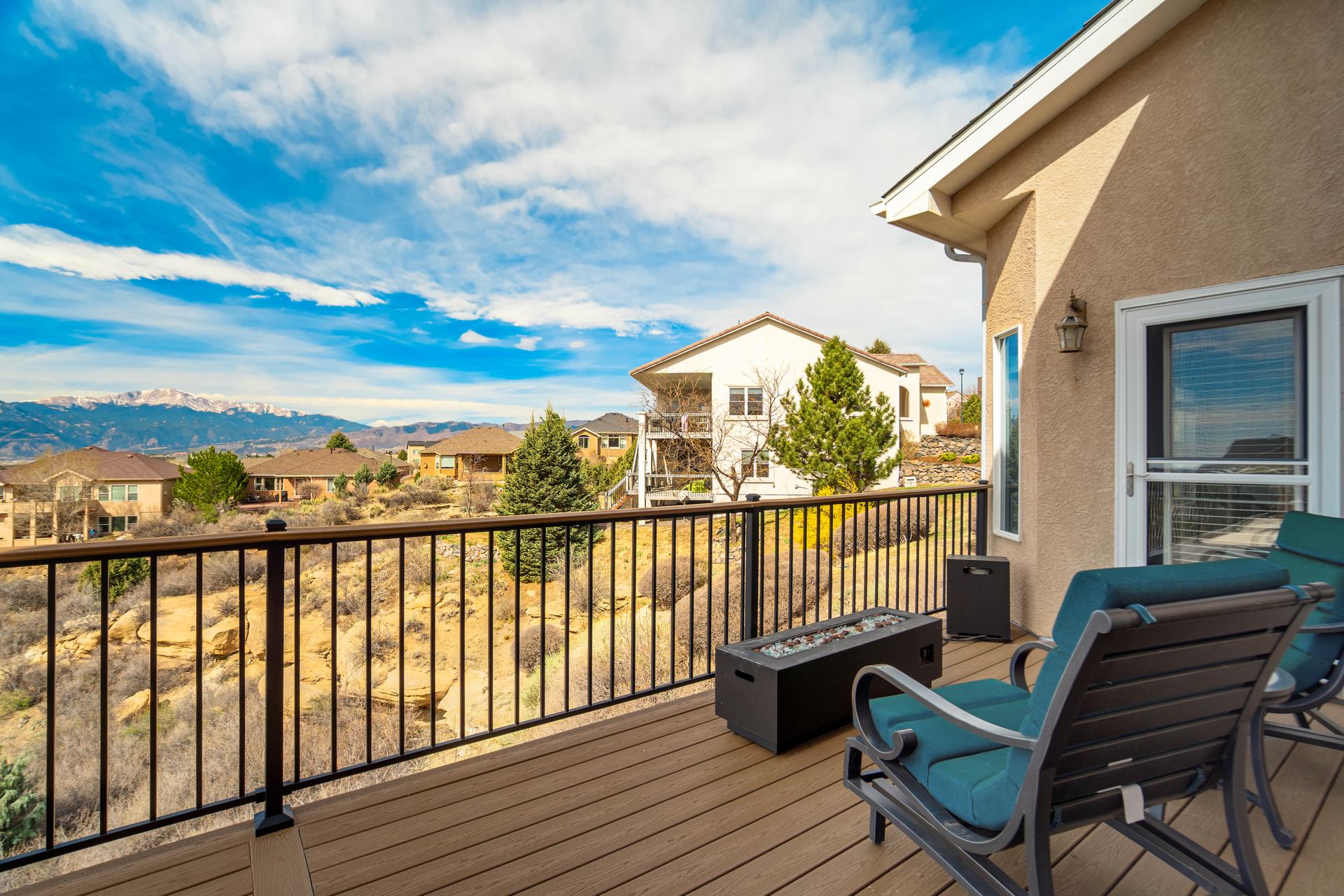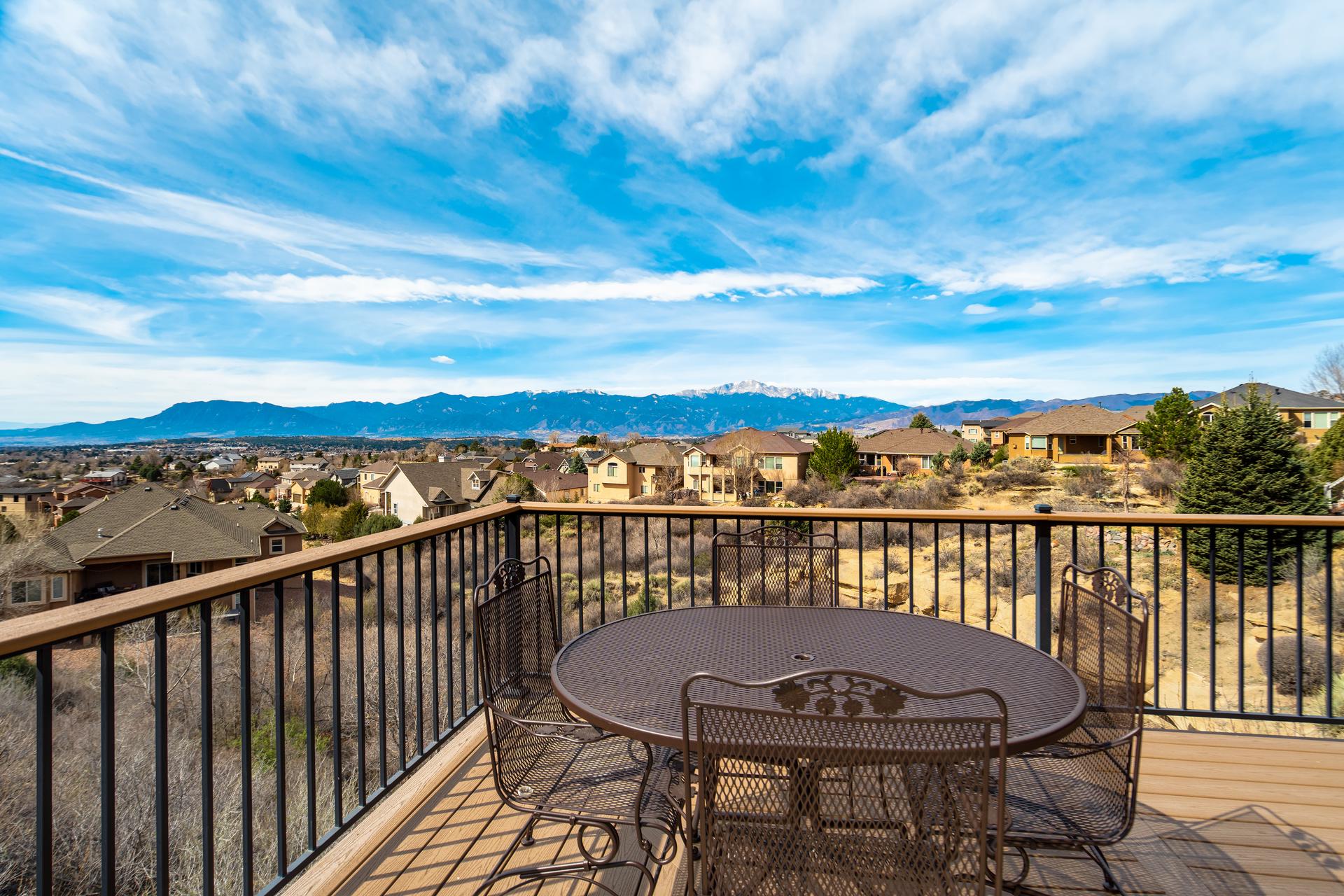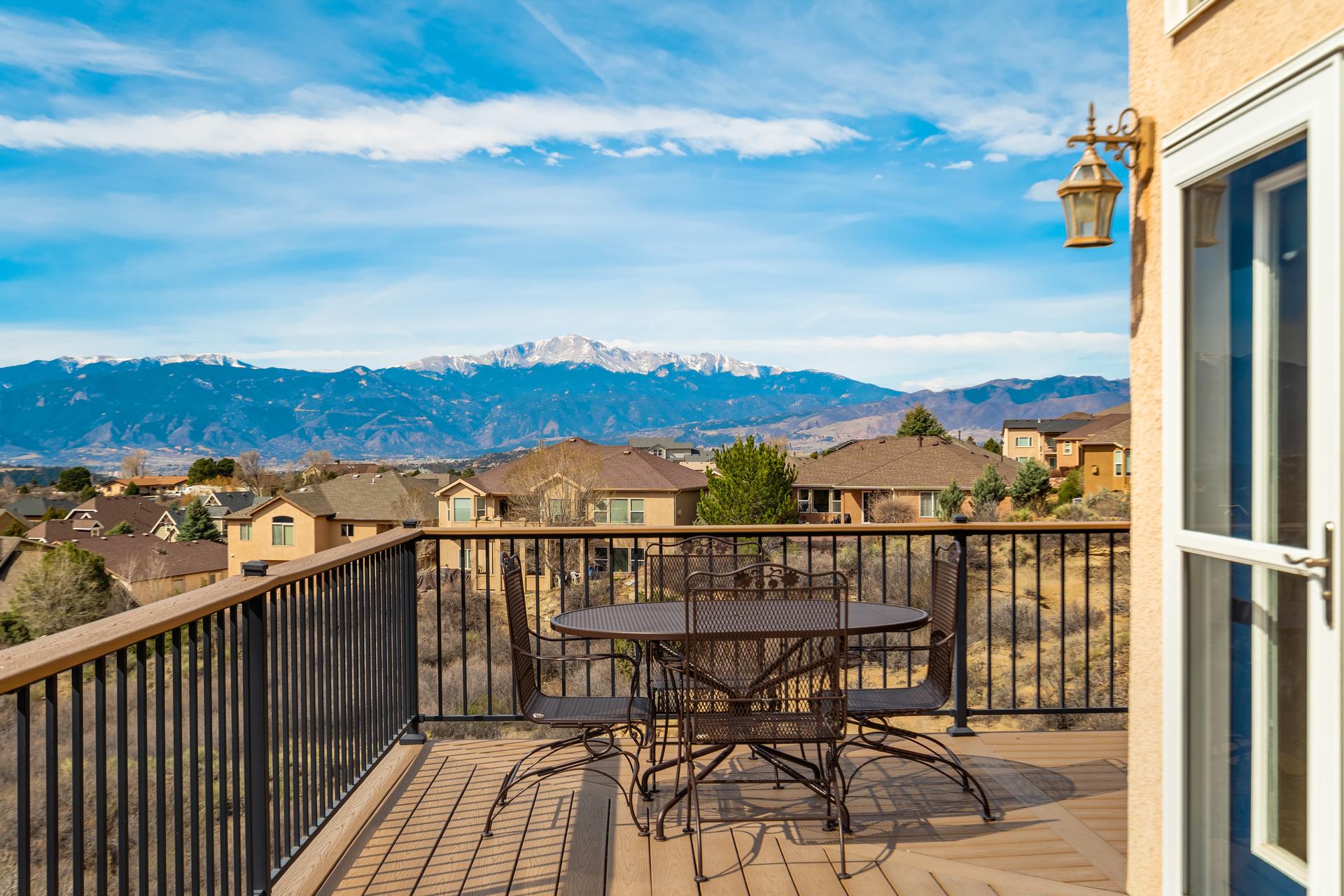 Experience the peak of Colorado living in this stunning residence, where architectural elegance meets unobstructed views of Pikes Peak and the Front Range. The double-door entry opens to a light-filled main level featuring expansive windows and a living room centered around a gas-log fireplace with a custom built-in entertainment center. The gourmet kitchen is a chef’s dream, boasting quartz countertops, a 6-burner gas range, a large pantry, and a sun-drenched breakfast nook with bay windows. Retreat to the primary suite, a private sanctuary with tray ceilings, deck access, and a spa-like 5-piece bath featuring a soaking tub, stone-walled shower, and a walk-through closet with custom shelving and direct laundry access. A versatile second bedroom or office and a 3/4 bath complete the main level. The fully finished walkout basement is designed for entertainment, offering a massive family room with a second fireplace, recessed lighting, and ample space for game tables. Two additional basement bedrooms and a full bath provide plenty of space for guests. Outside, the long, wrap-around Trex deck and lower-level patio capitalize on the breathtaking mountain views and overlook peaceful open space. This home is complete with a 3-car tandem garage and a dedicated storage and utility area. Every detail of this property has been curated to highlight the picturesque Western landscape, offering a sophisticated lifestyle in a premier setting.