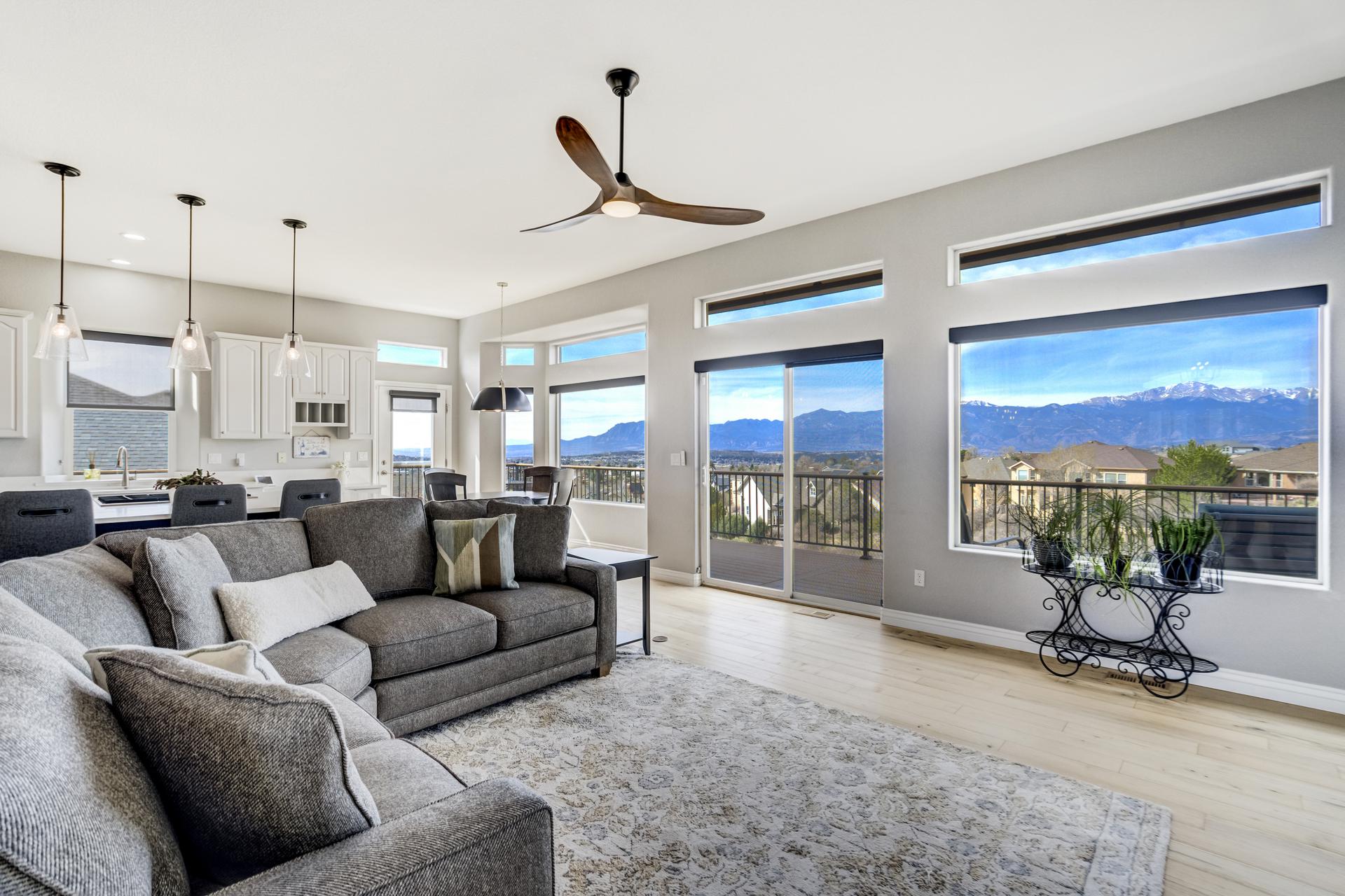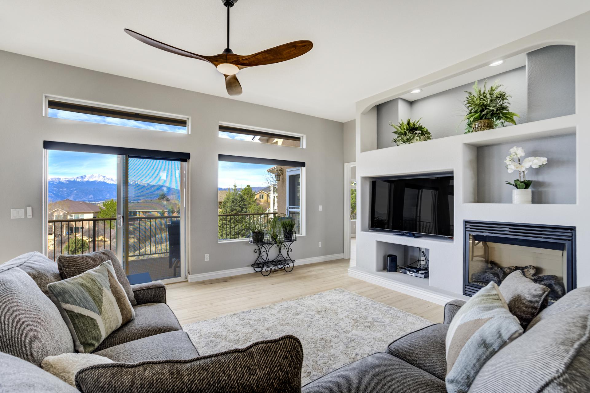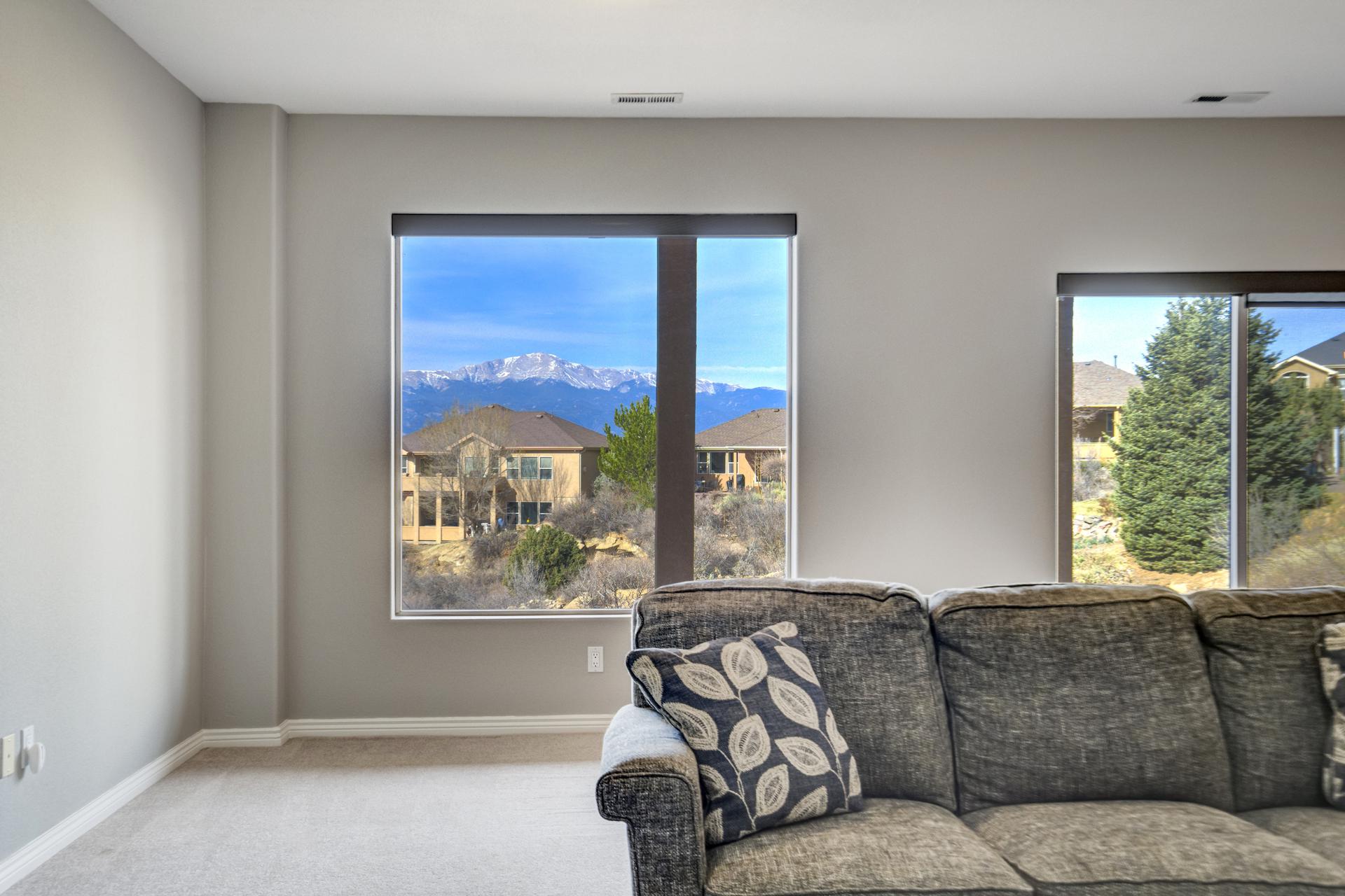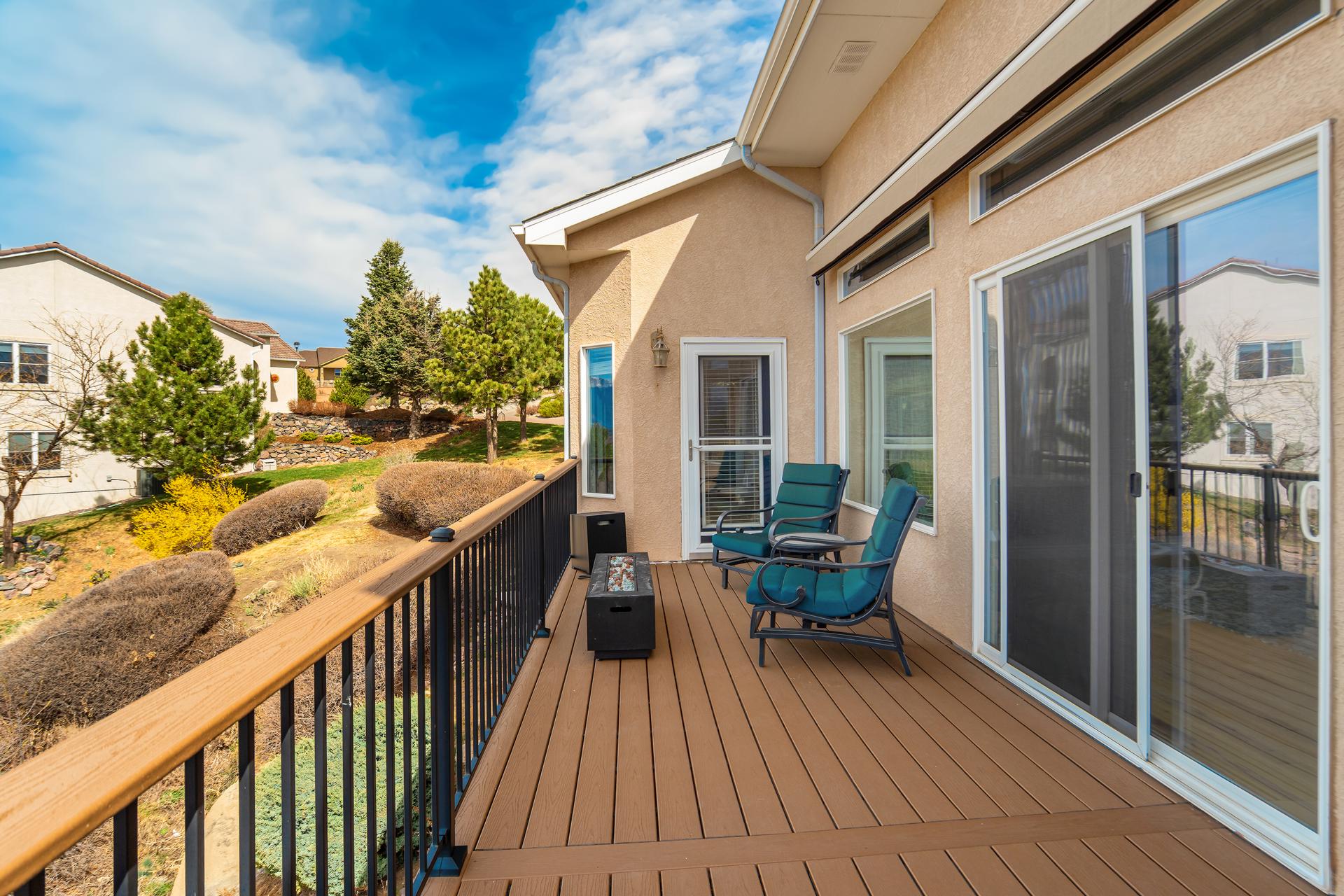 Experience the peak of Colorado living in this stunning residence, where architectural elegance meets unobstructed views of Pikes Peak and the Front Range. The double-door entry opens to a light-filled main level featuring expansive windows and a living room centered around a gas-log fireplace with a custom built-in entertainment center. The gourmet kitchen is a chef’s dream, boasting quartz countertops, a 6-burner gas range, a large pantry, and a sun-drenched breakfast nook with bay windows. Retreat to the primary suite, a private sanctuary with tray ceilings, deck access, and a spa-like 5-piece bath featuring a soaking tub, stone-walled shower, and a walk-through closet with custom shelving and direct laundry access. A versatile second bedroom or office and a 3/4 bath complete the main level. The fully finished walkout basement is designed for entertainment, offering a massive family room with a second fireplace, recessed lighting, and ample space for game tables. Two additional basement bedrooms and a full bath provide plenty of space for guests. Outside, the long, wrap-around Trex deck and lower-level patio capitalize on the breathtaking mountain views and overlook peaceful open space. This home is complete with a 3-car tandem garage and a dedicated storage and utility area. Every detail of this property has been curated to highlight the picturesque Western landscape, offering a sophisticated lifestyle in a premier setting.