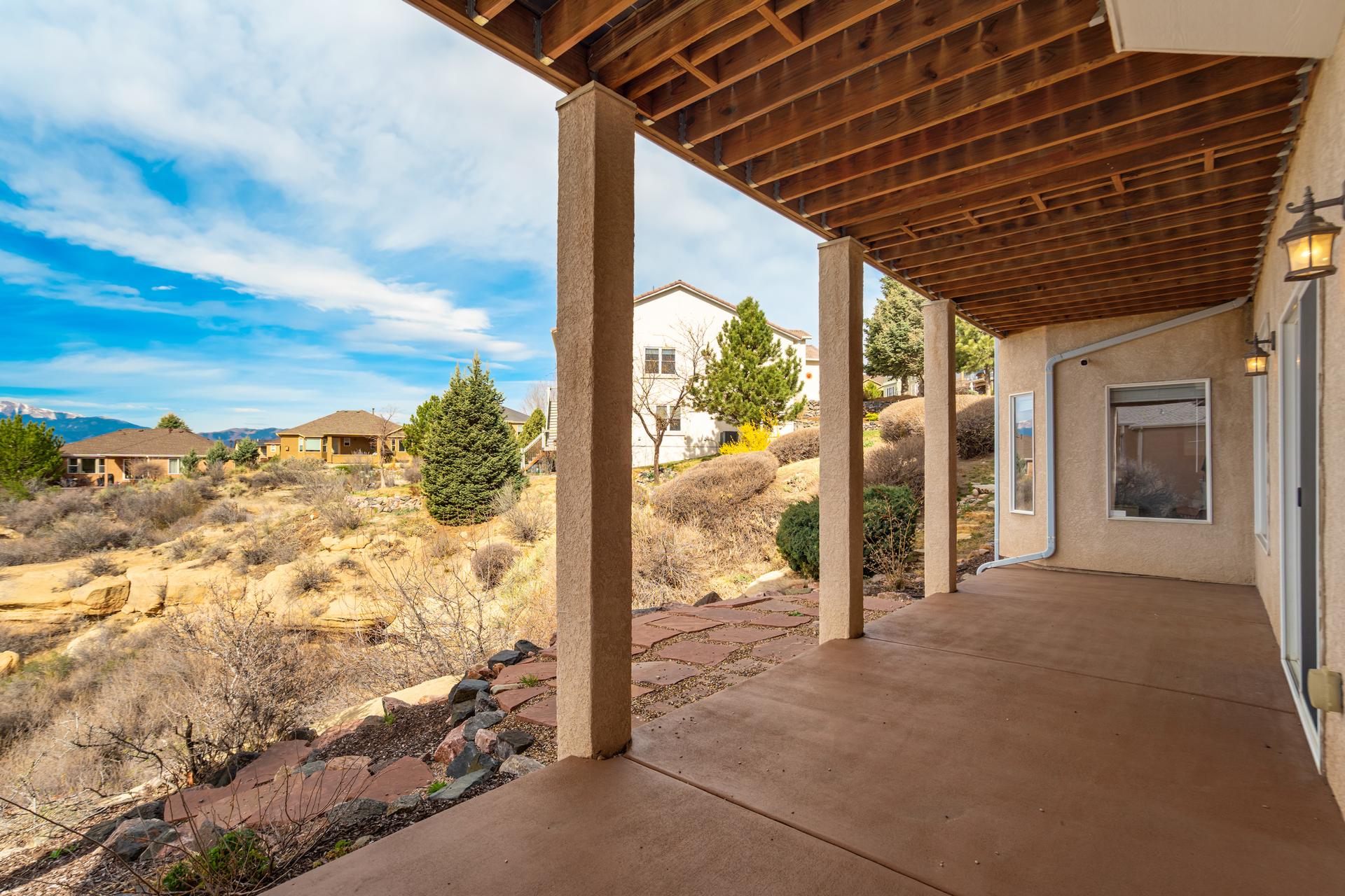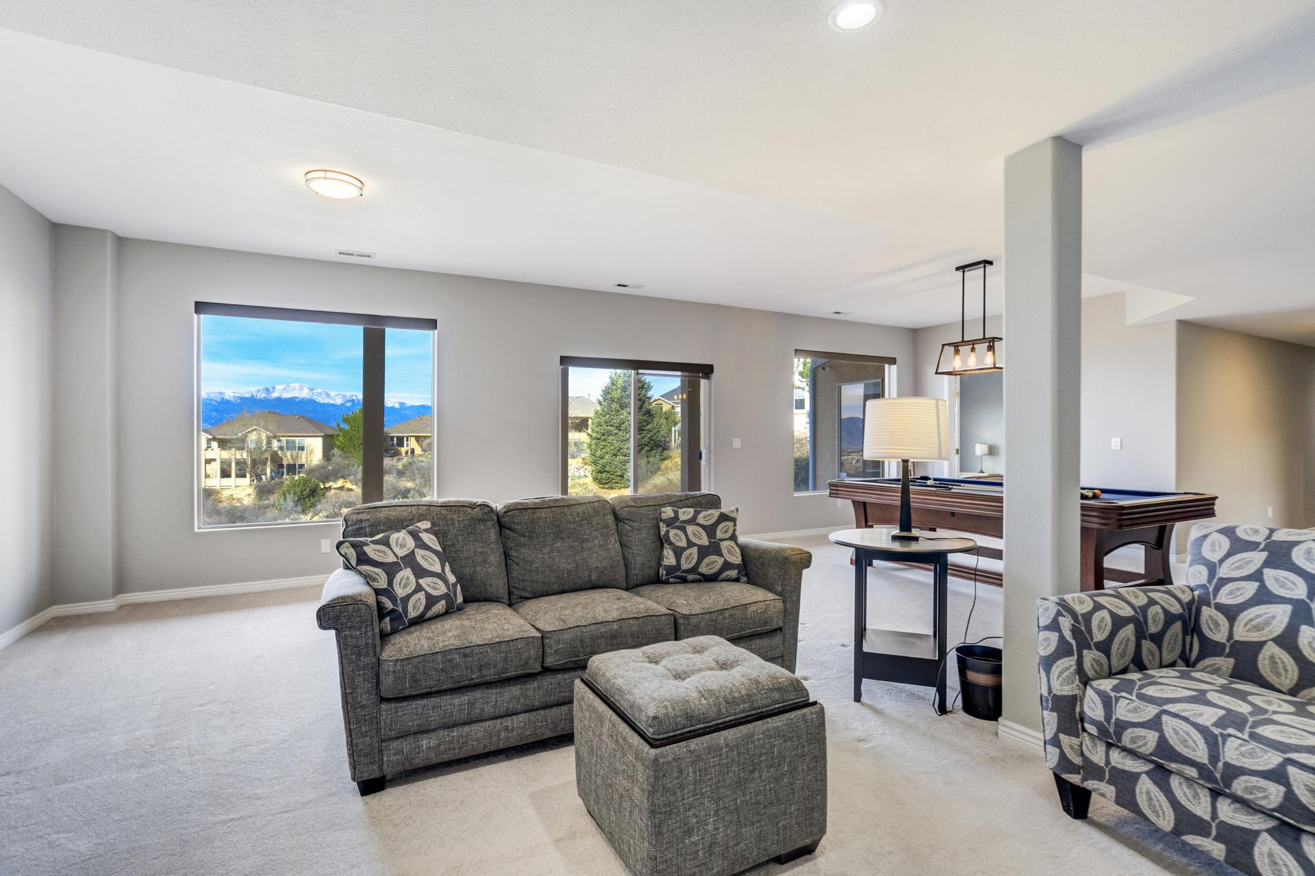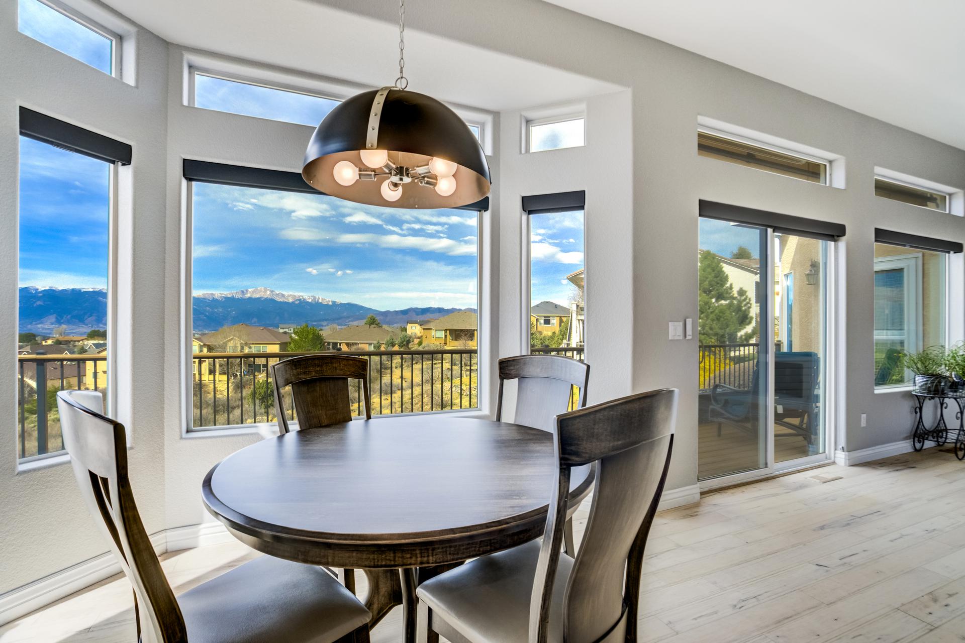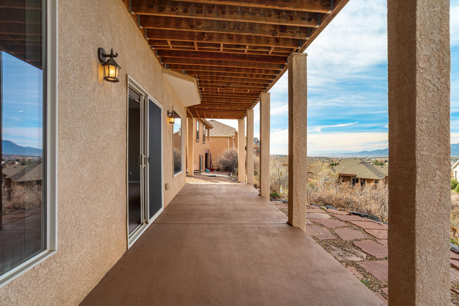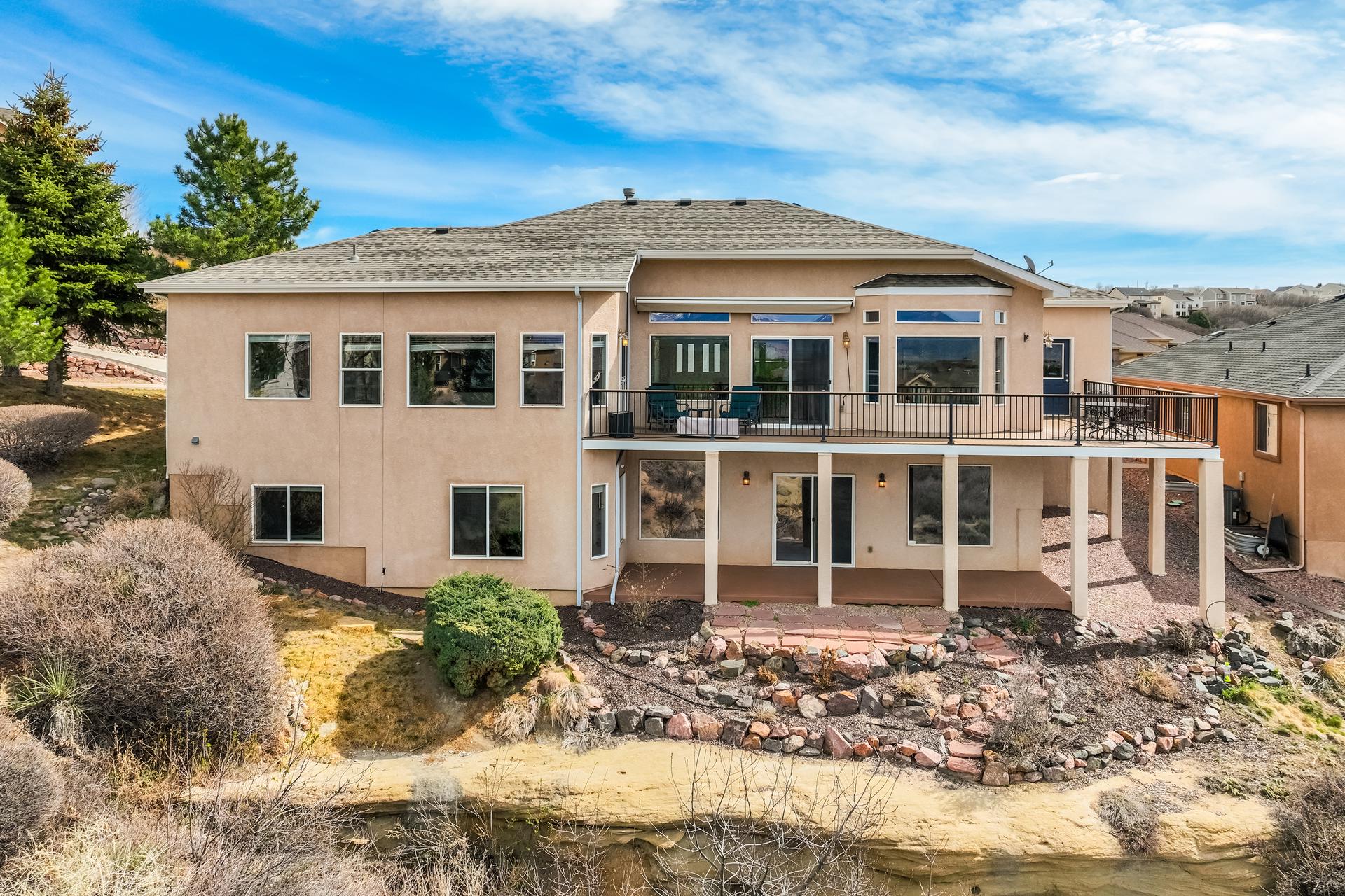 Experience the peak of Colorado living in this stunning residence, where architectural elegance meets unobstructed views of Pikes Peak and the Front Range. The double-door entry opens to a light-filled main level featuring expansive windows and a living room centered around a gas-log fireplace with a custom built-in entertainment center. The gourmet kitchen is a chef’s dream, boasting quartz countertops, a 6-burner gas range, a large pantry, and a sun-drenched breakfast nook with bay windows. Retreat to the primary suite, a private sanctuary with tray ceilings, deck access, and a spa-like 5-piece bath featuring a soaking tub, stone-walled shower, and a walk-through closet with custom shelving and direct laundry access. A versatile second bedroom or office and a 3/4 bath complete the main level. The fully finished walkout basement is designed for entertainment, offering a massive family room with a second fireplace, recessed lighting, and ample space for game tables. Two additional basement bedrooms and a full bath provide plenty of space for guests. Outside, the long, wrap-around Trex deck and lower-level patio capitalize on the breathtaking mountain views and overlook peaceful open space. This home is complete with a 3-car tandem garage and a dedicated storage and utility area. Every detail of this property has been curated to highlight the picturesque Western landscape, offering a sophisticated lifestyle in a premier setting.