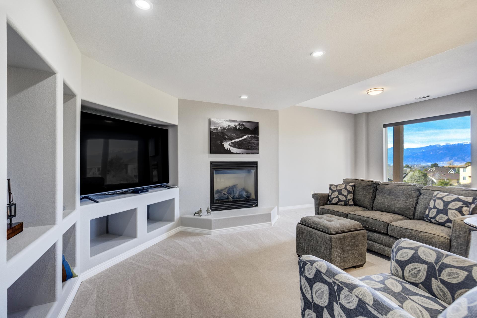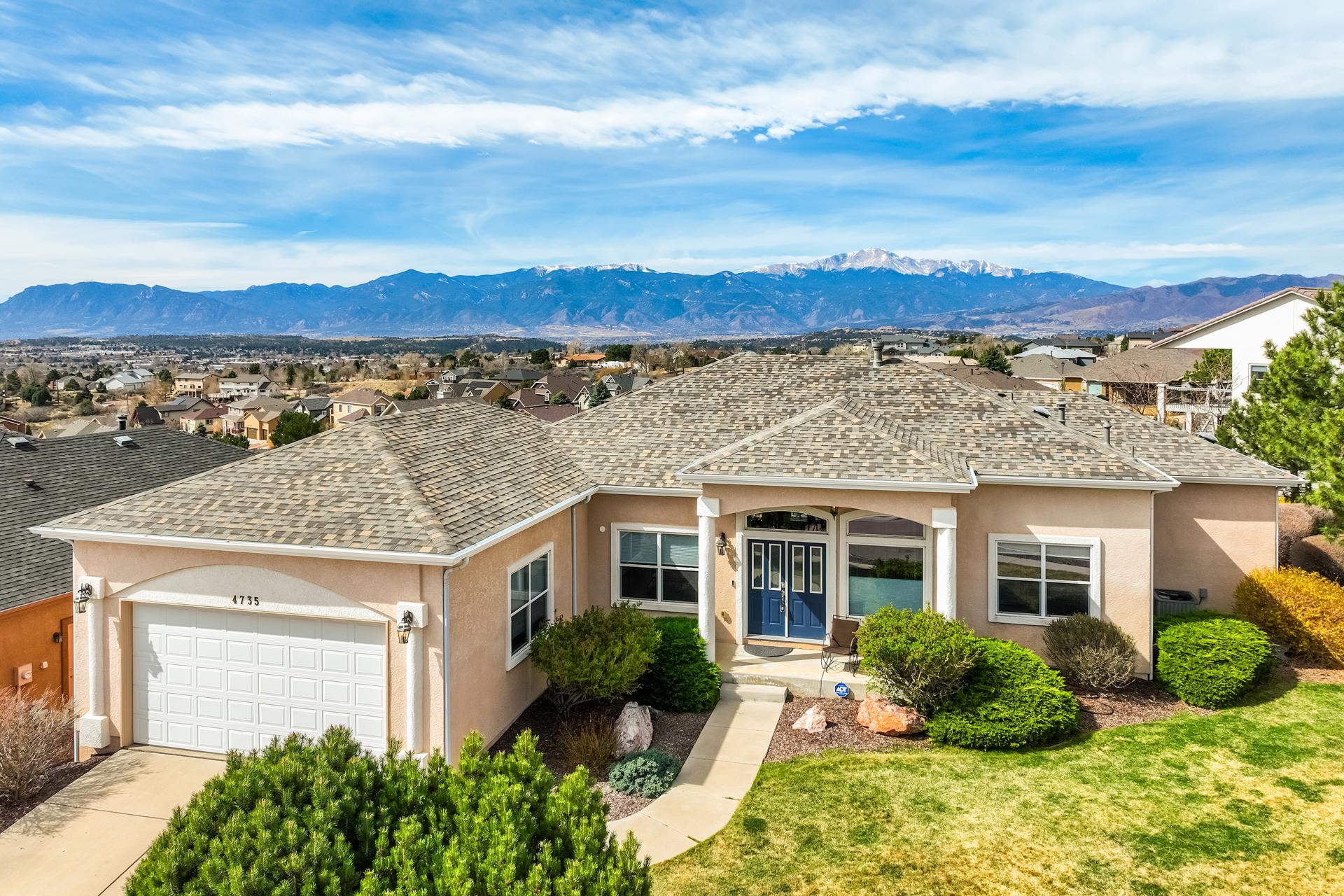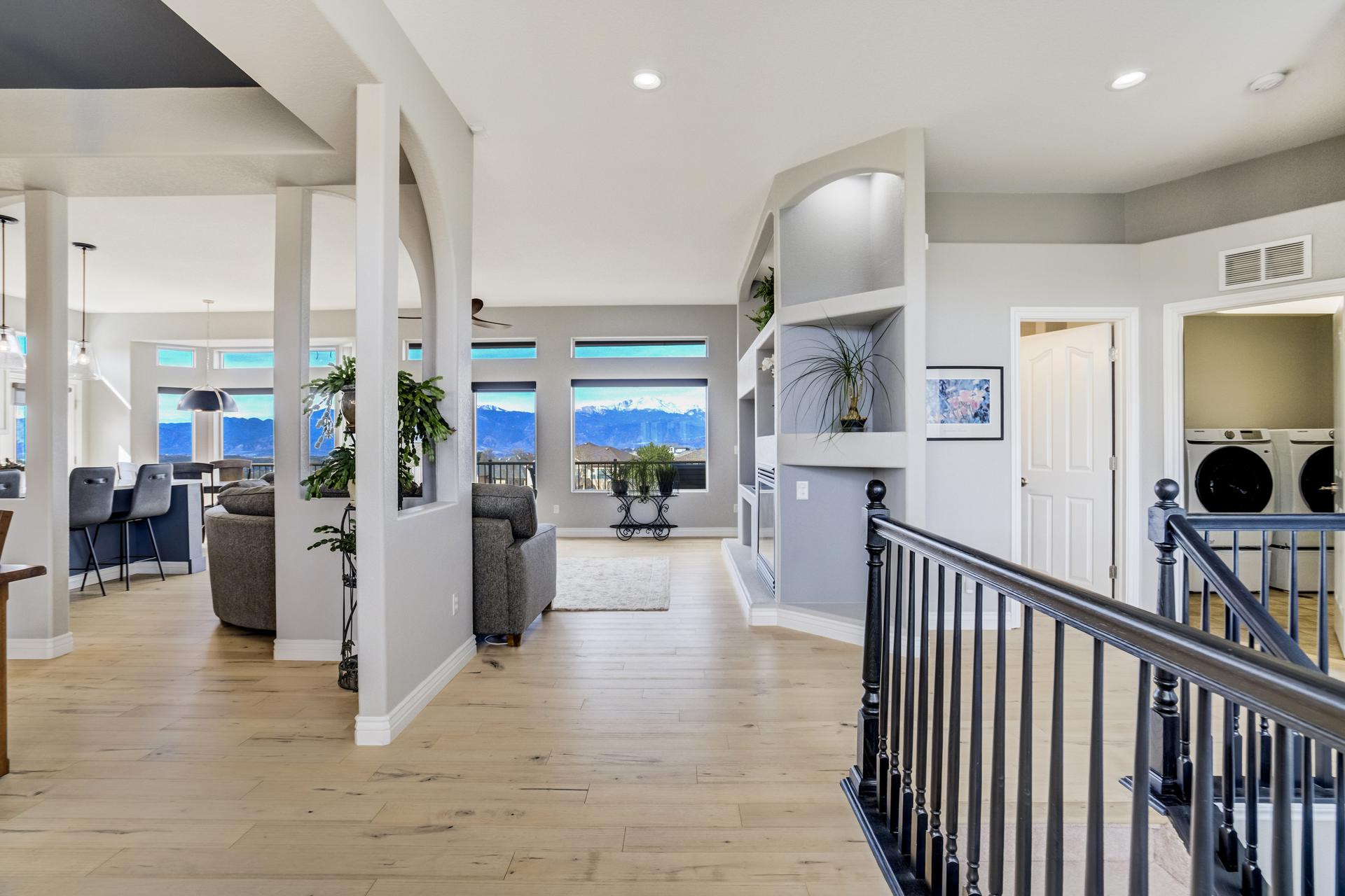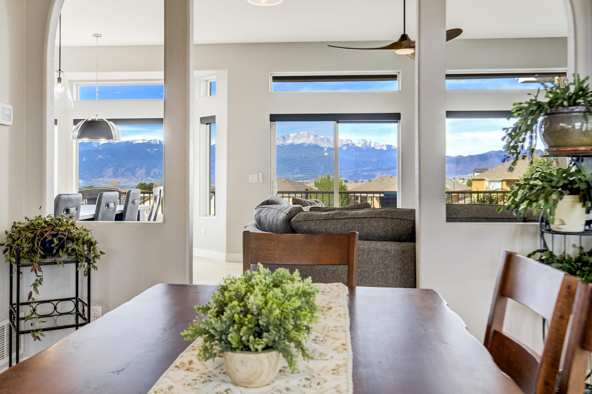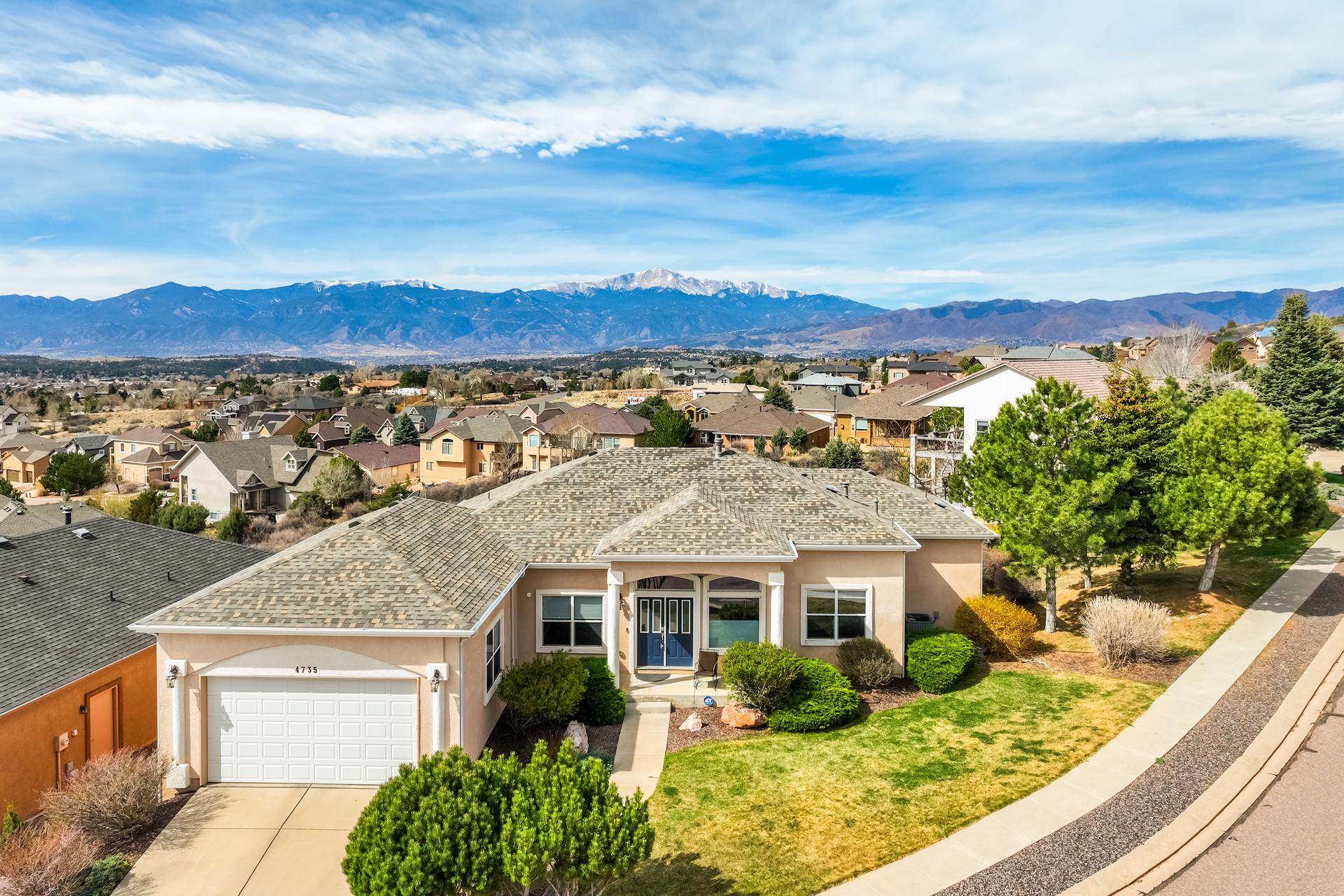 Experience the peak of Colorado living in this stunning residence, where architectural elegance meets unobstructed views of Pikes Peak and the Front Range. The double-door entry opens to a light-filled main level featuring expansive windows and a living room centered around a gas-log fireplace with a custom built-in entertainment center. The gourmet kitchen is a chef’s dream, boasting quartz countertops, a 6-burner gas range, a large pantry, and a sun-drenched breakfast nook with bay windows. Retreat to the primary suite, a private sanctuary with tray ceilings, deck access, and a spa-like 5-piece bath featuring a soaking tub, stone-walled shower, and a walk-through closet with custom shelving and direct laundry access. A versatile second bedroom or office and a 3/4 bath complete the main level. The fully finished walkout basement is designed for entertainment, offering a massive family room with a second fireplace, recessed lighting, and ample space for game tables. Two additional basement bedrooms and a full bath provide plenty of space for guests. Outside, the long, wrap-around Trex deck and lower-level patio capitalize on the breathtaking mountain views and overlook peaceful open space. This home is complete with a 3-car tandem garage and a dedicated storage and utility area. Every detail of this property has been curated to highlight the picturesque Western landscape, offering a sophisticated lifestyle in a premier setting.