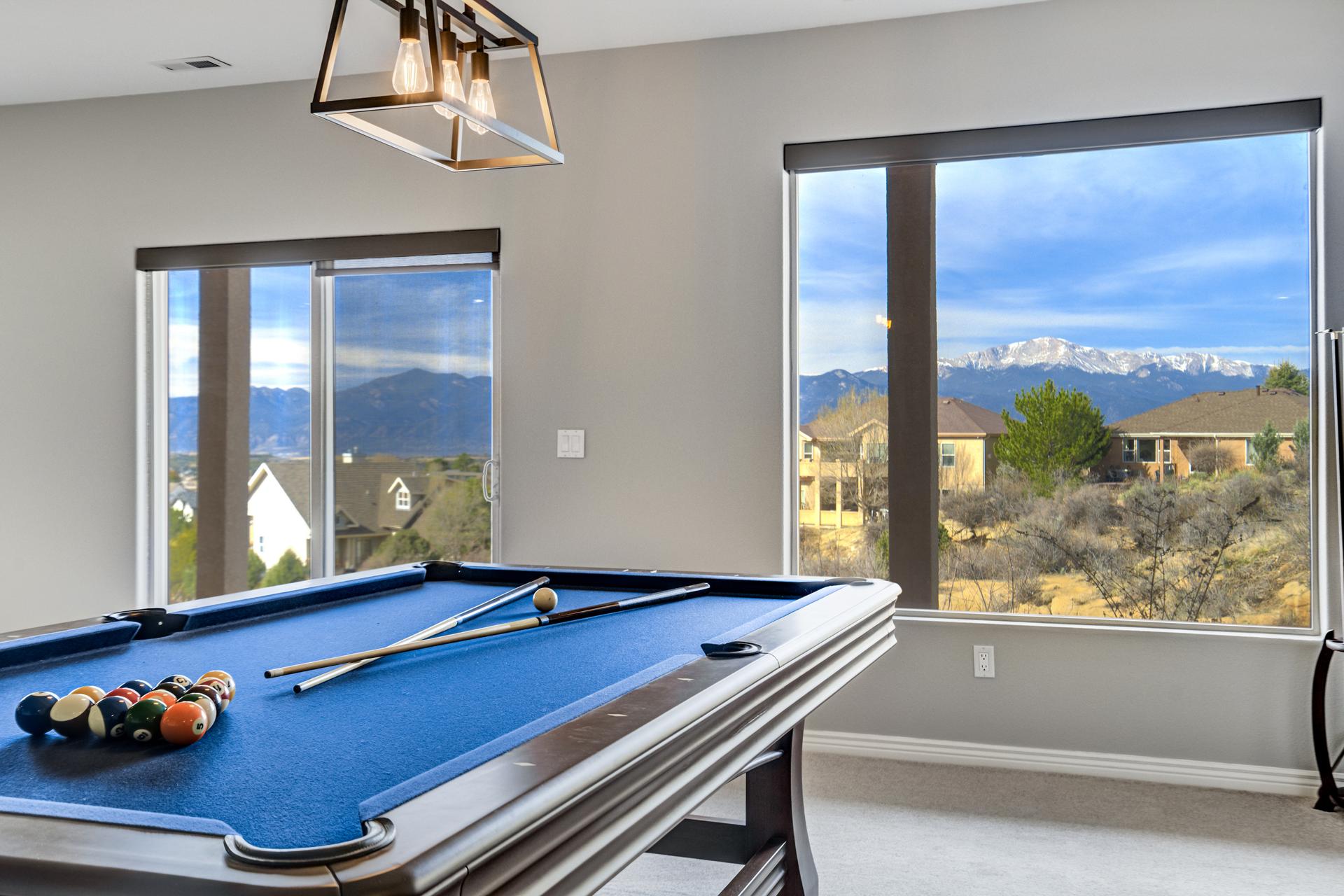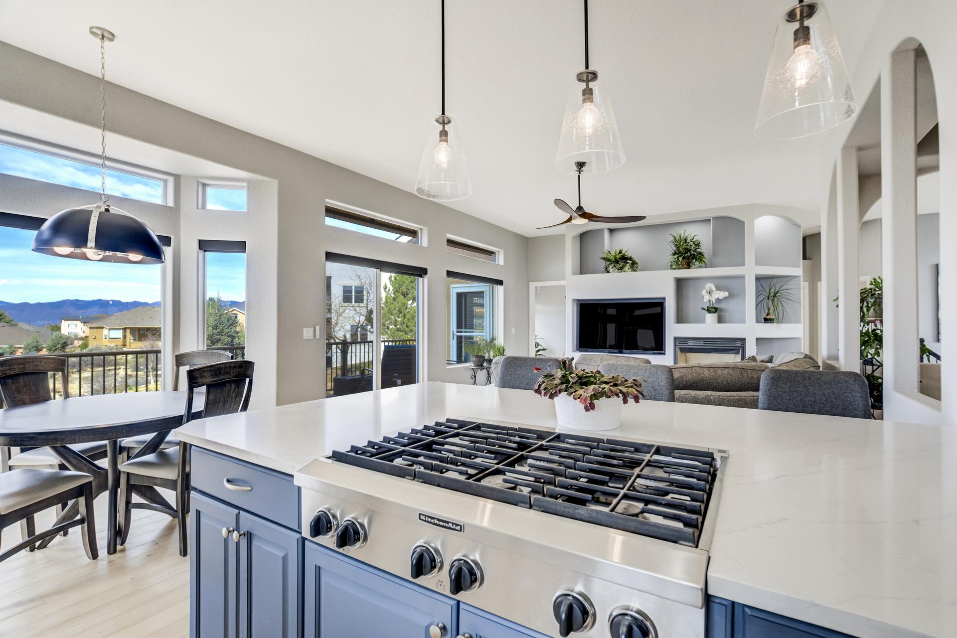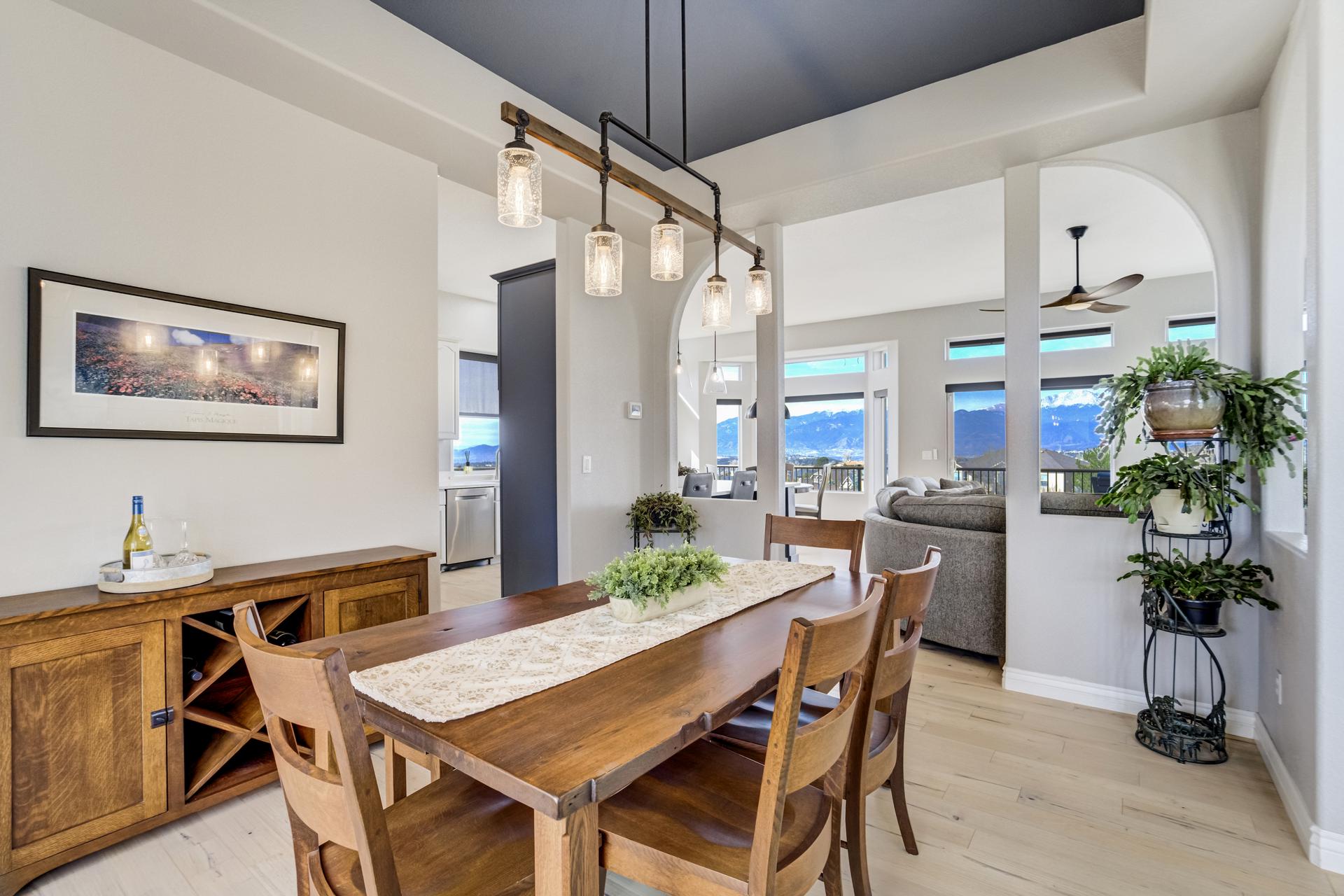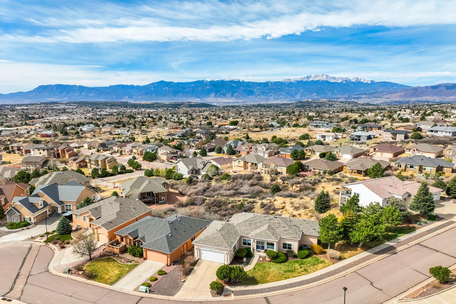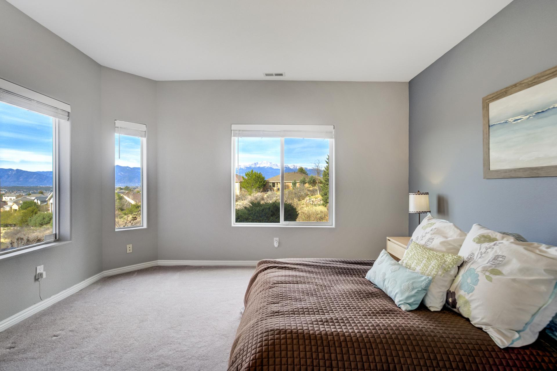 Experience the peak of Colorado living in this stunning residence, where architectural elegance meets unobstructed views of Pikes Peak and the Front Range. The double-door entry opens to a light-filled main level featuring expansive windows and a living room centered around a gas-log fireplace with a custom built-in entertainment center. The gourmet kitchen is a chef’s dream, boasting quartz countertops, a 6-burner gas range, a large pantry, and a sun-drenched breakfast nook with bay windows. Retreat to the primary suite, a private sanctuary with tray ceilings, deck access, and a spa-like 5-piece bath featuring a soaking tub, stone-walled shower, and a walk-through closet with custom shelving and direct laundry access. A versatile second bedroom or office and a 3/4 bath complete the main level. The fully finished walkout basement is designed for entertainment, offering a massive family room with a second fireplace, recessed lighting, and ample space for game tables. Two additional basement bedrooms and a full bath provide plenty of space for guests. Outside, the long, wrap-around Trex deck and lower-level patio capitalize on the breathtaking mountain views and overlook peaceful open space. This home is complete with a 3-car tandem garage and a dedicated storage and utility area. Every detail of this property has been curated to highlight the picturesque Western landscape, offering a sophisticated lifestyle in a premier setting.