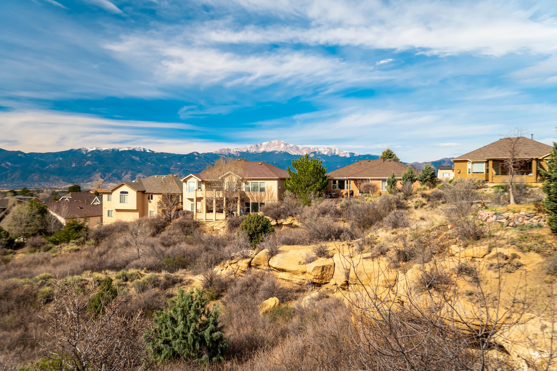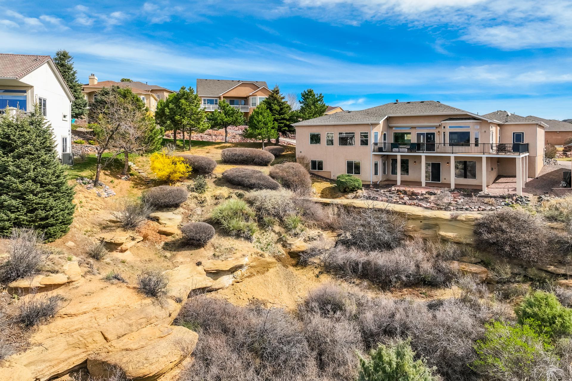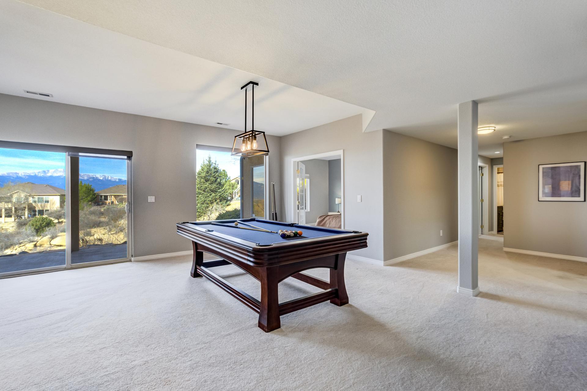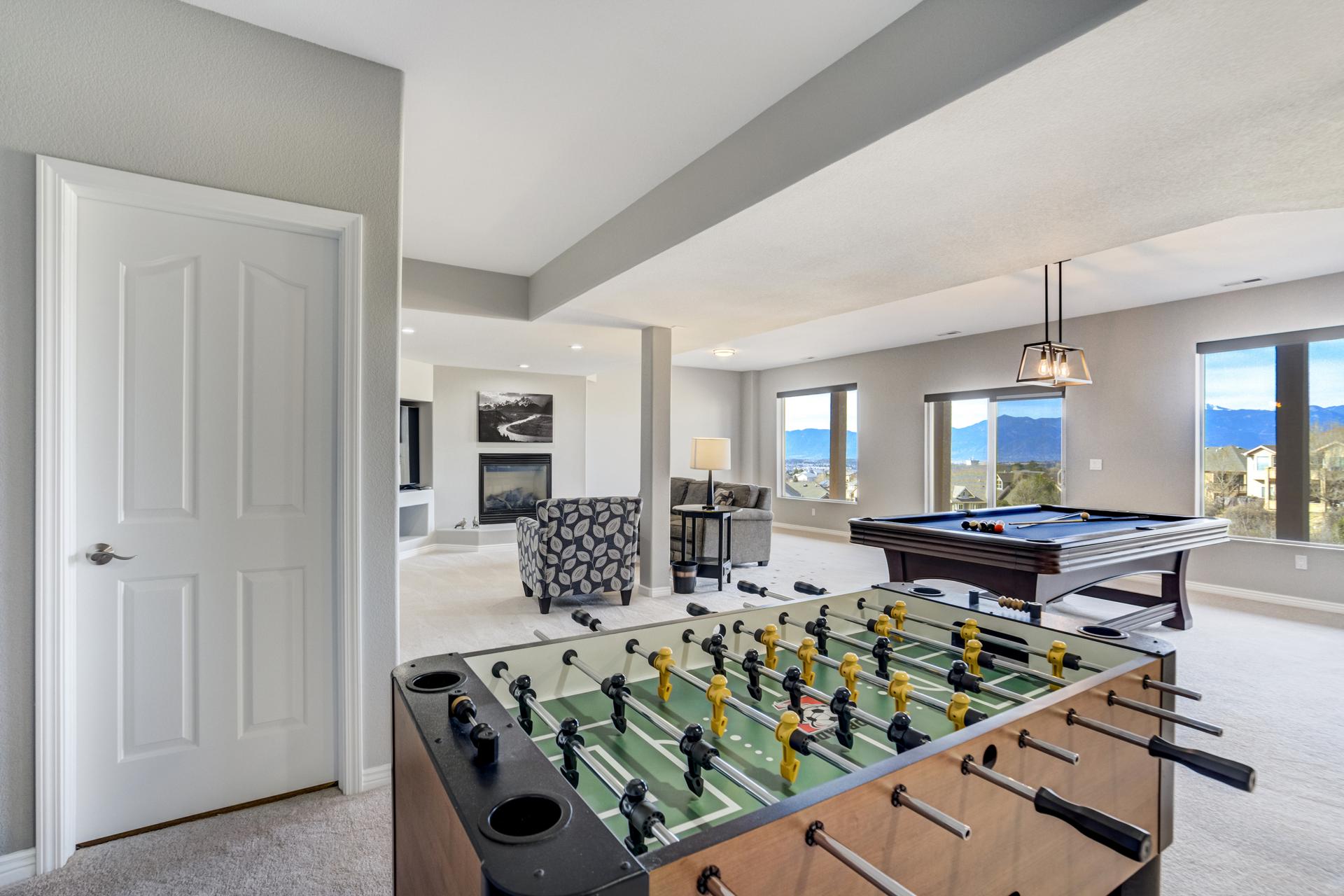 Experience the peak of Colorado living in this stunning residence, where architectural elegance meets unobstructed views of Pikes Peak and the Front Range. The double-door entry opens to a light-filled main level featuring expansive windows and a living room centered around a gas-log fireplace with a custom built-in entertainment center. The gourmet kitchen is a chef’s dream, boasting quartz countertops, a 6-burner gas range, a large pantry, and a sun-drenched breakfast nook with bay windows. Retreat to the primary suite, a private sanctuary with tray ceilings, deck access, and a spa-like 5-piece bath featuring a soaking tub, stone-walled shower, and a walk-through closet with custom shelving and direct laundry access. A versatile second bedroom or office and a 3/4 bath complete the main level. The fully finished walkout basement is designed for entertainment, offering a massive family room with a second fireplace, recessed lighting, and ample space for game tables. Two additional basement bedrooms and a full bath provide plenty of space for guests. Outside, the long, wrap-around Trex deck and lower-level patio capitalize on the breathtaking mountain views and overlook peaceful open space. This home is complete with a 3-car tandem garage and a dedicated storage and utility area. Every detail of this property has been curated to highlight the picturesque Western landscape, offering a sophisticated lifestyle in a premier setting.