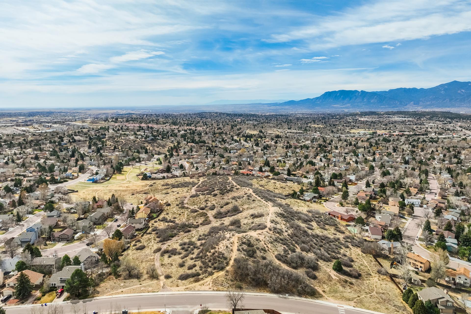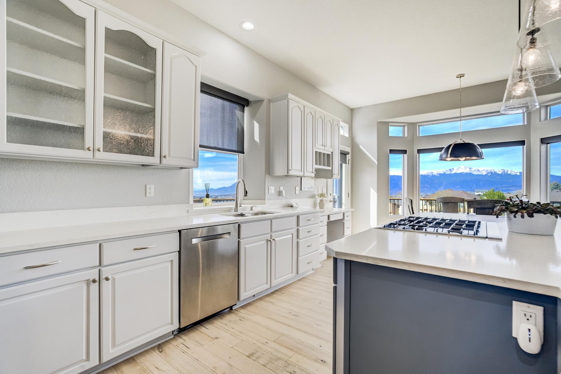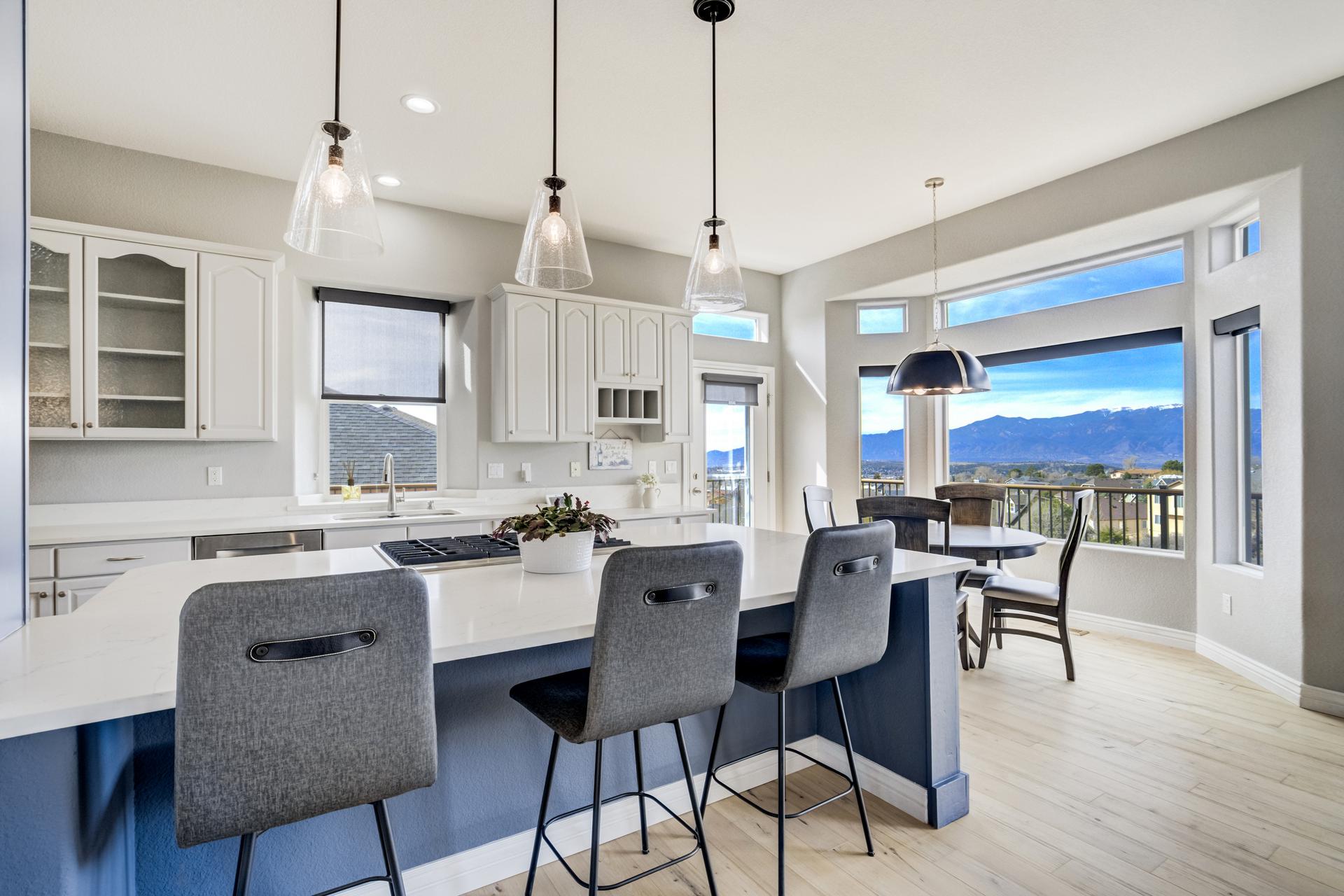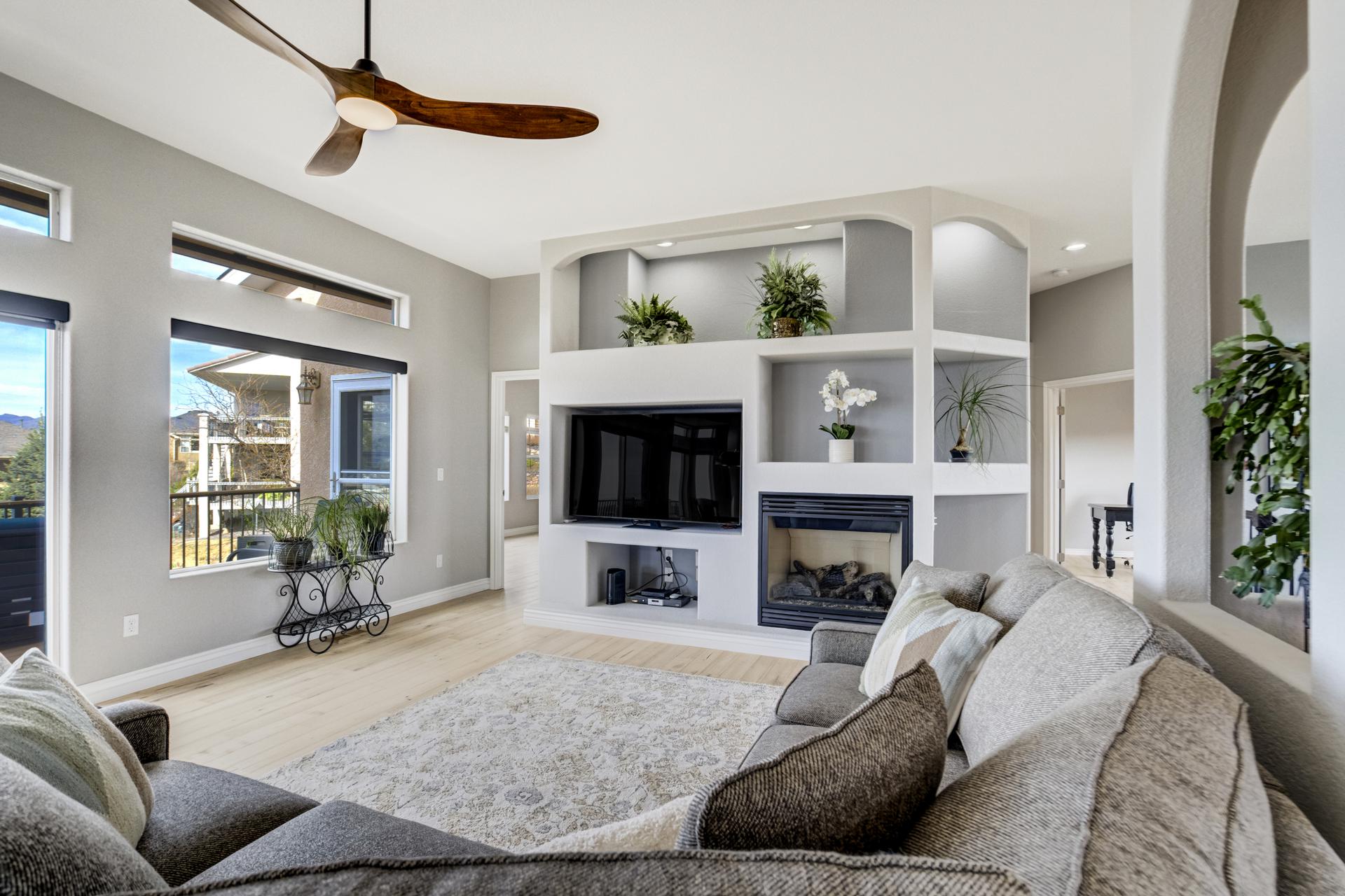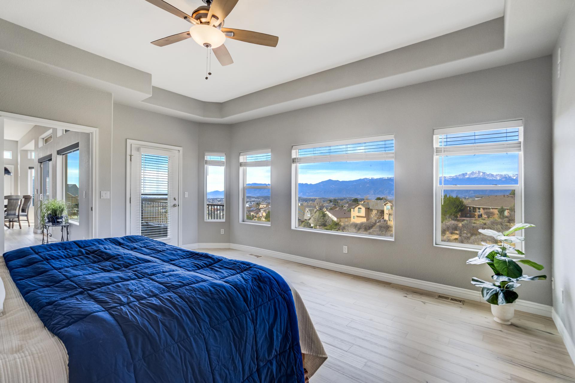 Experience the peak of Colorado living in this stunning residence, where architectural elegance meets unobstructed views of Pikes Peak and the Front Range. The double-door entry opens to a light-filled main level featuring expansive windows and a living room centered around a gas-log fireplace with a custom built-in entertainment center. The gourmet kitchen is a chef’s dream, boasting quartz countertops, a 6-burner gas range, a large pantry, and a sun-drenched breakfast nook with bay windows. Retreat to the primary suite, a private sanctuary with tray ceilings, deck access, and a spa-like 5-piece bath featuring a soaking tub, stone-walled shower, and a walk-through closet with custom shelving and direct laundry access. A versatile second bedroom or office and a 3/4 bath complete the main level. The fully finished walkout basement is designed for entertainment, offering a massive family room with a second fireplace, recessed lighting, and ample space for game tables. Two additional basement bedrooms and a full bath provide plenty of space for guests. Outside, the long, wrap-around Trex deck and lower-level patio capitalize on the breathtaking mountain views and overlook peaceful open space. This home is complete with a 3-car tandem garage and a dedicated storage and utility area. Every detail of this property has been curated to highlight the picturesque Western landscape, offering a sophisticated lifestyle in a premier setting.