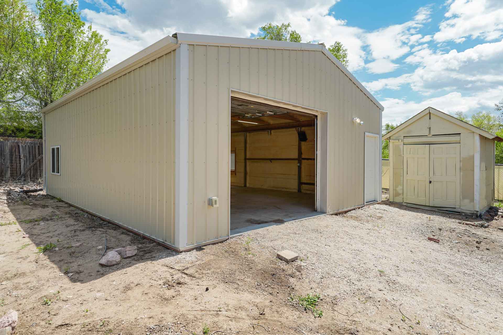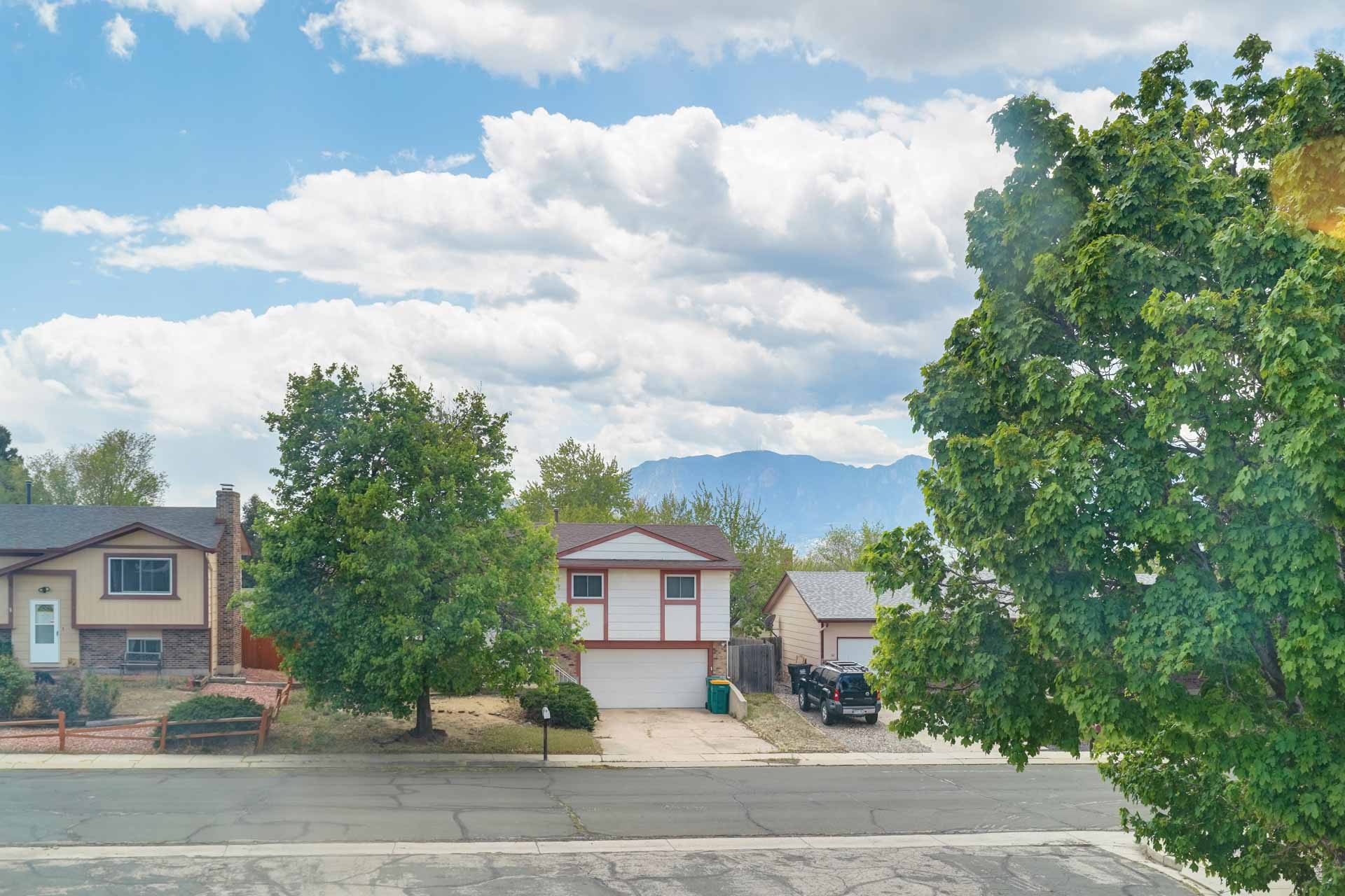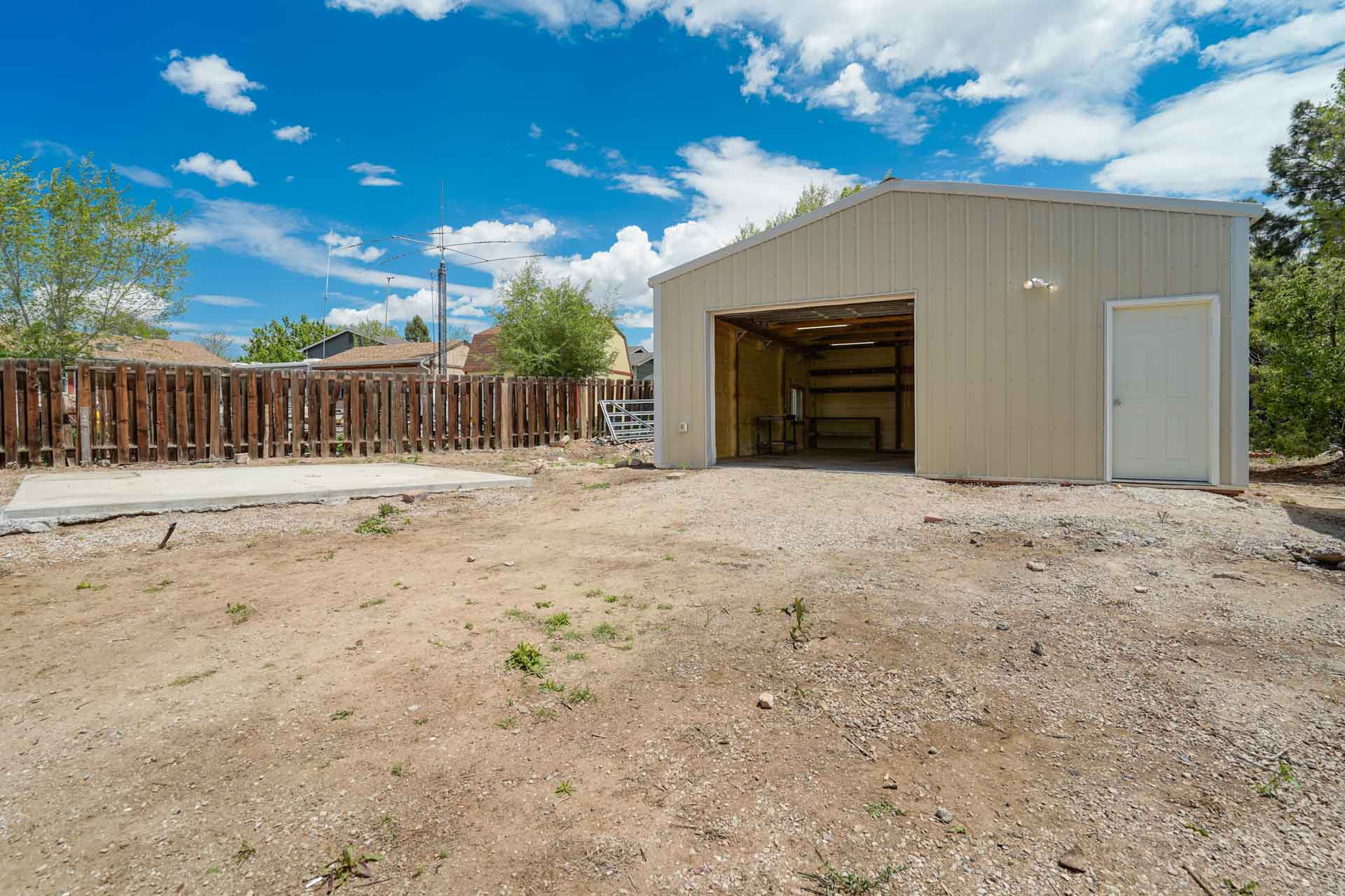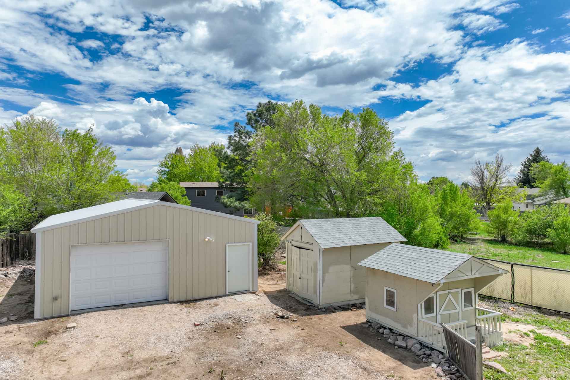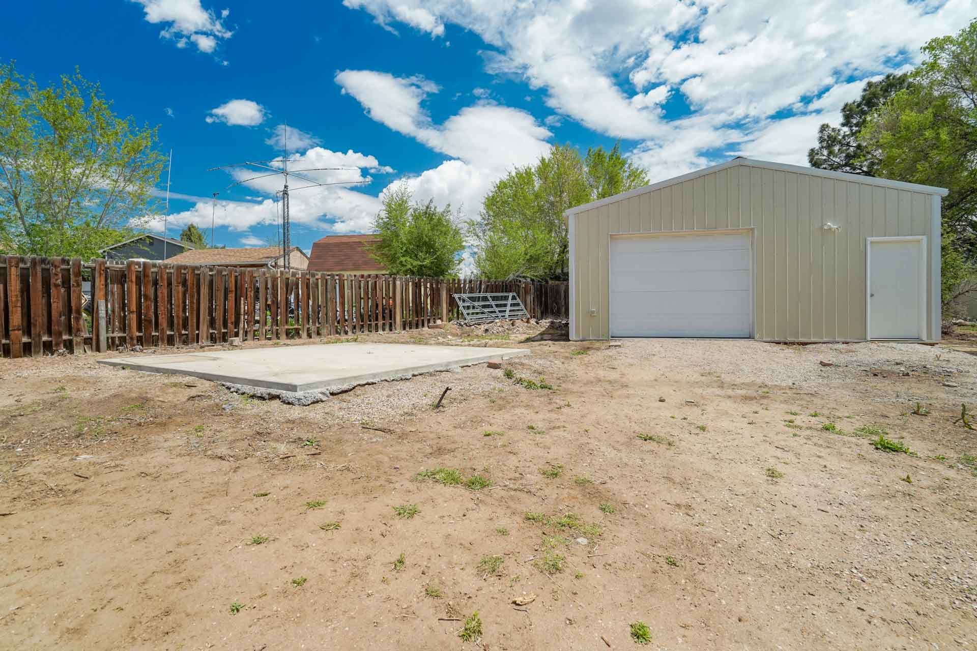 Huge backyard on this 10,000 sq.ft. lot with a drive-through side gate. Great for a car enthusiast, featuring a 2-Car Attached Garage (23x19.5 ft) with garage door opener and access door to backyard. Plus a detached 3+ Car Garage/Shop Building (29.5x23.5 ft.) built in 2018, insulated and includes 220 electric service. Upgraded low-maintenance stucco siding (NEW 2021) and upgraded electrical panel (2018). Fresh interior paint (2024). New carpet on stairs and new interior doors/doorknobs on bedrooms/baths (2024). Wood laminate flooring throughout most of the home. Eat-in Kitchen includes a stainless steel refrigerator, gas range/oven, dishwasher, ceiling fan with lights, wood laminate flooring and an eating nook area, plus door to backyard. The nicely-sized sunken Living Room features a wood-burning stove, wood laminate flooring, faux wood blinds and a large window looking out at the beautiful lilac tree in the front yard. The Powder Room/Laundry Room is light and bright with an updated vanity with composite countertop, a built-in medicine cabinet, and the washer and dryer are included. Upstairs are three bedrooms with laminate flooring and ceiling fans, and a 3/4 Bath featuring a double vanity with updated countertop, walk-in shower with upgraded shower insert and specialized sprayer system, tile flooring and linen shelves behind door. Mountain views from bedrooms 2 and 3! Nice decorative touches include iron railings at the stairs and a tile deco wall in the main level bath. Central Air Conditioning. Great potential for outdoor entertaining with 16x10 concrete and pavestone patio, plus separate 16x16 concrete pad, ideal for future above-ground swimming pool or basketball hoop, etc. Plus exterior gas hookup for grill. Additional features include a Ring doorbell, storage shed, playhouse, and tons of space for gardening and more! Located in a cul-de-sac on a low-traffic street, just one block from Penstemon Park with playground. Great property!