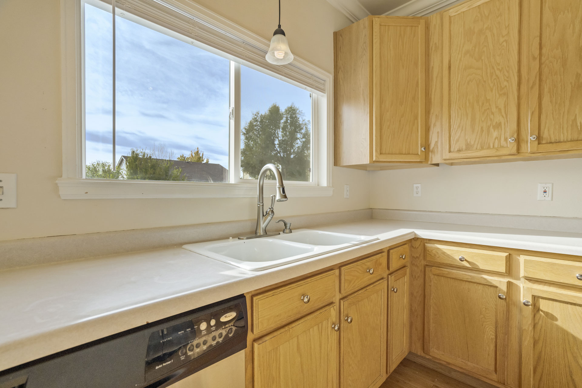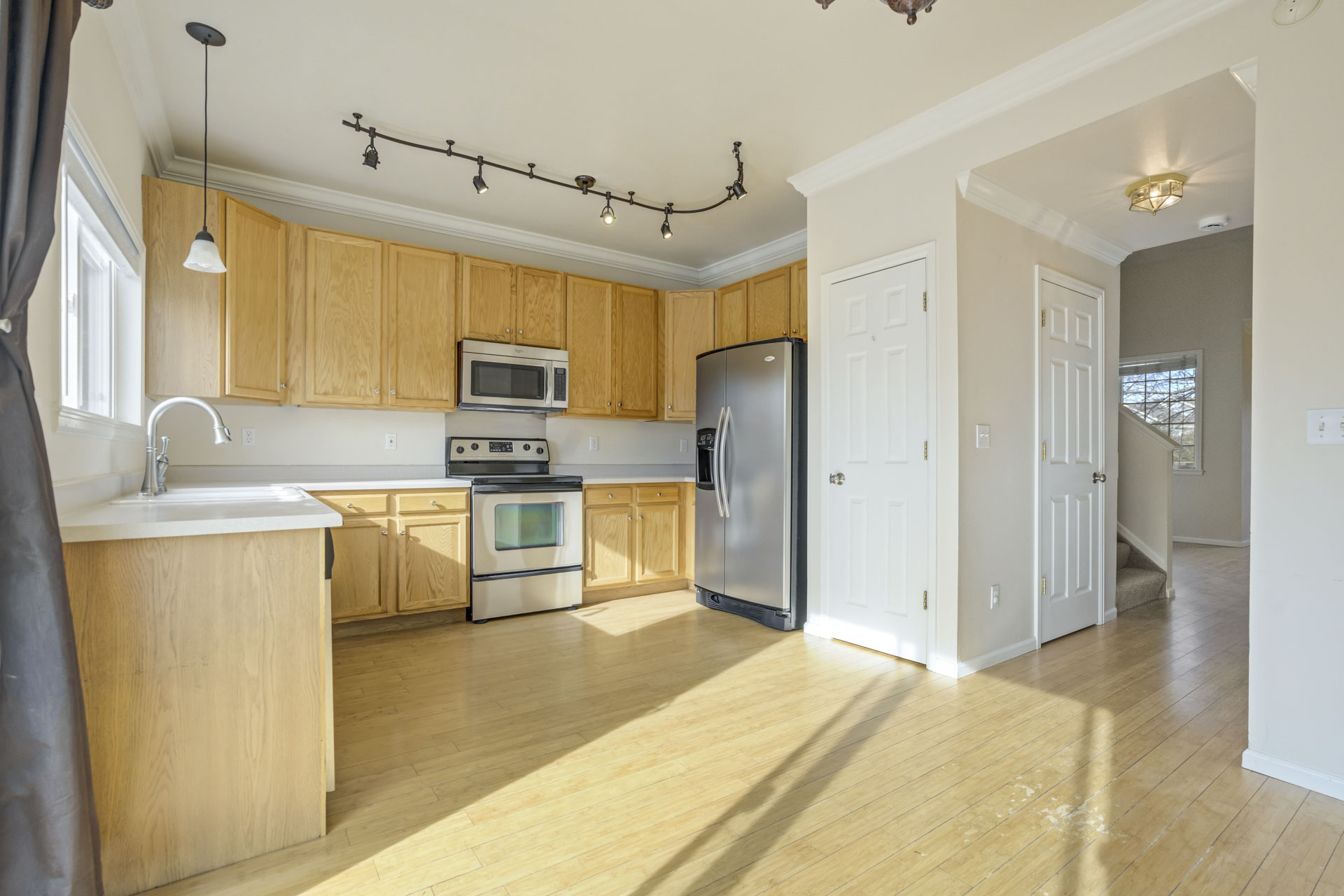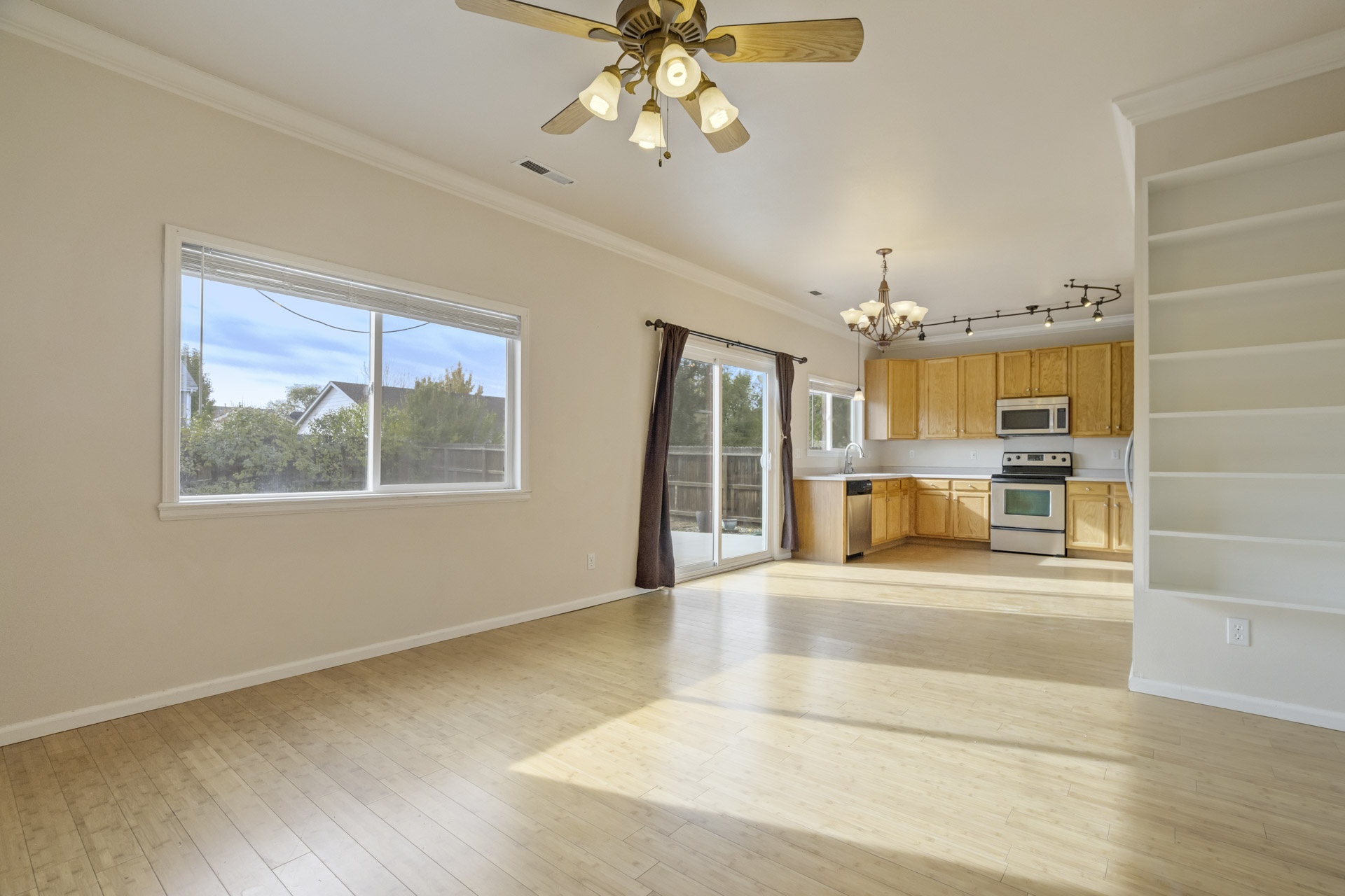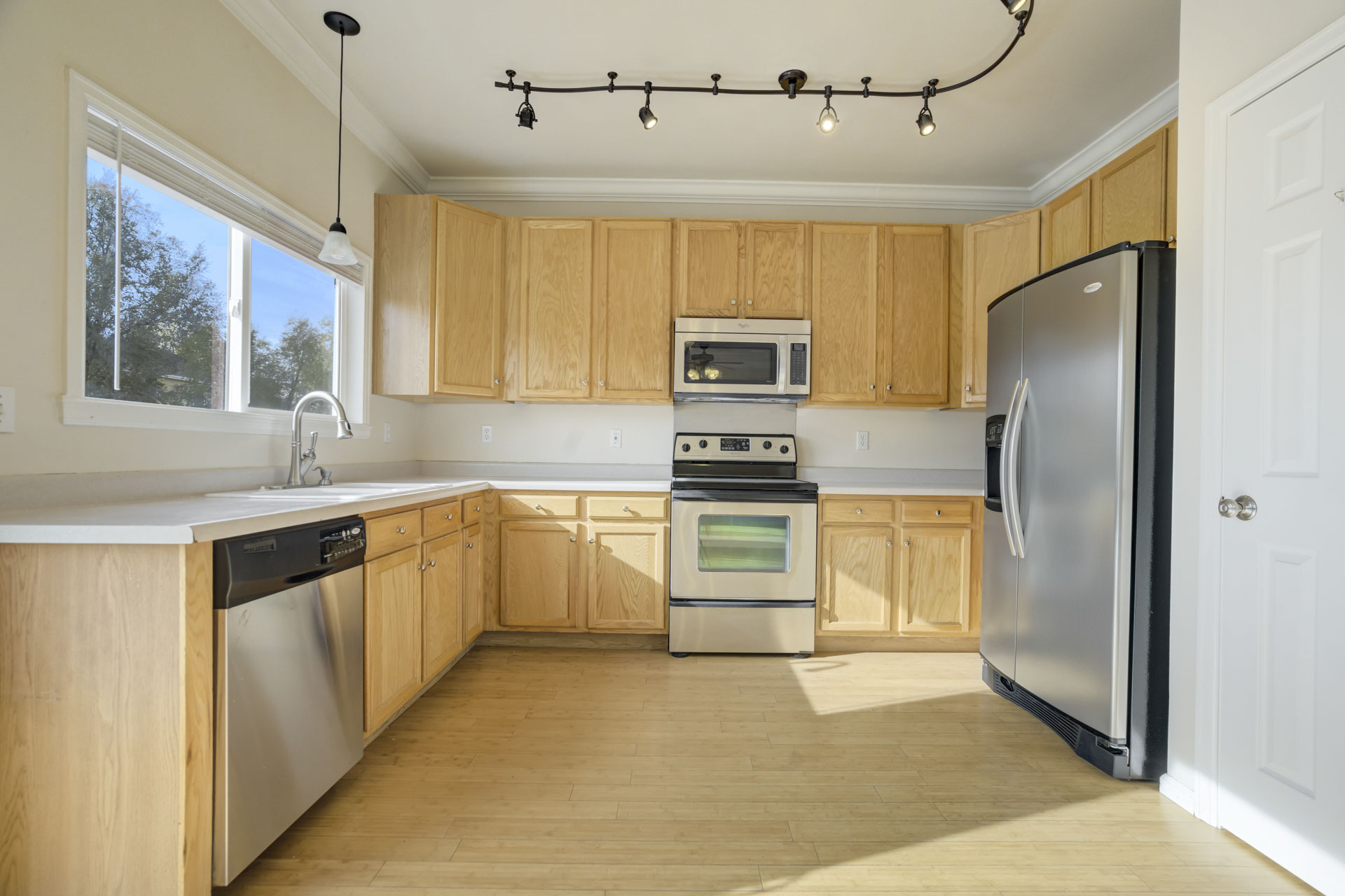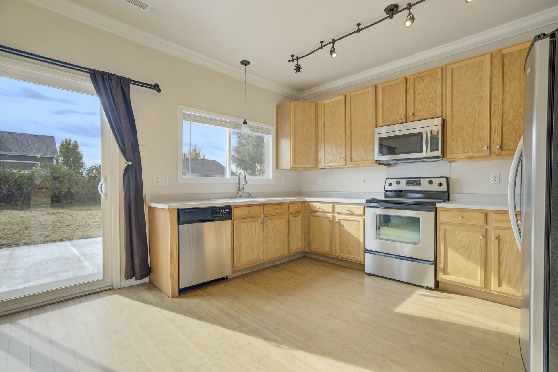 Welcome to this lovely two-story home located in the Villages at Sand Creek a vibrant sub-division in Colorado Springs! This residence is in excellent condition and boasts a beautifully landscaped, fully fenced yard creating an outdoor area perfect for relaxation and entertainment. The main level features beautiful wood laminate flooring and brand-new carpet throughout the home, enhancing the warm and inviting atmosphere throughout the living spaces. The spacious kitchen is equipped with stainless steel appliances, ample cabinetry, and generous counter space, seamlessly opening to the cozy family room, which includes built-in shelving and a charming gas fireplace. Upstairs, you’ll find three well-appointed bedrooms filled with natural light, along with two full bathrooms and a convenient laundry area. Step outside to discover an expansive backyard featuring a sprinkler system and a brand new massive concrete patio providing ideal spaces for outdoor dining and gatherings. The exterior of the home has a nice front porch enhancing its curb appeal, and additional features include central air conditioning for year-round comfort. Located in a wonderful community with easy access to parks, schools, shopping, and dining, this remarkable home combines modern amenities with a charming atmosphere, making it the perfect place to create lasting memories. Schedule your private showing today and experience the lifestyle that awaits you!