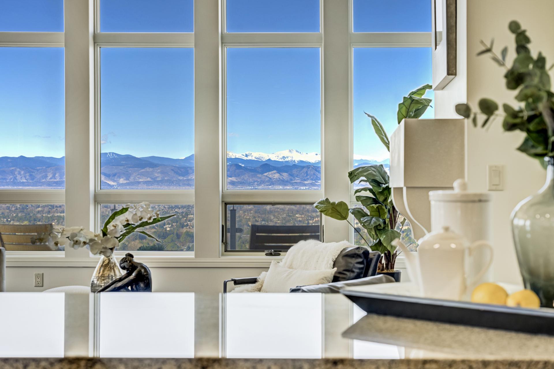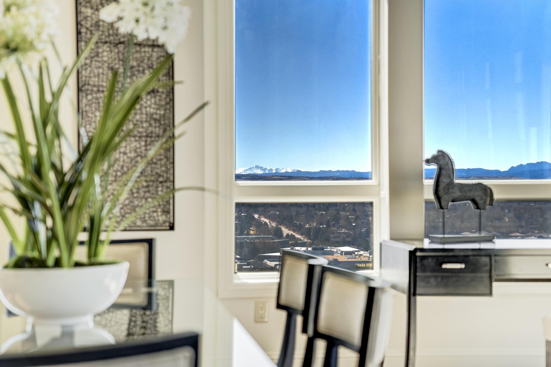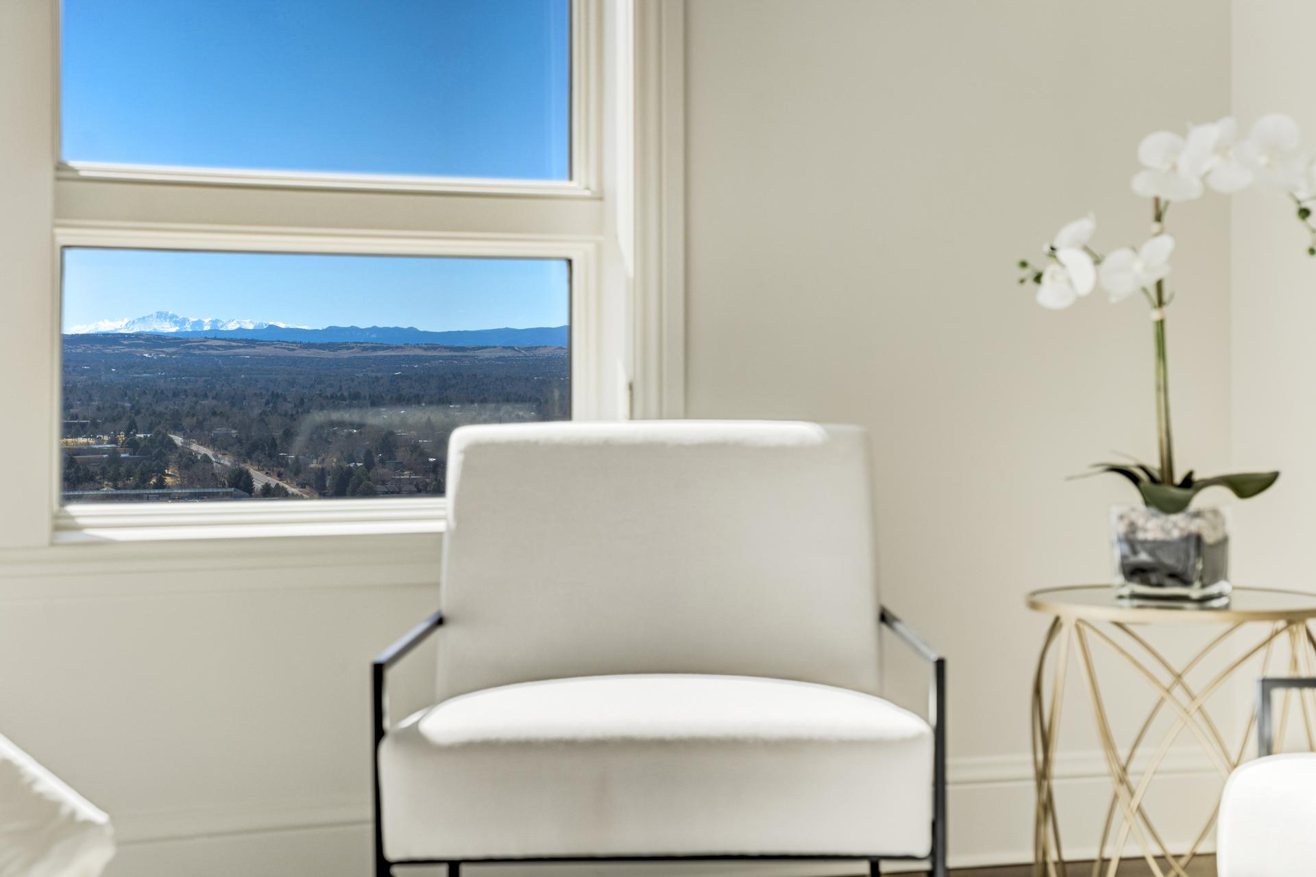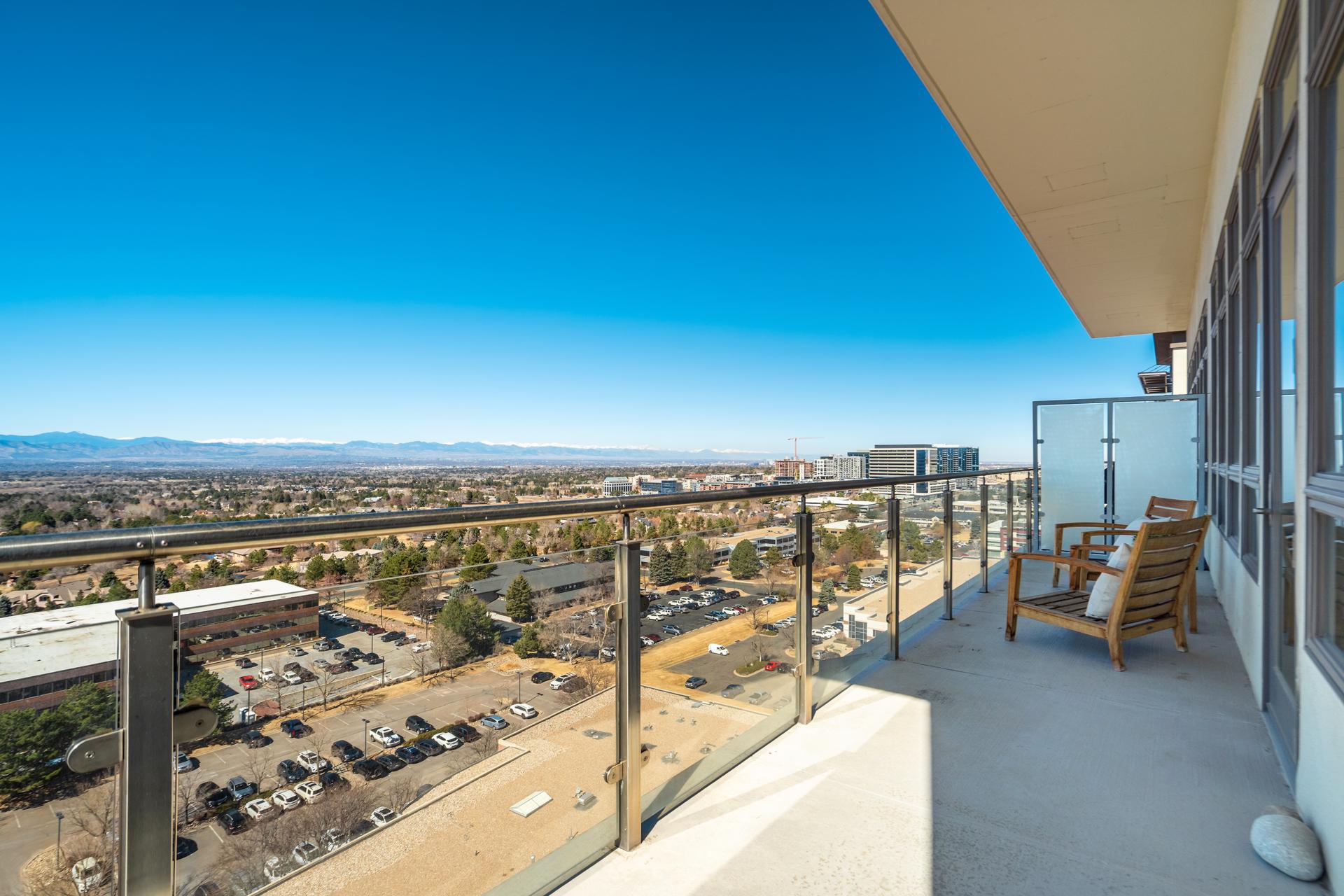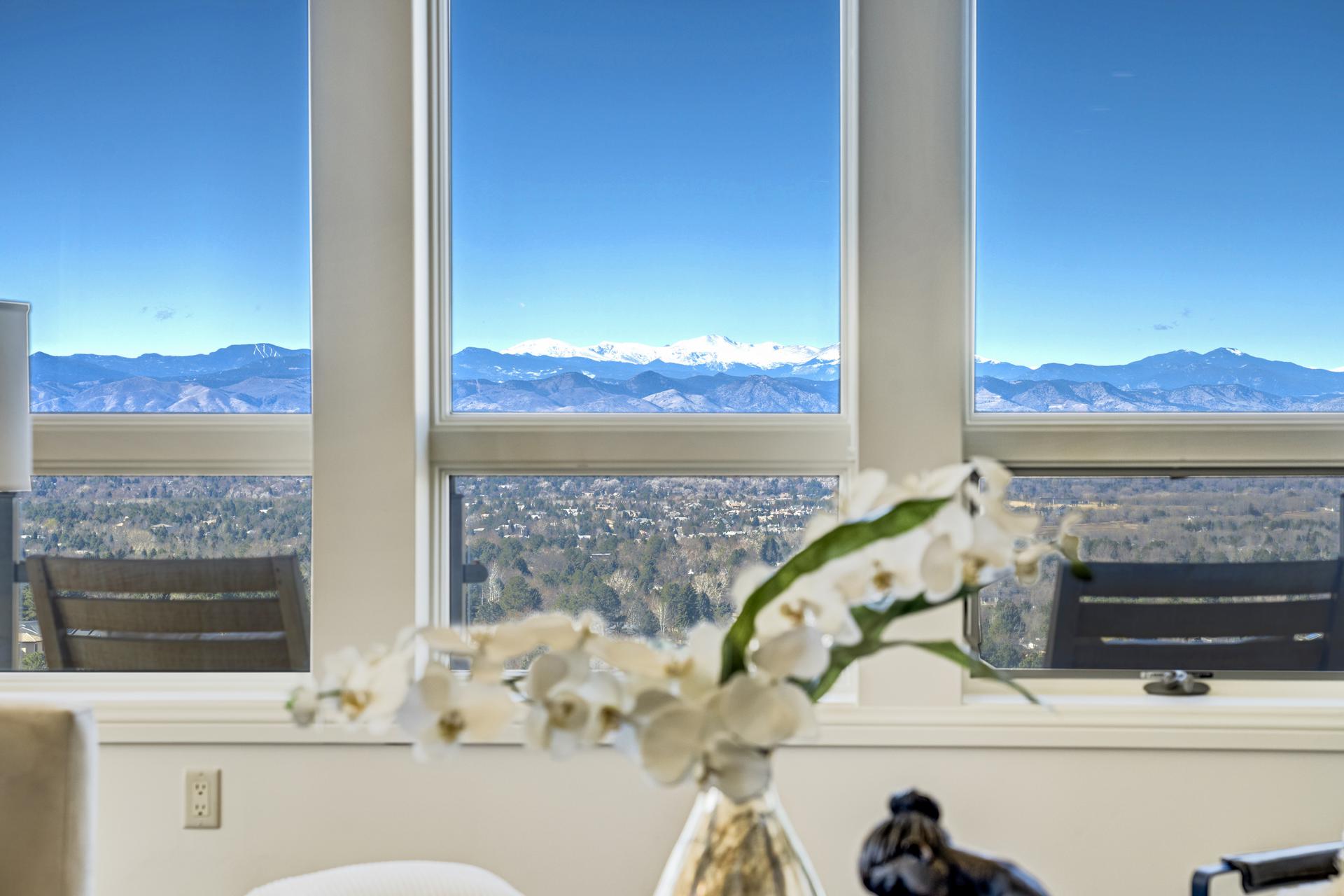 Located on a penthouse level of the West Tower at The Landmark, this southwest corner two-bedroom, two-bath residence offers elevated living with soaring 13-foot ceilings and breathtaking, unobstructed mountain views from the west-facing balcony—stretching from Pikes Peak to Longs Peak. Flooded with natural light, the open-concept layout showcases hardwood floors throughout and a gas fireplace anchoring the great room. The spacious kitchen is designed for both everyday living and entertaining, featuring abundant cabinetry, stainless steel appliances, a gas range, and a wine refrigerator. The primary suite is a private retreat, complete with a luxurious five-piece bath and a generous walk-in closet with extensive built-ins. With two garage spaces (and an option for a 3rd) and two storage spaces, this penthouse combines refined comfort, thoughtful design, and unparalleled convenience. The Landmark offers a refined, resort-inspired way of life, with premium amenities available throughout the towers, including 24/7 concierge and security services, elegant pools and spas, cutting-edge fitness facilities, saunas and steam rooms, business and meeting spaces, a library, resident lounges, guest accommodations, dedicated wine storage, and more. Just moments from the shops, restaurants, and entertainment of Landmark Plaza, and conveniently connected to the Denver Tech Center, major highways, light rail, and downtown Denver. Designed for effortless, lock-and-leave living, this home blends bright and airy interiors and a prime setting—perfect for those who appreciate elevated city living with stunning mountain views.