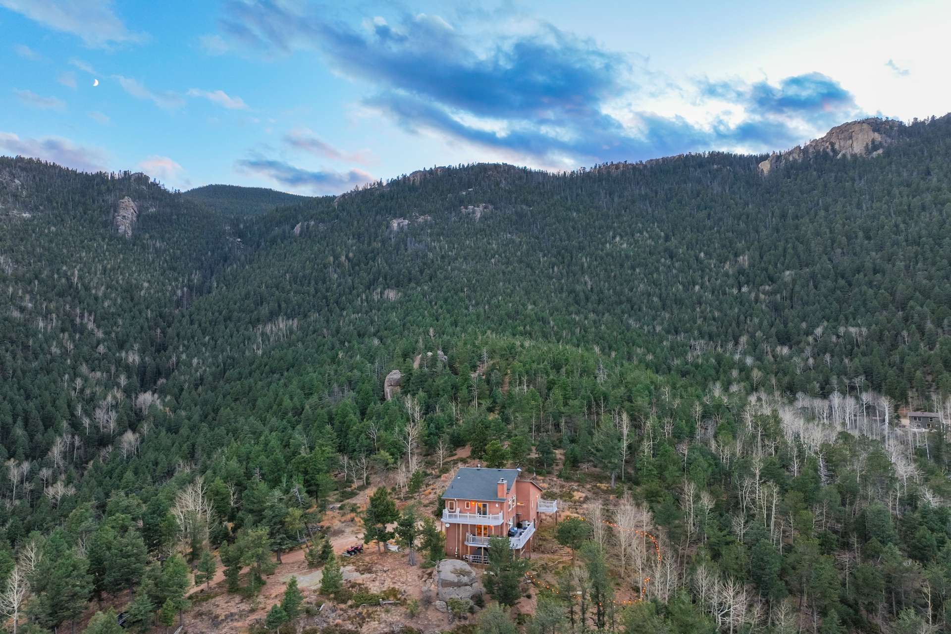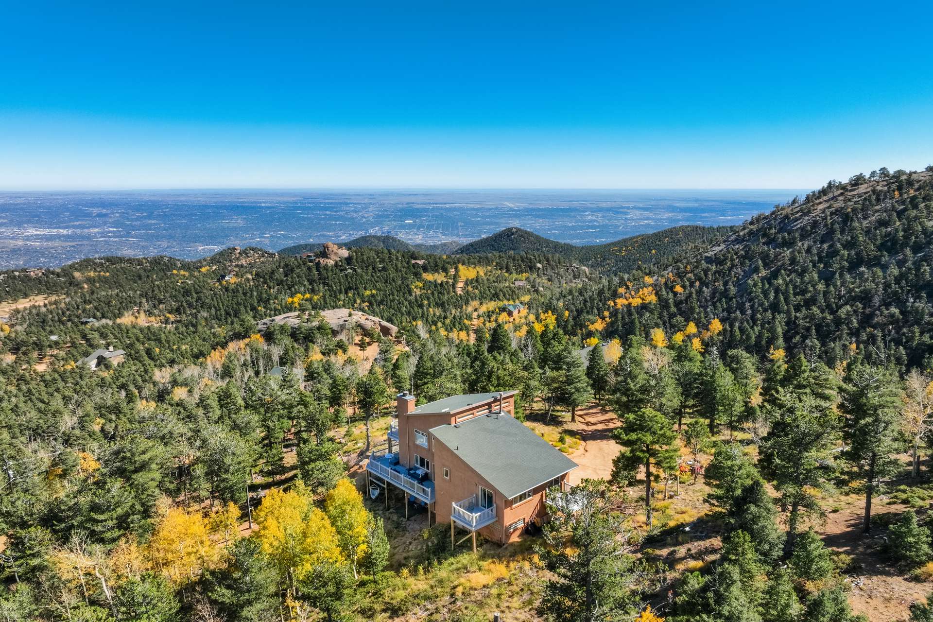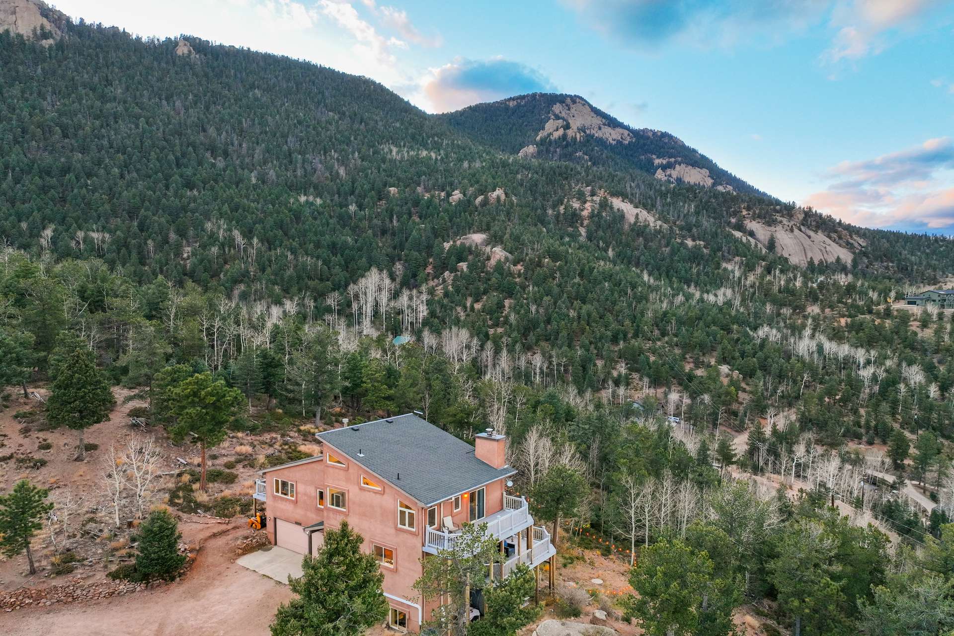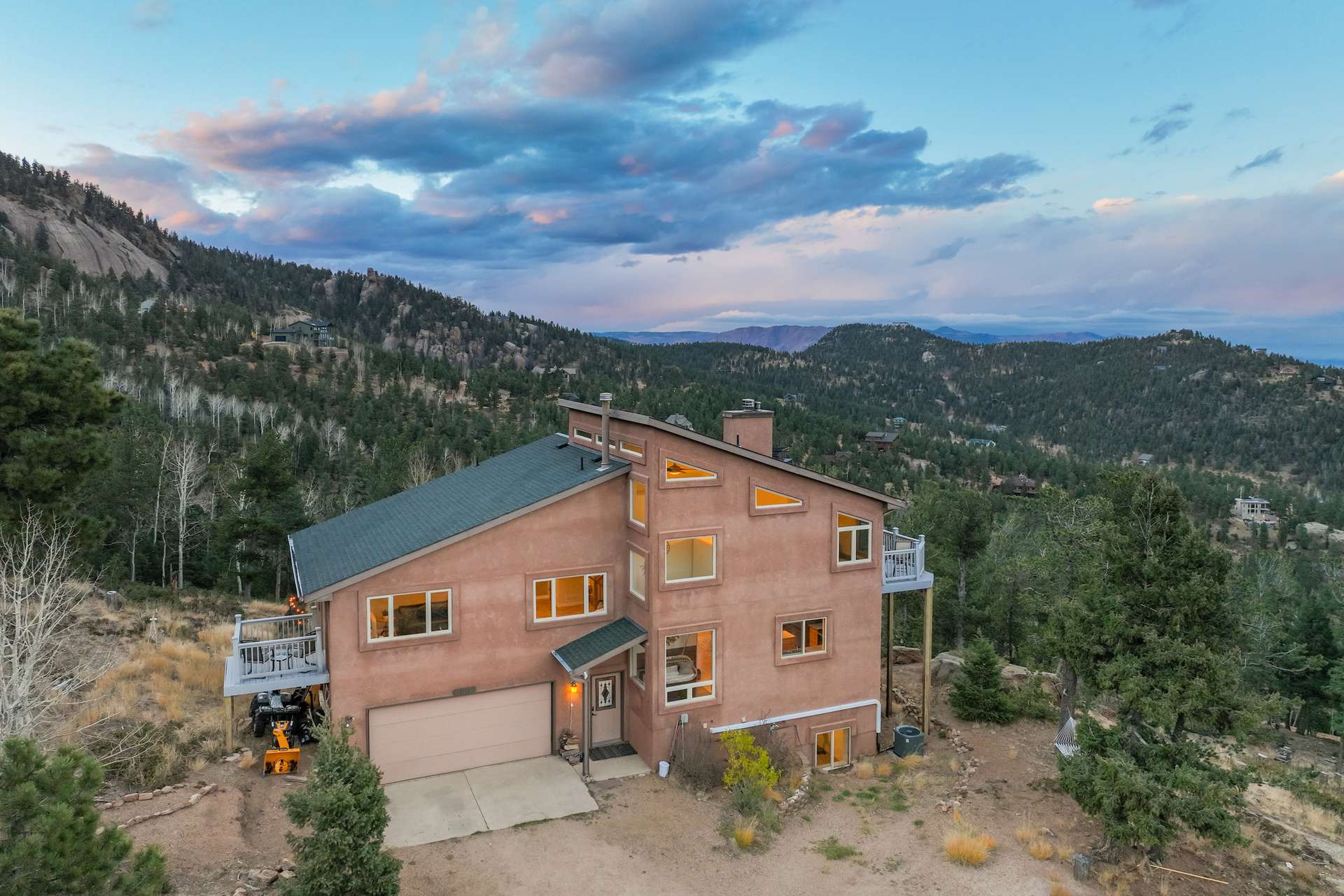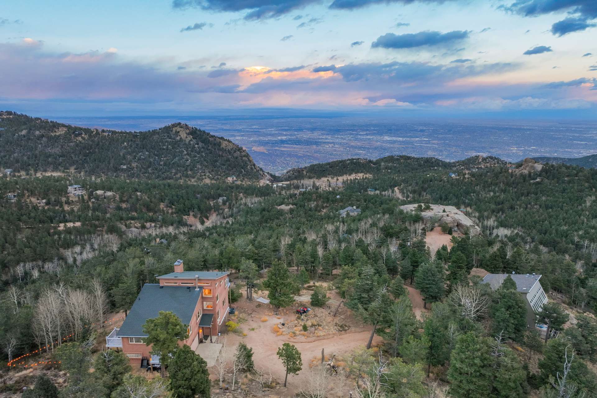 Perched high above the clouds in the gated community of Crystal Park, this mountain retreat blends striking modern design w/ the quiet privacy of a true alpine escape. Photos don’t do this one justice, you must see this one in person! Set on nearly 3/4 of an acre the home captures 360-degree views incl Pikes Peak, Garden of the Gods, Cameron Cone & the entire city below, one of the most dramatic vantage points in Manitou Springs. Inside, the entry has new hexagon tile & paneled wall leads you into light-filled living areas, w/walls of glass that bring the landscape in. Wood-burning FP anchors the great rm w/stacked stone surround, while the adj kitchen & dining space flow effortlessly to multiple decks. The kitchen has SST appliances, butcher block island, & pantry. Nearby the living rm boasts new luxury vinyl plank floor, & LED can lighting, expanding the home’s livability. Additionally on this lvl is a bedrm w/priv deck & access to full bath w/dble vanity, tile flr/shower surround. The upper-lvl master bedrm takes advantage of the views, boasting large picture windows & sliding glass dr to deck. Feat new carpet, vaulted ceilings w/transom windows, new accent wall w/electric FP, sitting area, walk-in closet & adj 5pc ba. The bath has jetted tub, mosaic tile, dble vanity, & thoughtful architectural design w/passive solar. Downstairs the walk-out bsmnt offers a family room w/9’ ceilings, woodburning stove, 3rd bedrm, laundry, & ¾ bath. Bonus new carpet throughout, newer vinyl windows, new central A/C, humidifier, radon system, dual-fuel generator, 1,000gal propane tank & more! Outdoors, the setting is extraordinary, backing directly to Pike NF w/ no buildable lots around for complete seclusion. Priv trails that start right off the property, 10-minute walk to a waterfall & nearby area known for natural gemstones. Enjoy a manned gatehouse, clubhouse, heated seasonal pool, trout pond, tennis & pickleball courts, plus HOA-maintained roads for easy year-round access.