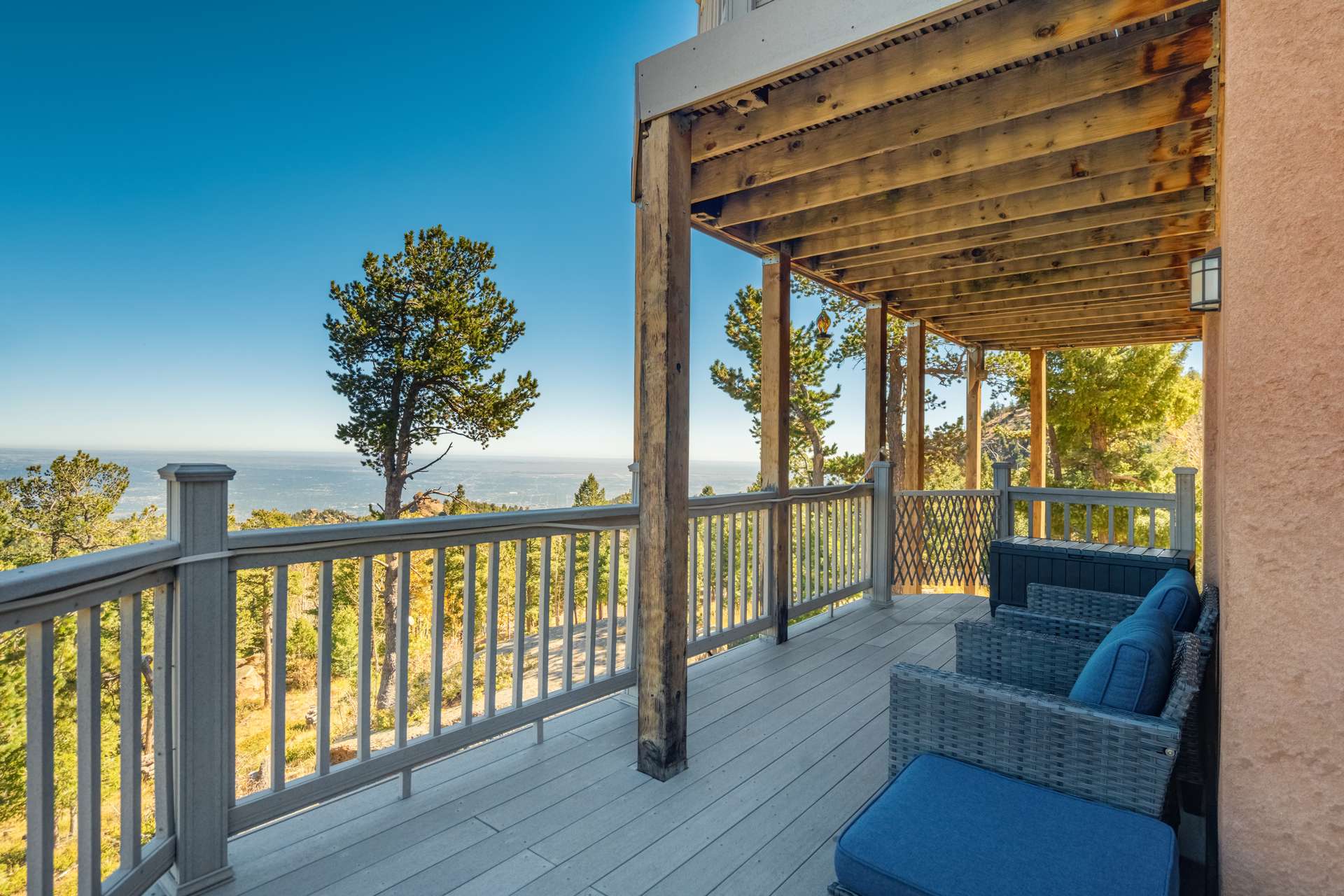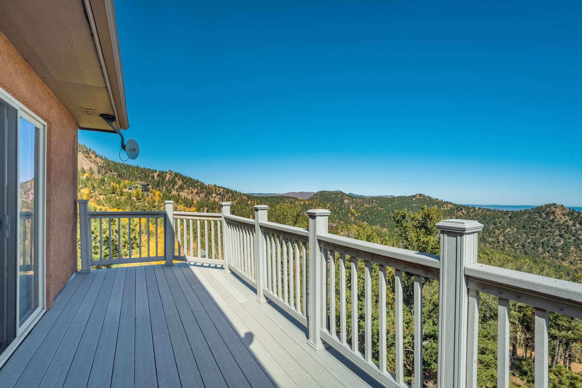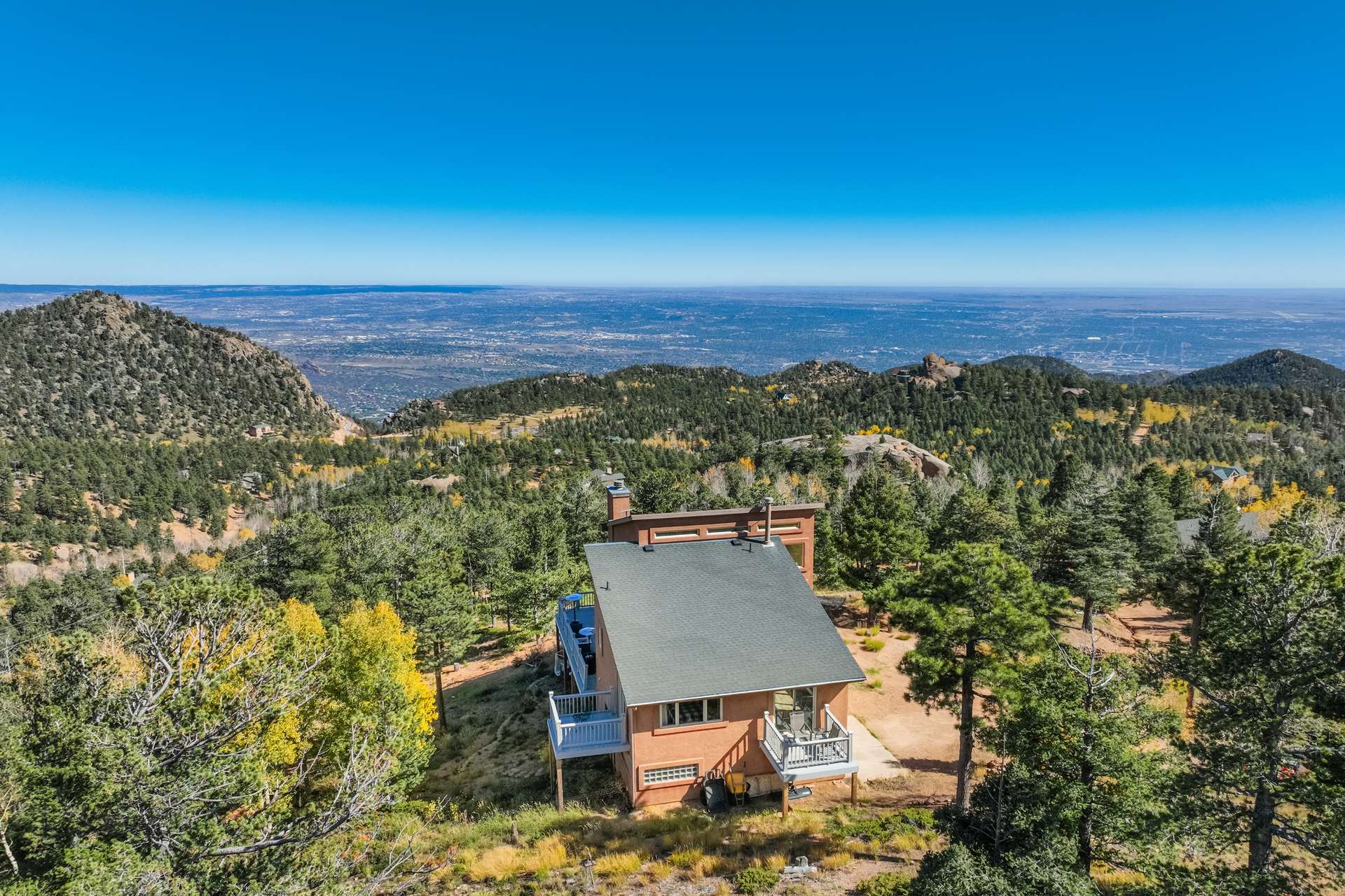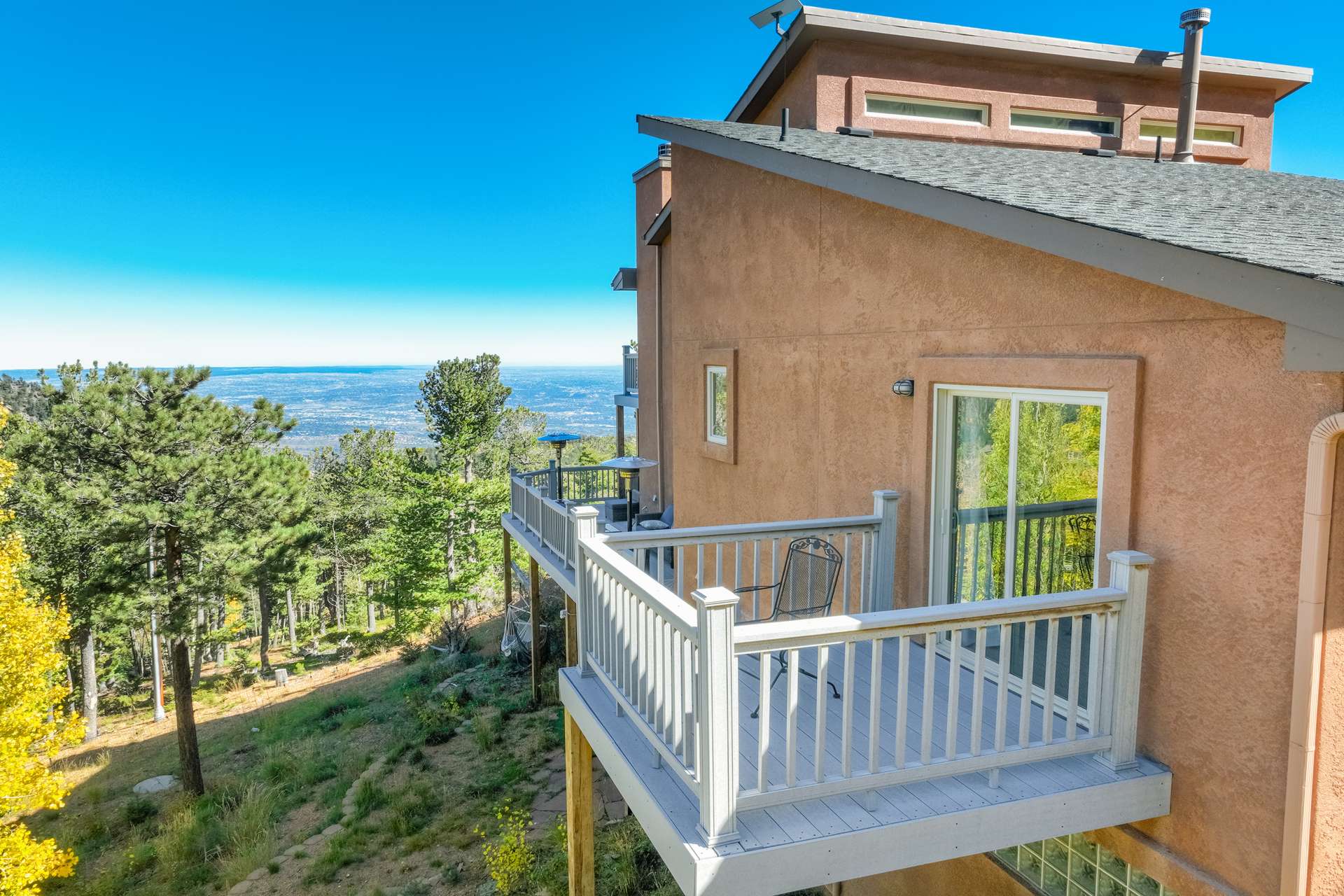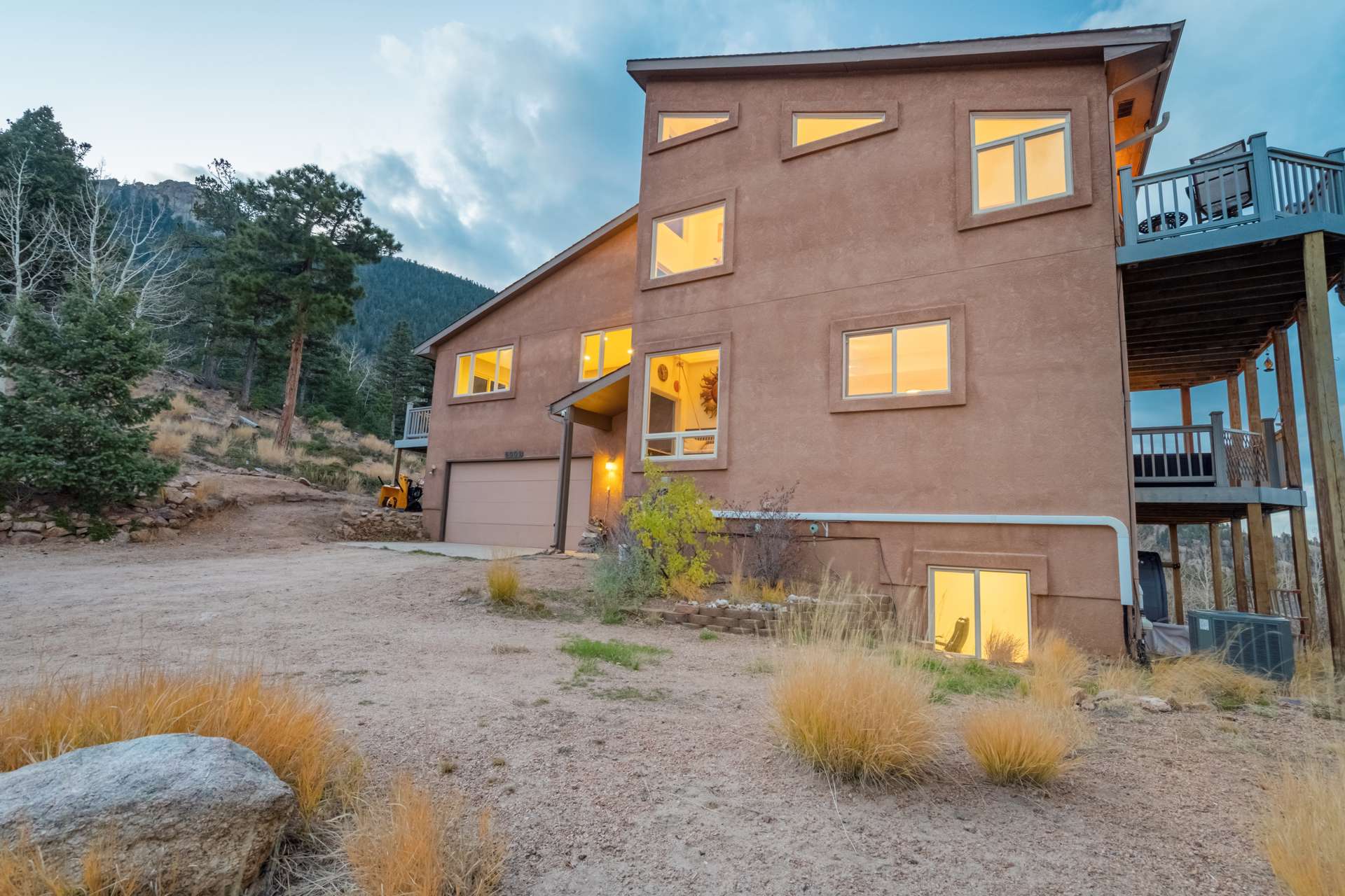 Perched high above the clouds in the gated community of Crystal Park, this mountain retreat blends striking modern design w/ the quiet privacy of a true alpine escape. Photos don’t do this one justice, you must see this one in person! Set on nearly 3/4 of an acre the home captures 360-degree views incl Pikes Peak, Garden of the Gods, Cameron Cone & the entire city below, one of the most dramatic vantage points in Manitou Springs. Inside, the entry has new hexagon tile & paneled wall leads you into light-filled living areas, w/walls of glass that bring the landscape in. Wood-burning FP anchors the great rm w/stacked stone surround, while the adj kitchen & dining space flow effortlessly to multiple decks. The kitchen has SST appliances, butcher block island, & pantry. Nearby the living rm boasts new luxury vinyl plank floor, & LED can lighting, expanding the home’s livability. Additionally on this lvl is a bedrm w/priv deck & access to full bath w/dble vanity, tile flr/shower surround. The upper-lvl master bedrm takes advantage of the views, boasting large picture windows & sliding glass dr to deck. Feat new carpet, vaulted ceilings w/transom windows, new accent wall w/electric FP, sitting area, walk-in closet & adj 5pc ba. The bath has jetted tub, mosaic tile, dble vanity, & thoughtful architectural design w/passive solar. Downstairs the walk-out bsmnt offers a family room w/9’ ceilings, woodburning stove, 3rd bedrm, laundry, & ¾ bath. Bonus new carpet throughout, newer vinyl windows, new central A/C, humidifier, radon system, dual-fuel generator, 1,000gal propane tank & more! Outdoors, the setting is extraordinary, backing directly to Pike NF w/ no buildable lots around for complete seclusion. Priv trails that start right off the property, 10-minute walk to a waterfall & nearby area known for natural gemstones. Enjoy a manned gatehouse, clubhouse, heated seasonal pool, trout pond, tennis & pickleball courts, plus HOA-maintained roads for easy year-round access.