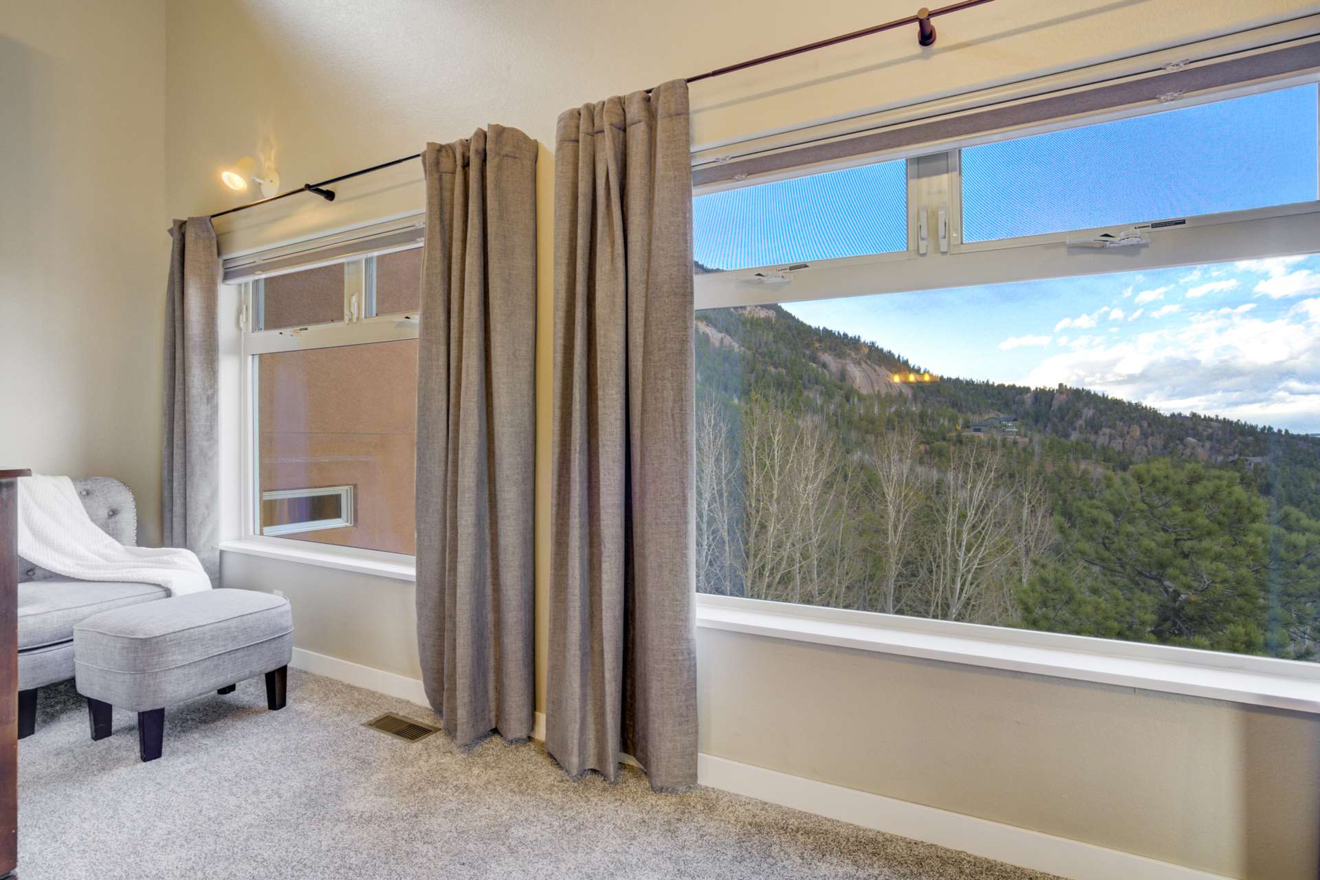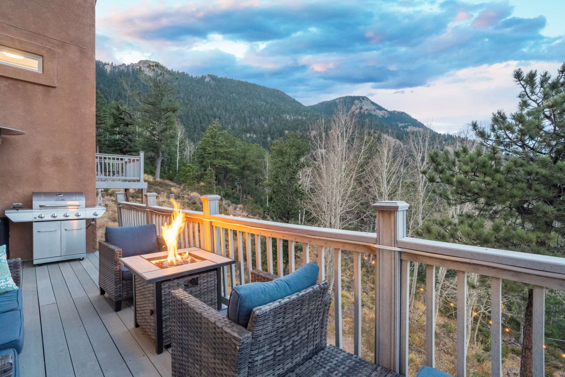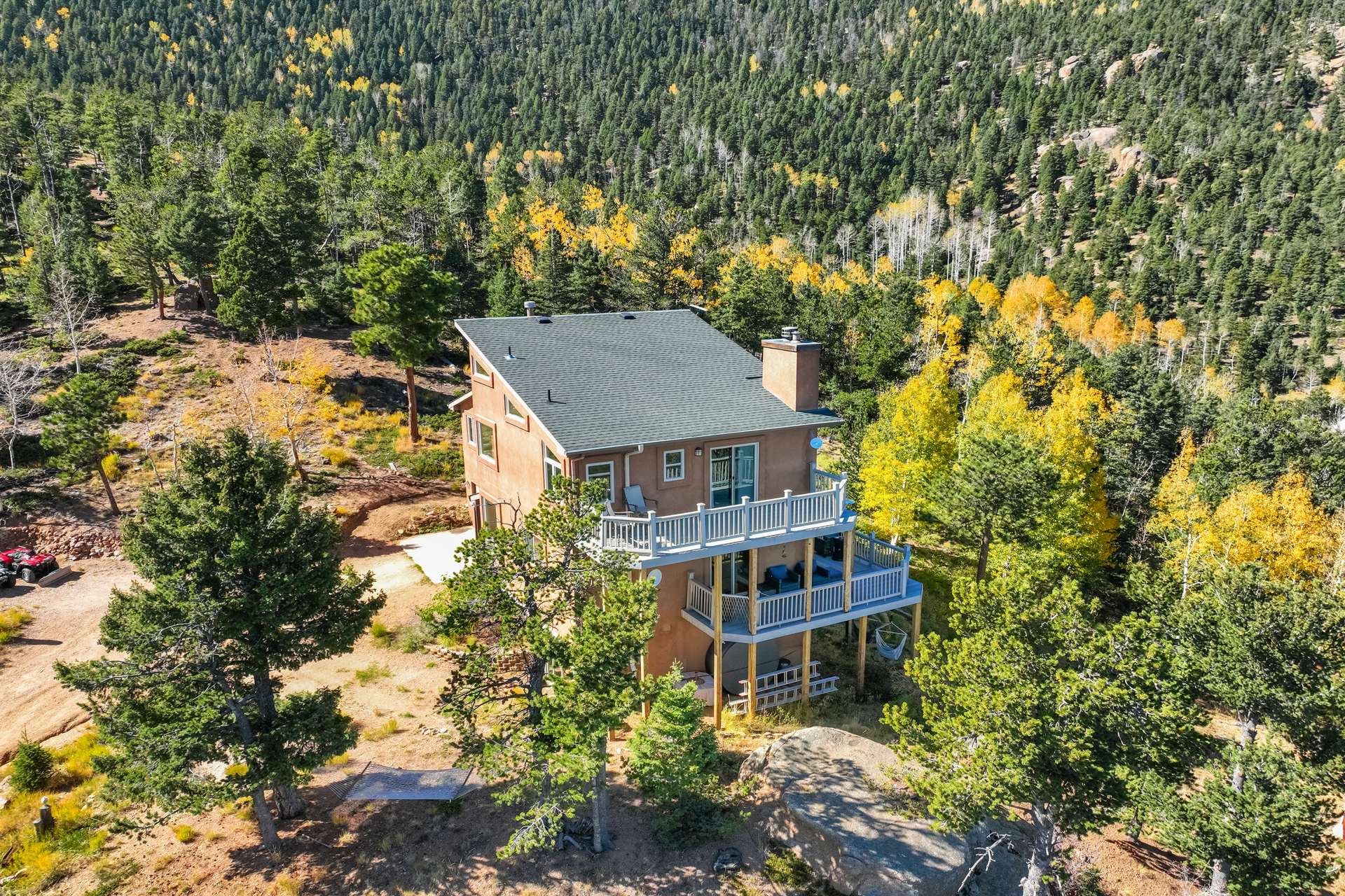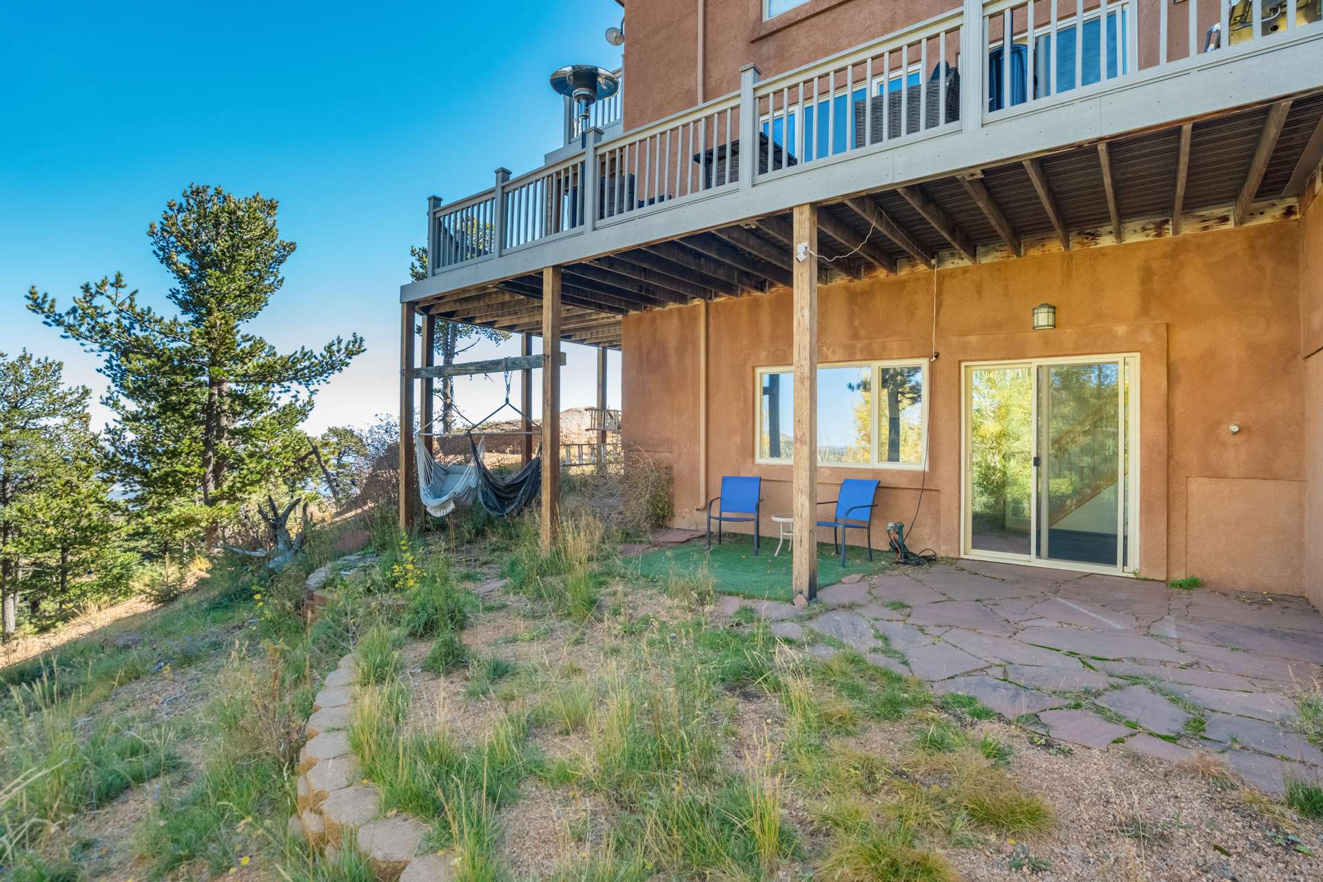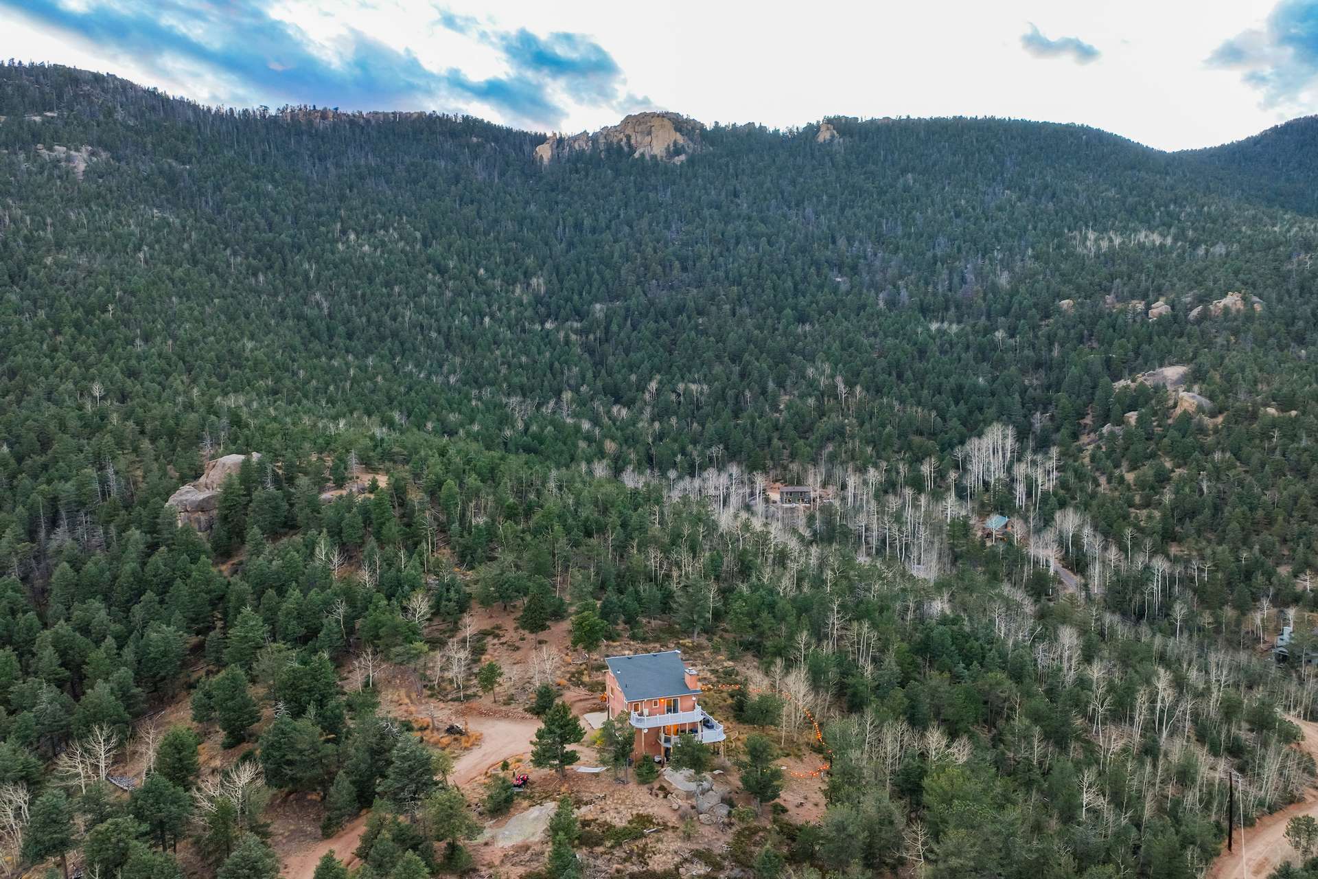 Perched high above the clouds in the gated community of Crystal Park, this mountain retreat blends striking modern design w/ the quiet privacy of a true alpine escape. Photos don’t do this one justice, you must see this one in person! Set on nearly 3/4 of an acre the home captures 360-degree views incl Pikes Peak, Garden of the Gods, Cameron Cone & the entire city below, one of the most dramatic vantage points in Manitou Springs. Inside, the entry has new hexagon tile & paneled wall leads you into light-filled living areas, w/walls of glass that bring the landscape in. Wood-burning FP anchors the great rm w/stacked stone surround, while the adj kitchen & dining space flow effortlessly to multiple decks. The kitchen has SST appliances, butcher block island, & pantry. Nearby the living rm boasts new luxury vinyl plank floor, & LED can lighting, expanding the home’s livability. Additionally on this lvl is a bedrm w/priv deck & access to full bath w/dble vanity, tile flr/shower surround. The upper-lvl master bedrm takes advantage of the views, boasting large picture windows & sliding glass dr to deck. Feat new carpet, vaulted ceilings w/transom windows, new accent wall w/electric FP, sitting area, walk-in closet & adj 5pc ba. The bath has jetted tub, mosaic tile, dble vanity, & thoughtful architectural design w/passive solar. Downstairs the walk-out bsmnt offers a family room w/9’ ceilings, woodburning stove, 3rd bedrm, laundry, & ¾ bath. Bonus new carpet throughout, newer vinyl windows, new central A/C, humidifier, radon system, dual-fuel generator, 1,000gal propane tank & more! Outdoors, the setting is extraordinary, backing directly to Pike NF w/ no buildable lots around for complete seclusion. Priv trails that start right off the property, 10-minute walk to a waterfall & nearby area known for natural gemstones. Enjoy a manned gatehouse, clubhouse, heated seasonal pool, trout pond, tennis & pickleball courts, plus HOA-maintained roads for easy year-round access.