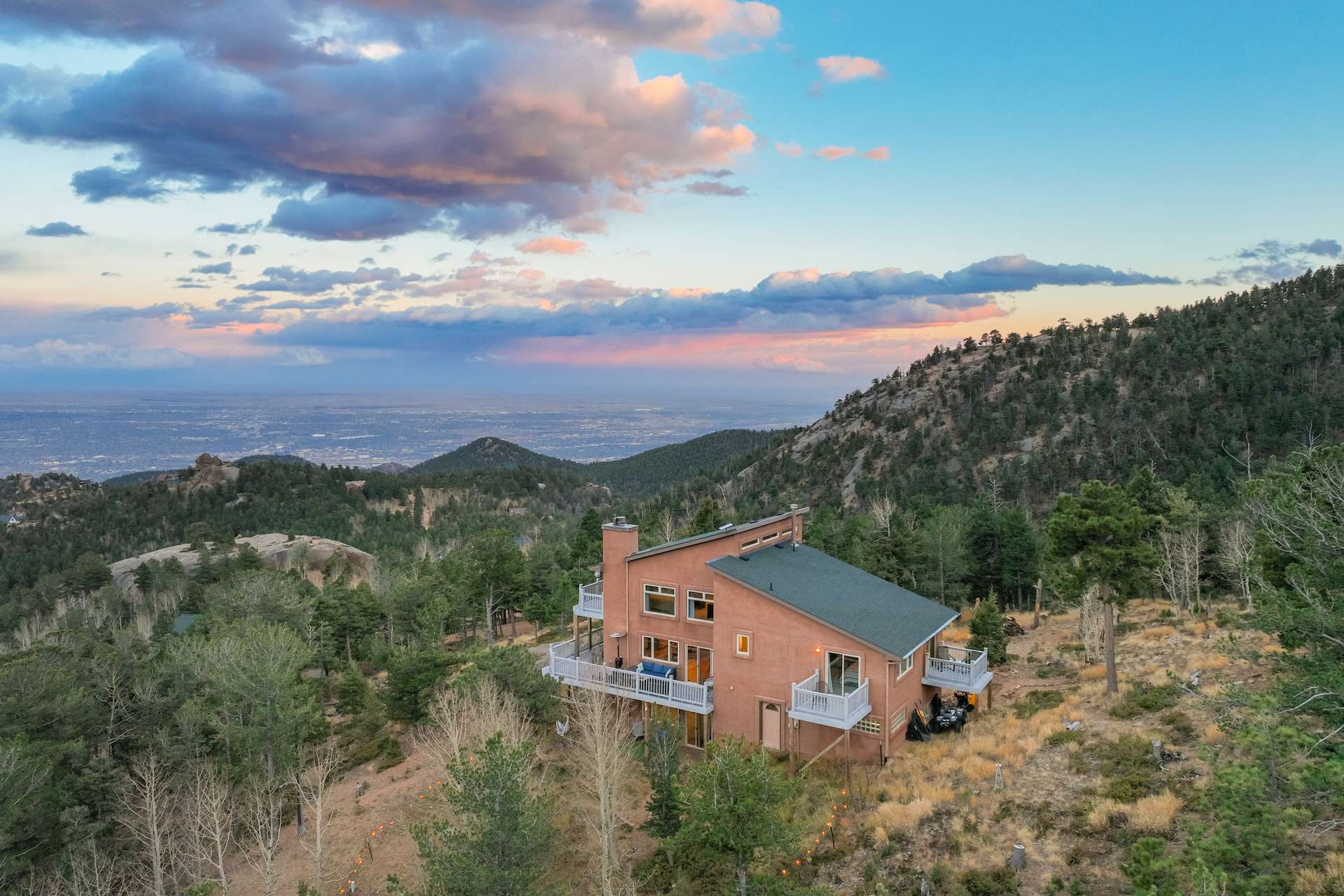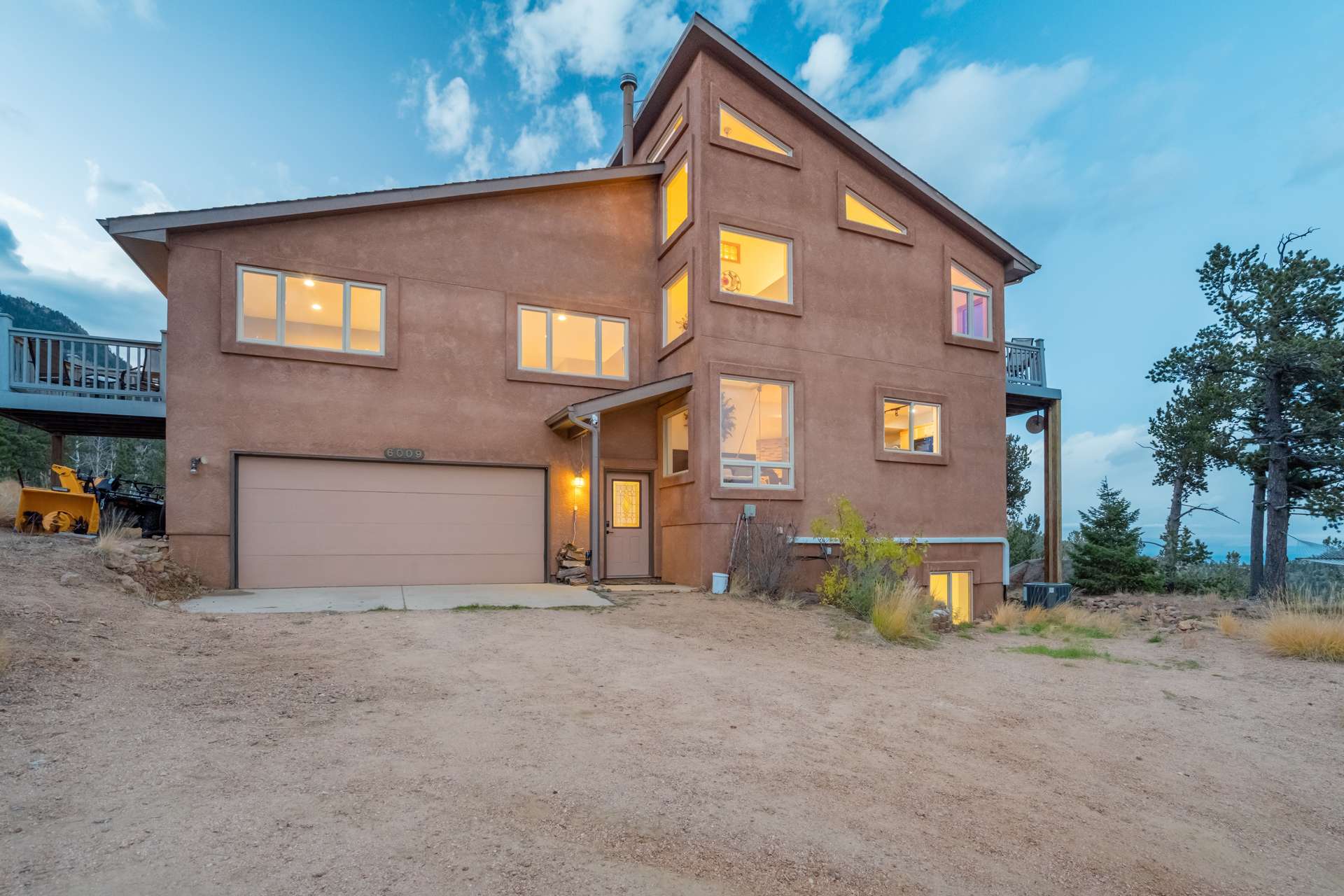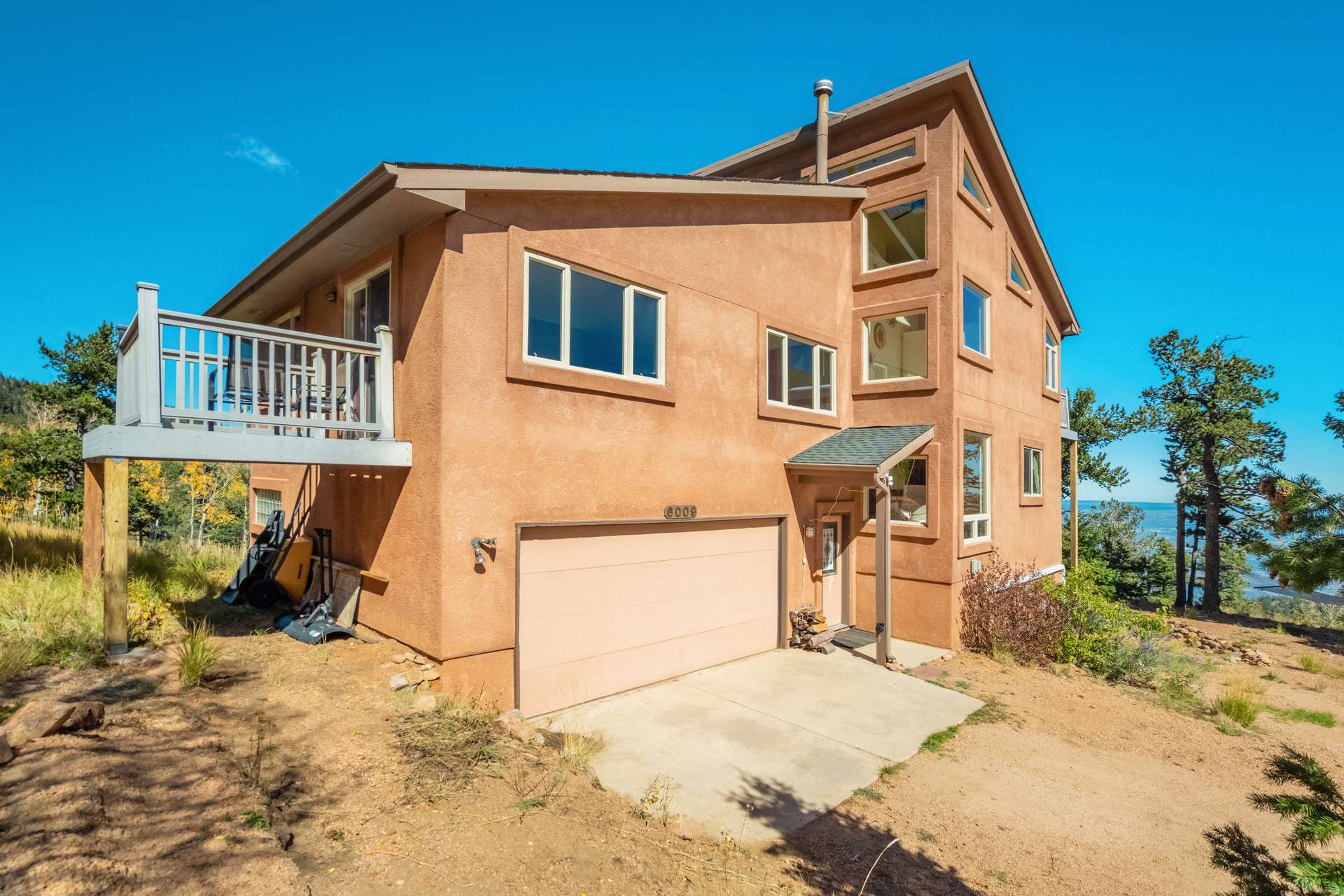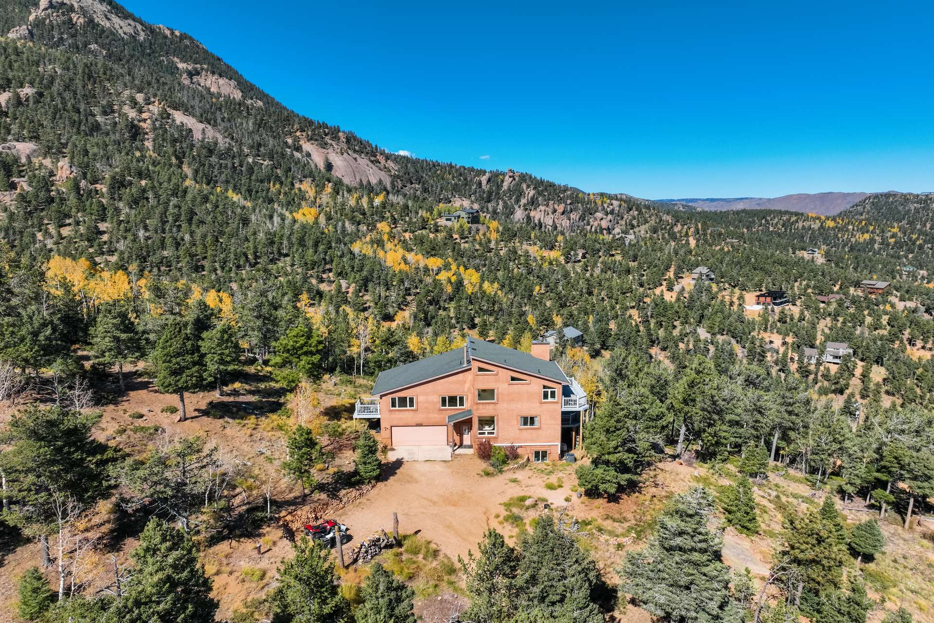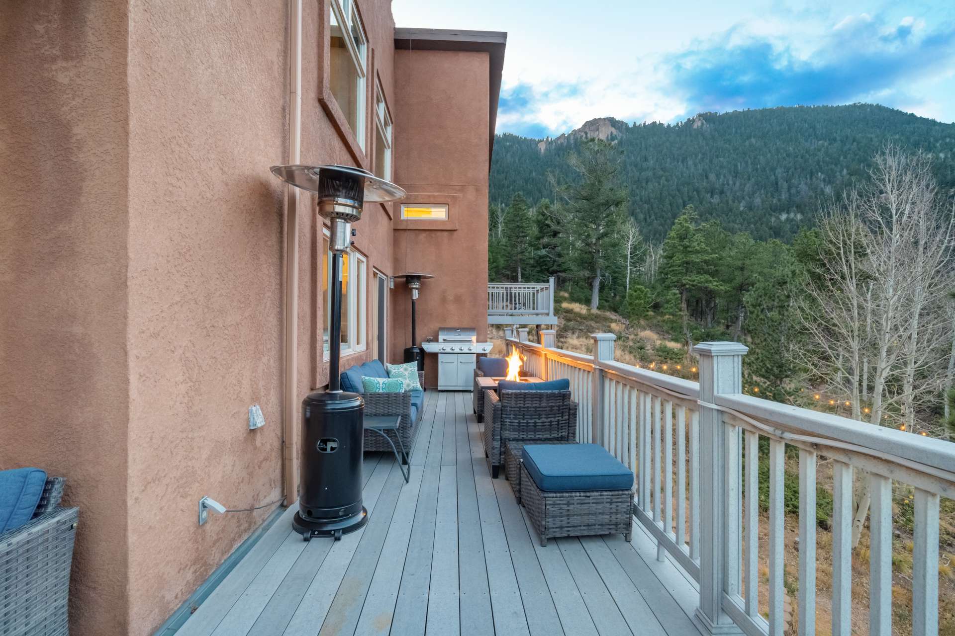 Perched high above the clouds in the gated community of Crystal Park, this mountain retreat blends striking modern design w/ the quiet privacy of a true alpine escape. Photos don’t do this one justice, you must see this one in person! Set on nearly 3/4 of an acre the home captures 360-degree views incl Pikes Peak, Garden of the Gods, Cameron Cone & the entire city below, one of the most dramatic vantage points in Manitou Springs. Inside, the entry has new hexagon tile & paneled wall leads you into light-filled living areas, w/walls of glass that bring the landscape in. Wood-burning FP anchors the great rm w/stacked stone surround, while the adj kitchen & dining space flow effortlessly to multiple decks. The kitchen has SST appliances, butcher block island, & pantry. Nearby the living rm boasts new luxury vinyl plank floor, & LED can lighting, expanding the home’s livability. Additionally on this lvl is a bedrm w/priv deck & access to full bath w/dble vanity, tile flr/shower surround. The upper-lvl master bedrm takes advantage of the views, boasting large picture windows & sliding glass dr to deck. Feat new carpet, vaulted ceilings w/transom windows, new accent wall w/electric FP, sitting area, walk-in closet & adj 5pc ba. The bath has jetted tub, mosaic tile, dble vanity, & thoughtful architectural design w/passive solar. Downstairs the walk-out bsmnt offers a family room w/9’ ceilings, woodburning stove, 3rd bedrm, laundry, & ¾ bath. Bonus new carpet throughout, newer vinyl windows, new central A/C, humidifier, radon system, dual-fuel generator, 1,000gal propane tank & more! Outdoors, the setting is extraordinary, backing directly to Pike NF w/ no buildable lots around for complete seclusion. Priv trails that start right off the property, 10-minute walk to a waterfall & nearby area known for natural gemstones. Enjoy a manned gatehouse, clubhouse, heated seasonal pool, trout pond, tennis & pickleball courts, plus HOA-maintained roads for easy year-round access.