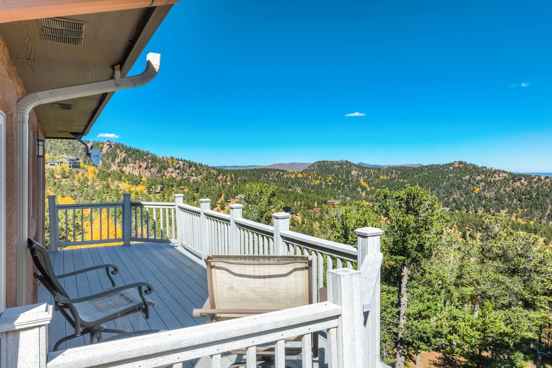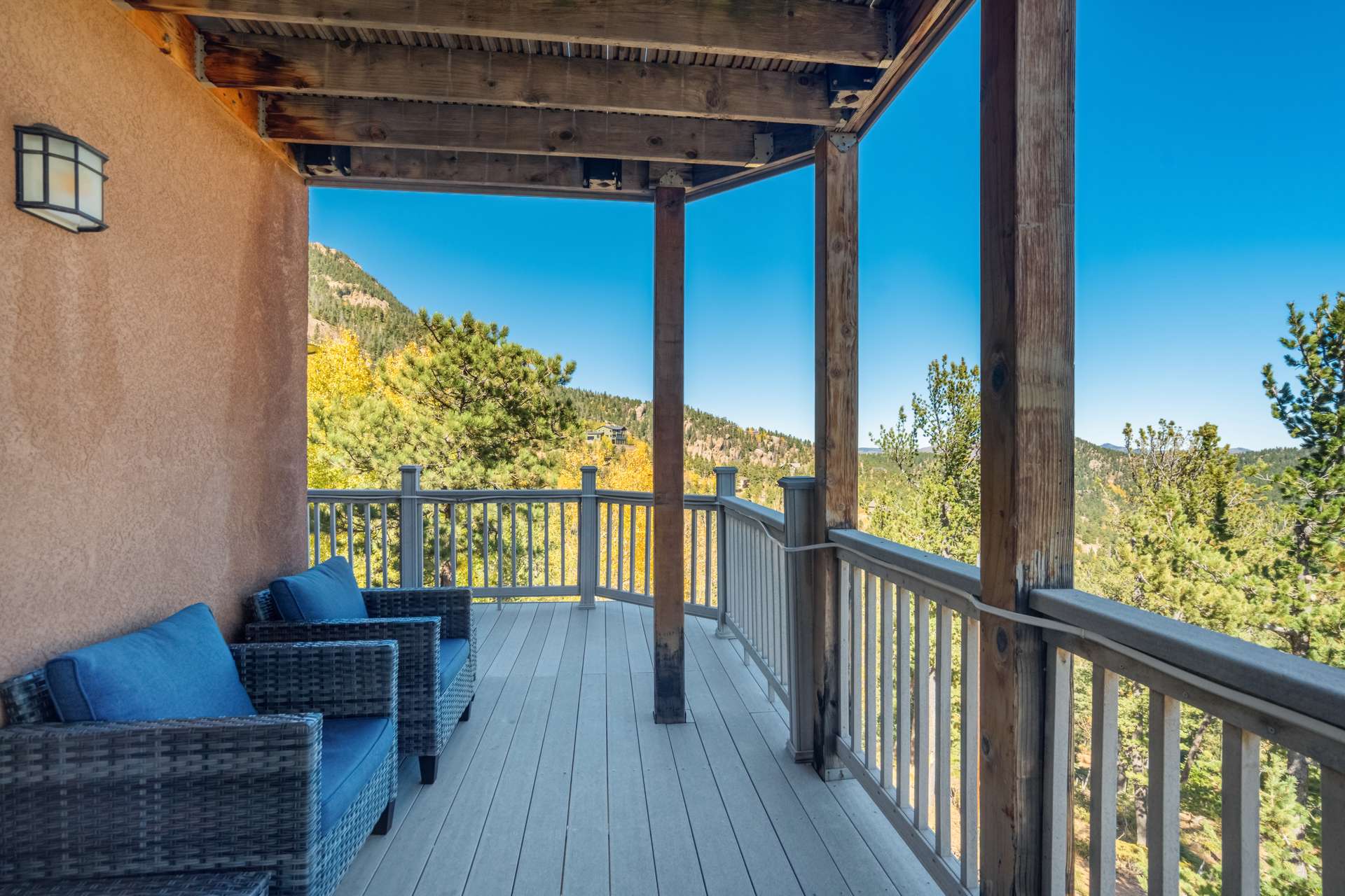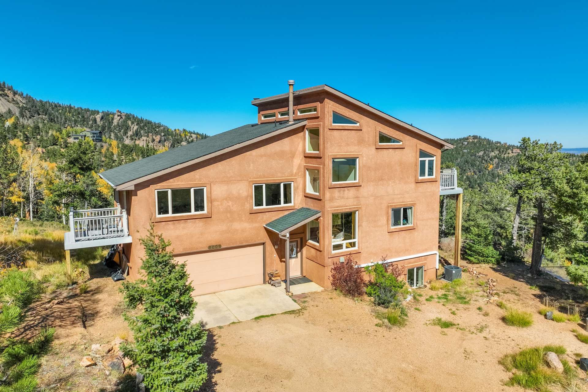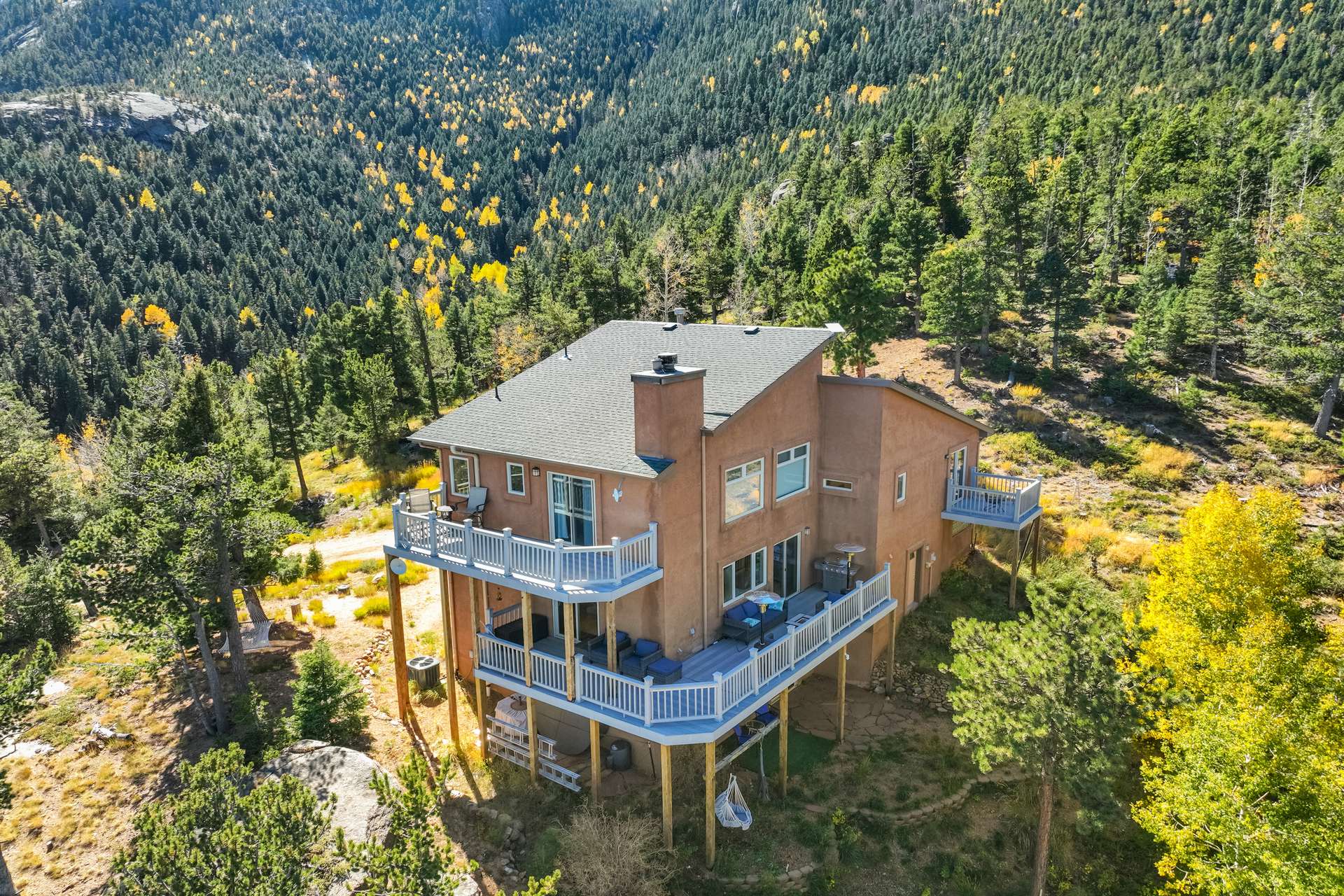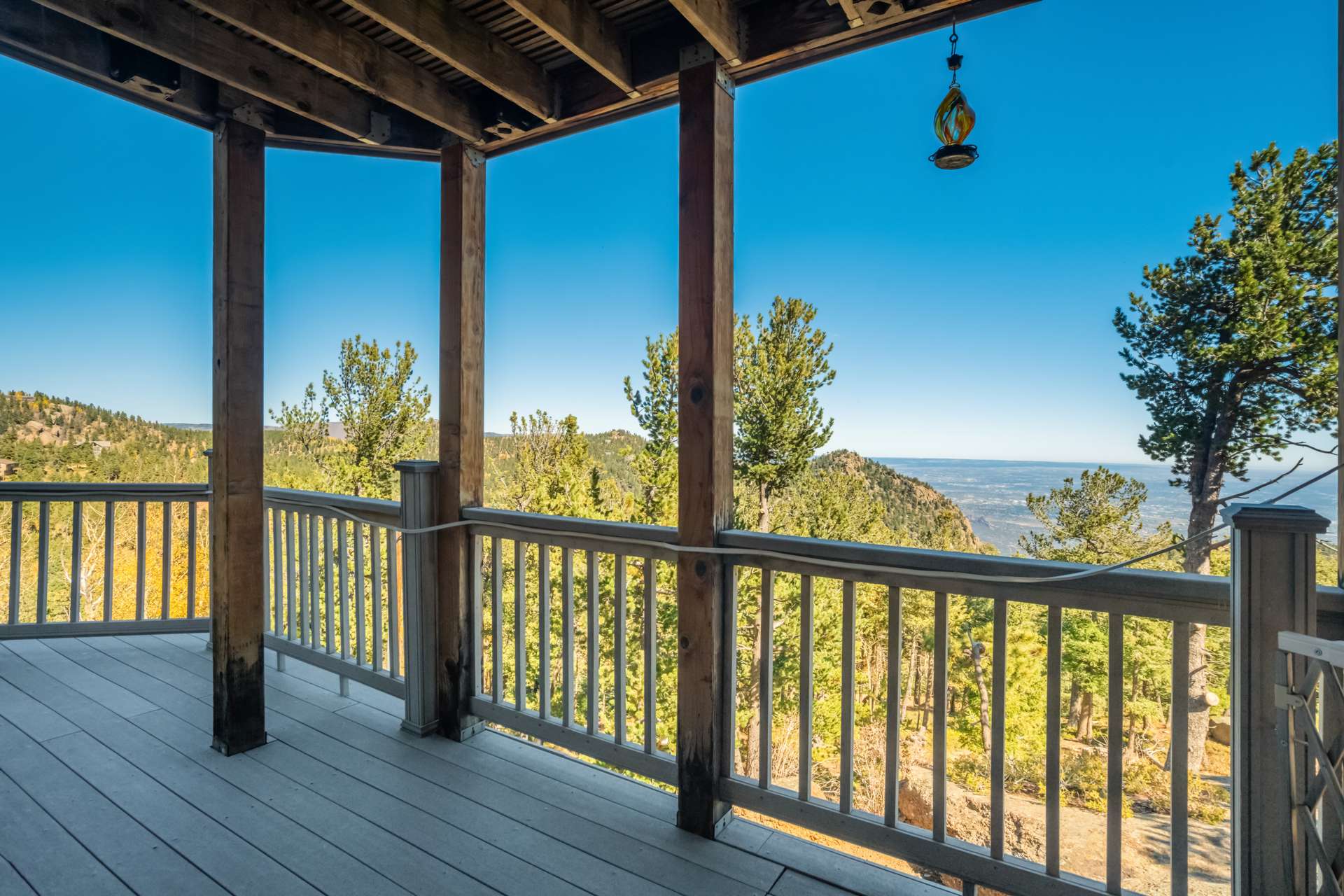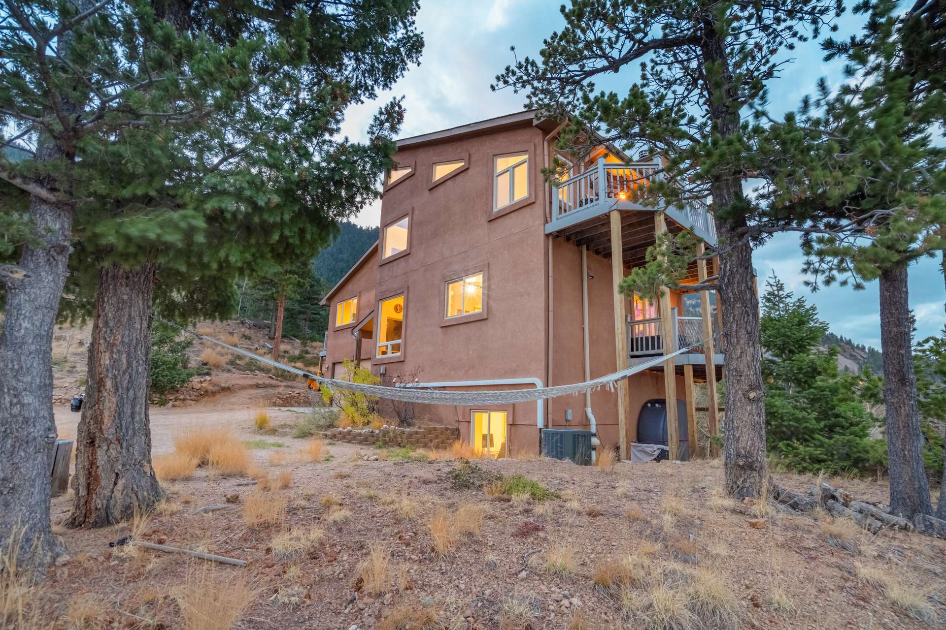 Perched high above the clouds in the gated community of Crystal Park, this mountain retreat blends striking modern design w/ the quiet privacy of a true alpine escape. Photos don’t do this one justice, you must see this one in person! Set on nearly 3/4 of an acre the home captures 360-degree views incl Pikes Peak, Garden of the Gods, Cameron Cone & the entire city below, one of the most dramatic vantage points in Manitou Springs. Inside, the entry has new hexagon tile & paneled wall leads you into light-filled living areas, w/walls of glass that bring the landscape in. Wood-burning FP anchors the great rm w/stacked stone surround, while the adj kitchen & dining space flow effortlessly to multiple decks. The kitchen has SST appliances, butcher block island, & pantry. Nearby the living rm boasts new luxury vinyl plank floor, & LED can lighting, expanding the home’s livability. Additionally on this lvl is a bedrm w/priv deck & access to full bath w/dble vanity, tile flr/shower surround. The upper-lvl master bedrm takes advantage of the views, boasting large picture windows & sliding glass dr to deck. Feat new carpet, vaulted ceilings w/transom windows, new accent wall w/electric FP, sitting area, walk-in closet & adj 5pc ba. The bath has jetted tub, mosaic tile, dble vanity, & thoughtful architectural design w/passive solar. Downstairs the walk-out bsmnt offers a family room w/9’ ceilings, woodburning stove, 3rd bedrm, laundry, & ¾ bath. Bonus new carpet throughout, newer vinyl windows, new central A/C, humidifier, radon system, dual-fuel generator, 1,000gal propane tank & more! Outdoors, the setting is extraordinary, backing directly to Pike NF w/ no buildable lots around for complete seclusion. Priv trails that start right off the property, 10-minute walk to a waterfall & nearby area known for natural gemstones. Enjoy a manned gatehouse, clubhouse, heated seasonal pool, trout pond, tennis & pickleball courts, plus HOA-maintained roads for easy year-round access.