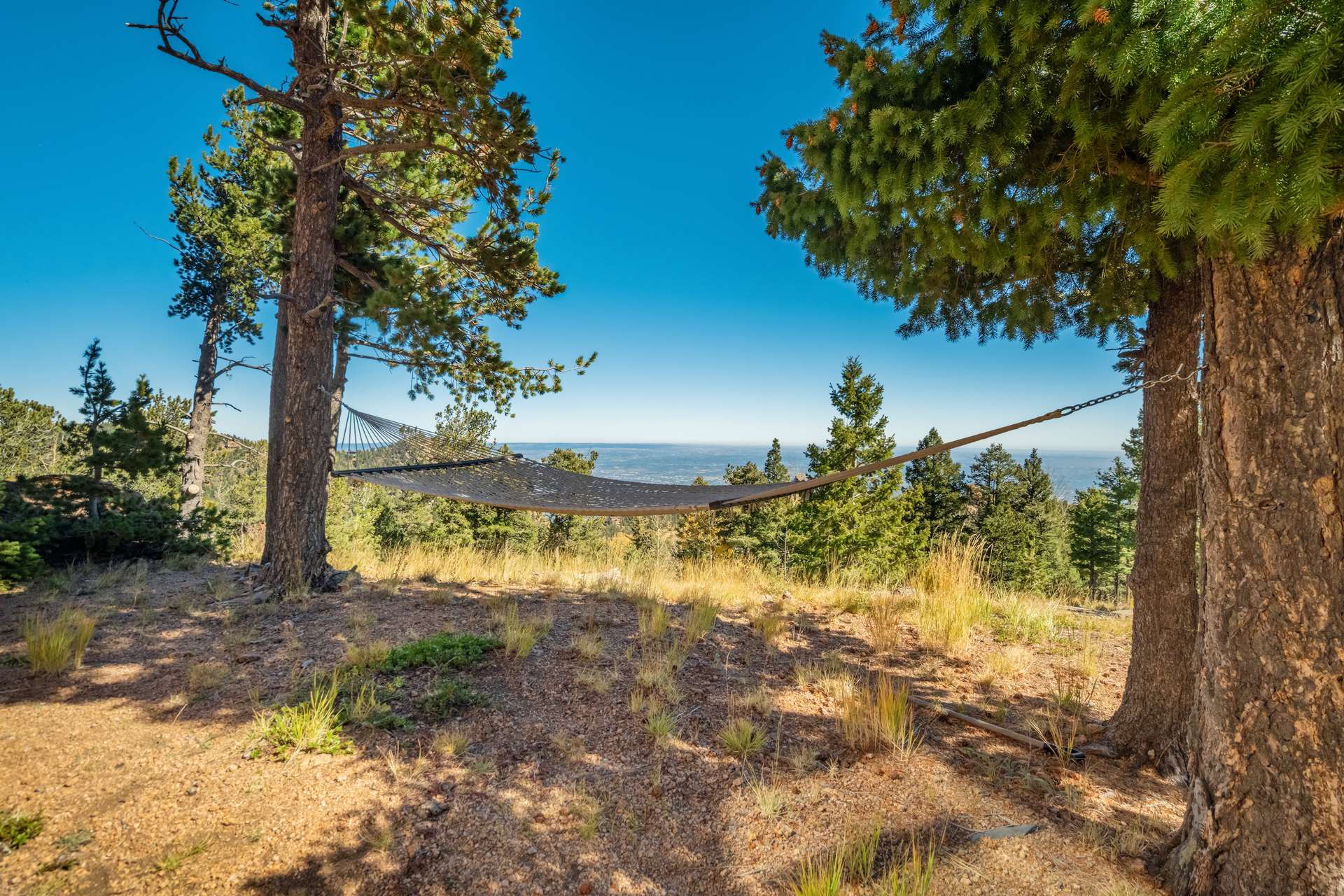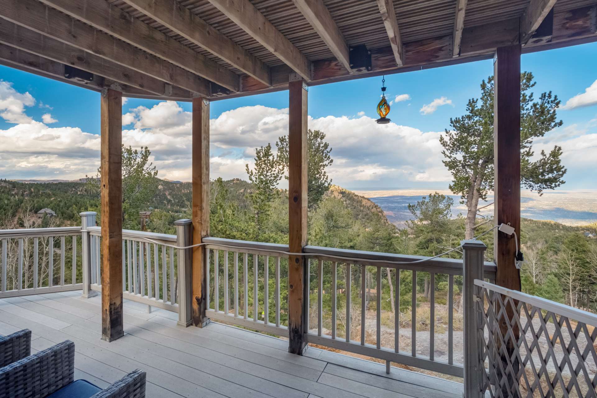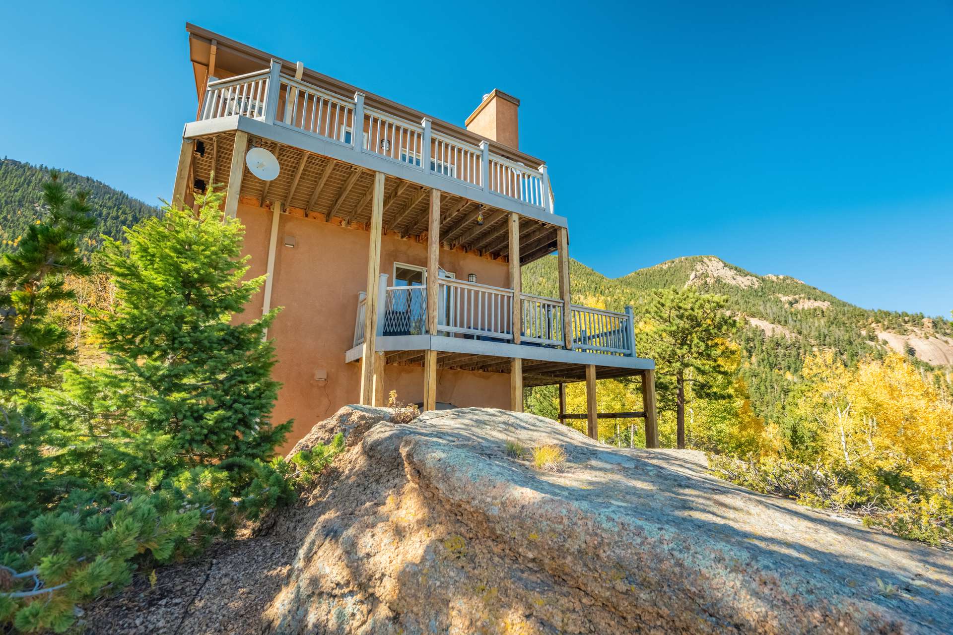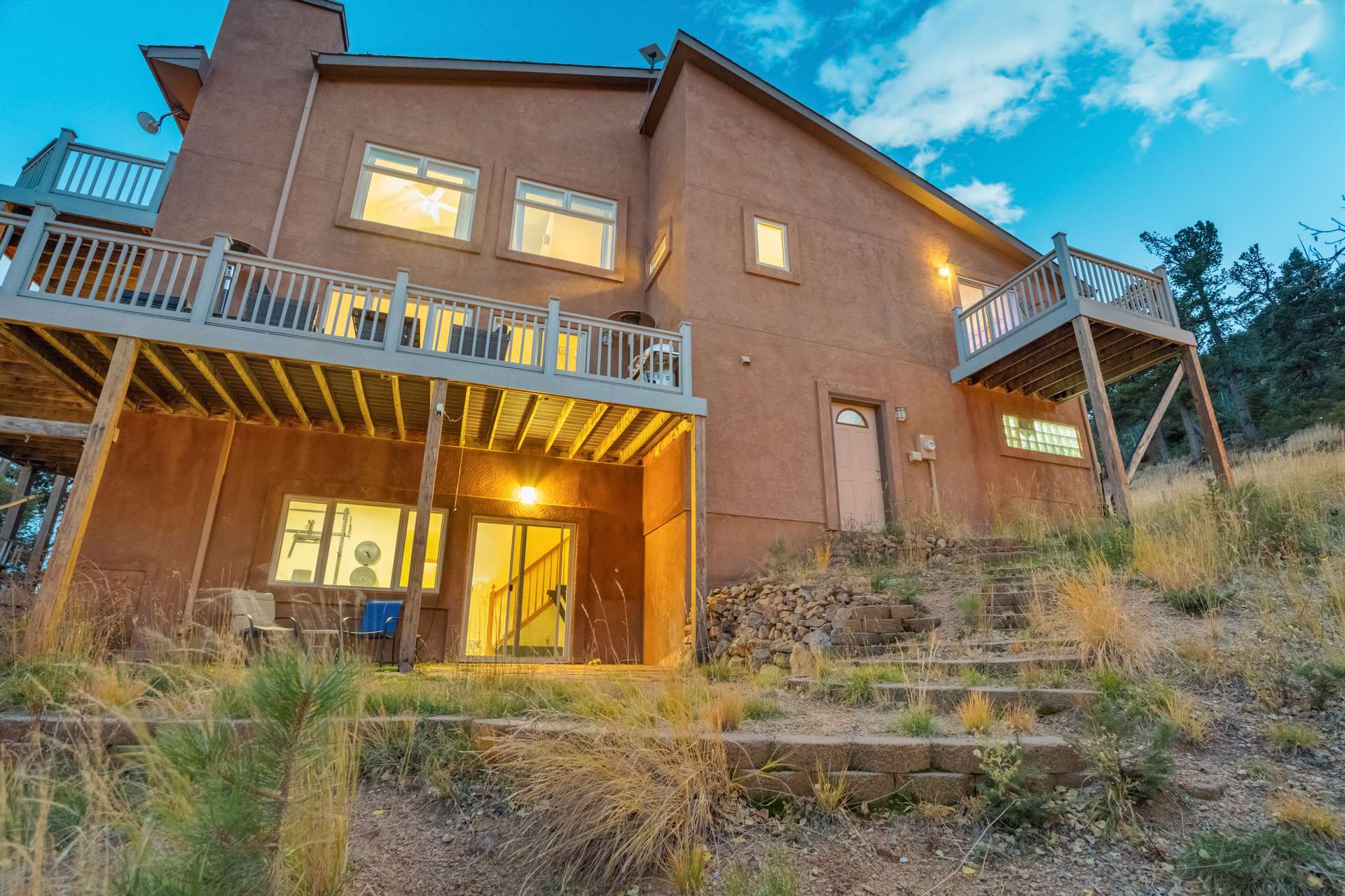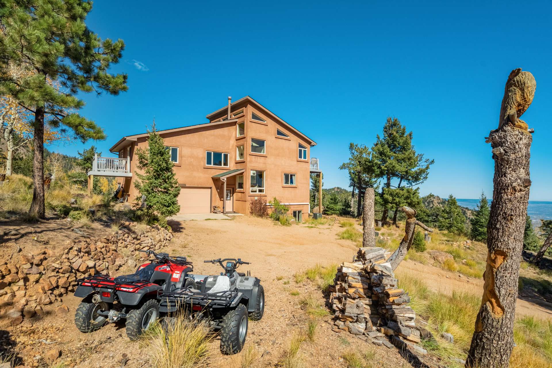 Perched high above the clouds in the gated community of Crystal Park, this mountain retreat blends striking modern design w/ the quiet privacy of a true alpine escape. Photos don’t do this one justice, you must see this one in person! Set on nearly 3/4 of an acre the home captures 360-degree views incl Pikes Peak, Garden of the Gods, Cameron Cone & the entire city below, one of the most dramatic vantage points in Manitou Springs. Inside, the entry has new hexagon tile & paneled wall leads you into light-filled living areas, w/walls of glass that bring the landscape in. Wood-burning FP anchors the great rm w/stacked stone surround, while the adj kitchen & dining space flow effortlessly to multiple decks. The kitchen has SST appliances, butcher block island, & pantry. Nearby the living rm boasts new luxury vinyl plank floor, & LED can lighting, expanding the home’s livability. Additionally on this lvl is a bedrm w/priv deck & access to full bath w/dble vanity, tile flr/shower surround. The upper-lvl master bedrm takes advantage of the views, boasting large picture windows & sliding glass dr to deck. Feat new carpet, vaulted ceilings w/transom windows, new accent wall w/electric FP, sitting area, walk-in closet & adj 5pc ba. The bath has jetted tub, mosaic tile, dble vanity, & thoughtful architectural design w/passive solar. Downstairs the walk-out bsmnt offers a family room w/9’ ceilings, woodburning stove, 3rd bedrm, laundry, & ¾ bath. Bonus new carpet throughout, newer vinyl windows, new central A/C, humidifier, radon system, dual-fuel generator, 1,000gal propane tank & more! Outdoors, the setting is extraordinary, backing directly to Pike NF w/ no buildable lots around for complete seclusion. Priv trails that start right off the property, 10-minute walk to a waterfall & nearby area known for natural gemstones. Enjoy a manned gatehouse, clubhouse, heated seasonal pool, trout pond, tennis & pickleball courts, plus HOA-maintained roads for easy year-round access.