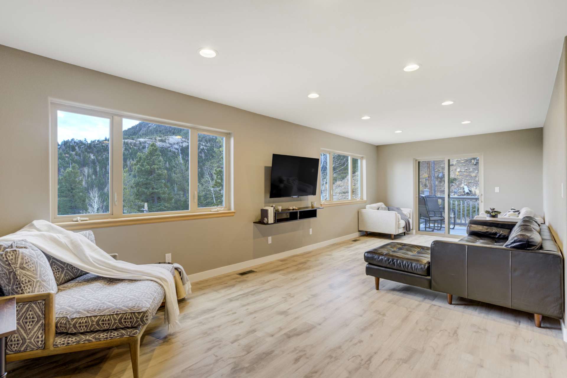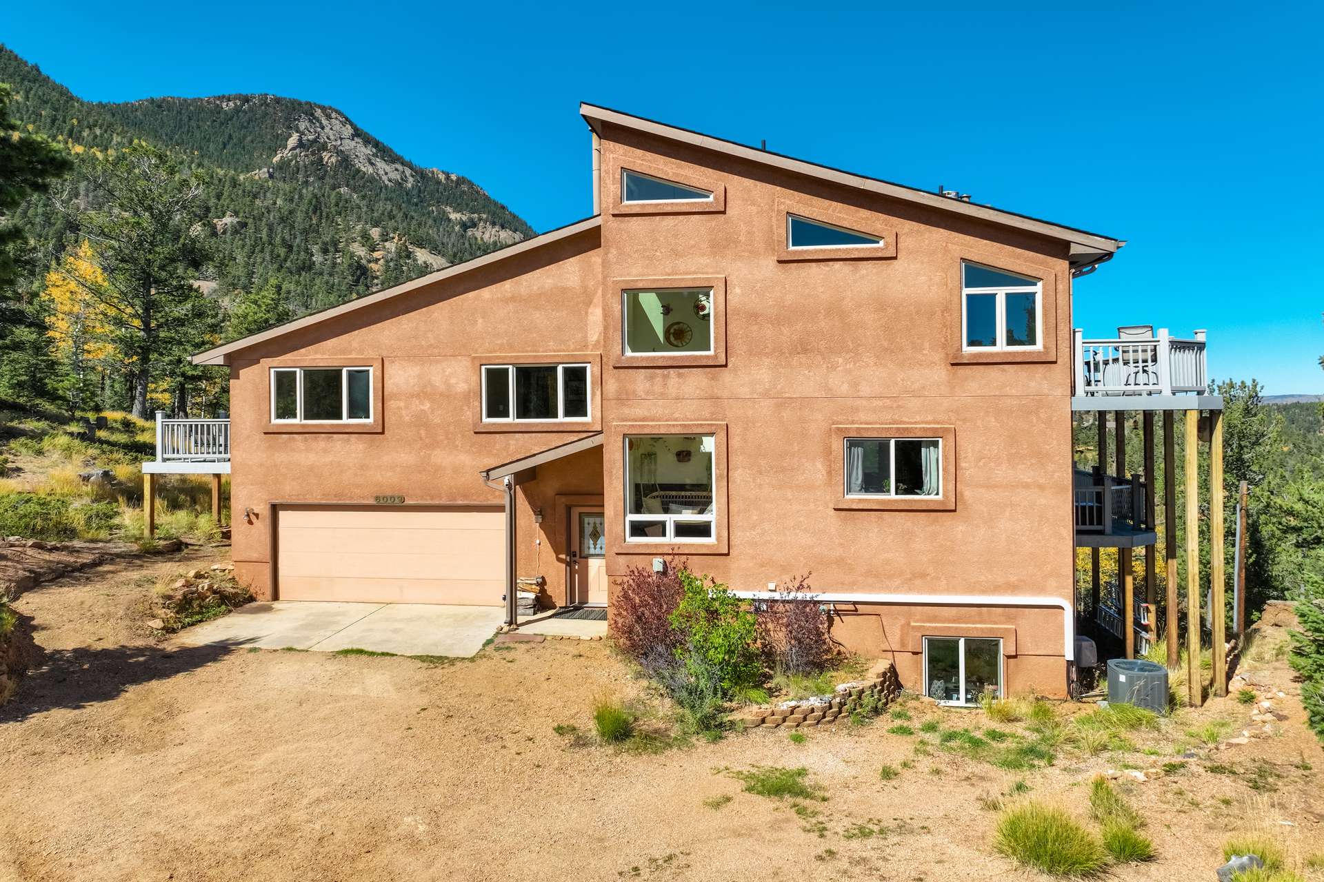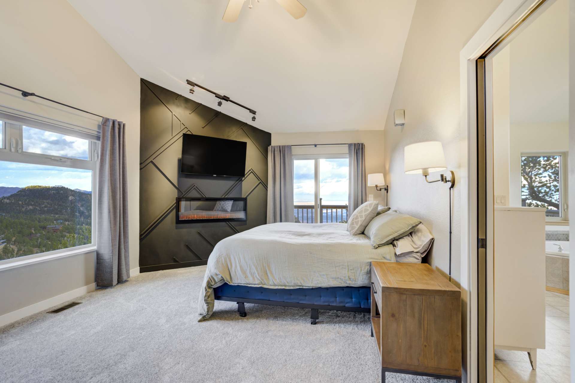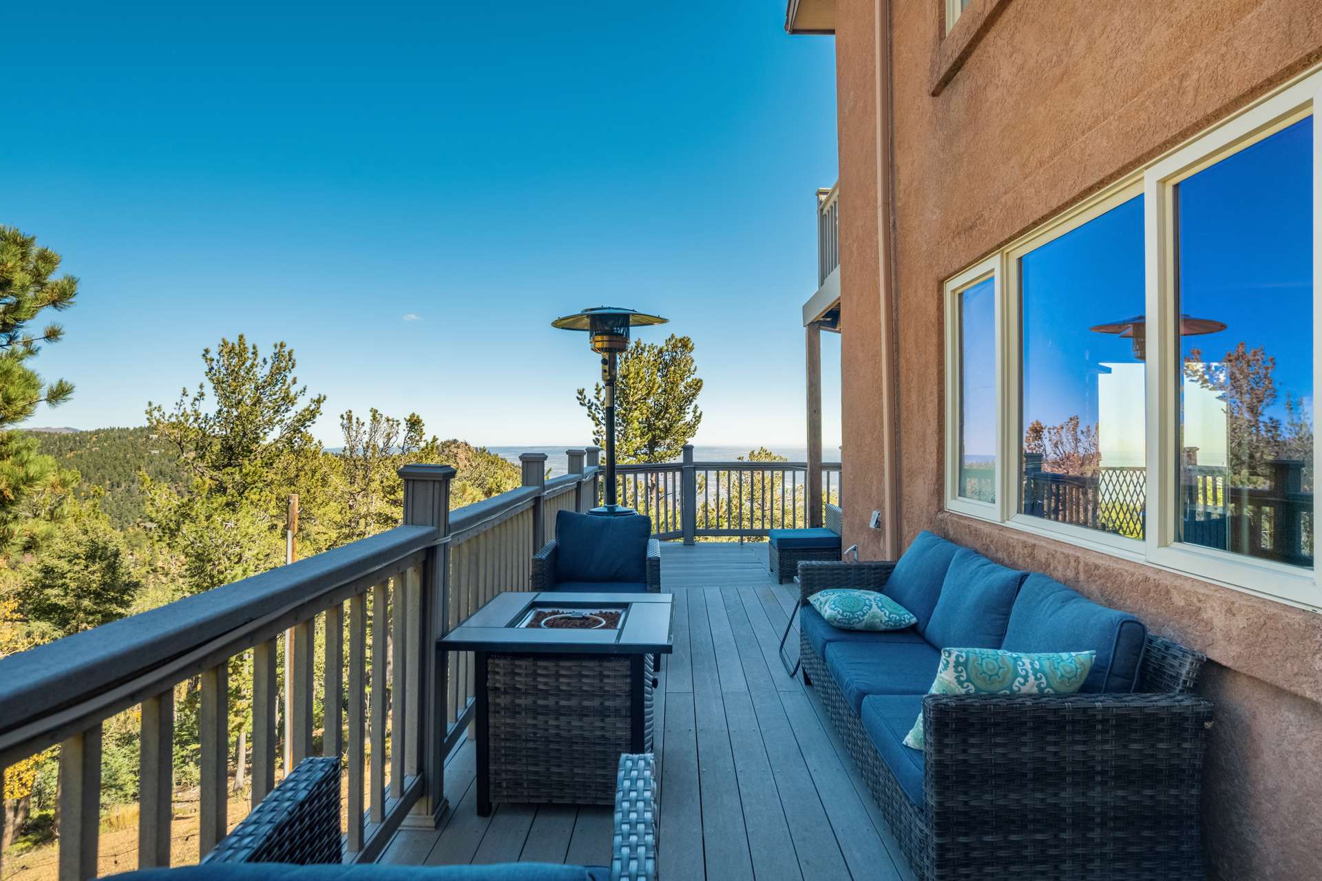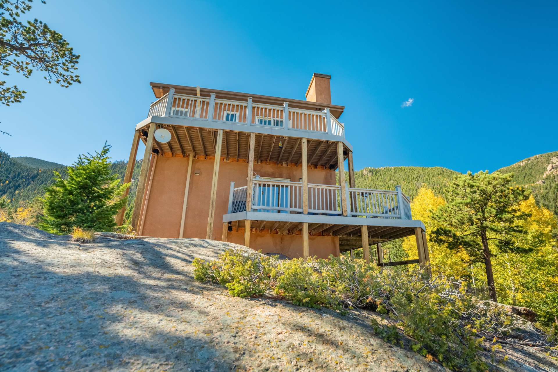 Perched high above the clouds in the gated community of Crystal Park, this mountain retreat blends striking modern design w/ the quiet privacy of a true alpine escape. Photos don’t do this one justice, you must see this one in person! Set on nearly 3/4 of an acre the home captures 360-degree views incl Pikes Peak, Garden of the Gods, Cameron Cone & the entire city below, one of the most dramatic vantage points in Manitou Springs. Inside, the entry has new hexagon tile & paneled wall leads you into light-filled living areas, w/walls of glass that bring the landscape in. Wood-burning FP anchors the great rm w/stacked stone surround, while the adj kitchen & dining space flow effortlessly to multiple decks. The kitchen has SST appliances, butcher block island, & pantry. Nearby the living rm boasts new luxury vinyl plank floor, & LED can lighting, expanding the home’s livability. Additionally on this lvl is a bedrm w/priv deck & access to full bath w/dble vanity, tile flr/shower surround. The upper-lvl master bedrm takes advantage of the views, boasting large picture windows & sliding glass dr to deck. Feat new carpet, vaulted ceilings w/transom windows, new accent wall w/electric FP, sitting area, walk-in closet & adj 5pc ba. The bath has jetted tub, mosaic tile, dble vanity, & thoughtful architectural design w/passive solar. Downstairs the walk-out bsmnt offers a family room w/9’ ceilings, woodburning stove, 3rd bedrm, laundry, & ¾ bath. Bonus new carpet throughout, newer vinyl windows, new central A/C, humidifier, radon system, dual-fuel generator, 1,000gal propane tank & more! Outdoors, the setting is extraordinary, backing directly to Pike NF w/ no buildable lots around for complete seclusion. Priv trails that start right off the property, 10-minute walk to a waterfall & nearby area known for natural gemstones. Enjoy a manned gatehouse, clubhouse, heated seasonal pool, trout pond, tennis & pickleball courts, plus HOA-maintained roads for easy year-round access.
