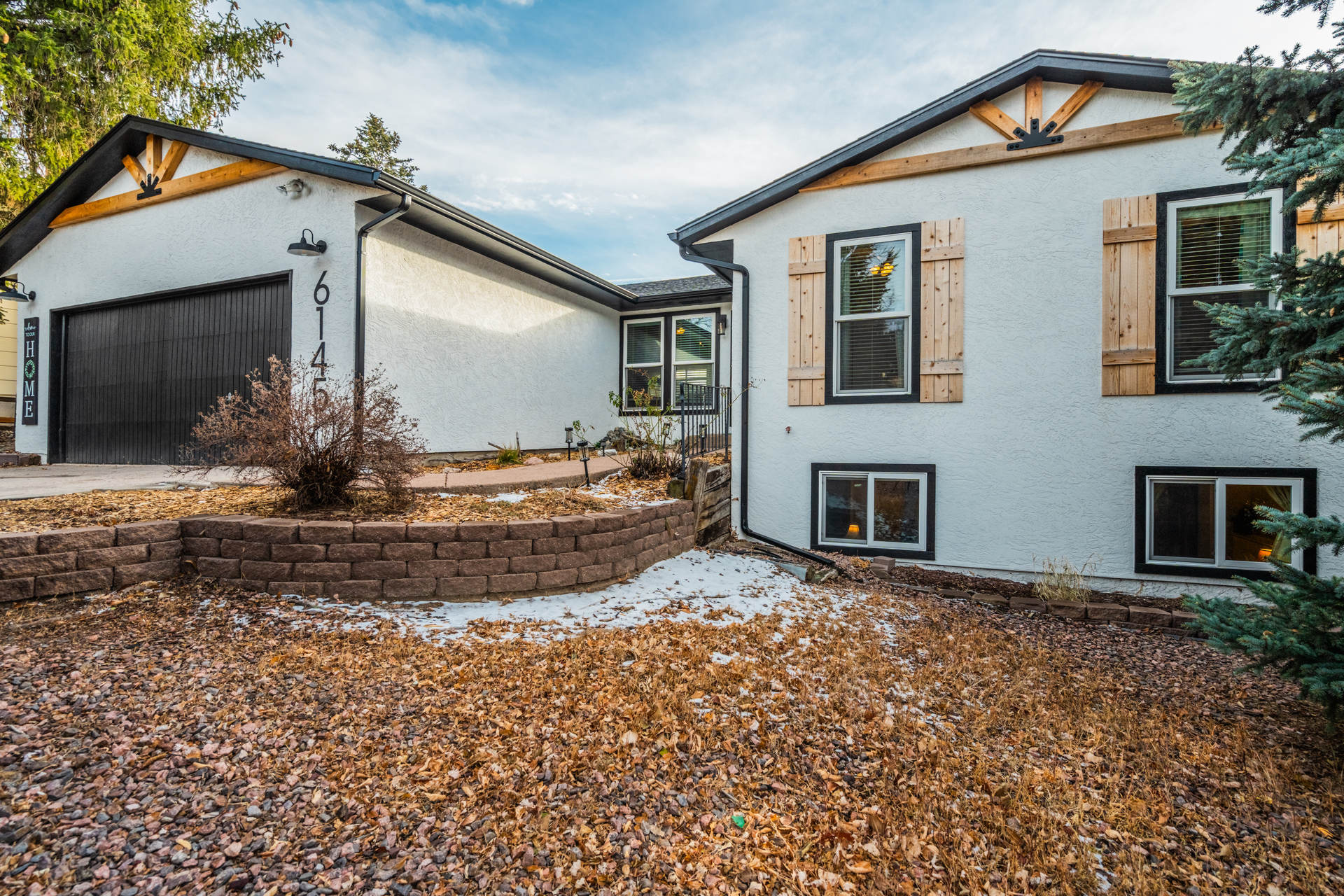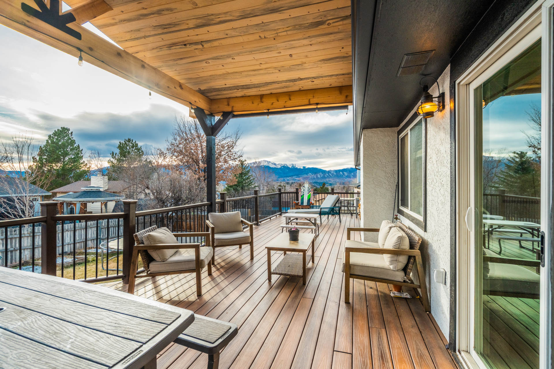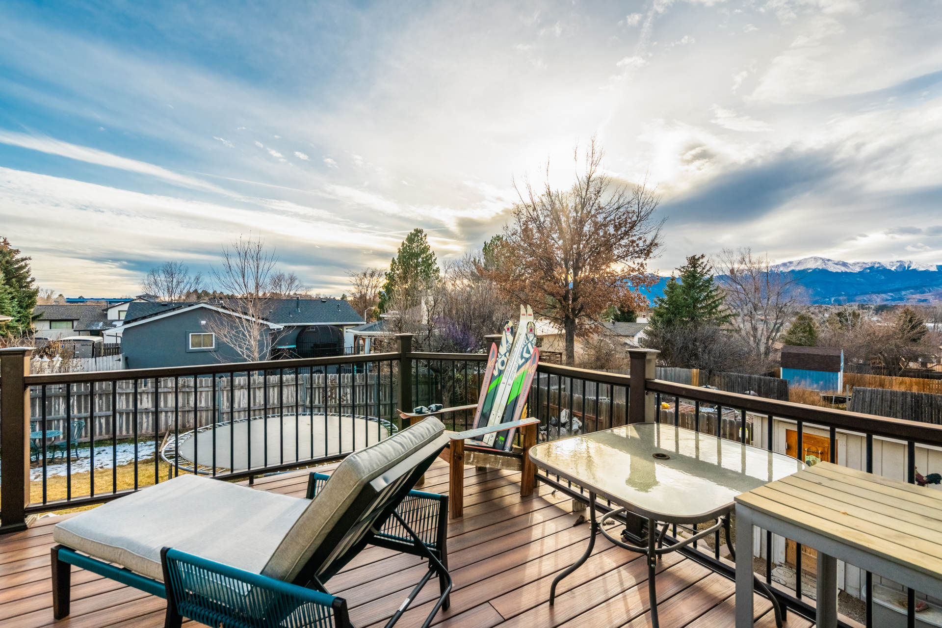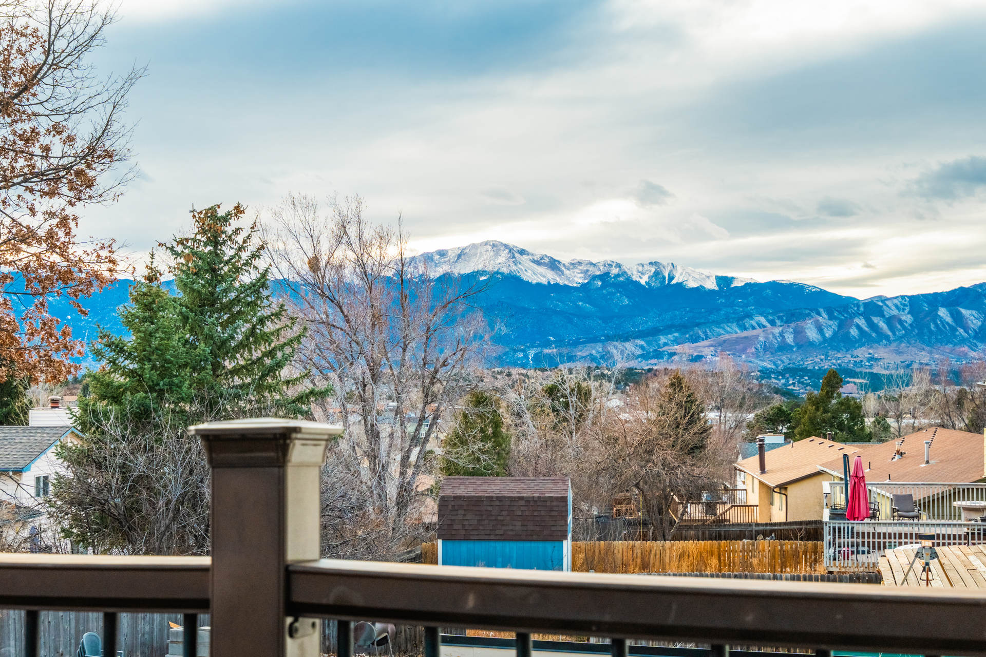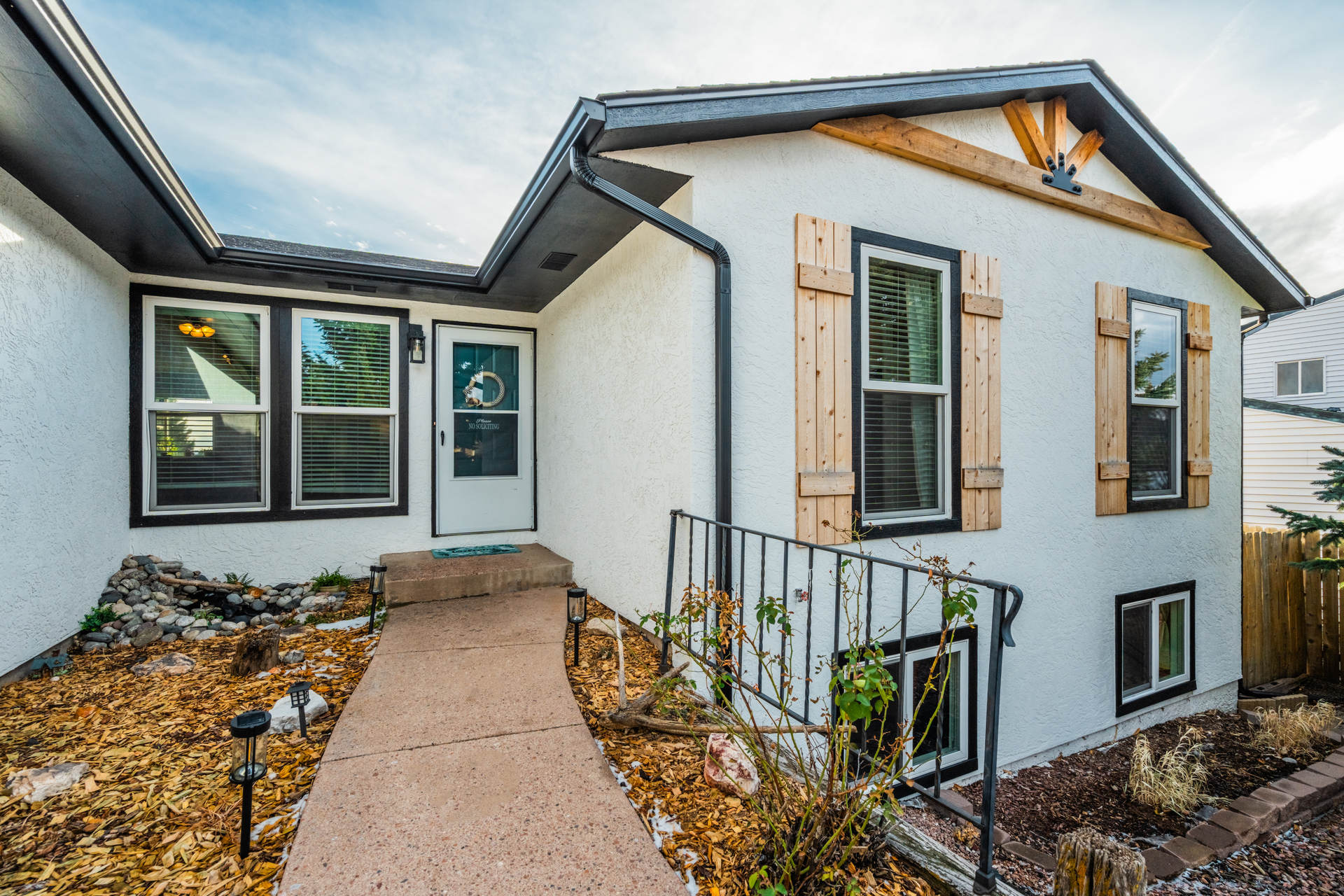 Welcome to this beautifully updated ranch, perfectly situated in a central location! From the freshly painted exterior to the brand-new (Class 4) roof and interior upgrades, this move-in ready home is sure to impress. Step inside to discover luxury CoreTec vinyl flooring throughout the main level, vaulted beetle-kill pine ceilings, and a wood-burning fireplace. The chef’s kitchen boasts white cabinetry, granite countertops, a breakfast bar, double oven, gas range, and counter-depth refrigerator. Adjacent, the dining room offers walkout access to the covered composite deck, ideal for entertaining or relaxing while enjoying breathtaking Pikes Peak views. The master suite features crown molding, a walk-in closet w/built-in shelving, and a fully remodeled ensuite with walk-in shower, heated tile flooring, and a custom pocket door. Two additional main-level bedrooms share a full bath with a new vanity and lighting. New doors, trim, interior paint, light fixtures and upgraded Milgard vinyl windows. A laundry room located on the main level includes a custom folding shelf and convenient storage. The finished basement offers a spacious family room with gas fireplace, cozy reading nook, and built-in wet bar, plus a recreation room with walkout access to the fenced backyard and playhouse. Two more bedrooms, an office, a 3/4 bathroom, and a storage room complete this level. Additional highlights include a 2-car garage with a tool bench, a chicken coop w/full run, and an auto sprinkler system. Don’t miss this rare opportunity to own a fully renovated, move-in ready home with incredible views and thoughtful upgrades!