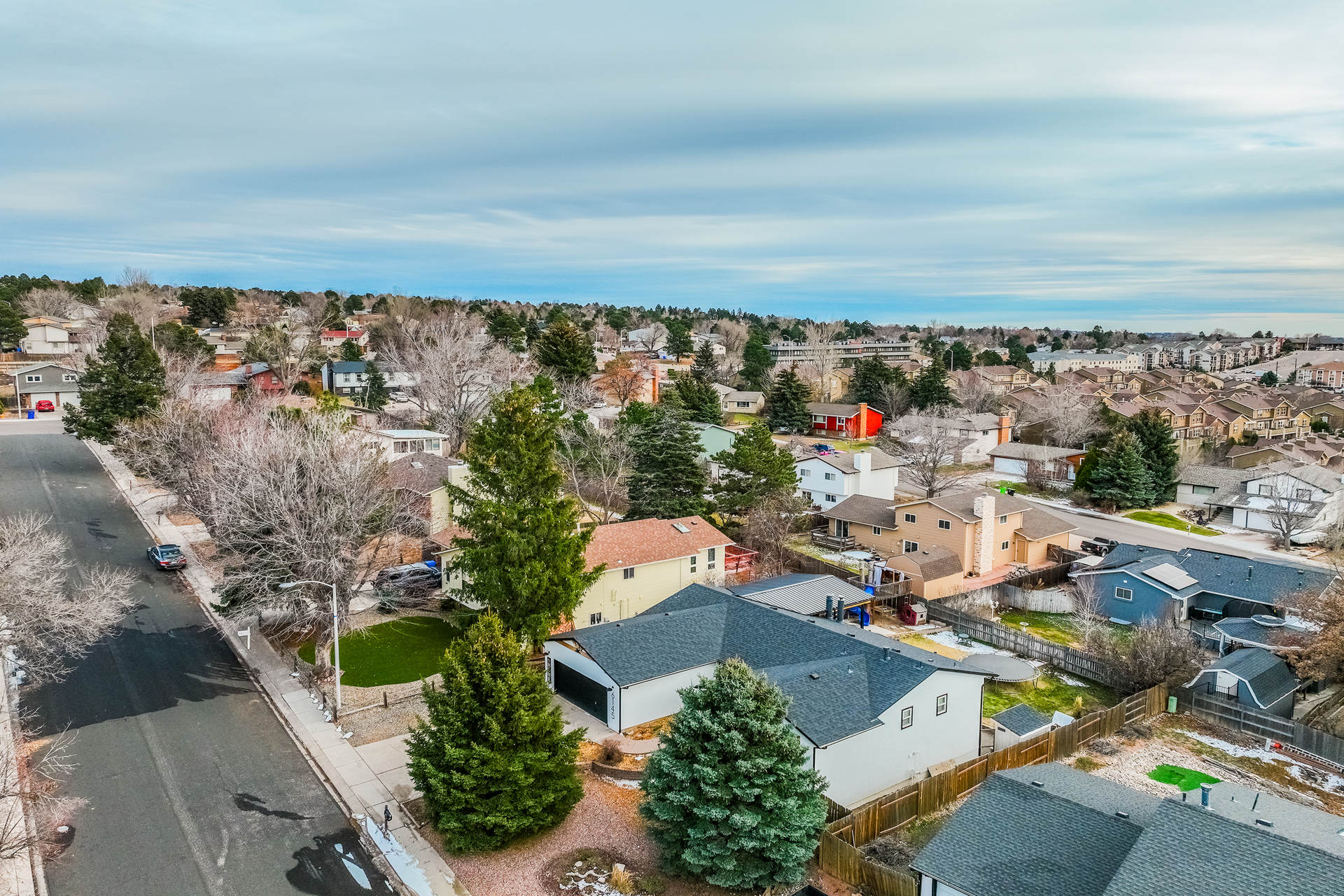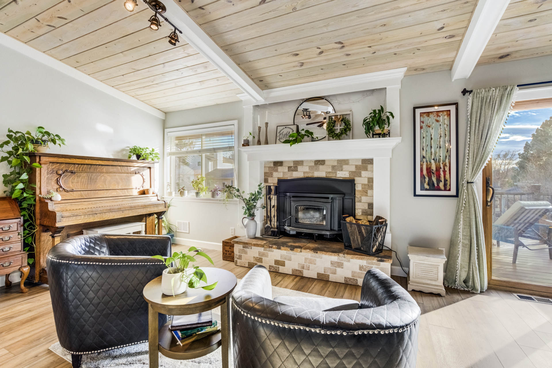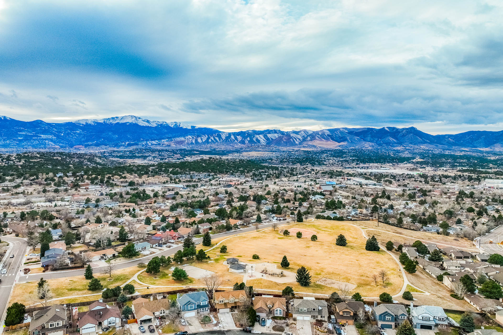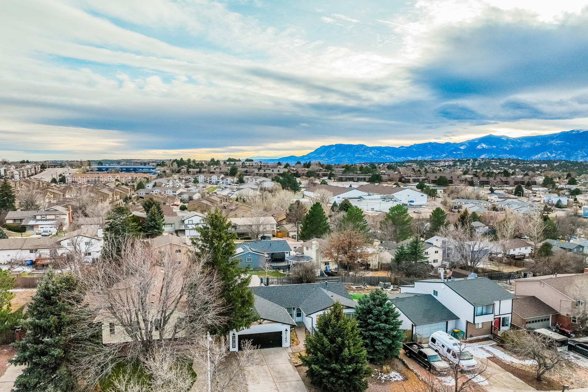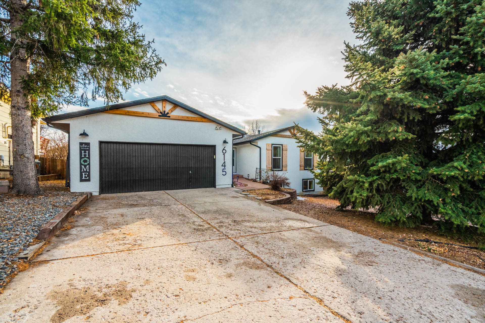 Welcome to this beautifully updated ranch, perfectly situated in a central location! From the freshly painted exterior to the brand-new (Class 4) roof and interior upgrades, this move-in ready home is sure to impress. Step inside to discover luxury CoreTec vinyl flooring throughout the main level, vaulted beetle-kill pine ceilings, and a wood-burning fireplace. The chef’s kitchen boasts white cabinetry, granite countertops, a breakfast bar, double oven, gas range, and counter-depth refrigerator. Adjacent, the dining room offers walkout access to the covered composite deck, ideal for entertaining or relaxing while enjoying breathtaking Pikes Peak views. The master suite features crown molding, a walk-in closet w/built-in shelving, and a fully remodeled ensuite with walk-in shower, heated tile flooring, and a custom pocket door. Two additional main-level bedrooms share a full bath with a new vanity and lighting. New doors, trim, interior paint, light fixtures and upgraded Milgard vinyl windows. A laundry room located on the main level includes a custom folding shelf and convenient storage. The finished basement offers a spacious family room with gas fireplace, cozy reading nook, and built-in wet bar, plus a recreation room with walkout access to the fenced backyard and playhouse. Two more bedrooms, an office, a 3/4 bathroom, and a storage room complete this level. Additional highlights include a 2-car garage with a tool bench, a chicken coop w/full run, and an auto sprinkler system. Don’t miss this rare opportunity to own a fully renovated, move-in ready home with incredible views and thoughtful upgrades!