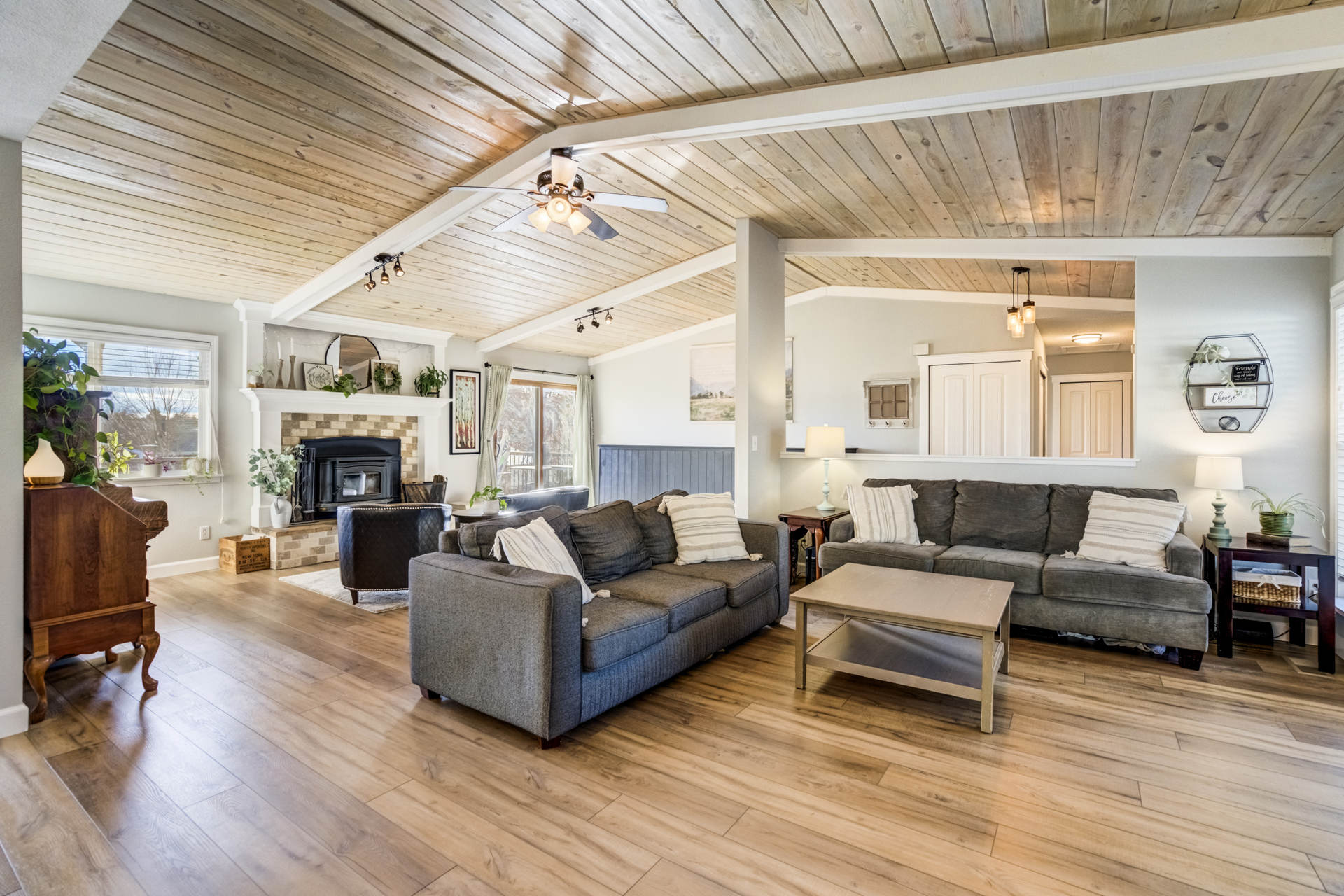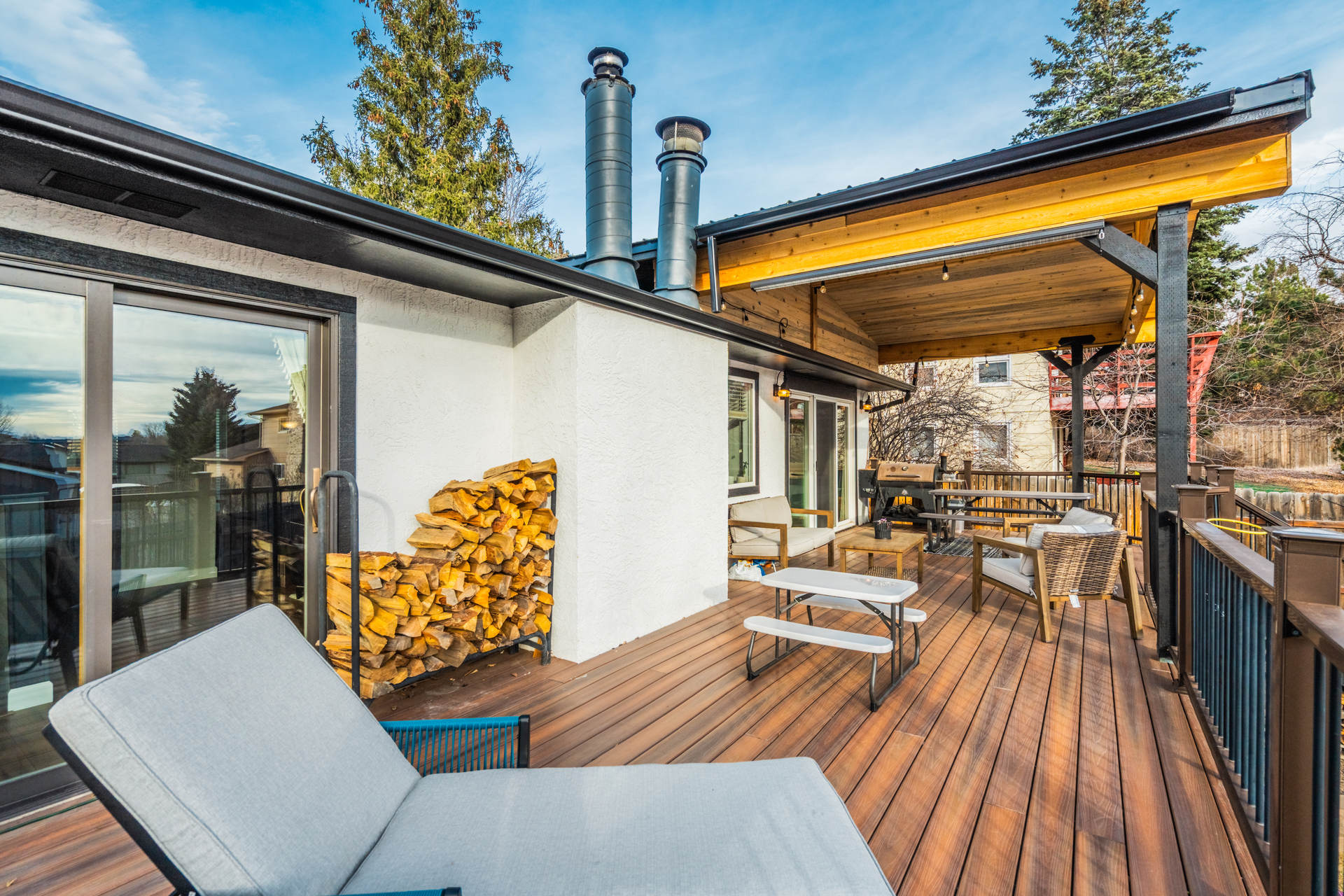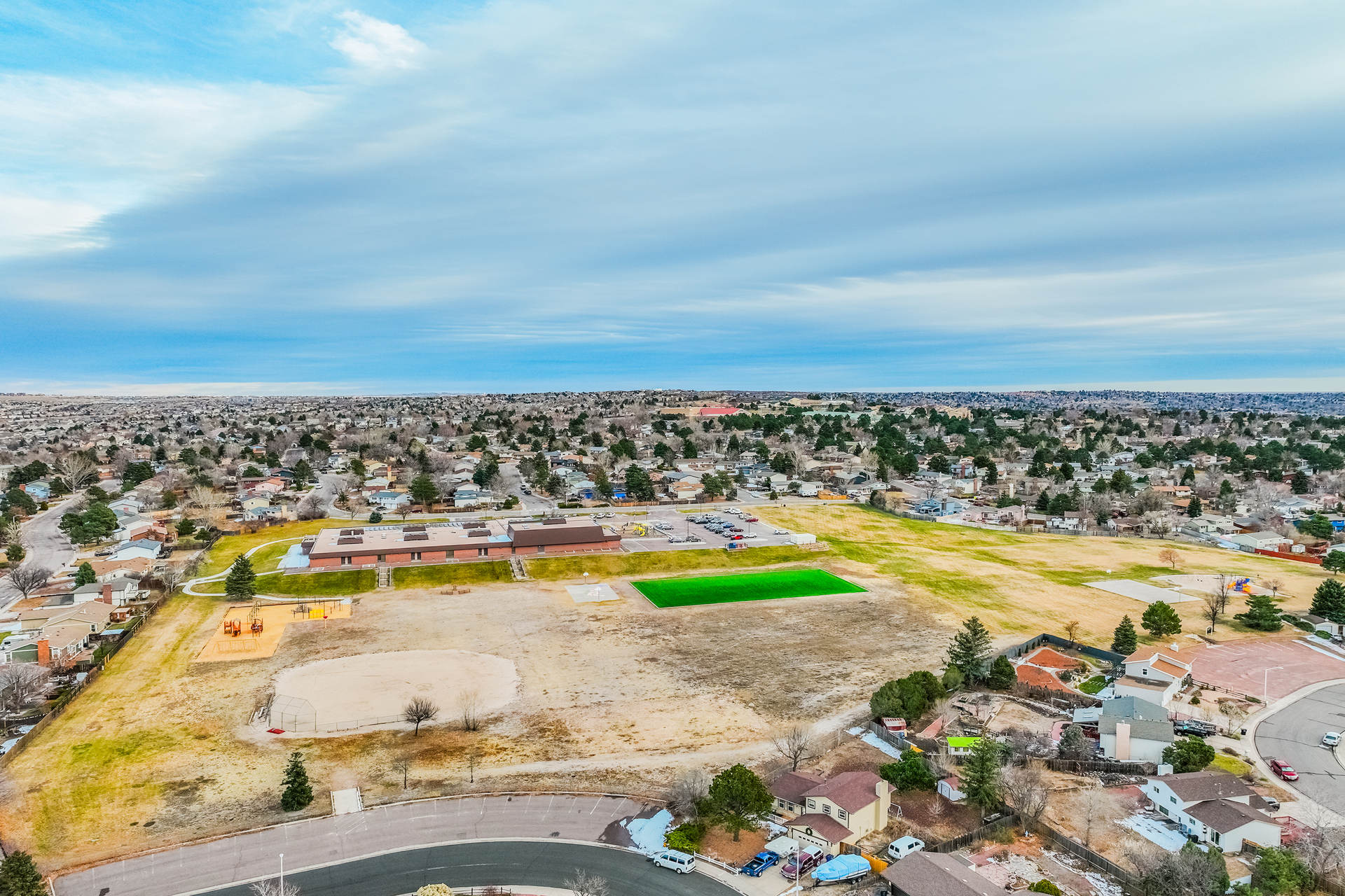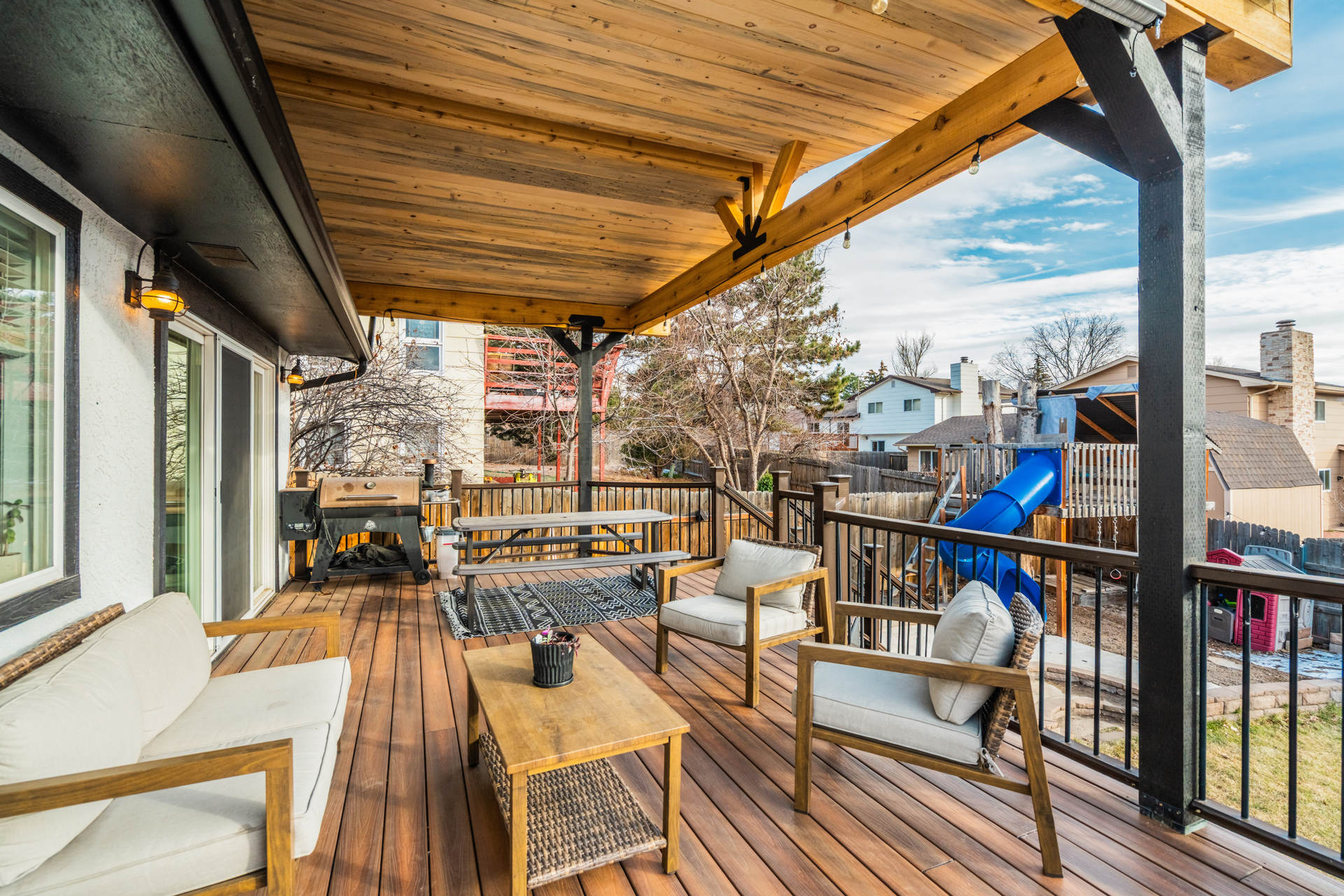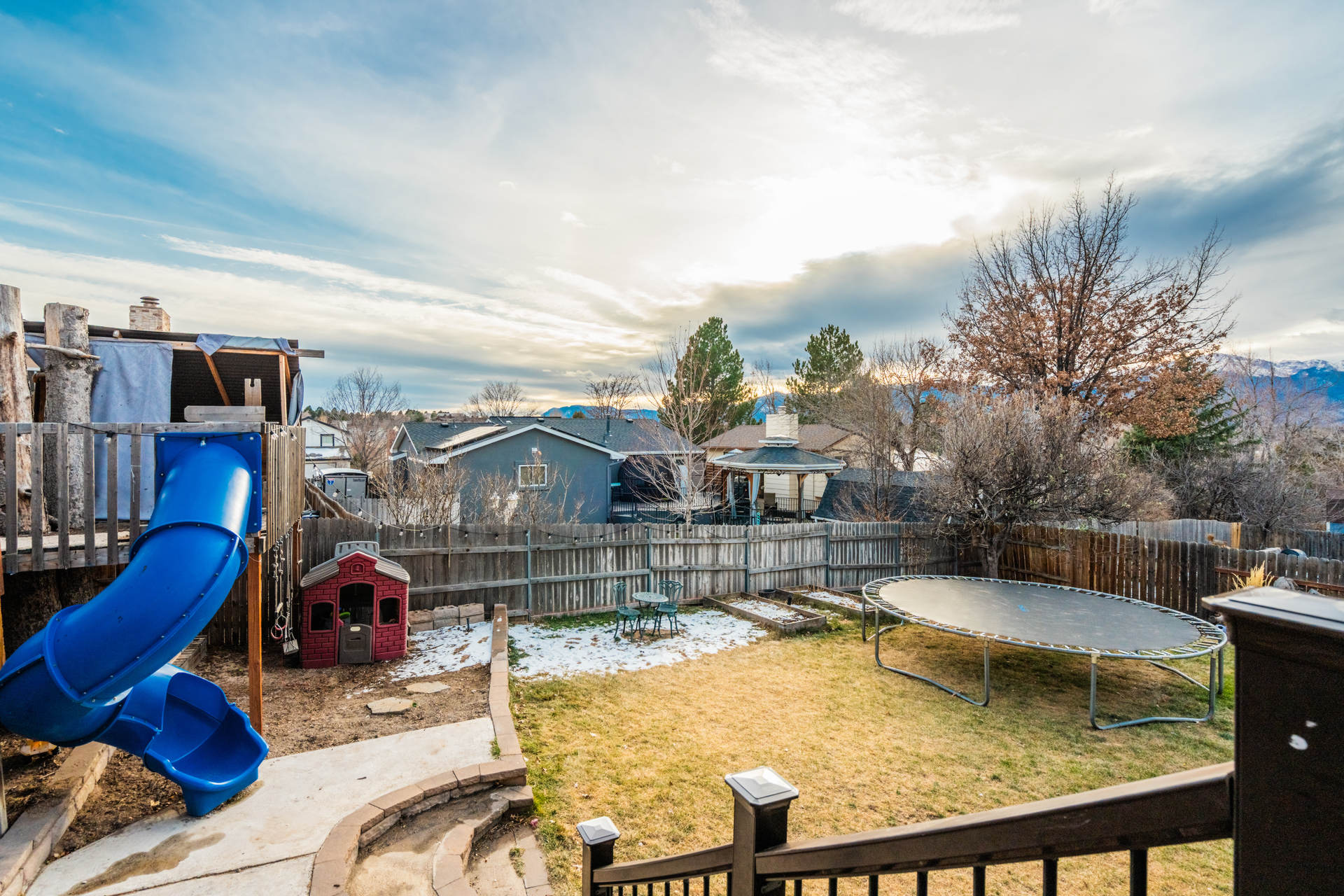 Welcome to this beautifully updated ranch, perfectly situated in a central location! From the freshly painted exterior to the brand-new (Class 4) roof and interior upgrades, this move-in ready home is sure to impress. Step inside to discover luxury CoreTec vinyl flooring throughout the main level, vaulted beetle-kill pine ceilings, and a wood-burning fireplace. The chef’s kitchen boasts white cabinetry, granite countertops, a breakfast bar, double oven, gas range, and counter-depth refrigerator. Adjacent, the dining room offers walkout access to the covered composite deck, ideal for entertaining or relaxing while enjoying breathtaking Pikes Peak views. The master suite features crown molding, a walk-in closet w/built-in shelving, and a fully remodeled ensuite with walk-in shower, heated tile flooring, and a custom pocket door. Two additional main-level bedrooms share a full bath with a new vanity and lighting. New doors, trim, interior paint, light fixtures and upgraded Milgard vinyl windows. A laundry room located on the main level includes a custom folding shelf and convenient storage. The finished basement offers a spacious family room with gas fireplace, cozy reading nook, and built-in wet bar, plus a recreation room with walkout access to the fenced backyard and playhouse. Two more bedrooms, an office, a 3/4 bathroom, and a storage room complete this level. Additional highlights include a 2-car garage with a tool bench, a chicken coop w/full run, and an auto sprinkler system. Don’t miss this rare opportunity to own a fully renovated, move-in ready home with incredible views and thoughtful upgrades!
