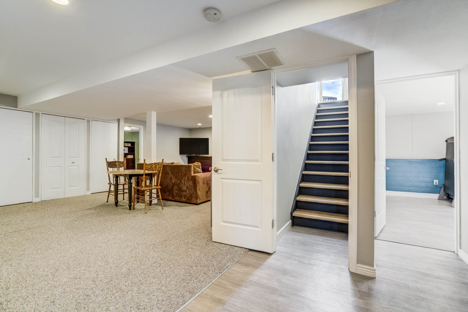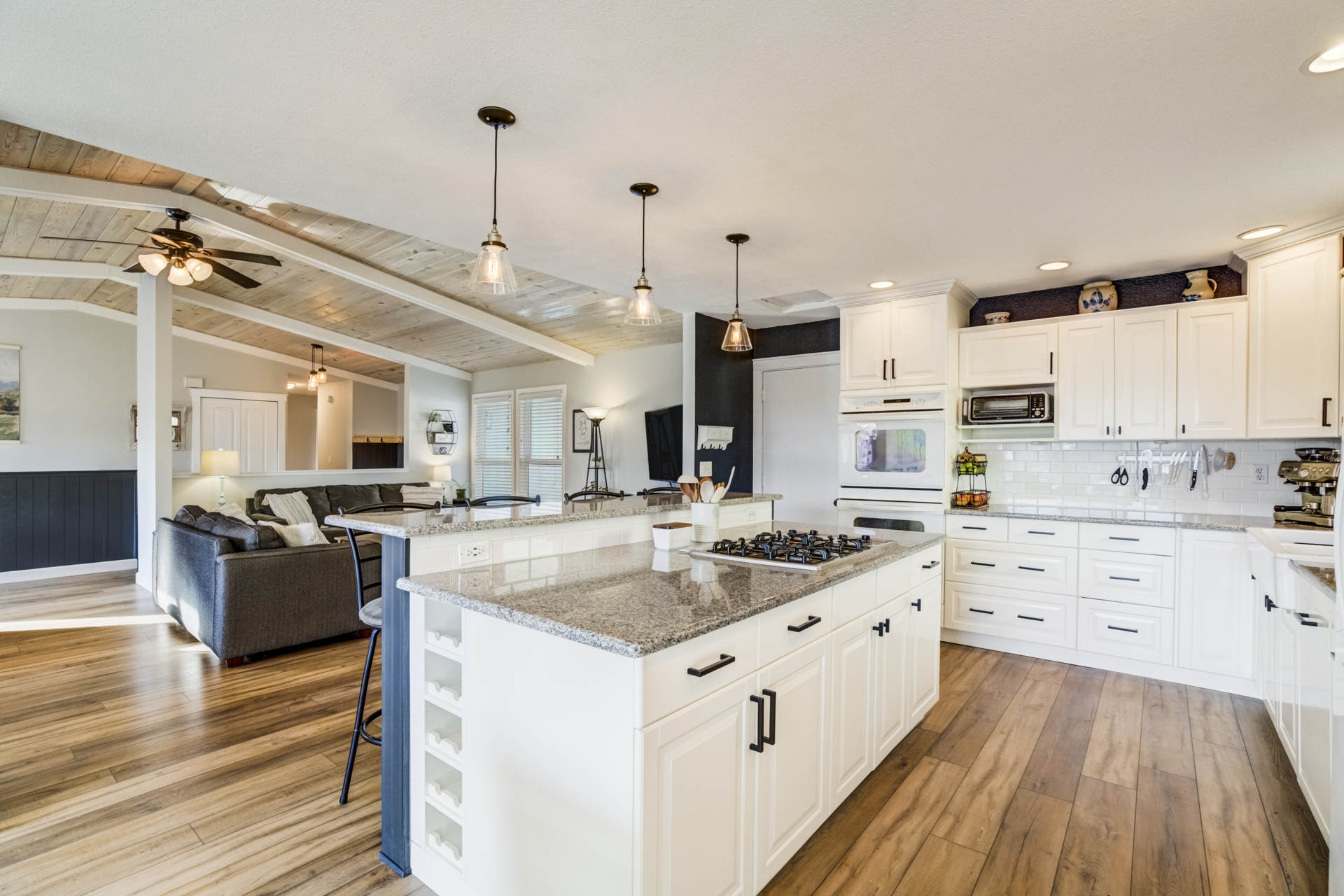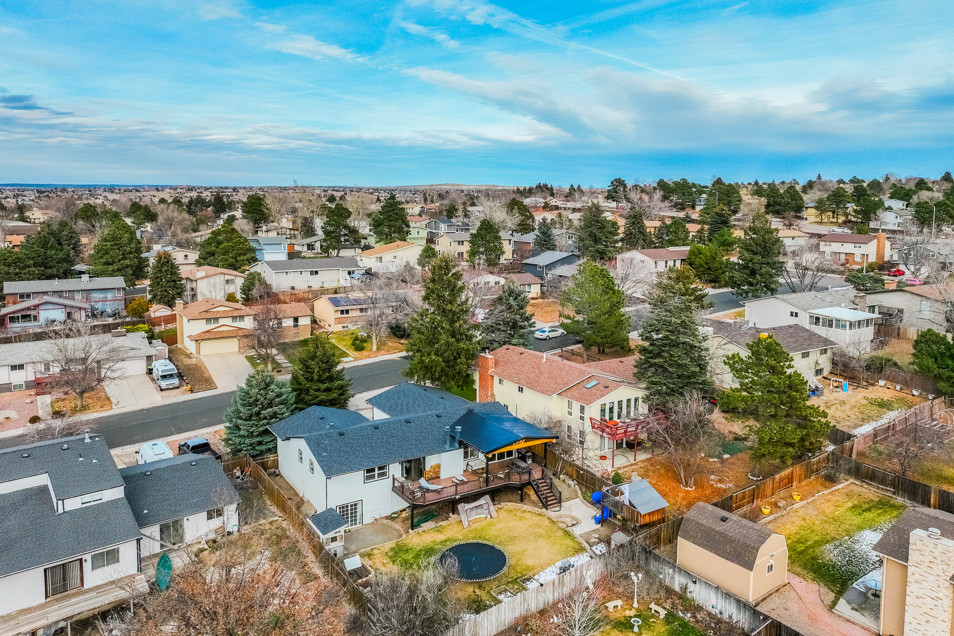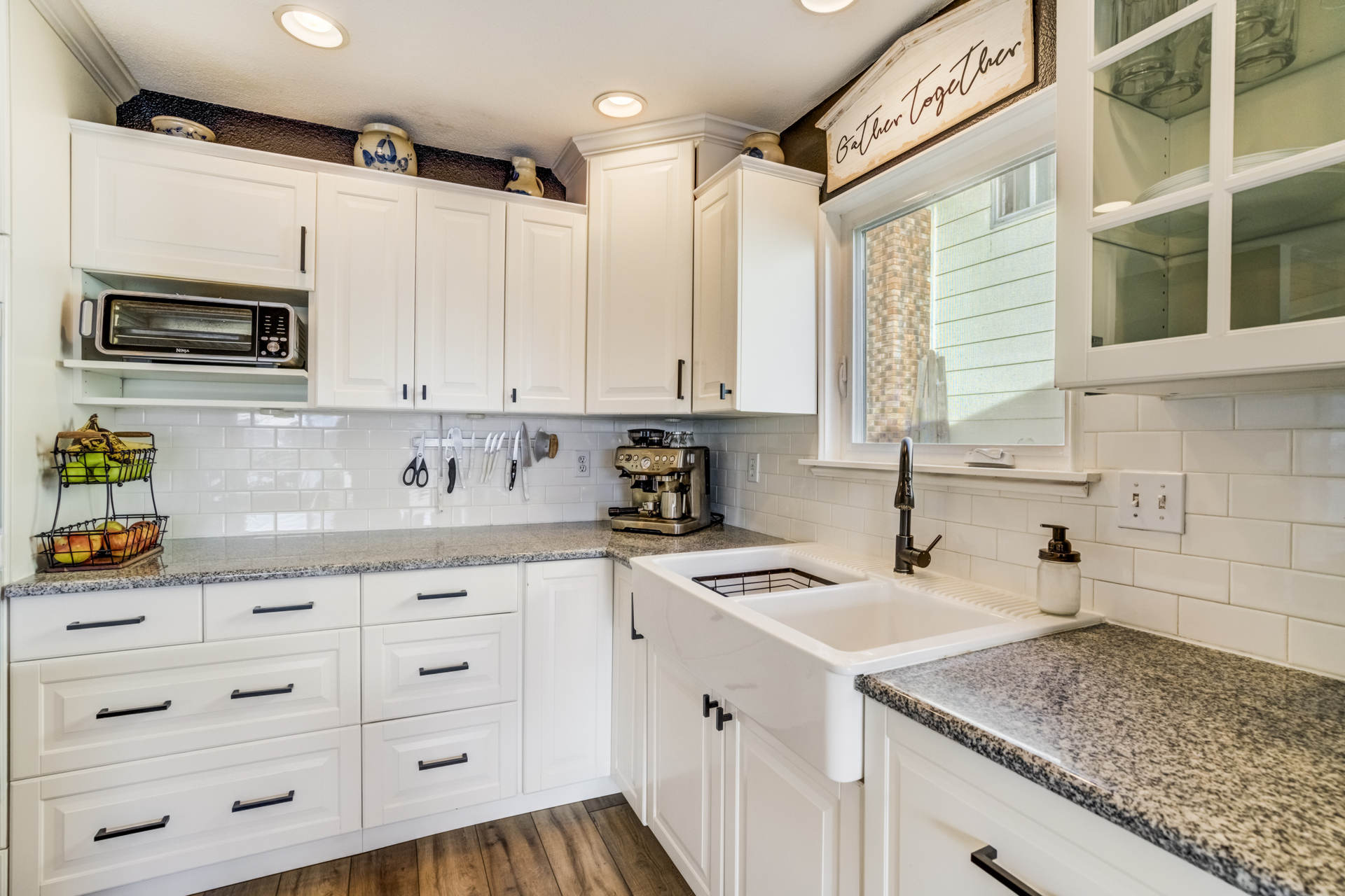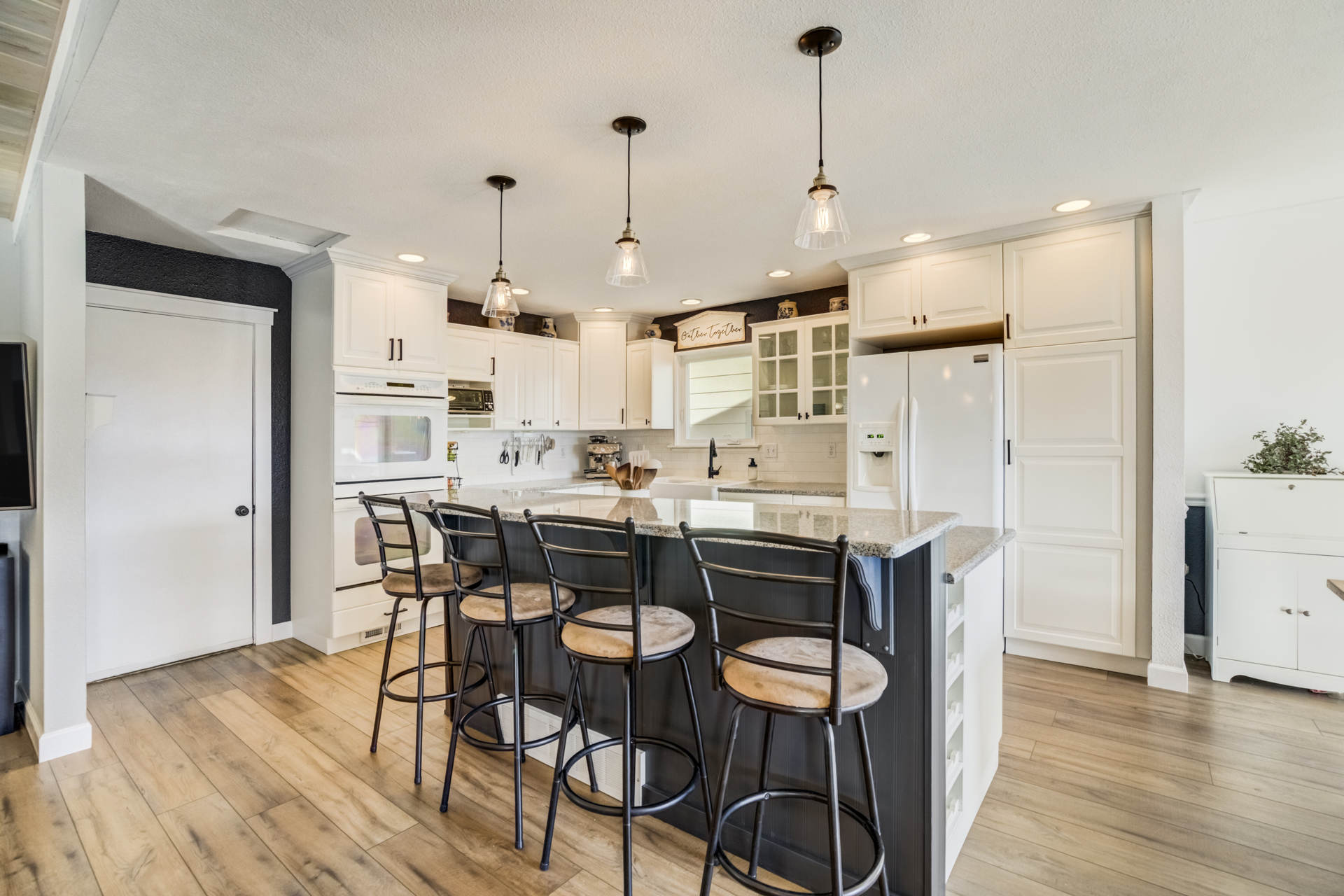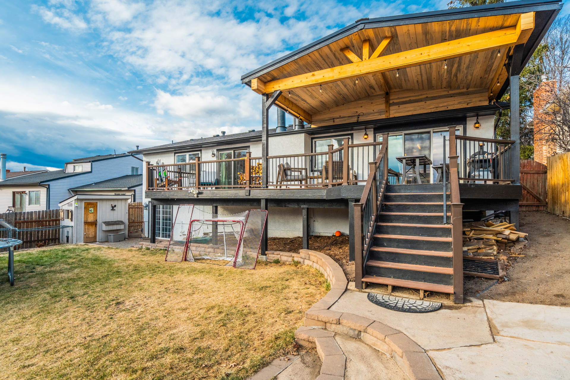 Welcome to this beautifully updated ranch, perfectly situated in a central location! From the freshly painted exterior to the brand-new (Class 4) roof and interior upgrades, this move-in ready home is sure to impress. Step inside to discover luxury CoreTec vinyl flooring throughout the main level, vaulted beetle-kill pine ceilings, and a wood-burning fireplace. The chef’s kitchen boasts white cabinetry, granite countertops, a breakfast bar, double oven, gas range, and counter-depth refrigerator. Adjacent, the dining room offers walkout access to the covered composite deck, ideal for entertaining or relaxing while enjoying breathtaking Pikes Peak views. The master suite features crown molding, a walk-in closet w/built-in shelving, and a fully remodeled ensuite with walk-in shower, heated tile flooring, and a custom pocket door. Two additional main-level bedrooms share a full bath with a new vanity and lighting. New doors, trim, interior paint, light fixtures and upgraded Milgard vinyl windows. A laundry room located on the main level includes a custom folding shelf and convenient storage. The finished basement offers a spacious family room with gas fireplace, cozy reading nook, and built-in wet bar, plus a recreation room with walkout access to the fenced backyard and playhouse. Two more bedrooms, an office, a 3/4 bathroom, and a storage room complete this level. Additional highlights include a 2-car garage with a tool bench, a chicken coop w/full run, and an auto sprinkler system. Don’t miss this rare opportunity to own a fully renovated, move-in ready home with incredible views and thoughtful upgrades!