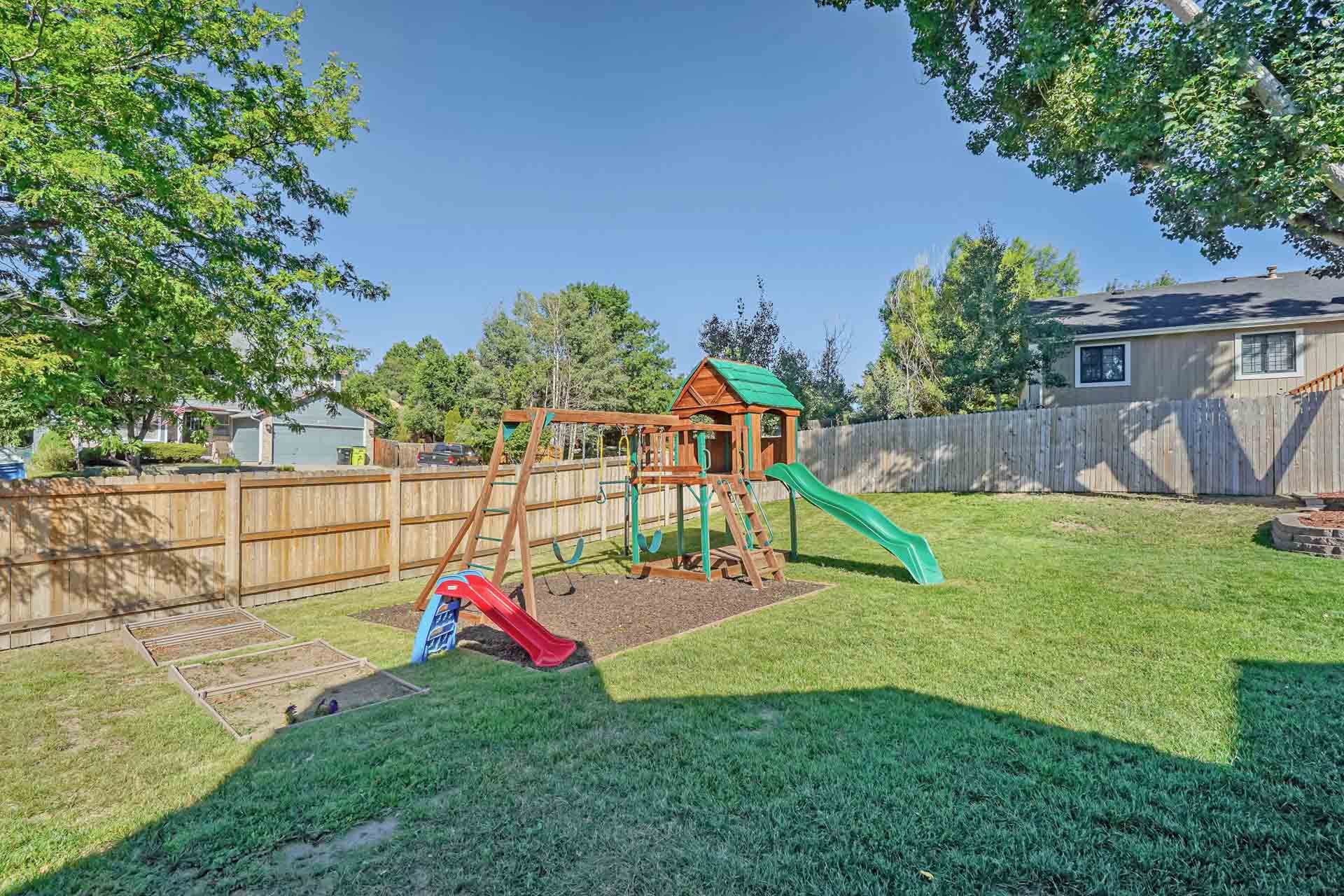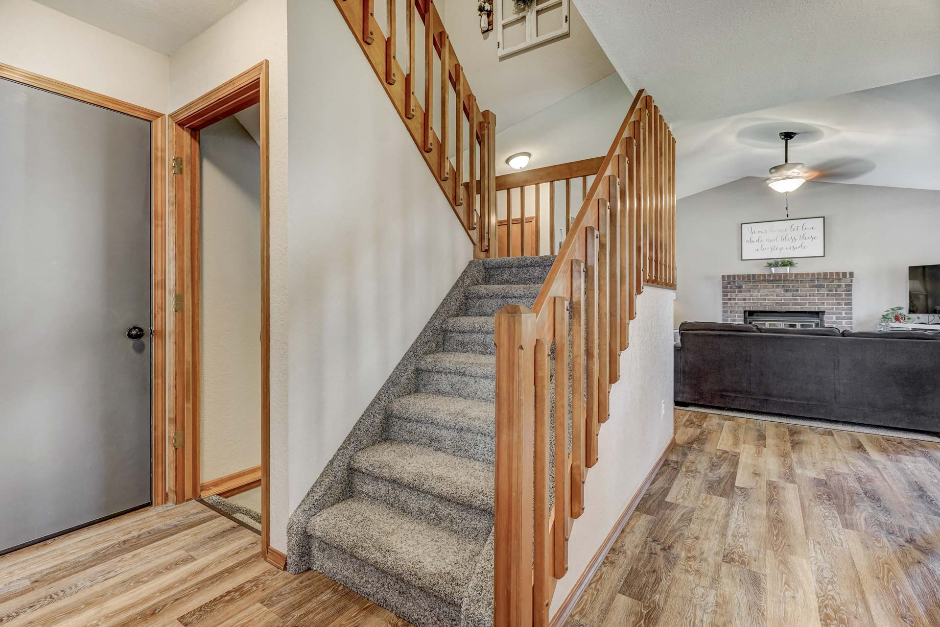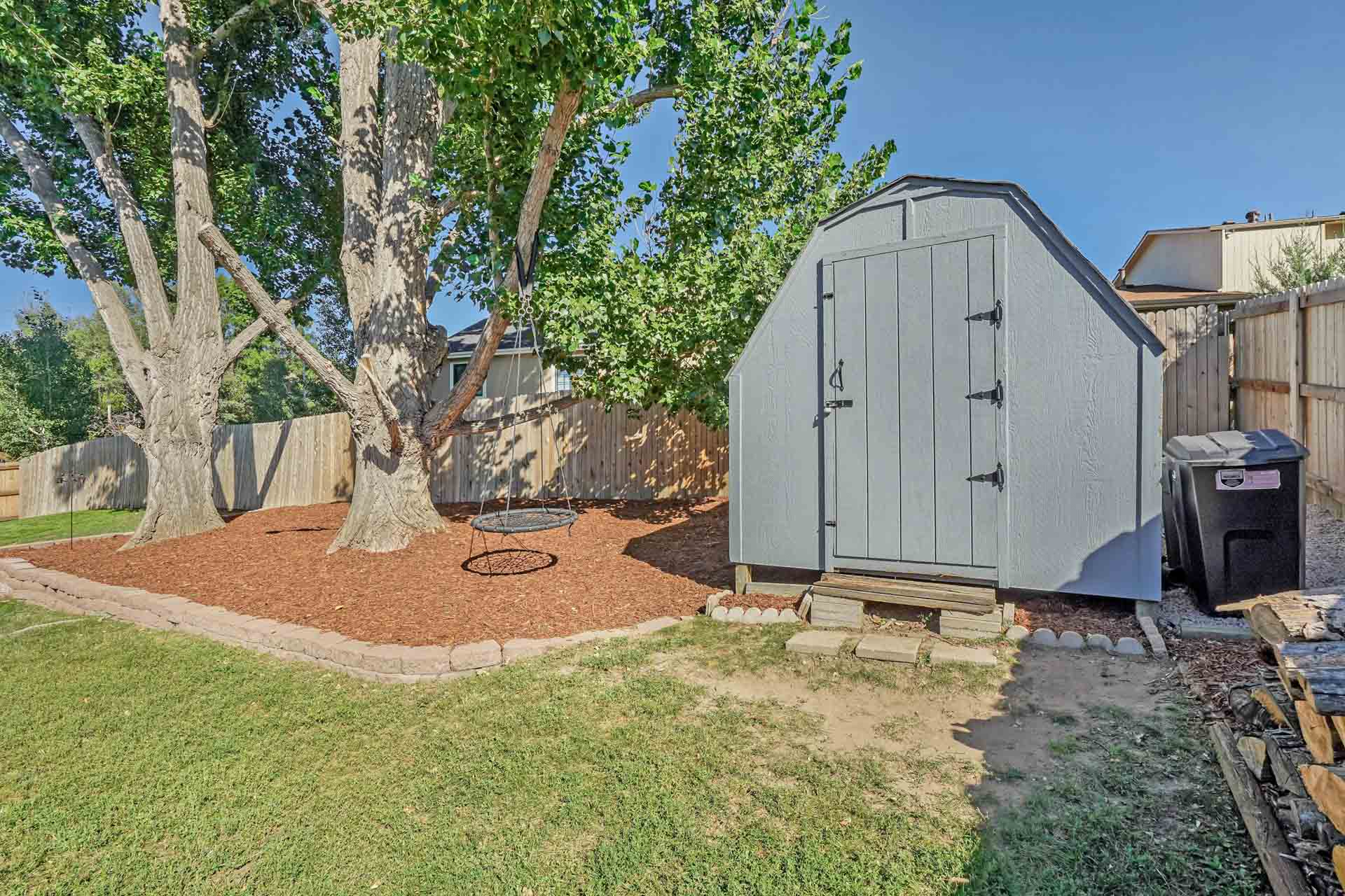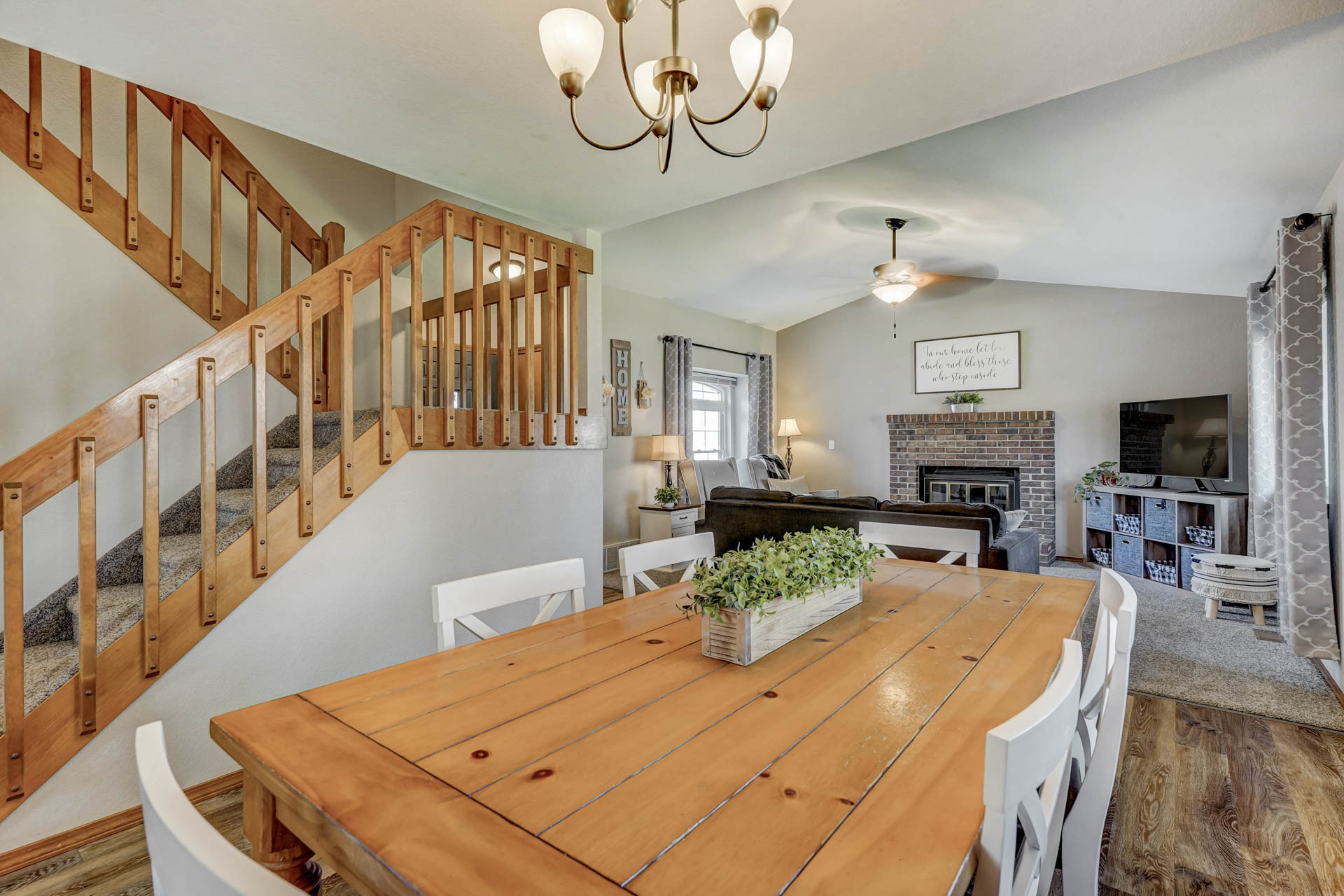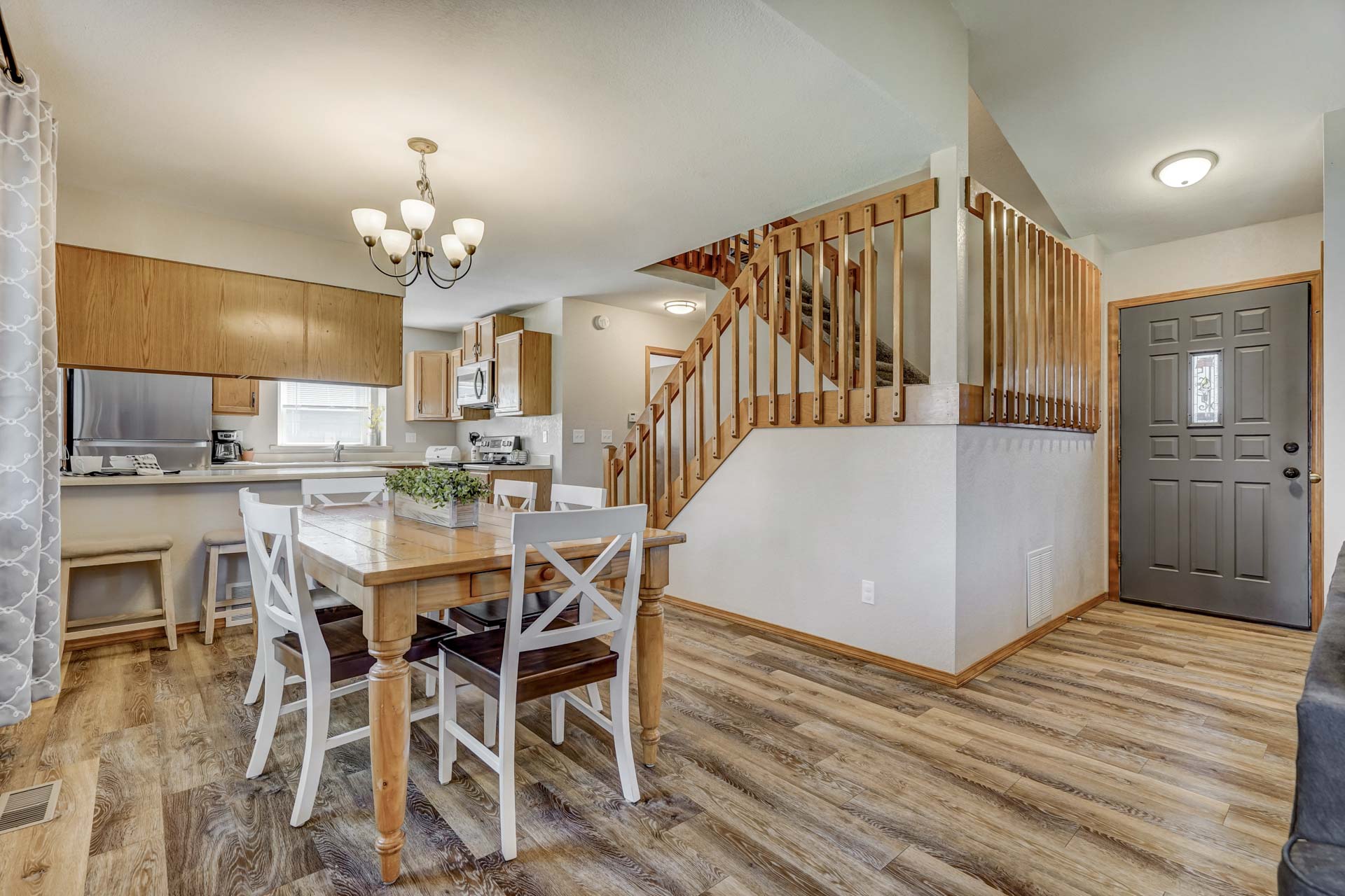 Updated 2-story home with modern finishes. Offering a large yard on a cul-de-sac, surrounded by comfort & convenience. Located in the desirable Northwind neighborhood w/easy access to schools, shopping, entertainment, Cottonwood Creek Park/trails, & main roads. As you enter updated luxury vinyl plank wood floors greet you and flow throughout the main level. The great room draws you in boasting vaulted ceilings, wood burning fireplace w/ brick surround & large windows letting the natural light pour in illuminating the open space. The dining space has newer chandelier and can accommodate a large table for those formal occasions. The nearby updated kitchen opens to the great room creating the perfect layout to entertain friends & family. Featuring solid wood cabinets w/ oil bronzed hardware, expansive peninsula w/breakfast bar, modern pendant lighting, & stainless-steel appliances. From here step out to the incredible fenced backyard, w/ concrete patio, mature trees, storage shed, garden beds & more. Completing the main level is the laundry room w/ updated ½ bath boasting decorative wall and custom shelf. Head upstairs to the primary bedroom boasting sitting area, vaulted ceilings, walk-in closet & updated private 3/4 bath w/floor to ceiling tile, LVP flooring, custom mirror, new lighting & hardware. 2 additional upper bedrooms both have ceiling fans plush carpet & easy access to hall full bath w/new lighting, newer lvp floor & tile tub/shower surround. Downstairs the finished basement presents an open family room or 4th bedroom w/ newer carpet, new LED lighting &, walk-in closet/storage room. Bonus: modern paint colors, energy efficient vinyl windows, & more. See it today!